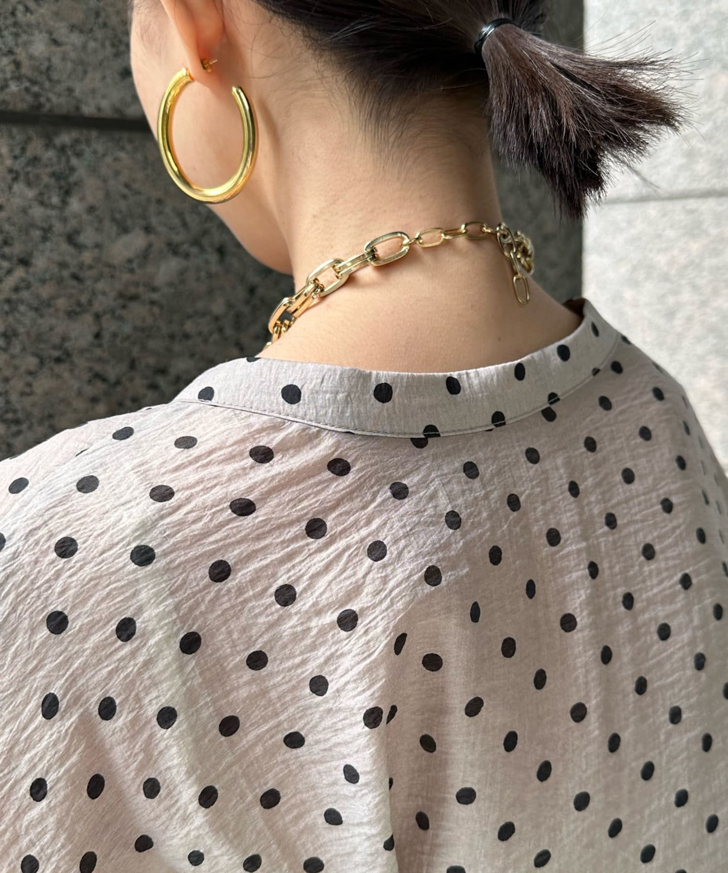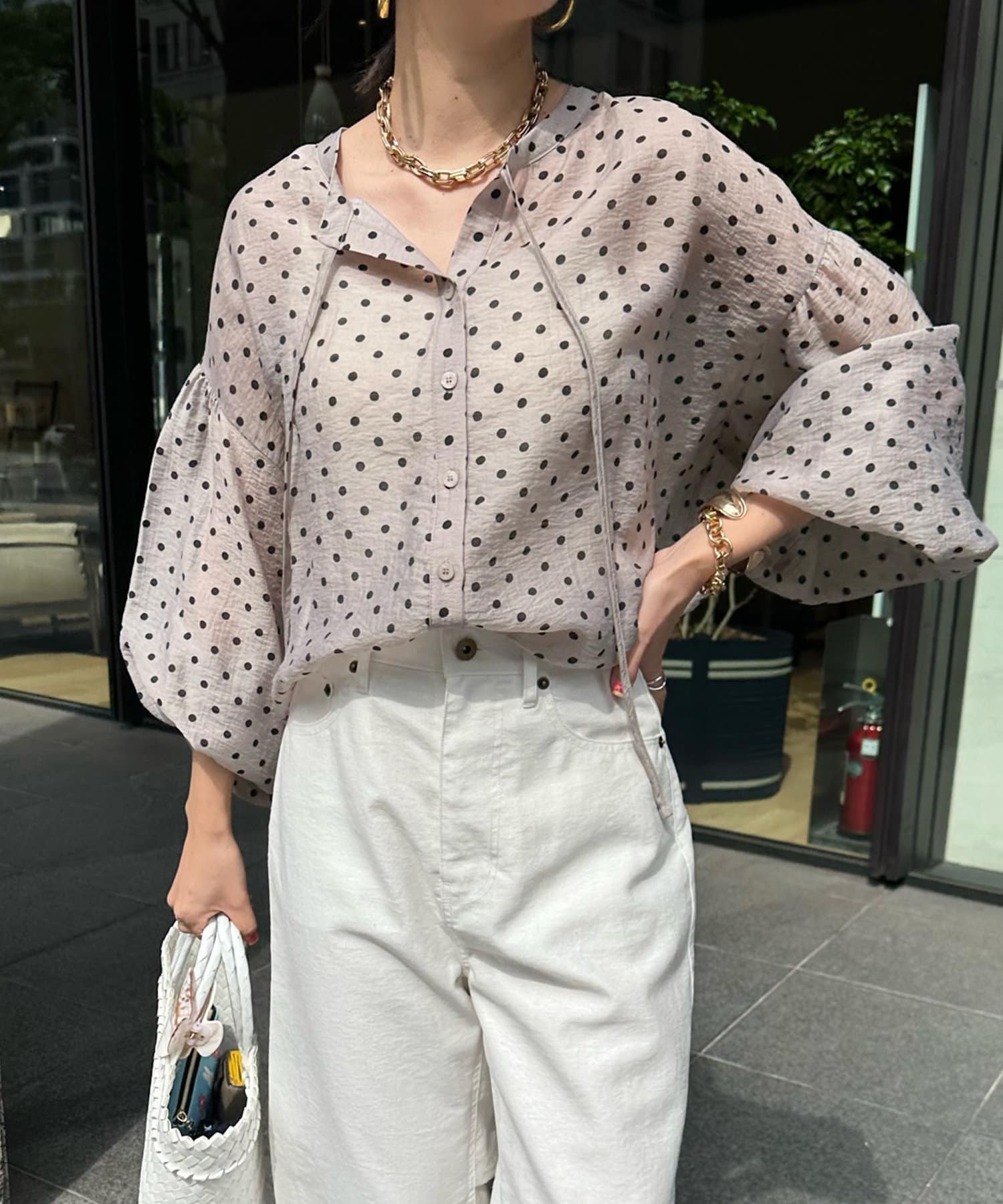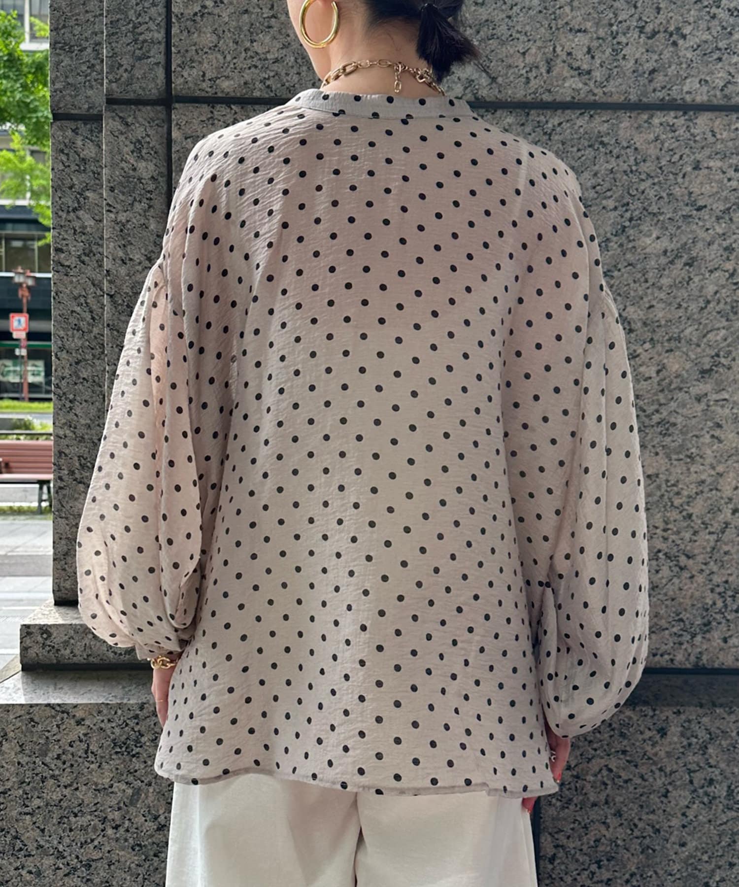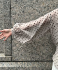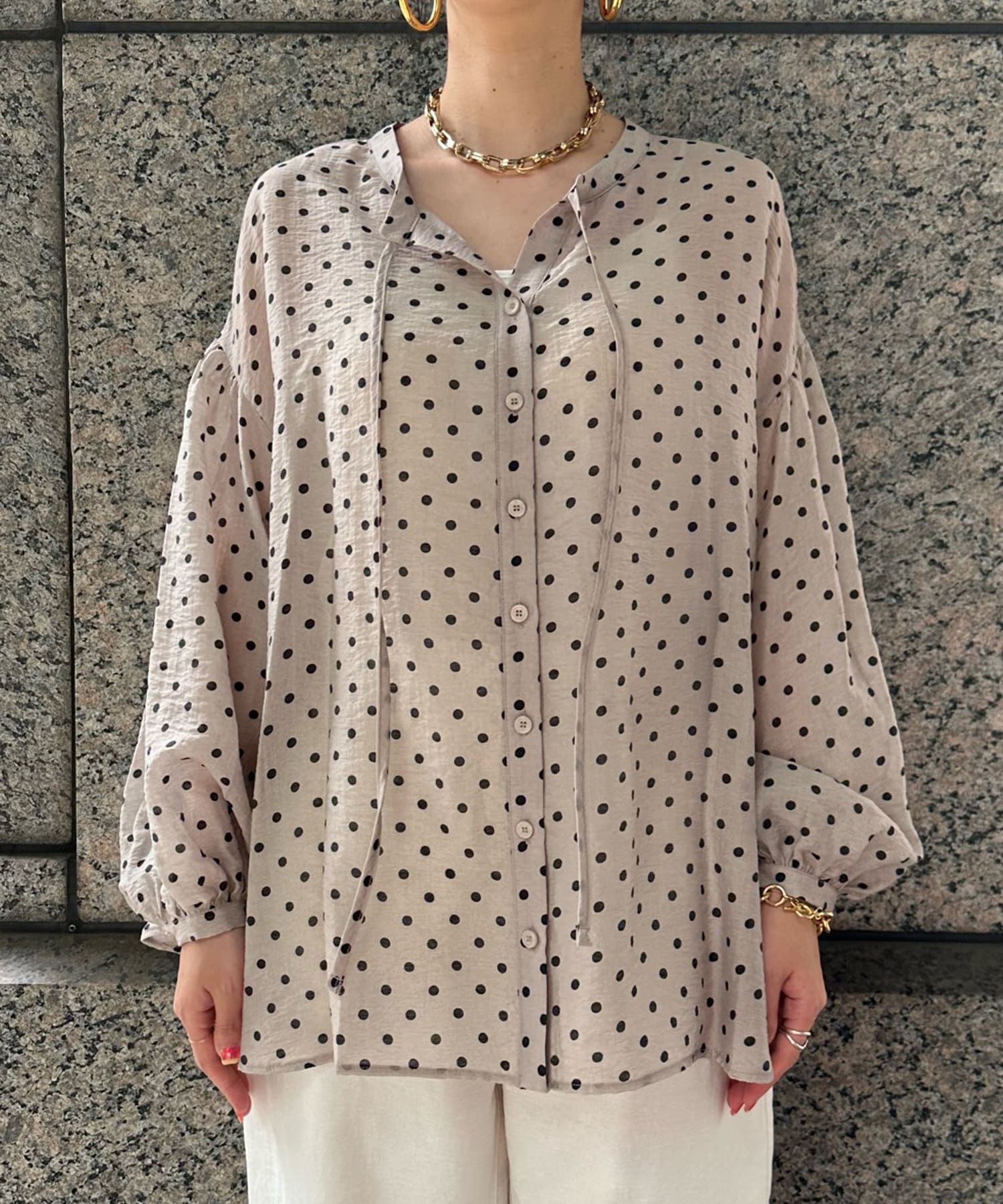 軽く着られるシアー素材+小ぶりなドット柄が甘くなりすぎず、大人に決まるポイントです。