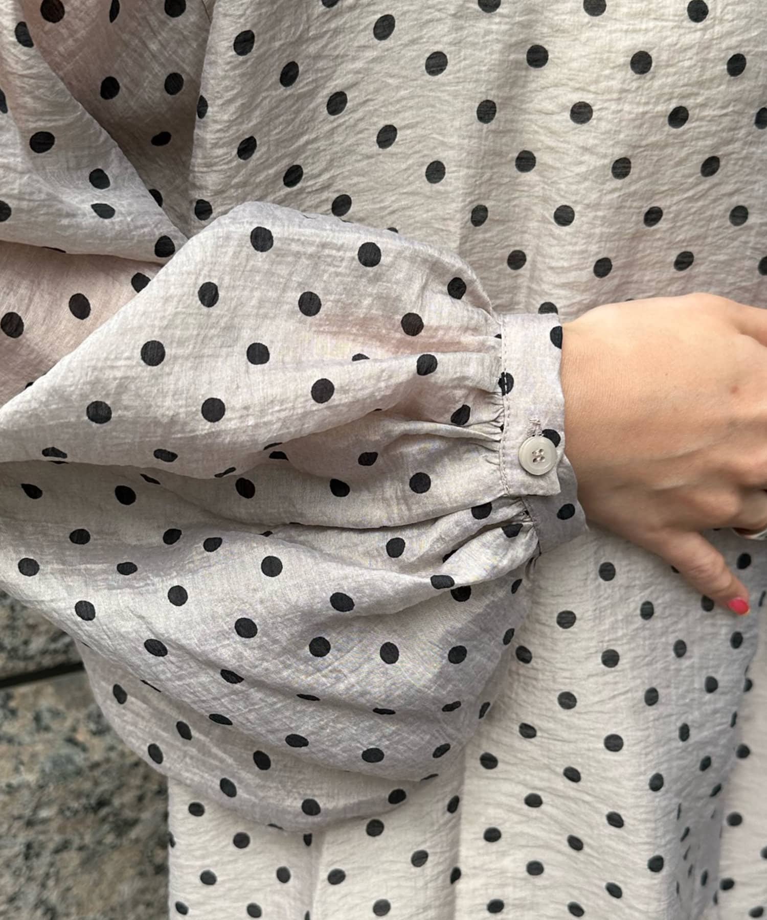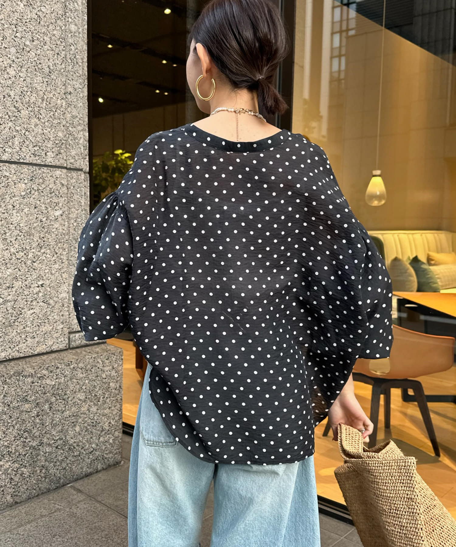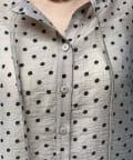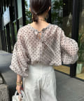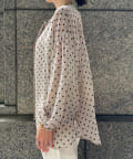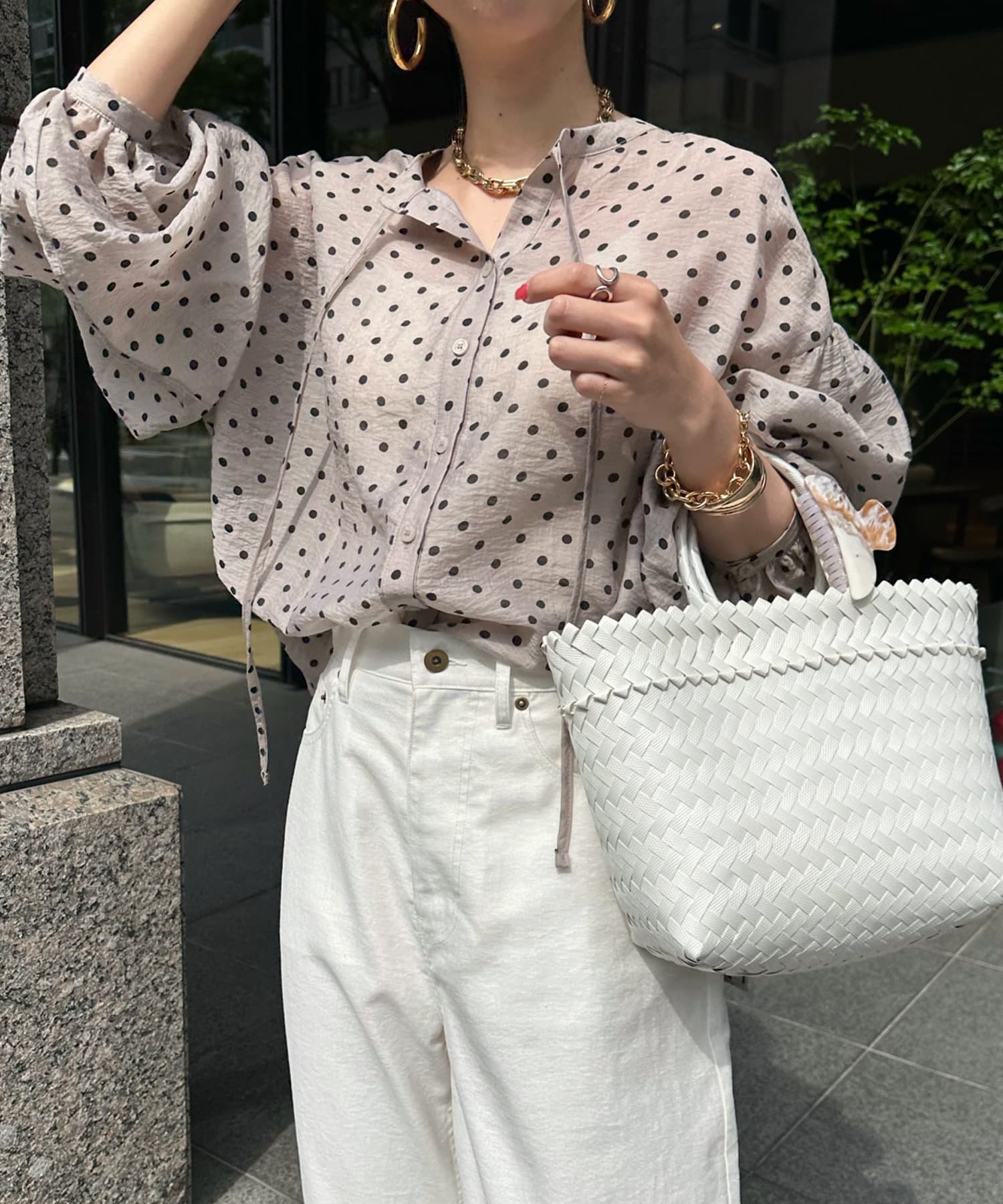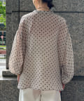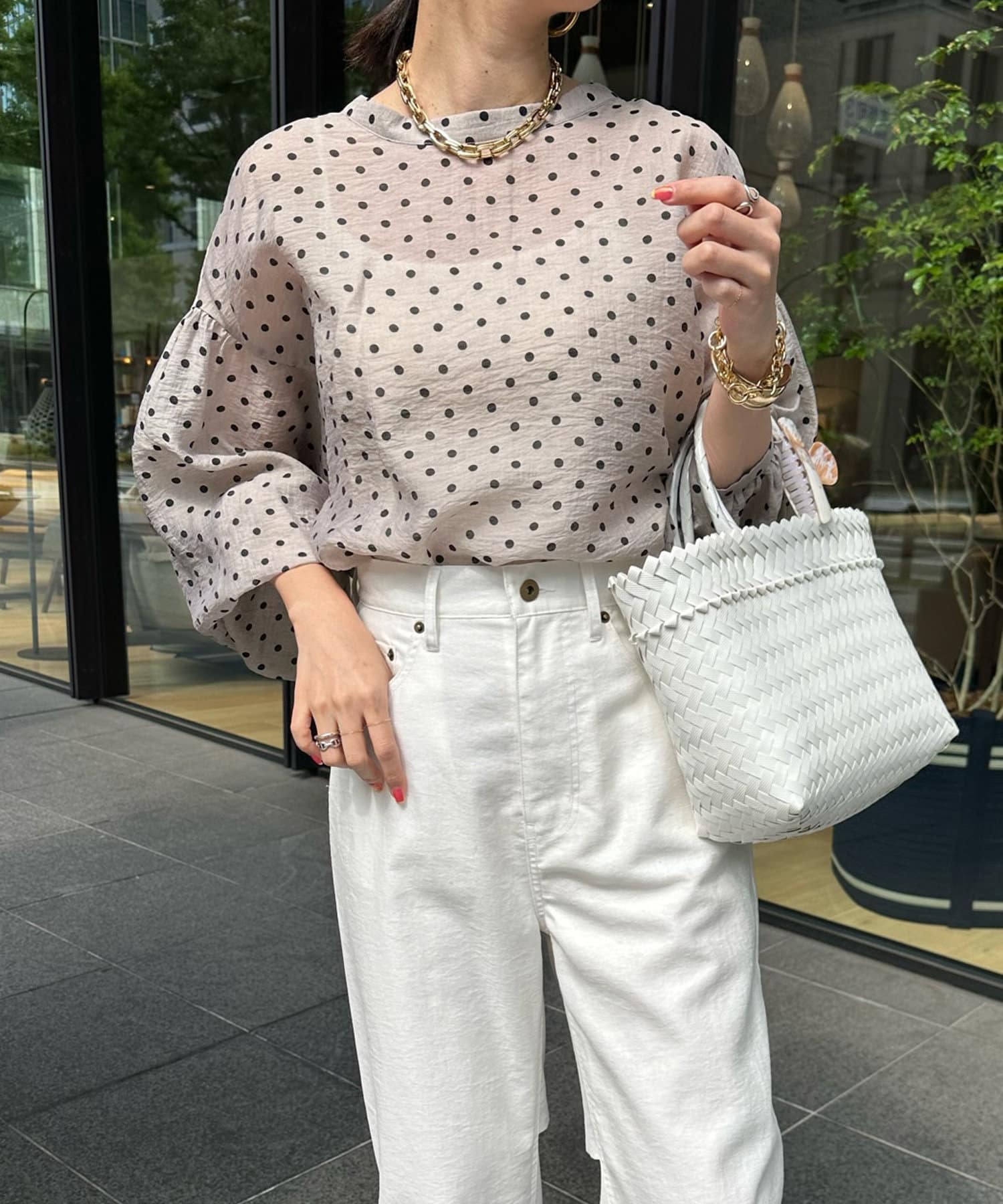 軽く着られるシアー素材+小ぶりなドット柄が甘くなりすぎず、大人に決まるポイントです。
