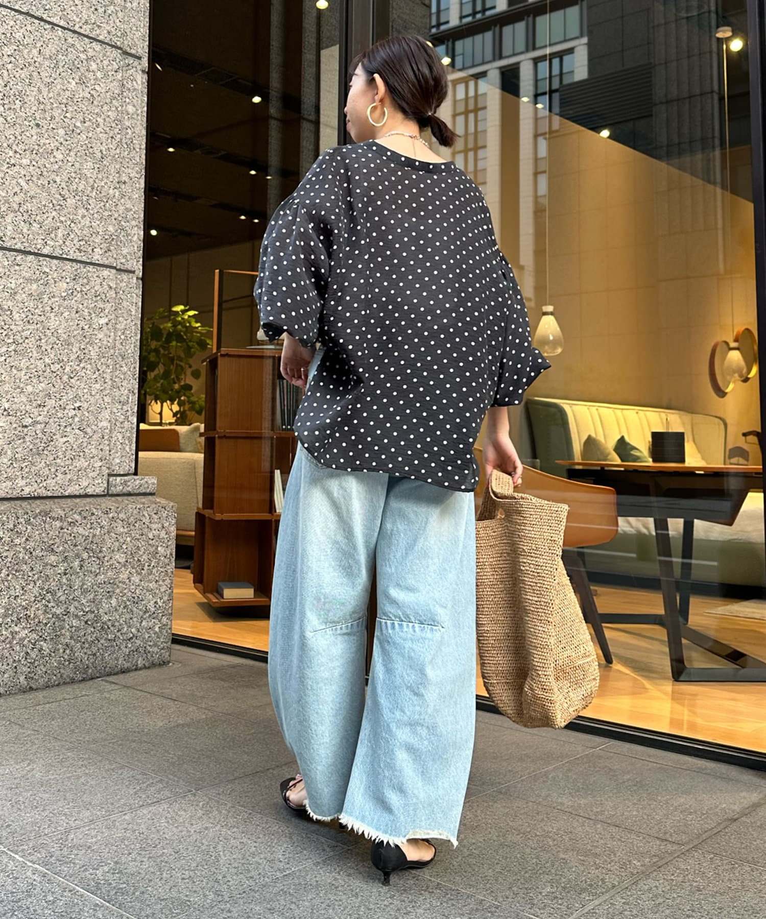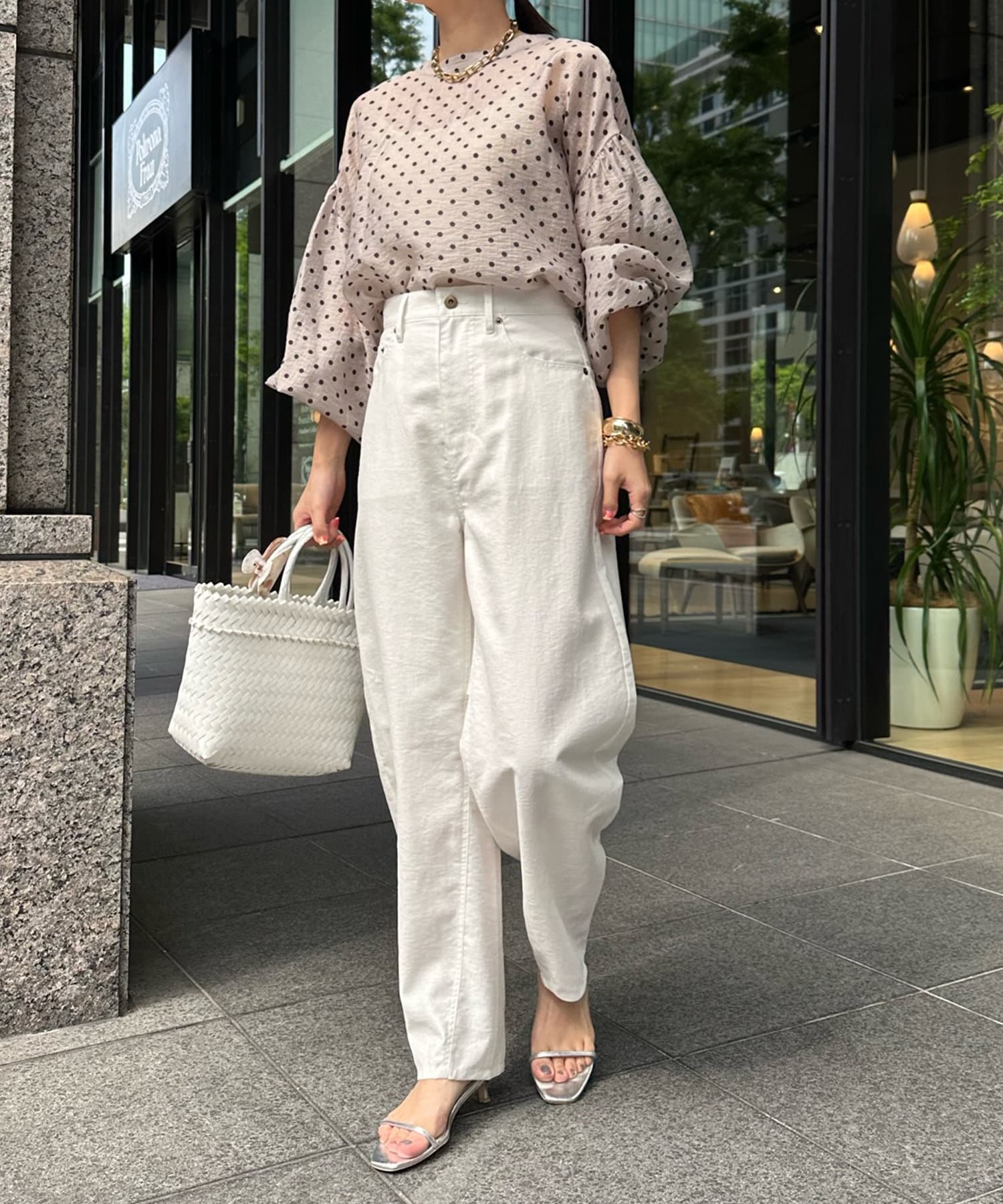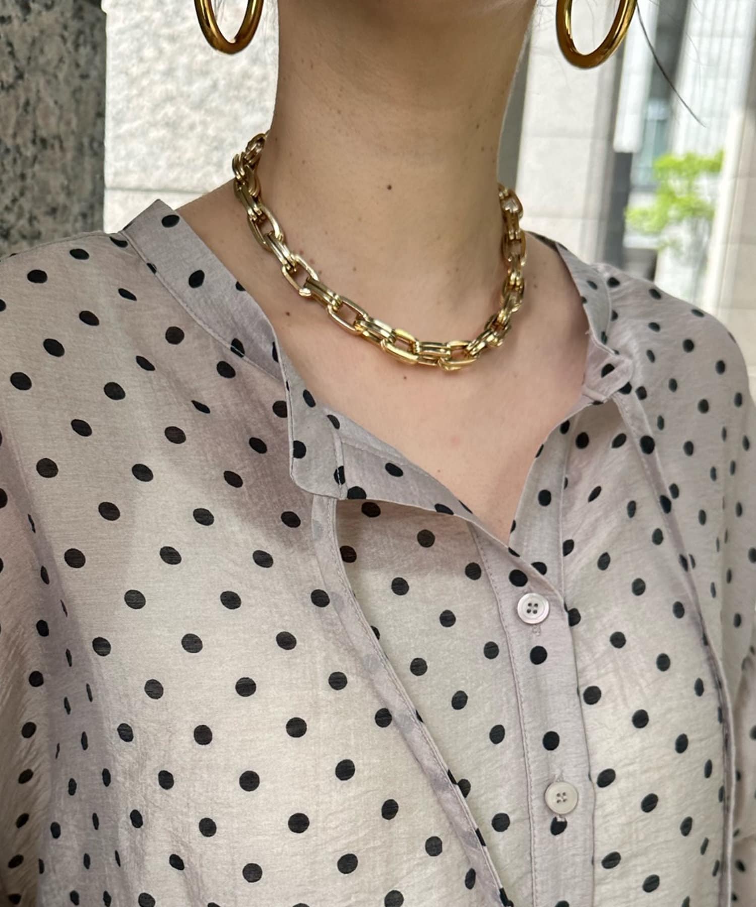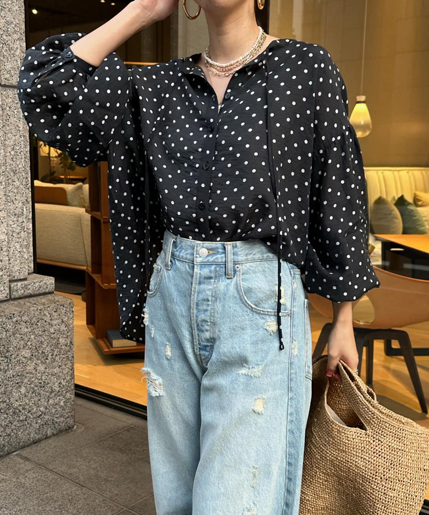 軽く着られるシアー素材+小ぶりなドット柄が甘くなりすぎず、大人に決まるポイントです。