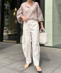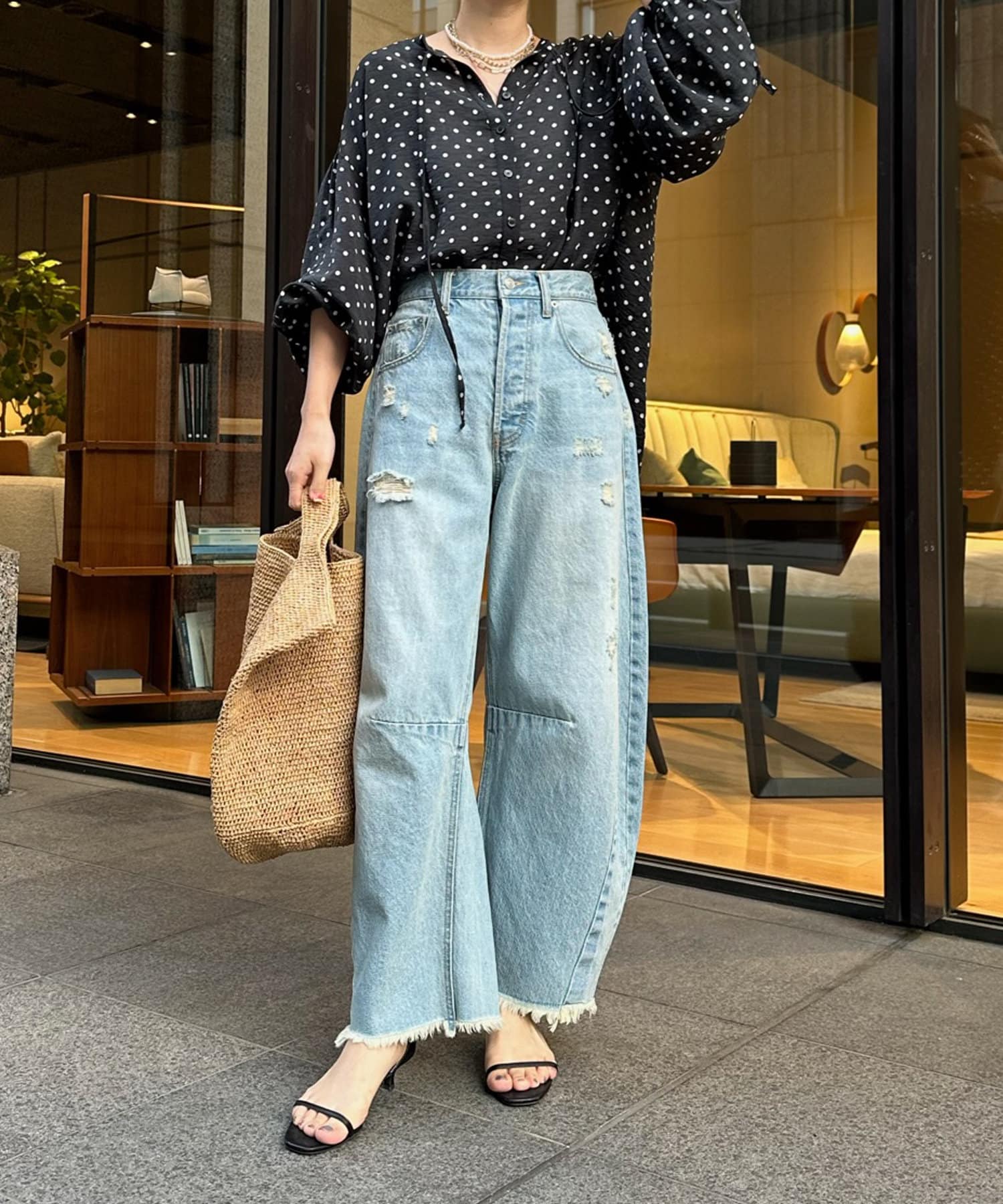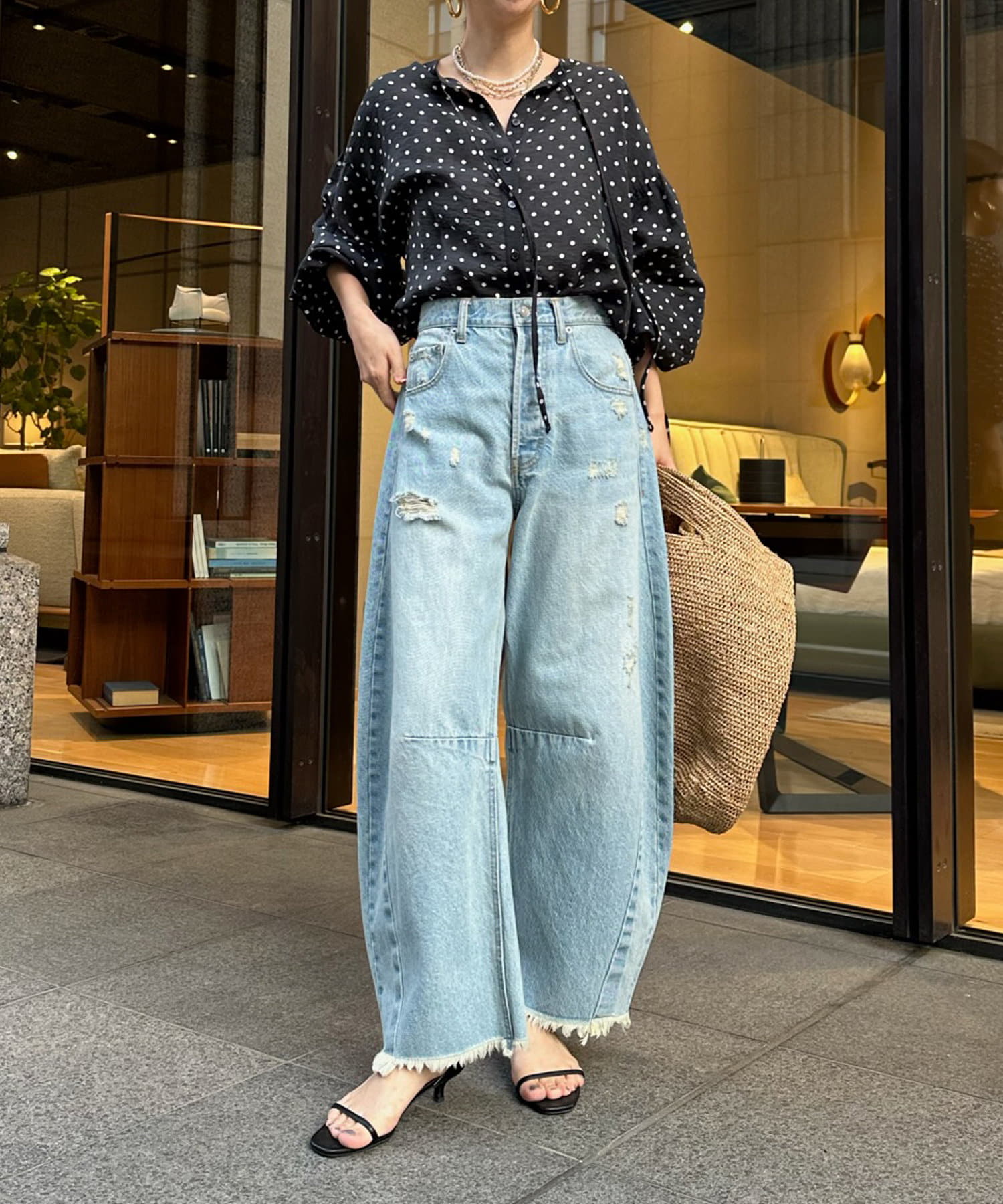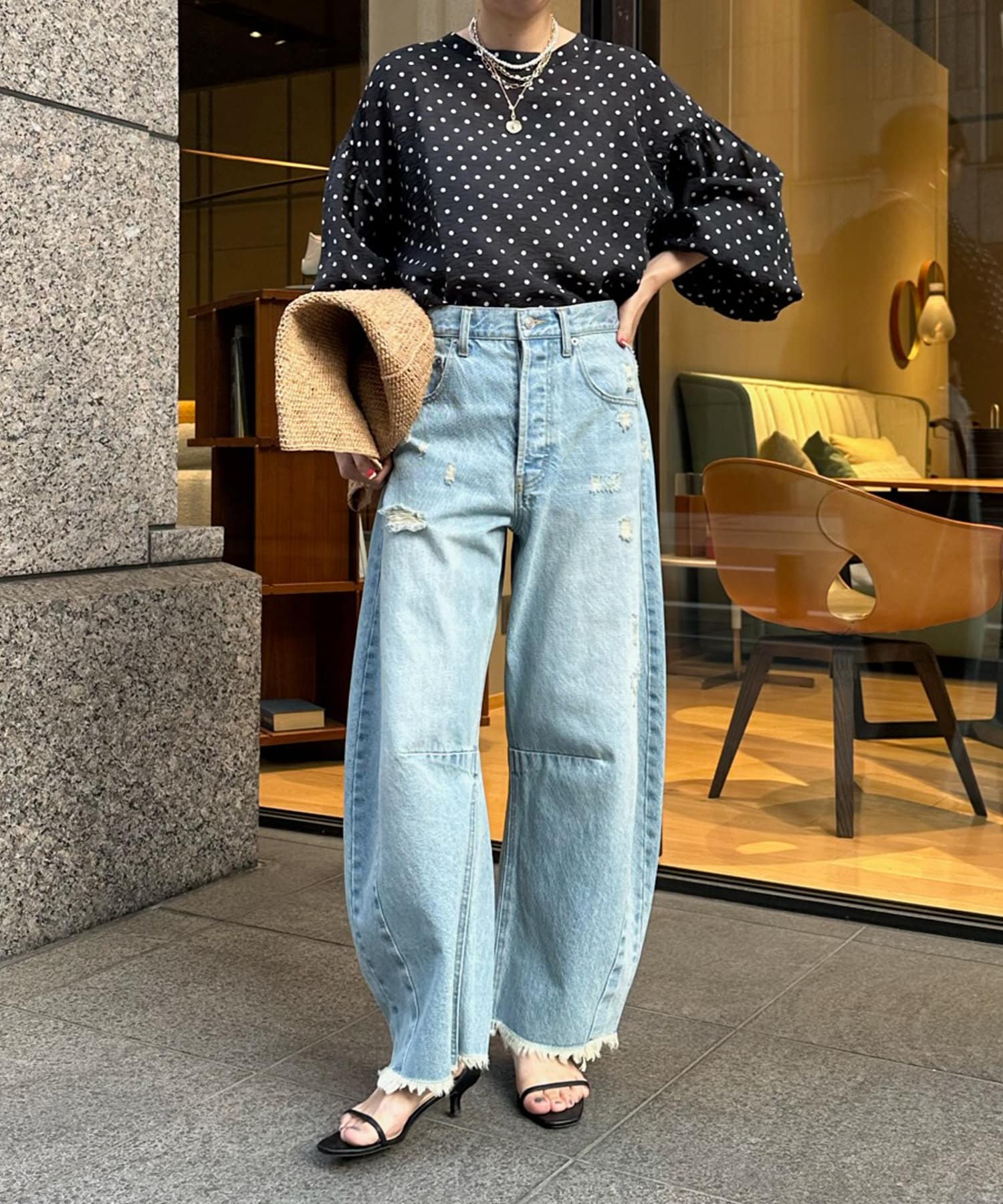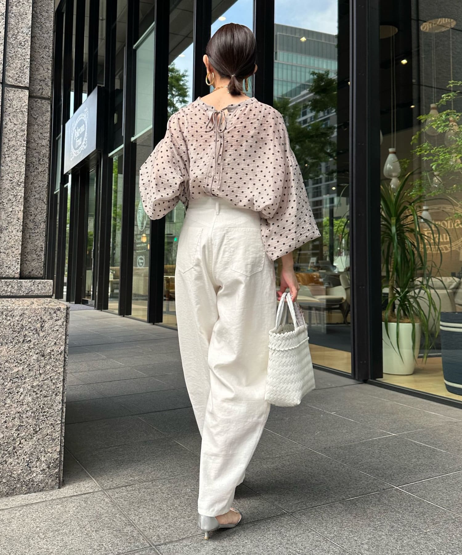 軽く着られるシアー素材+小ぶりなドット柄が甘くなりすぎず、大人に決まるポイントです。