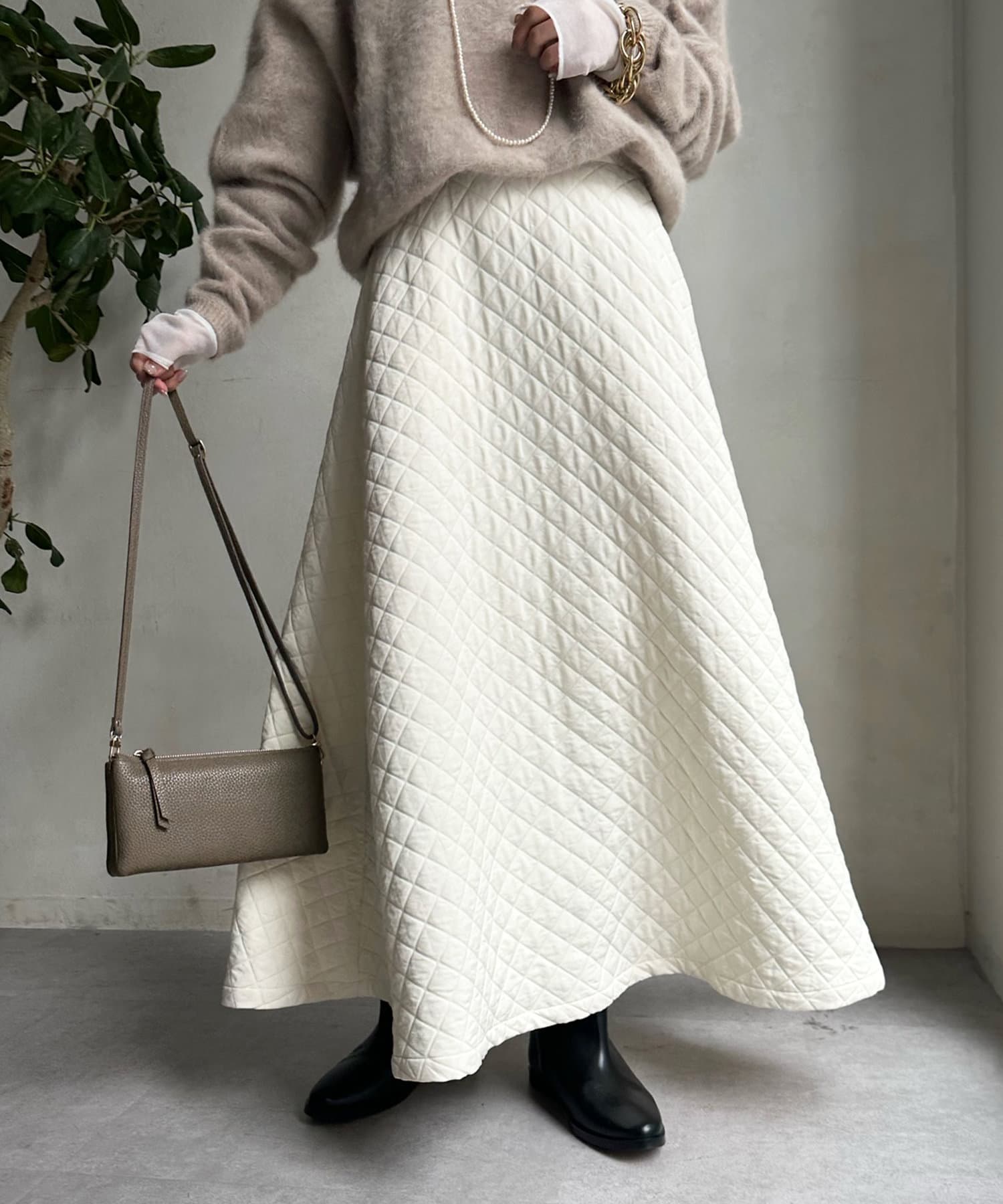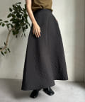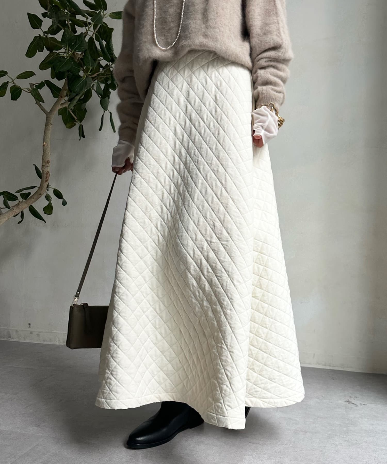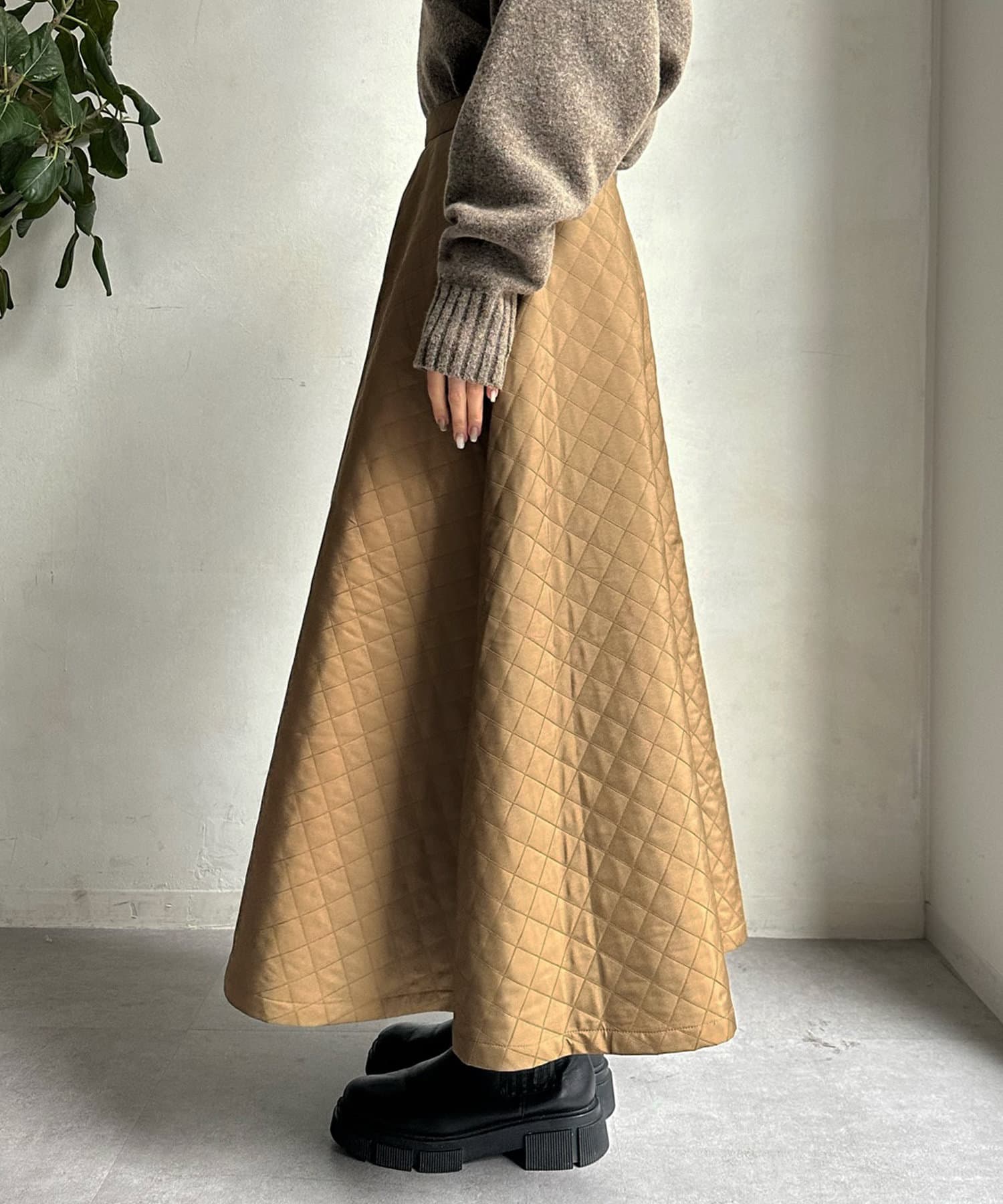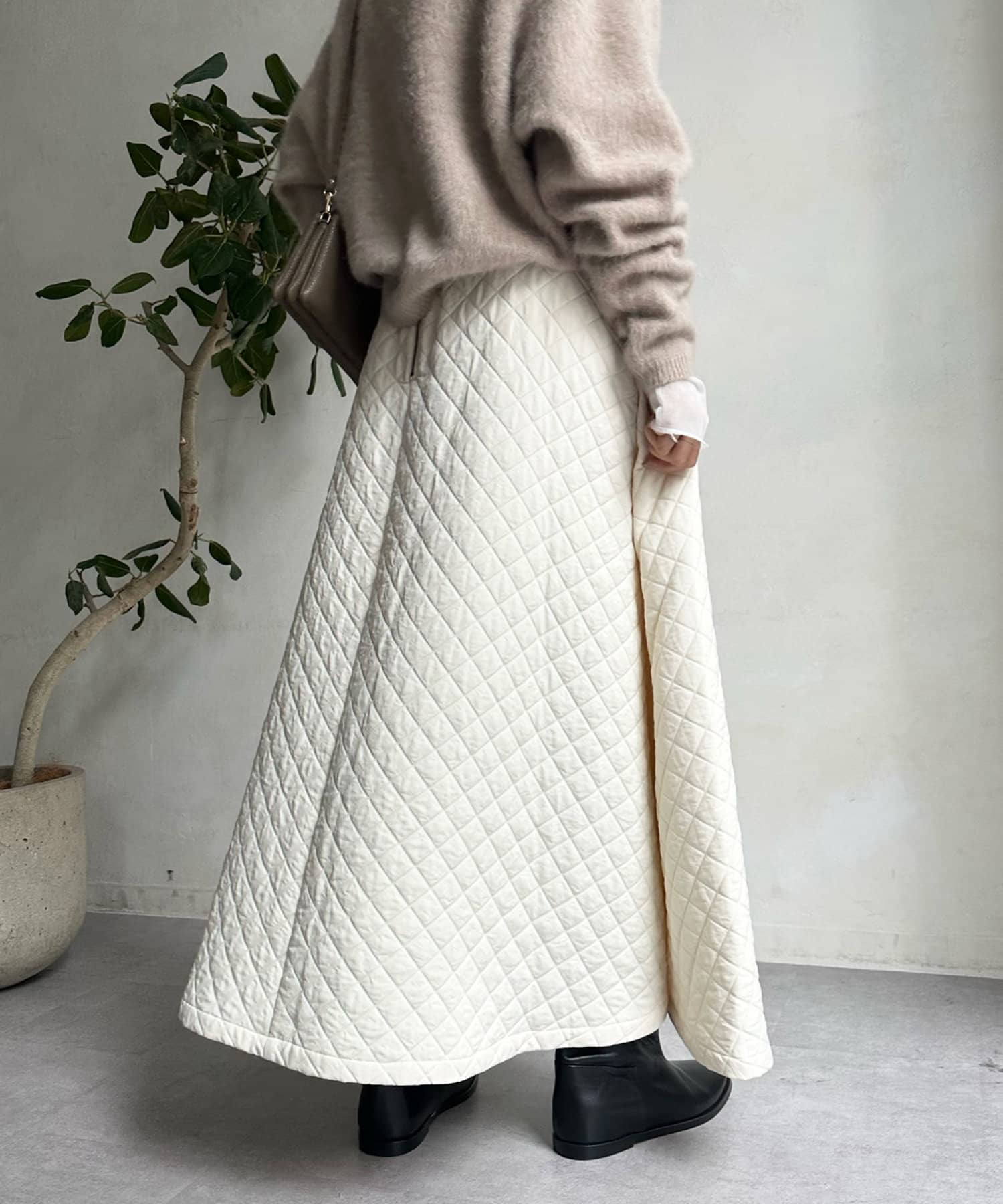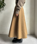 キルティング生地をふんだんに使用し、たっぷりとしたシルエットが特徴のスカート。