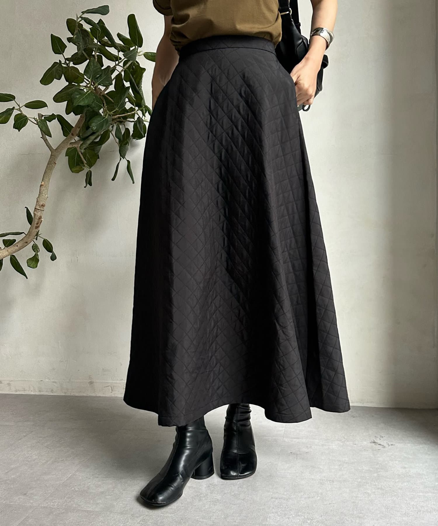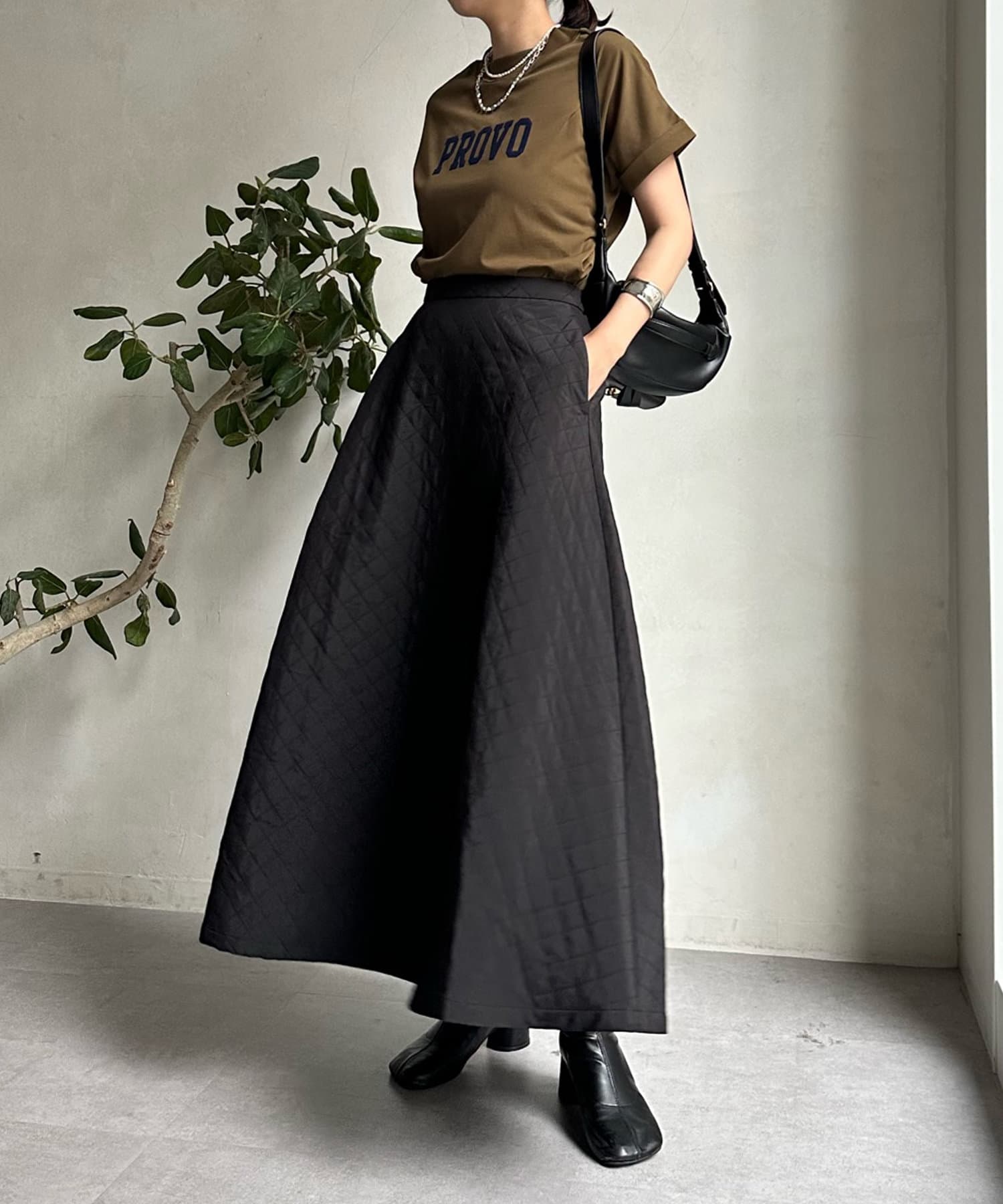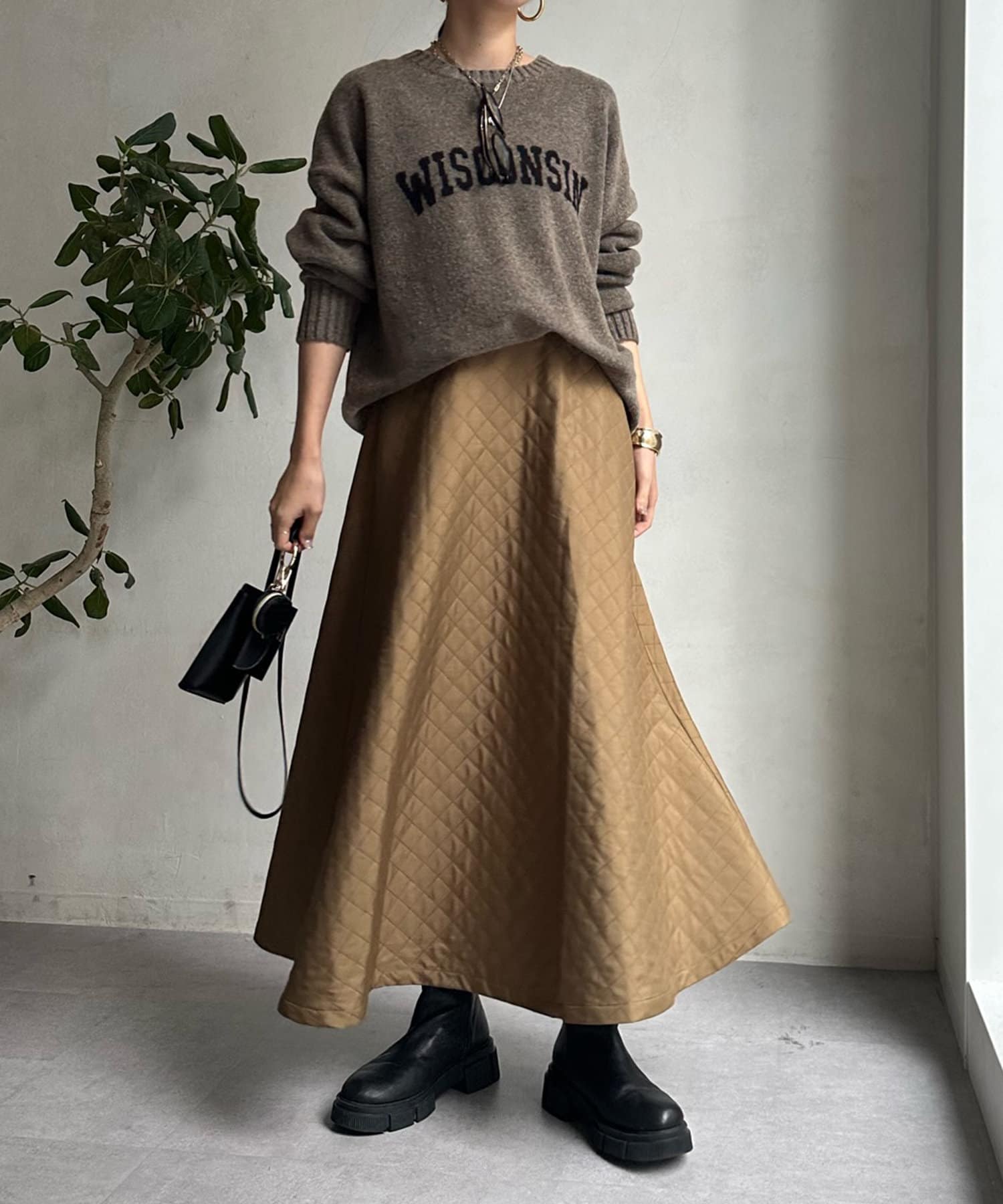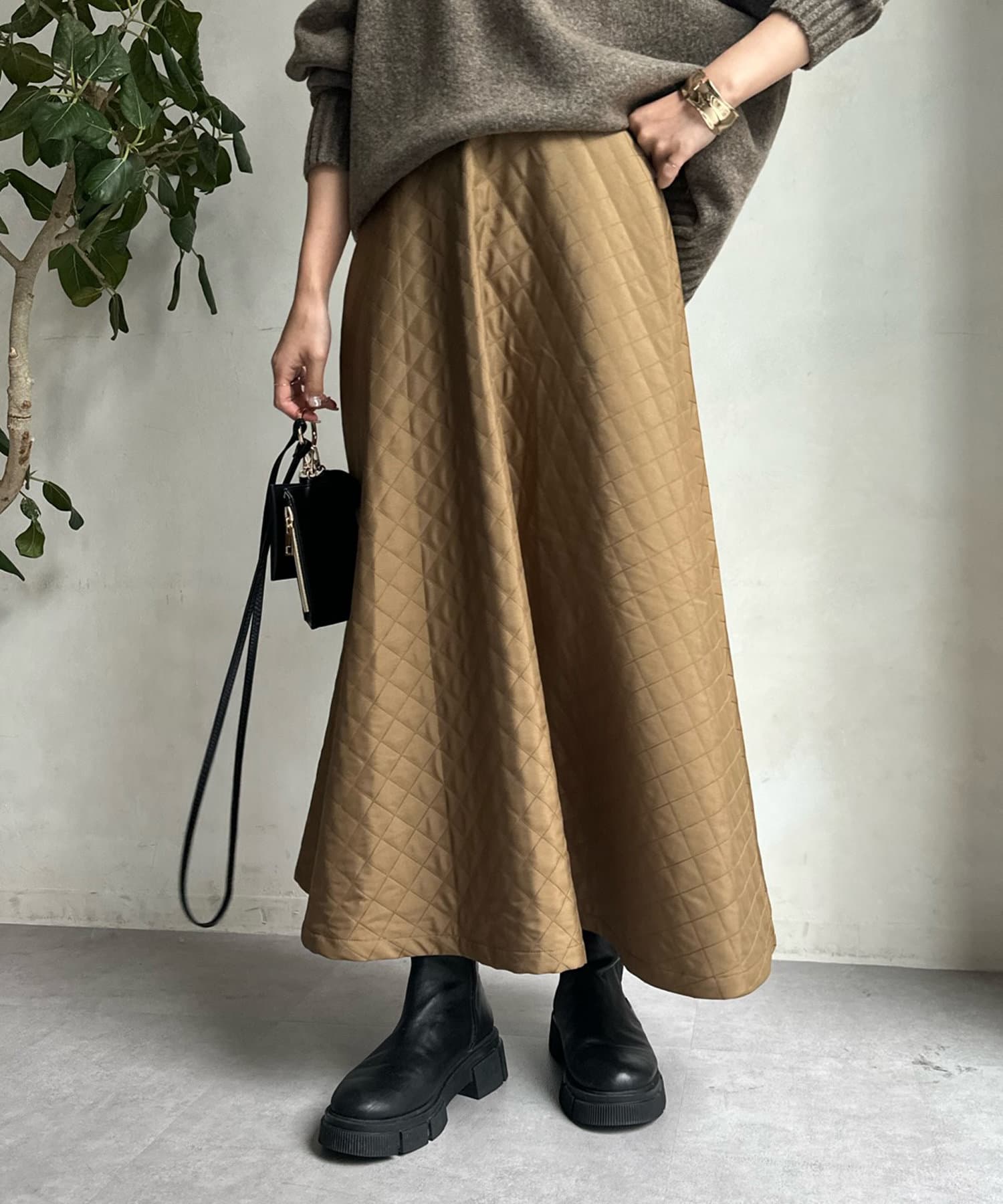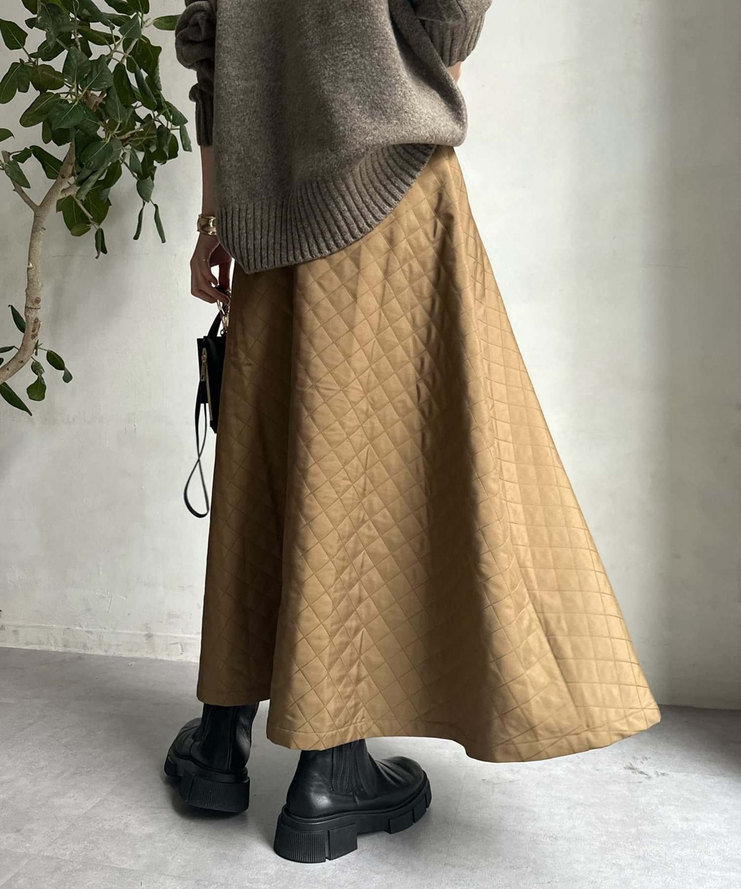 カジュアル見えするキルティング素材ですが、フレアに仕上げることでレディな印象を与えてくれます。