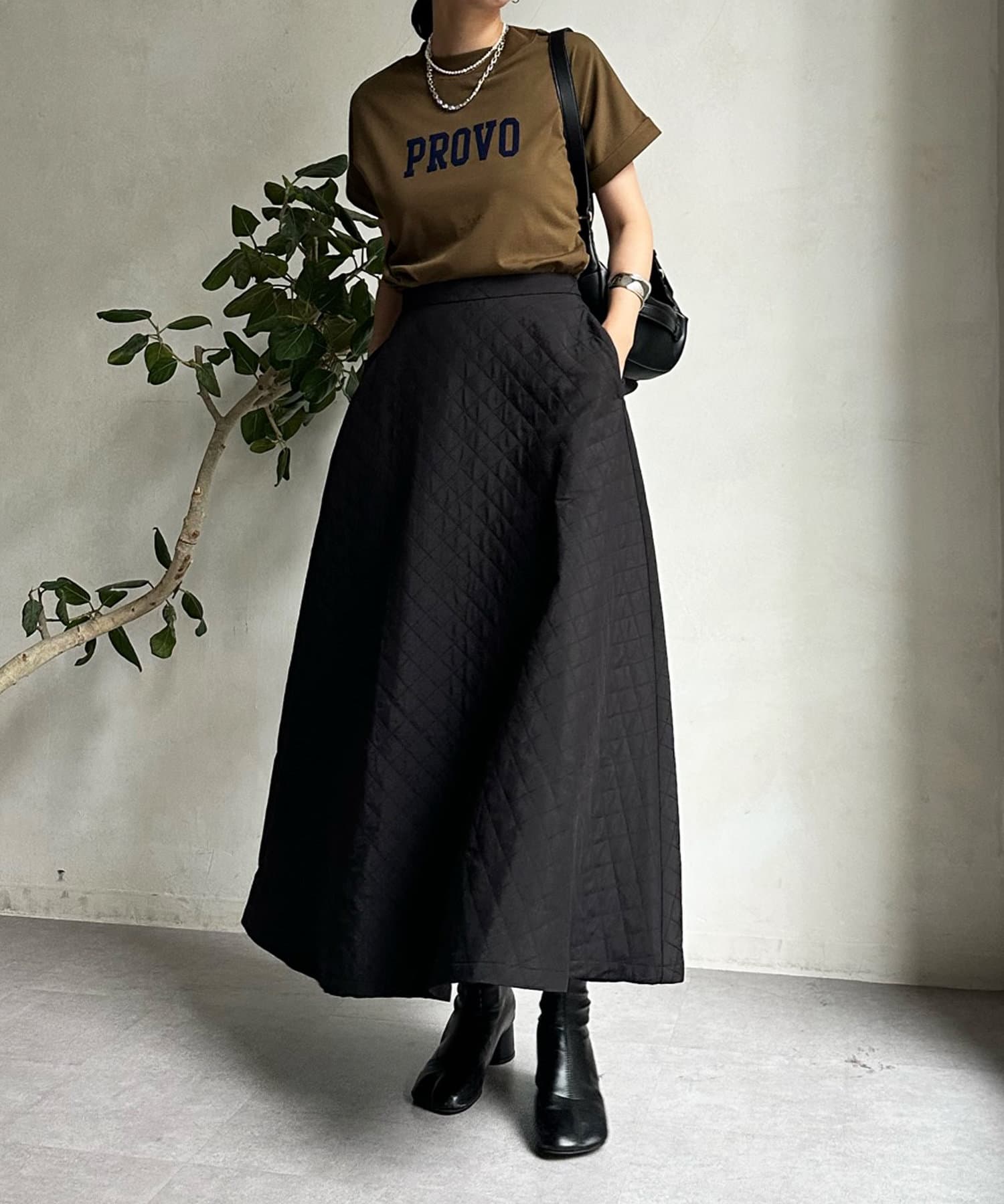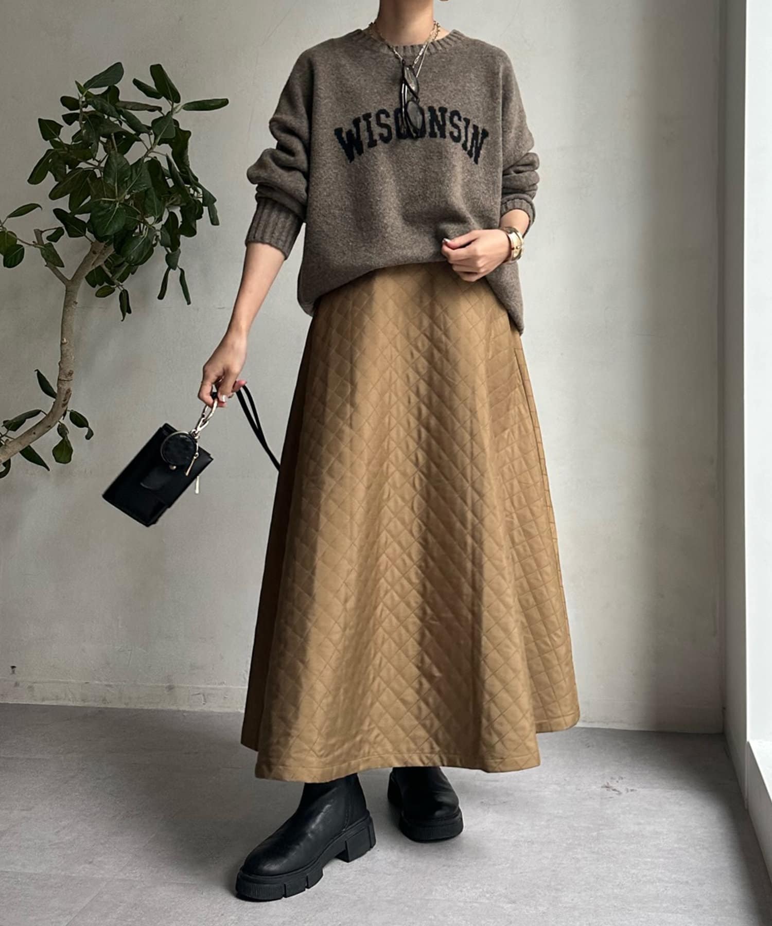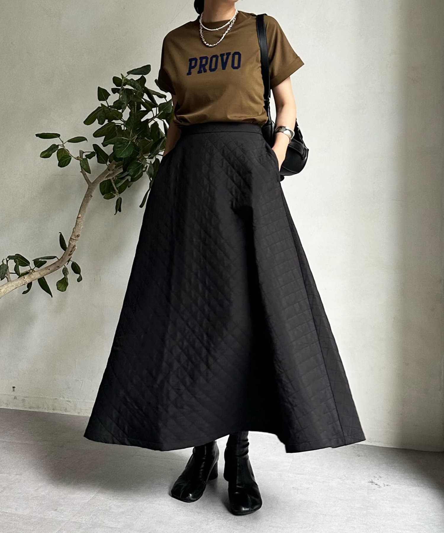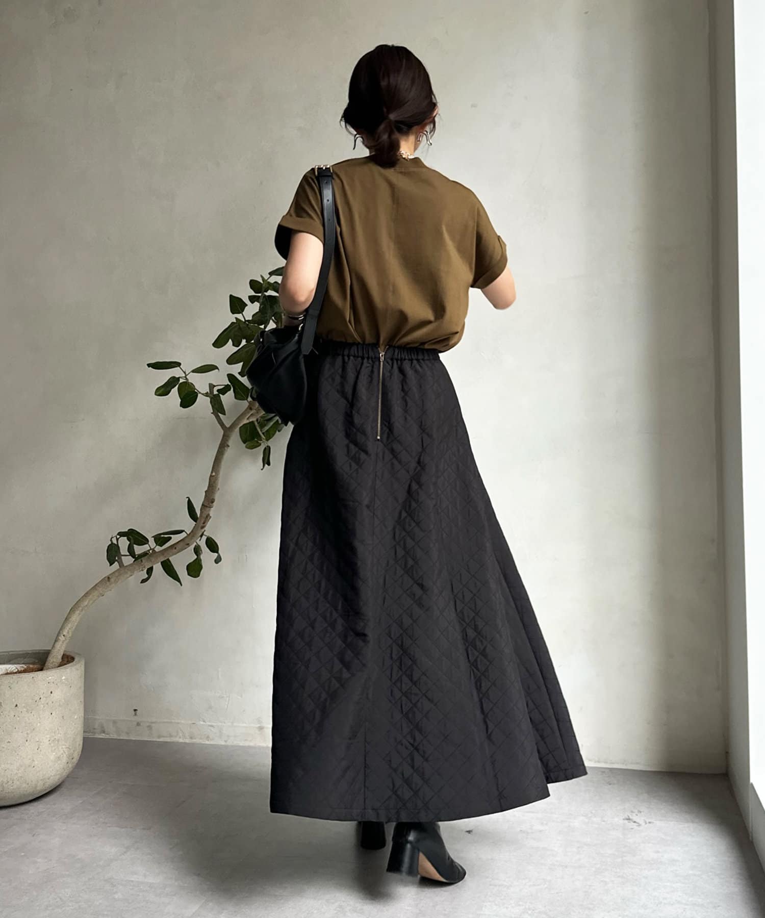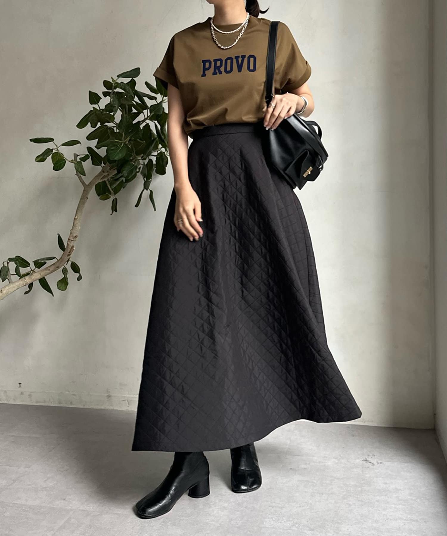 カジュアル見えするキルティング素材ですが、フレアに仕上げることでレディな印象を与えてくれます。