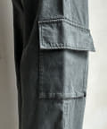 グレーとブルーが混ざったようなネイビーは、先ずブルーデニムをブリーチ加工で薄めカラーにしてから、ネイビーに製品染め、ストーンウォッシュで激しめに洗い、生地に凹凸感と深みを出しています。
