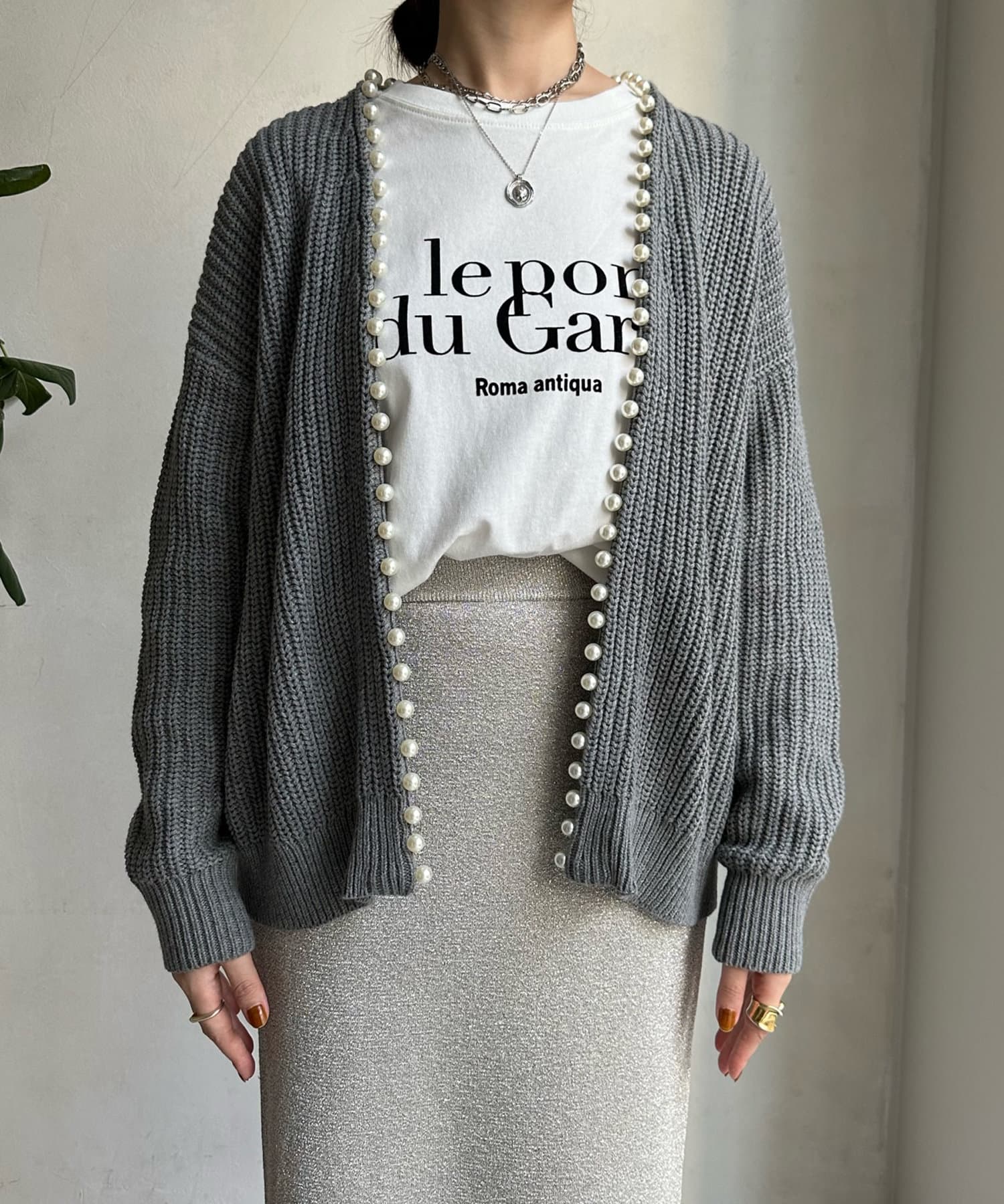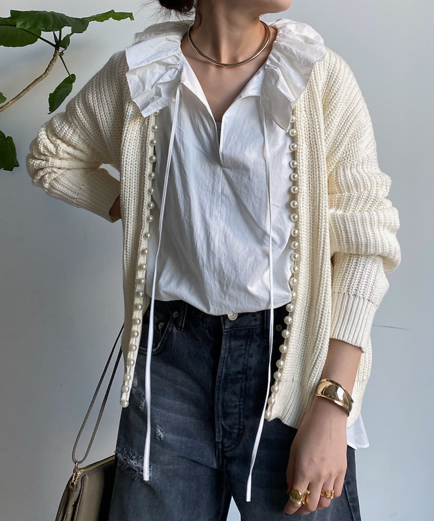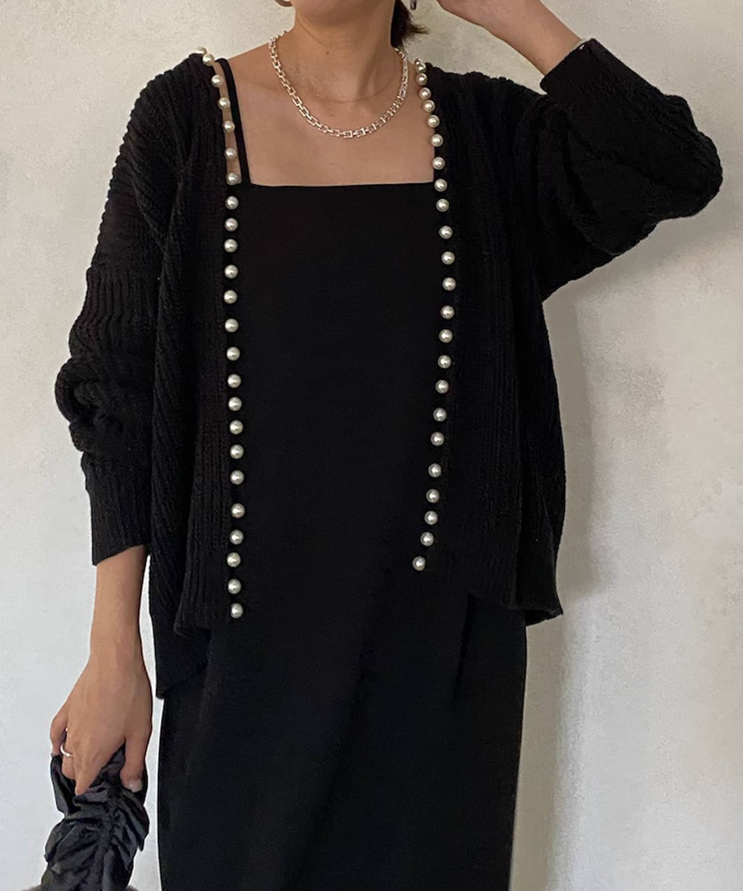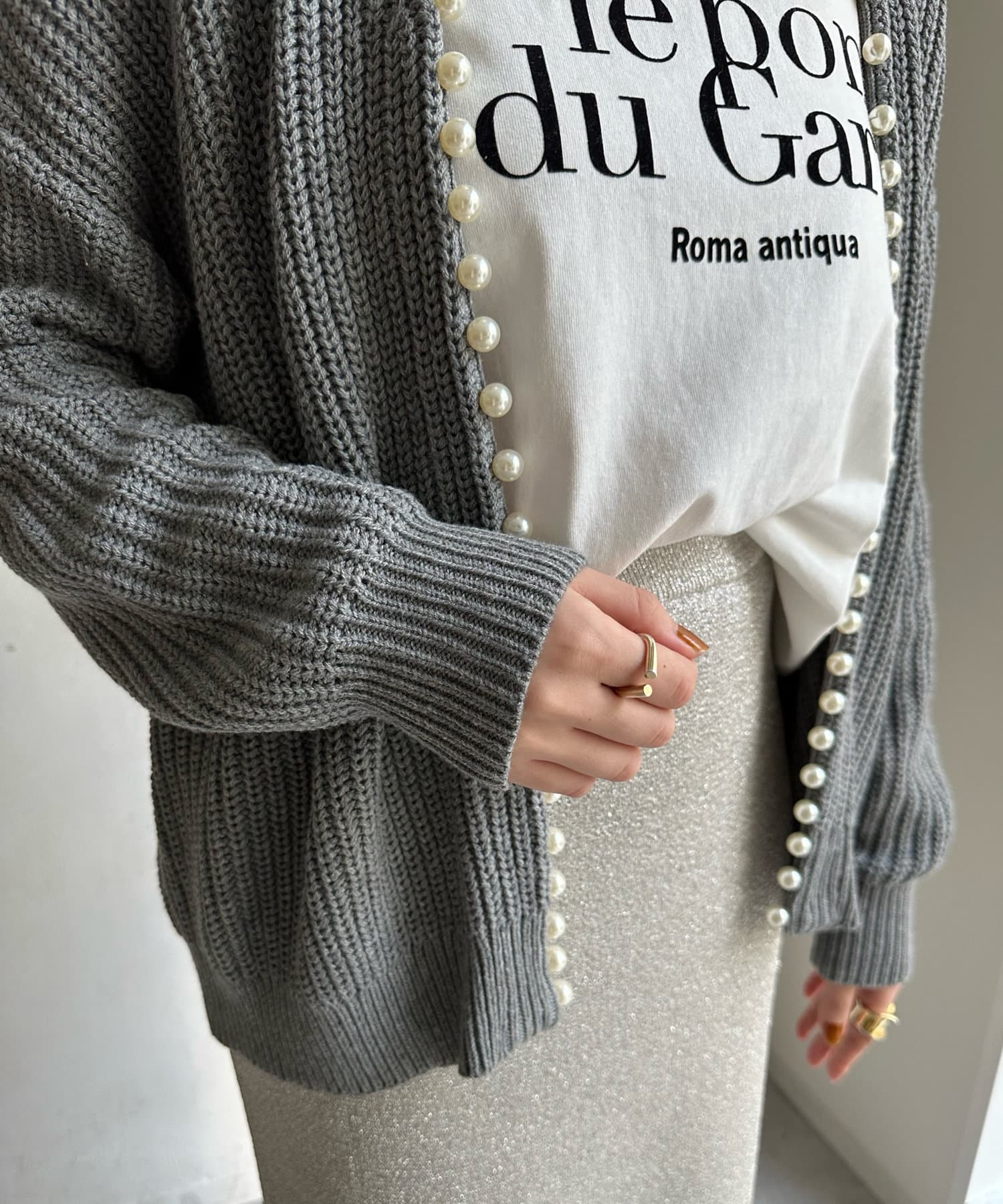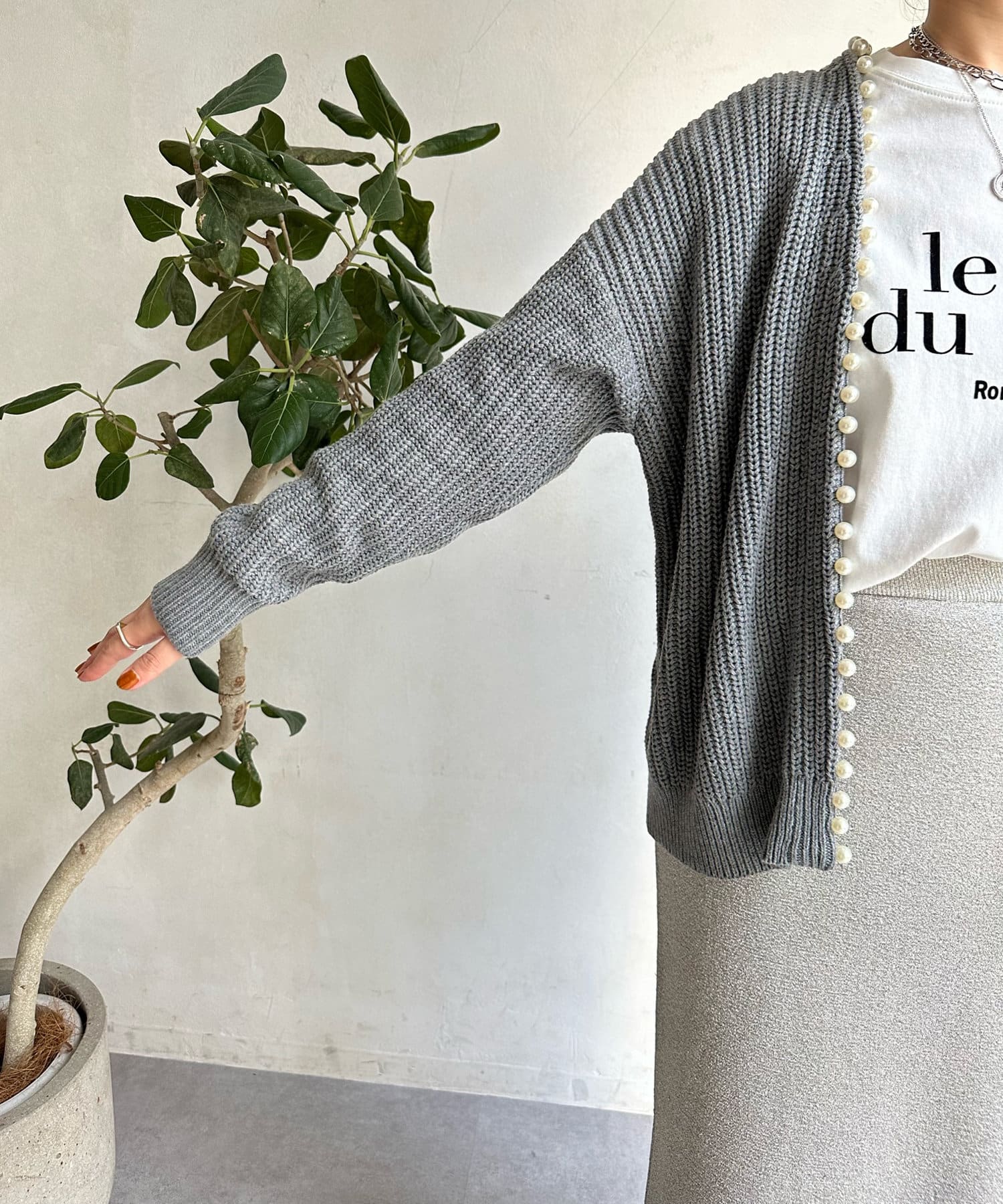 シンプルなカラーのニットに、トレンドのパールを施したデザインカーディガン。