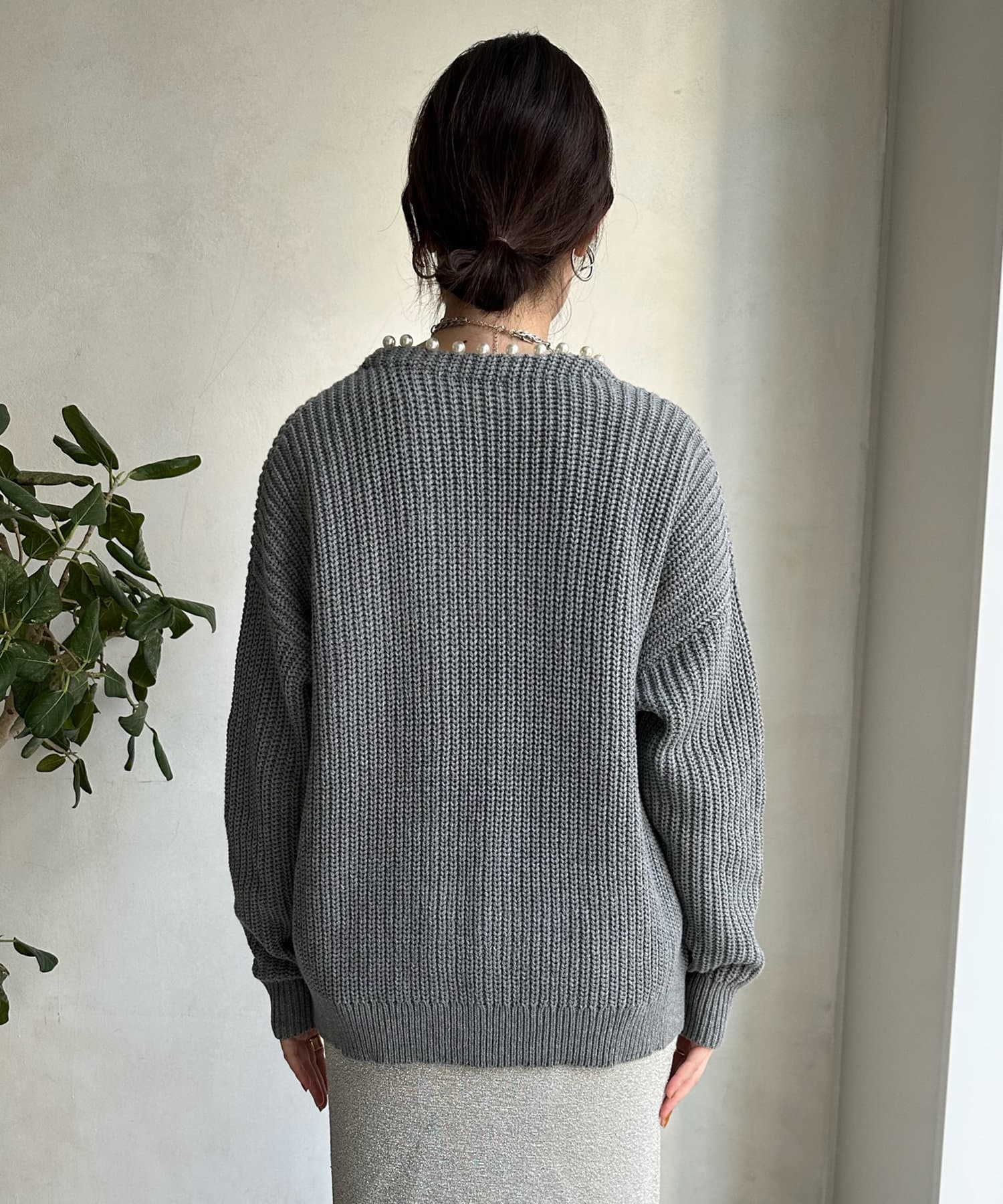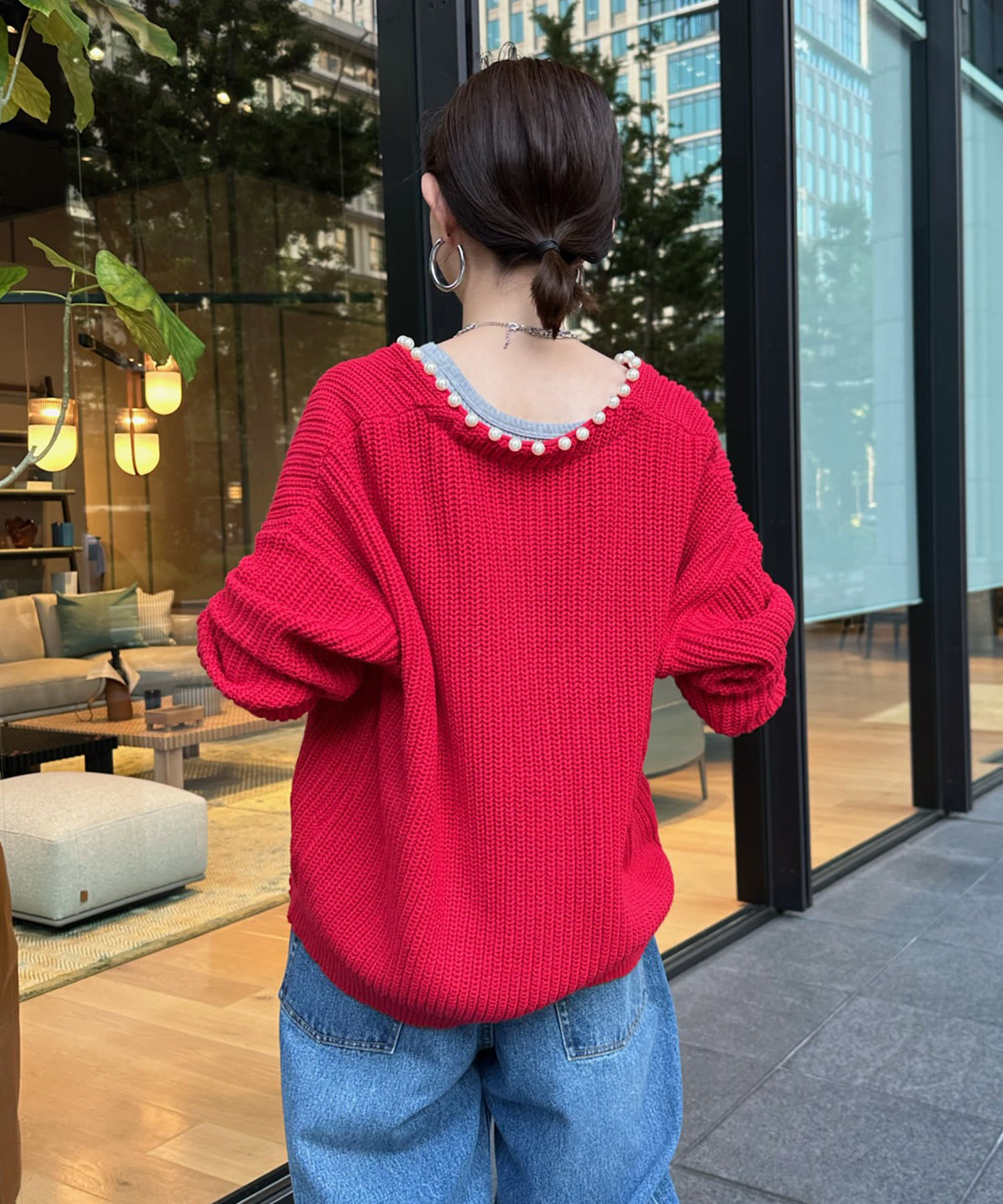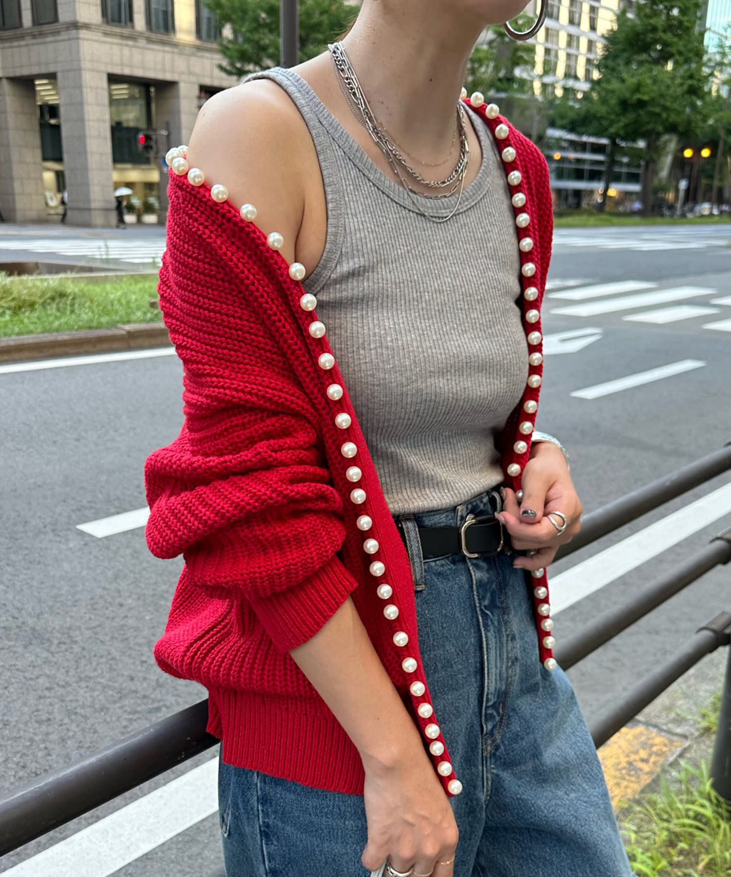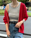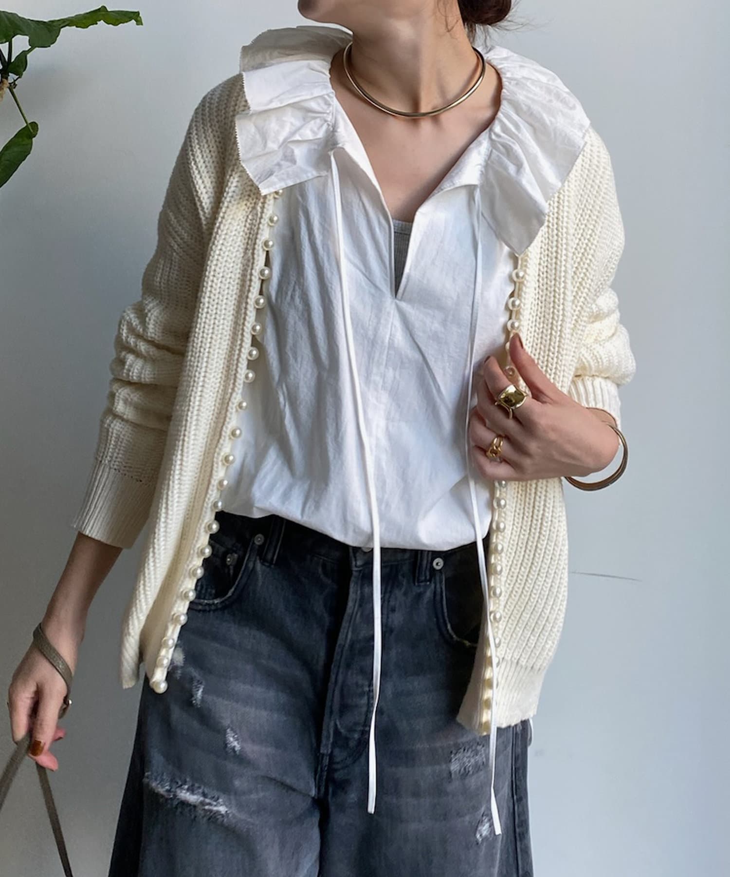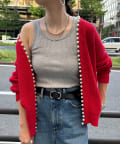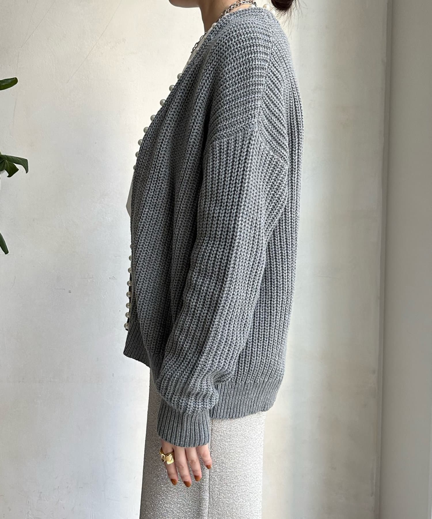 シンプルなカラーのニットに、トレンドのパールを施したデザインカーディガン。