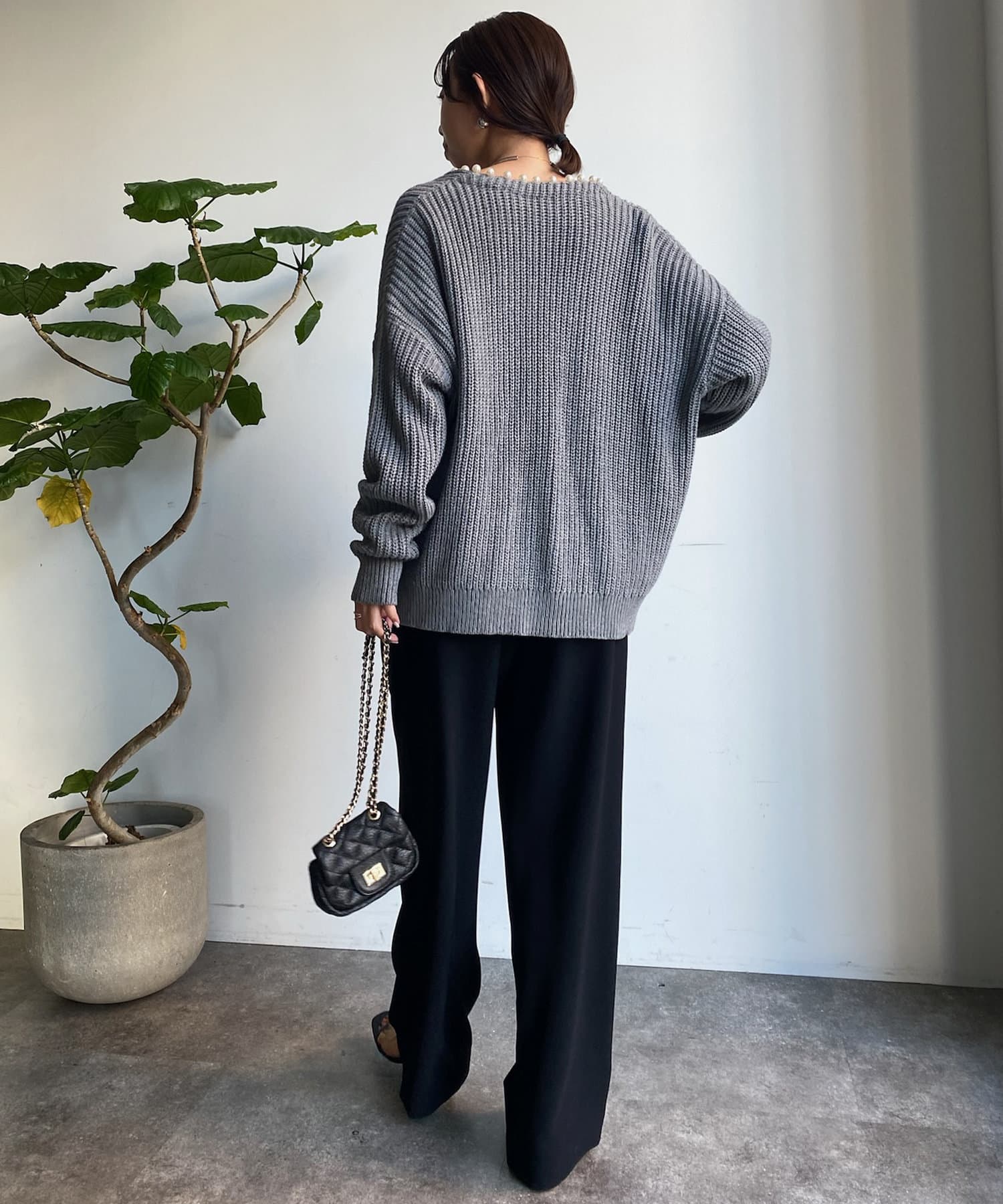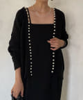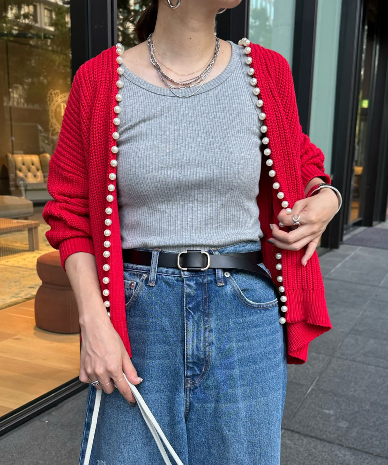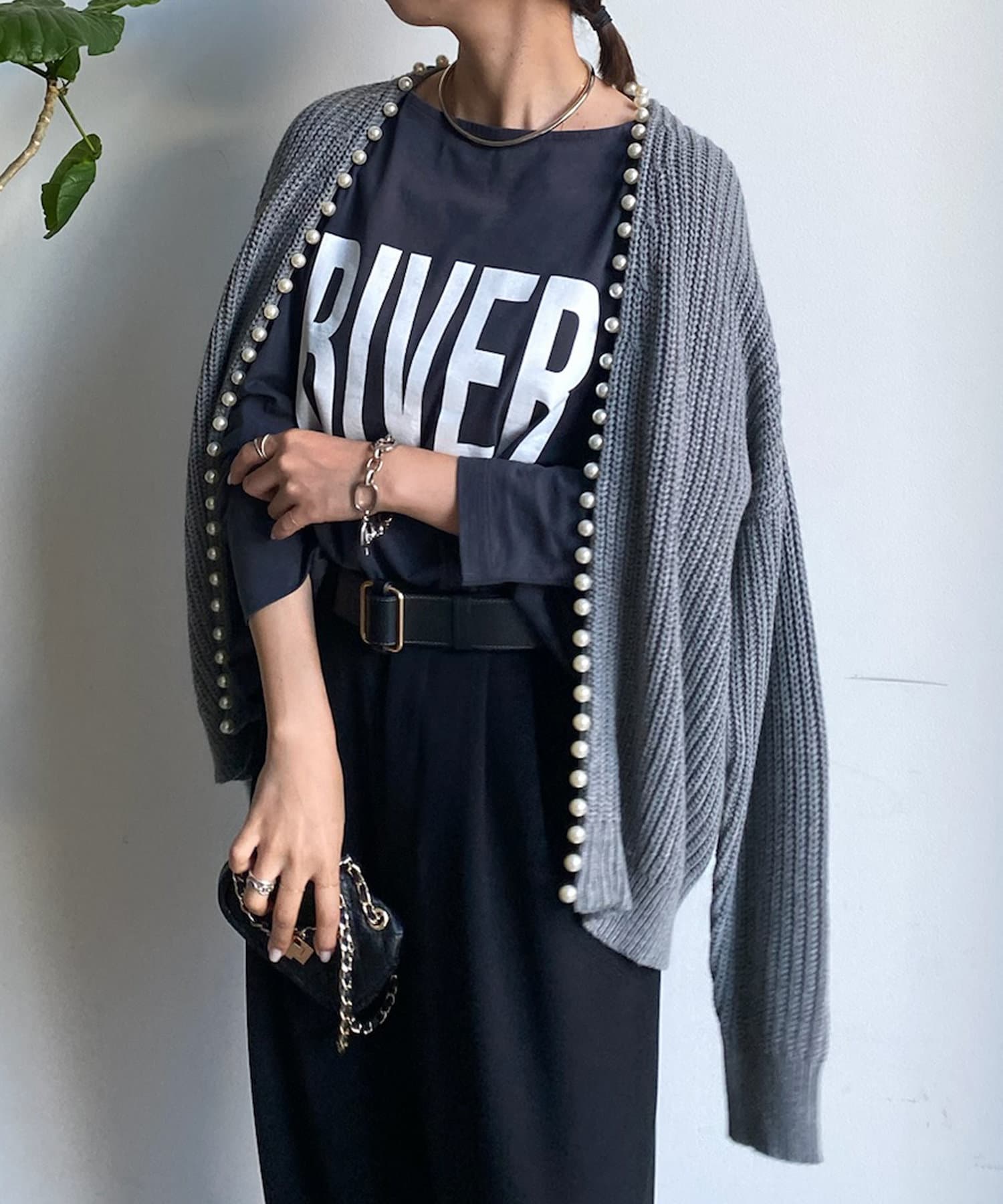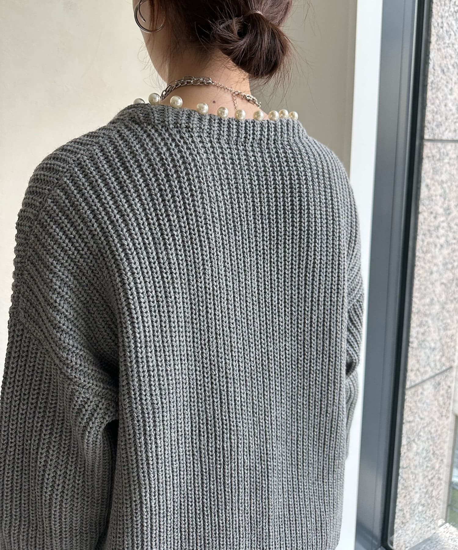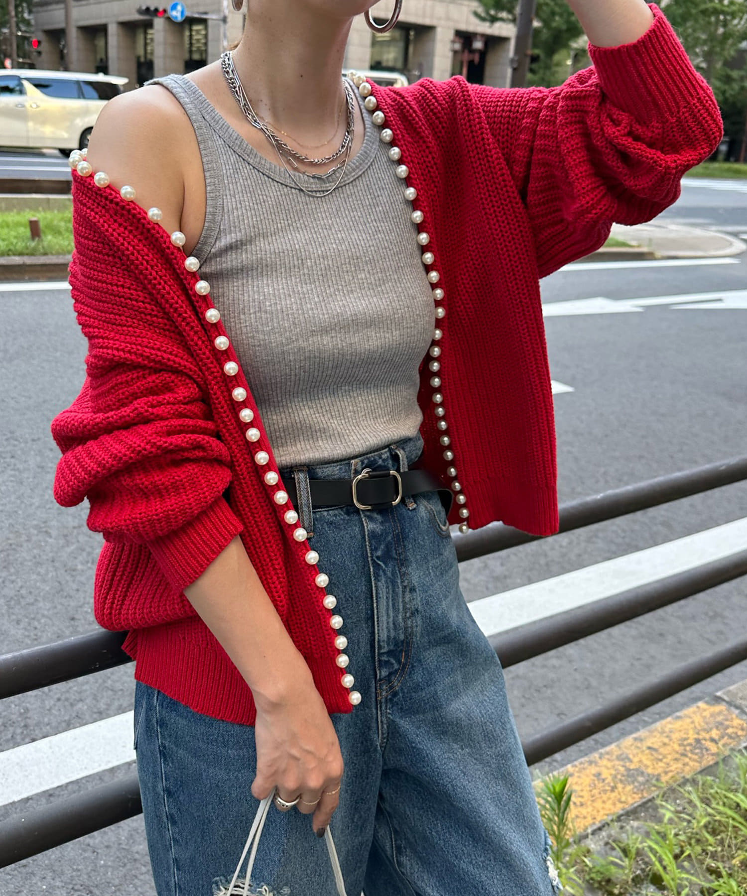 シンプルなカラーのニットに、トレンドのパールを施したデザインカーディガン。