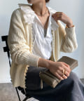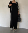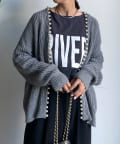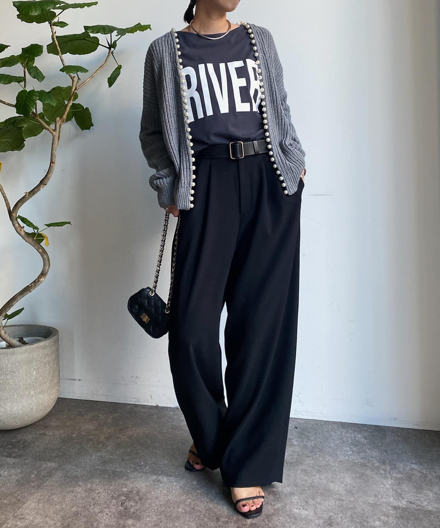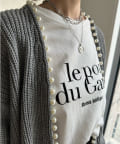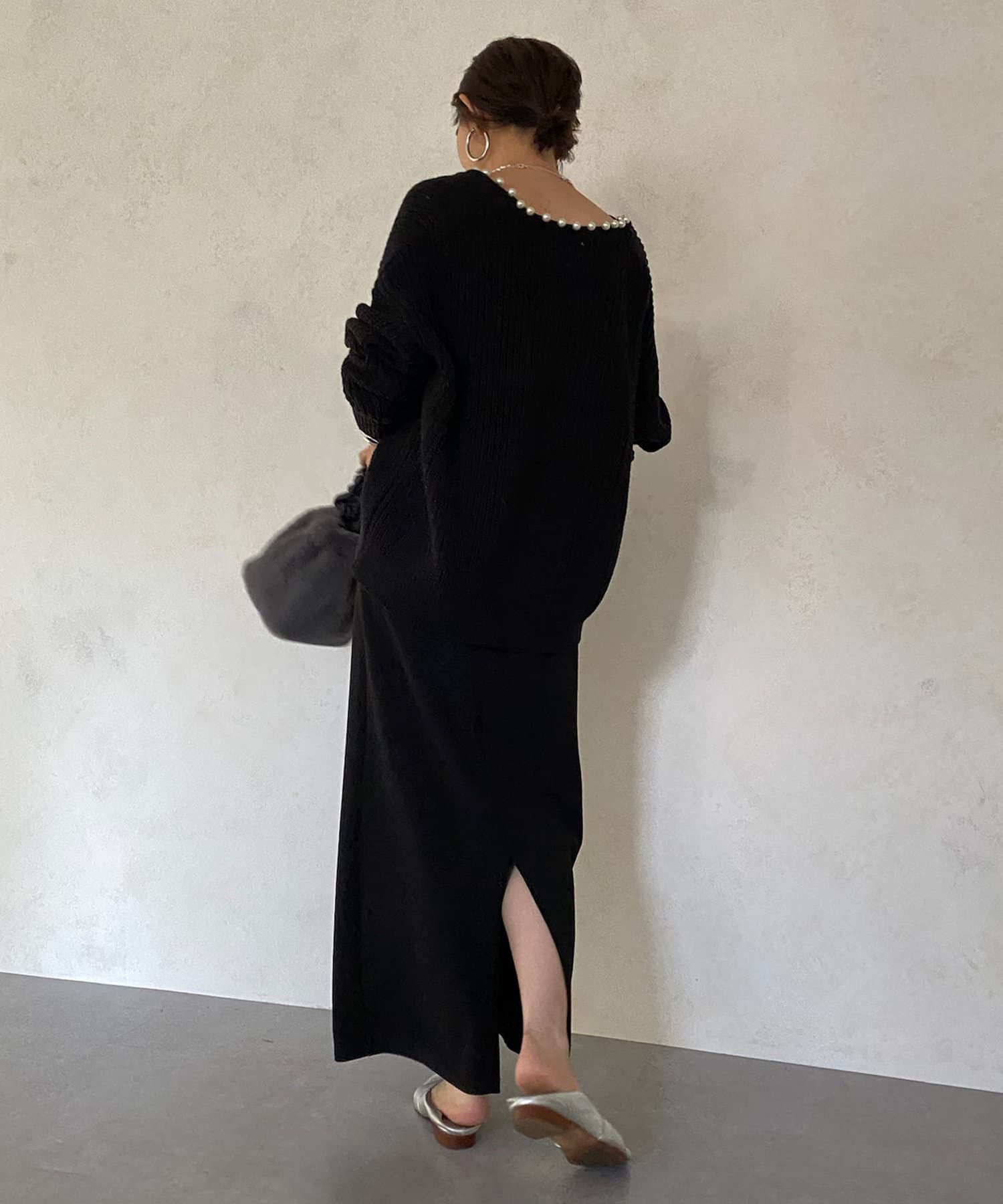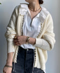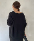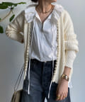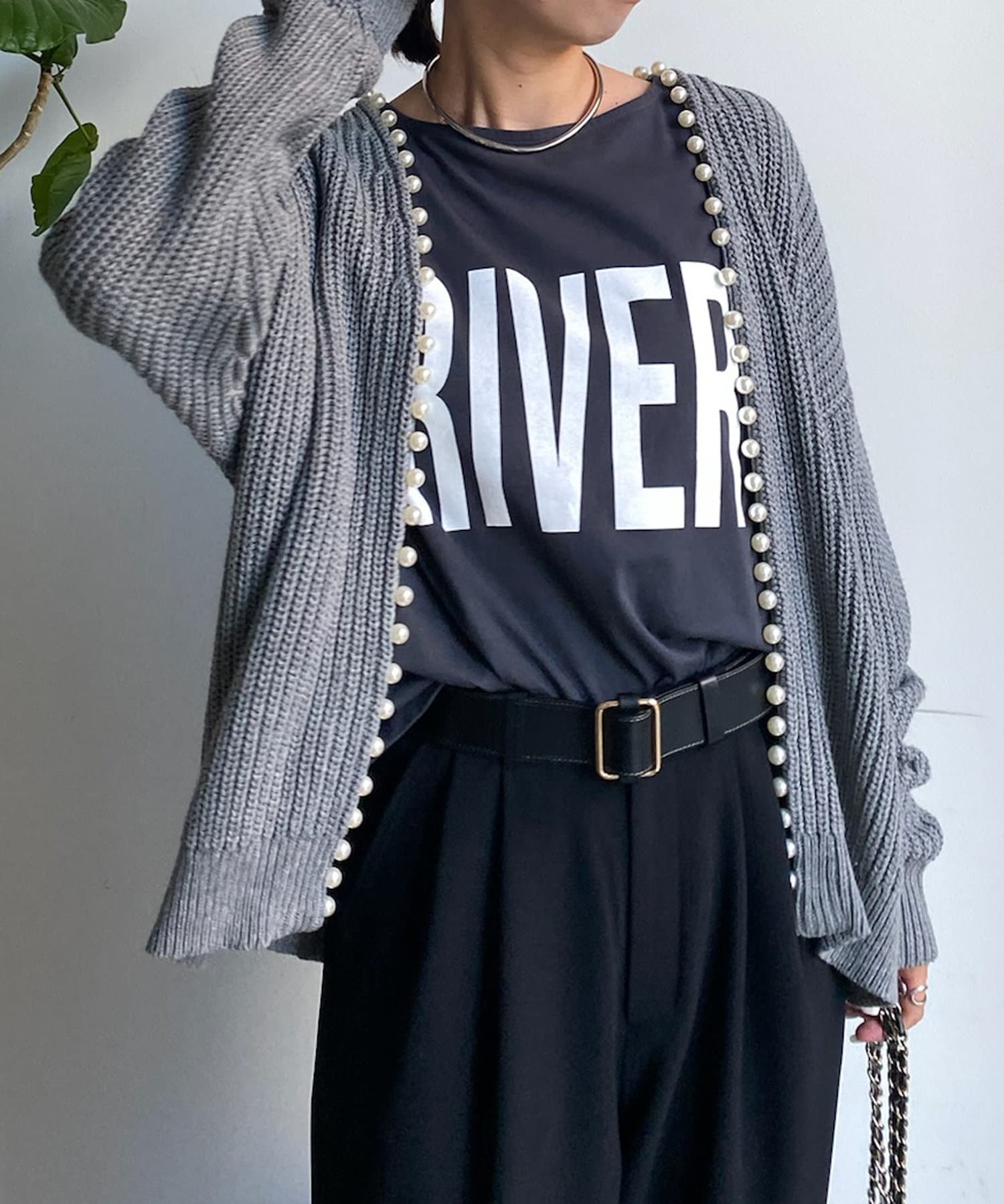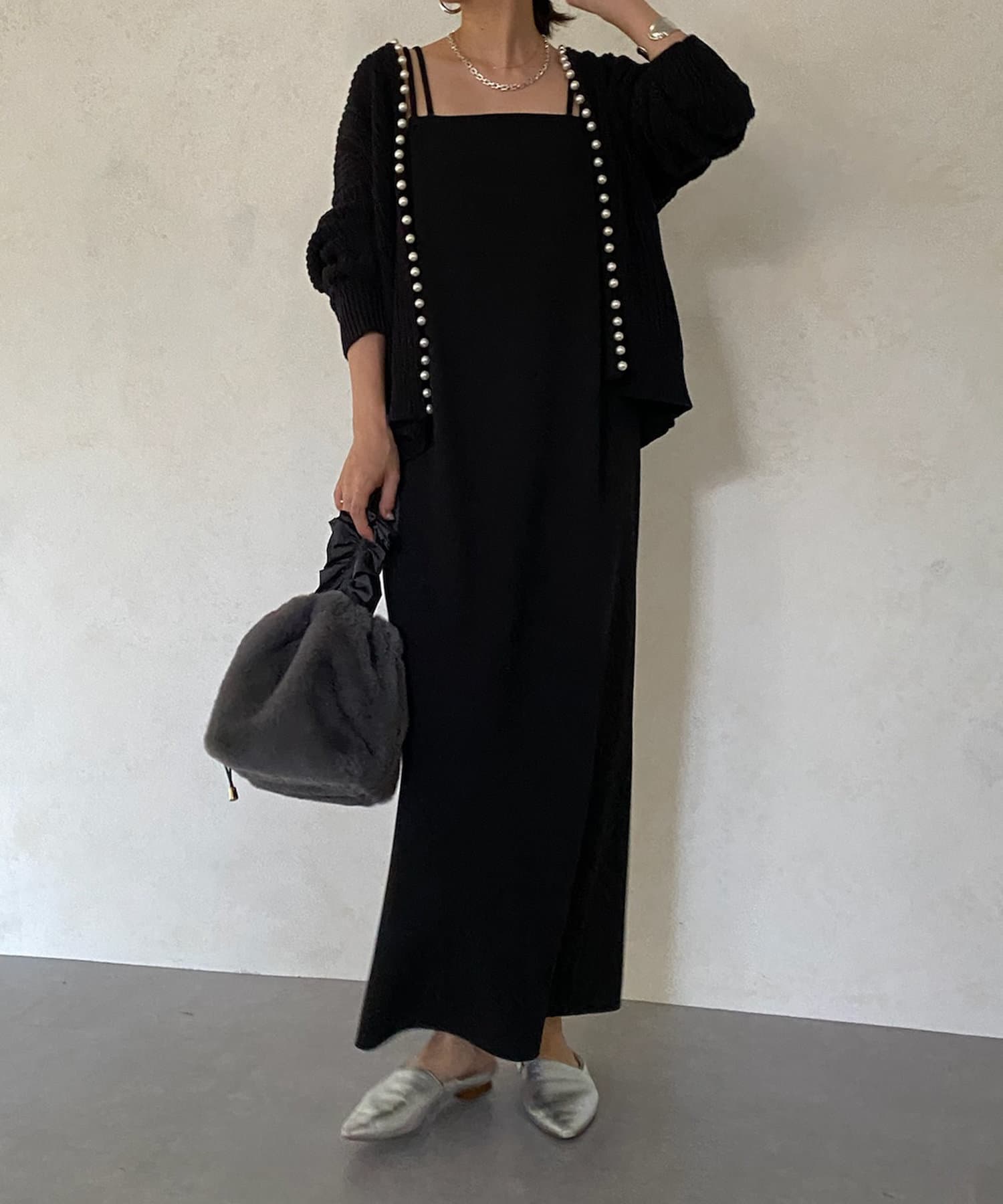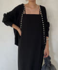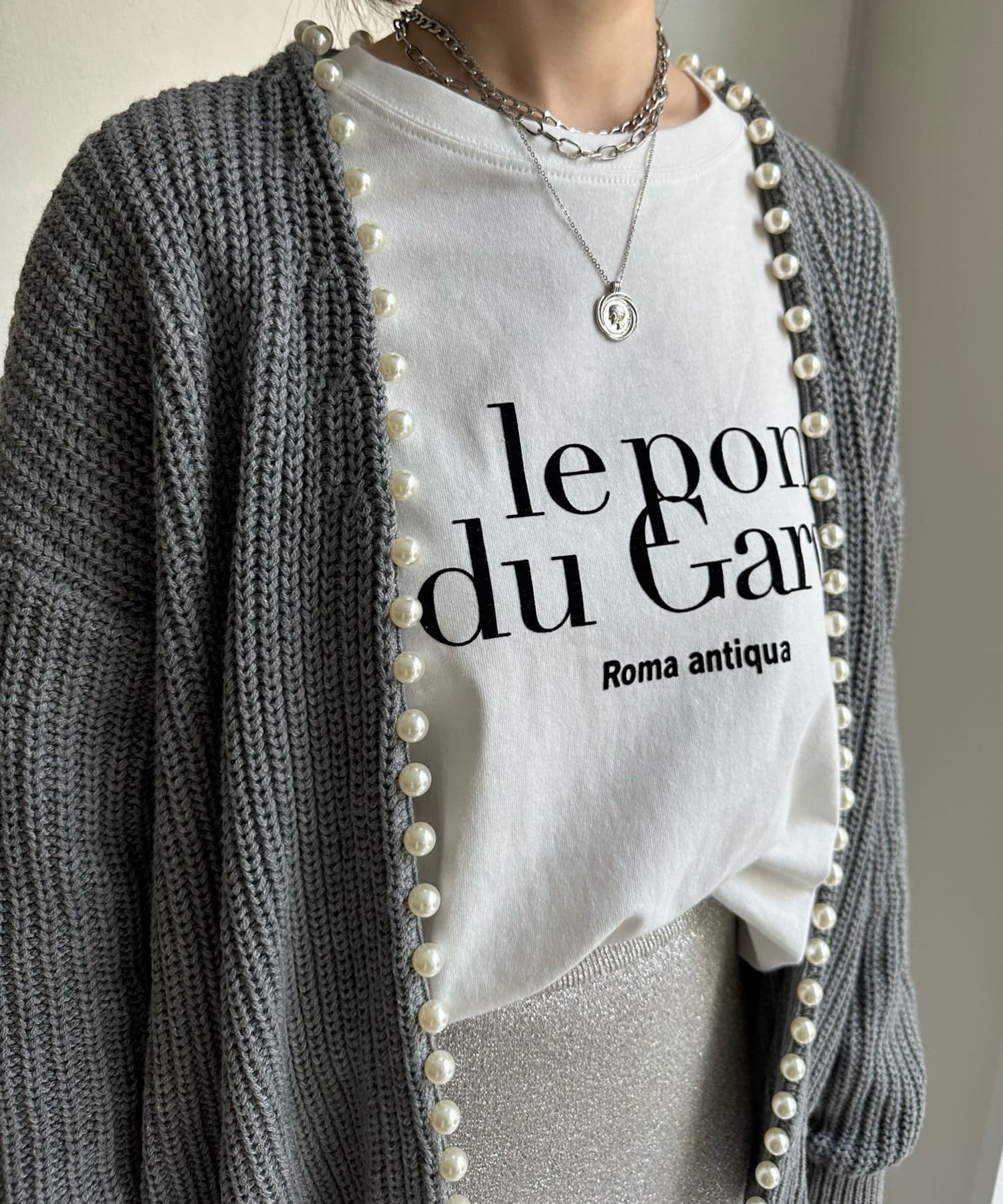 シンプルなカラーのニットに、トレンドのパールを施したデザインカーディガン。