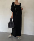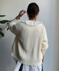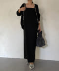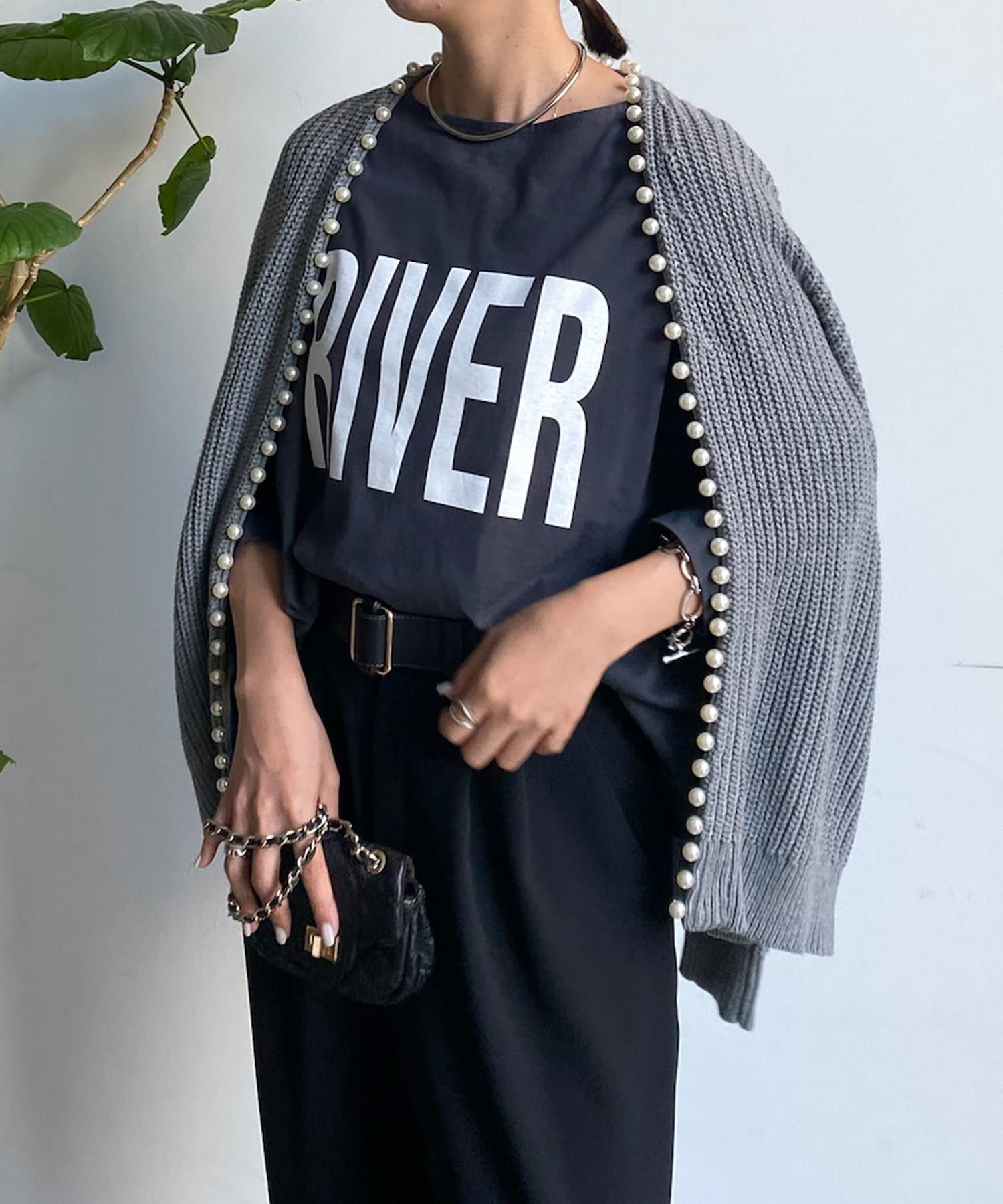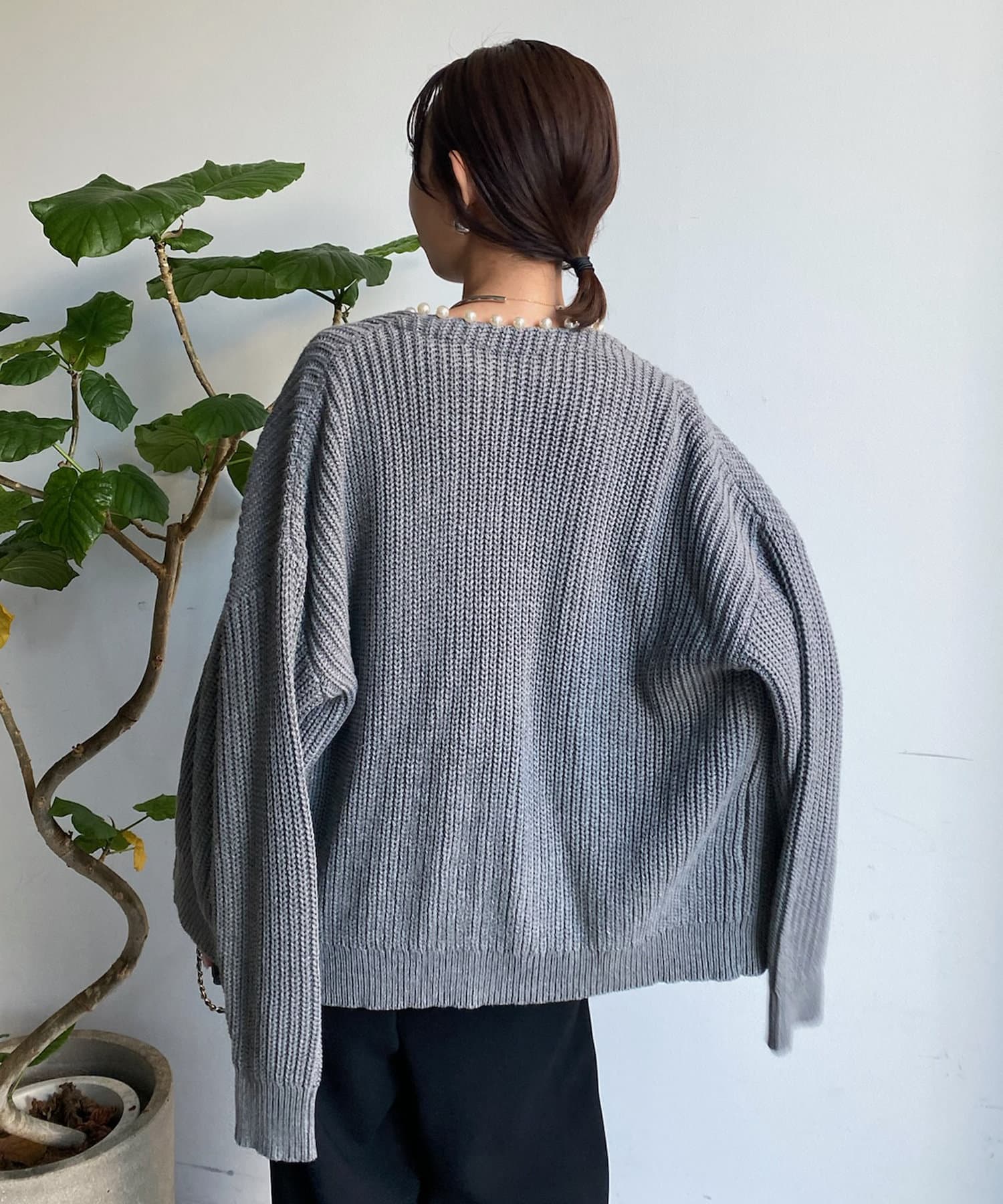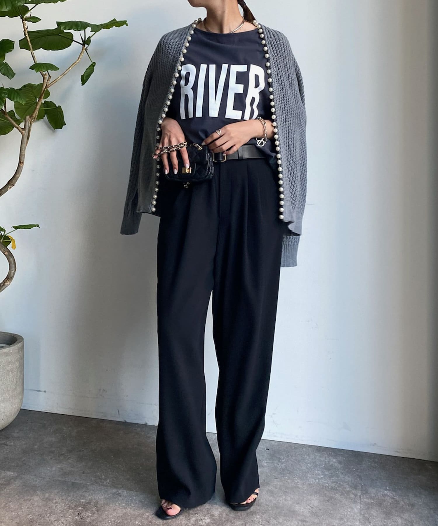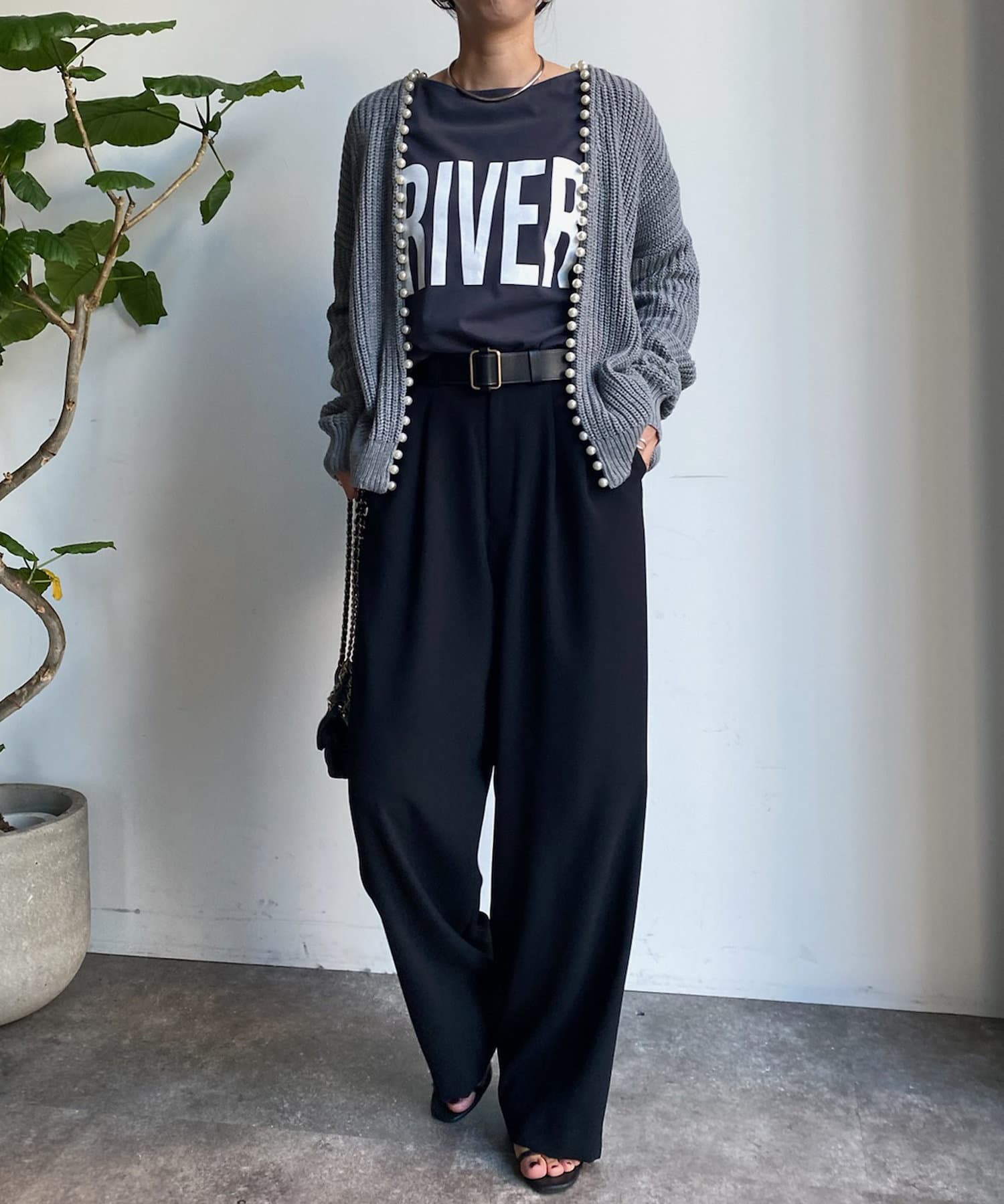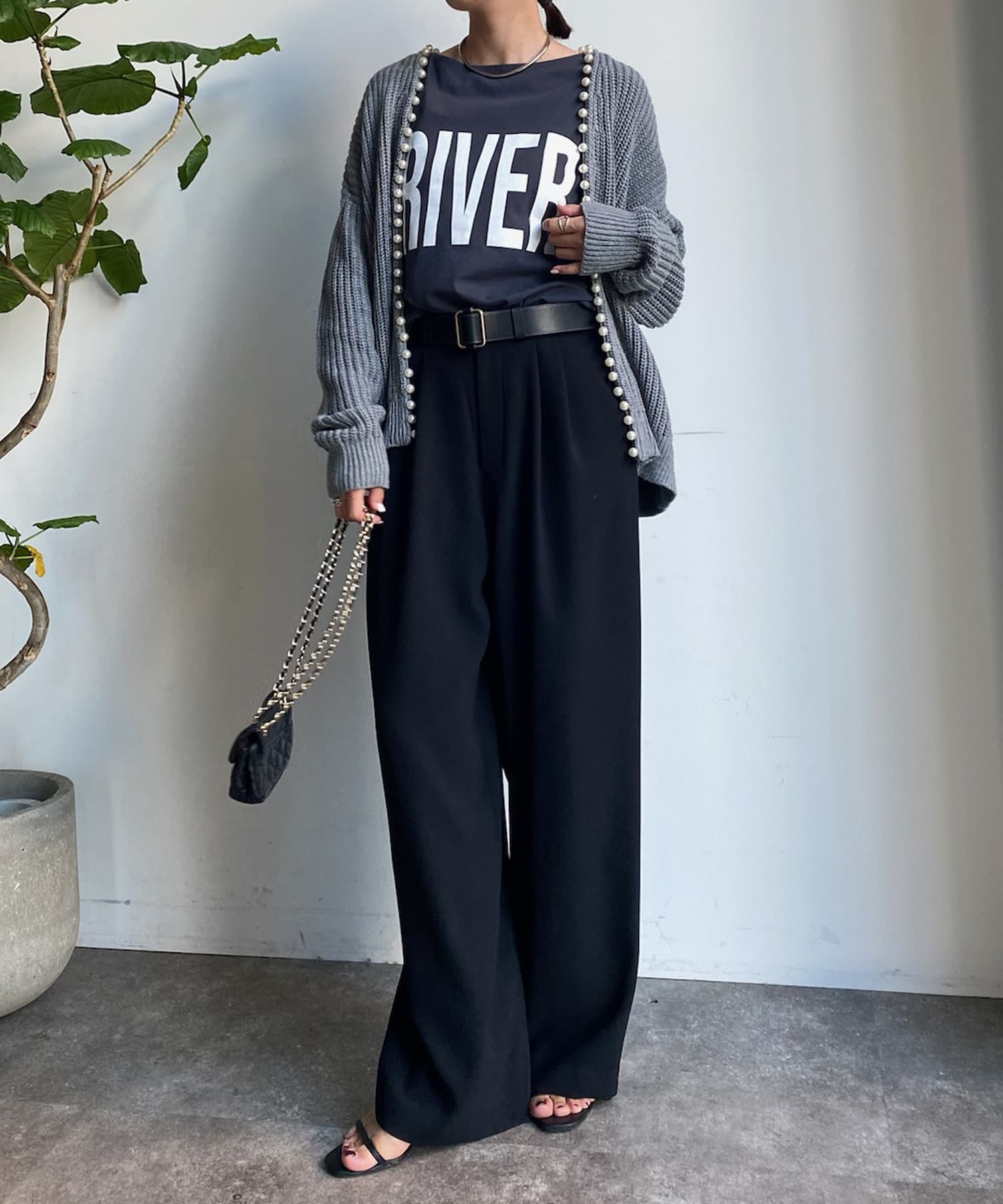 シンプルなカラーのニットに、トレンドのパールを施したデザインカーディガン。