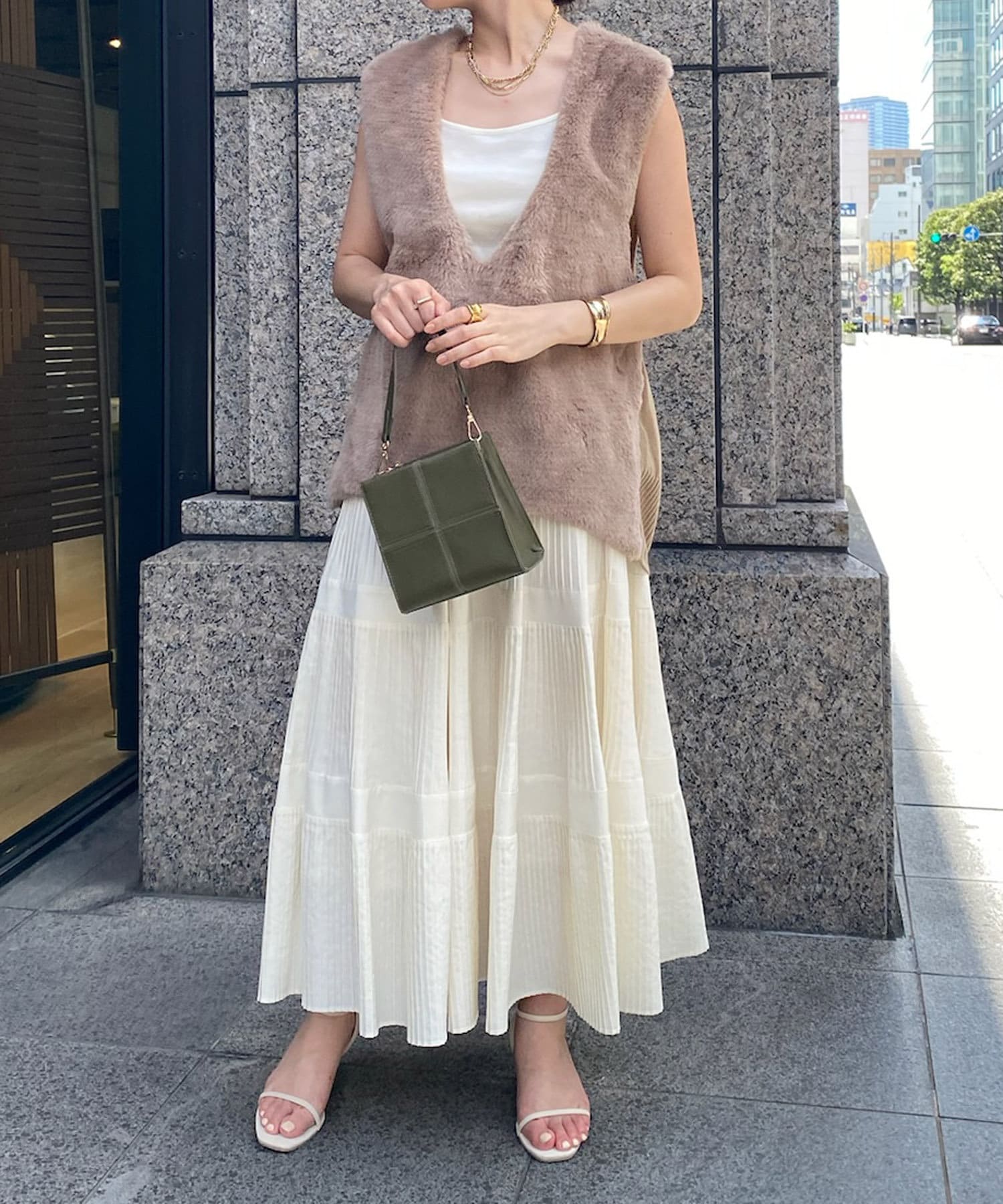 インナーにキャミソールやタンクトップを合わせて素肌見せのスタイリングがおすすめ◎