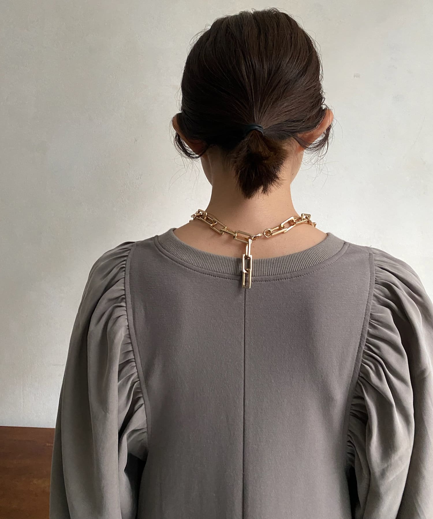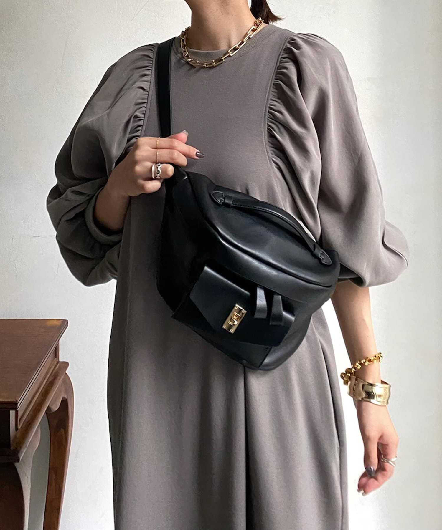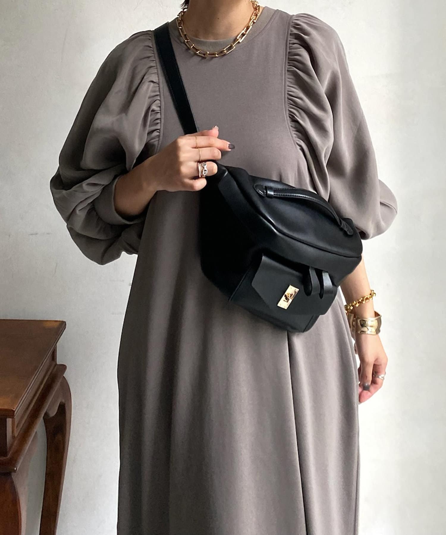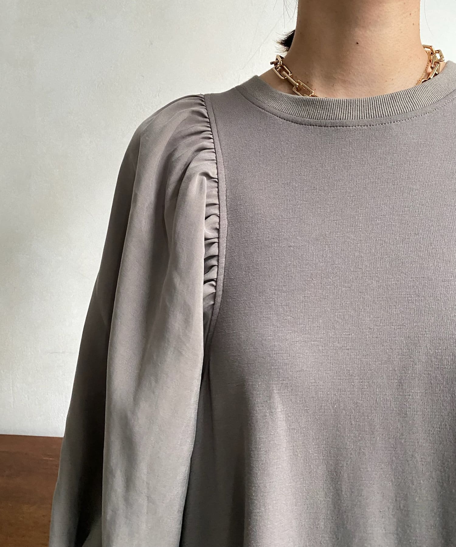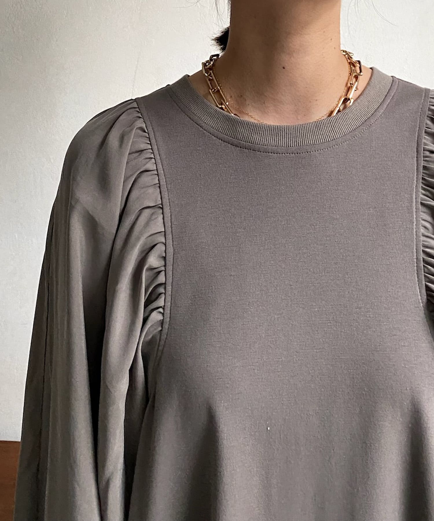 異素材切替でギャザーがたくさん施されているため細見え効果も!