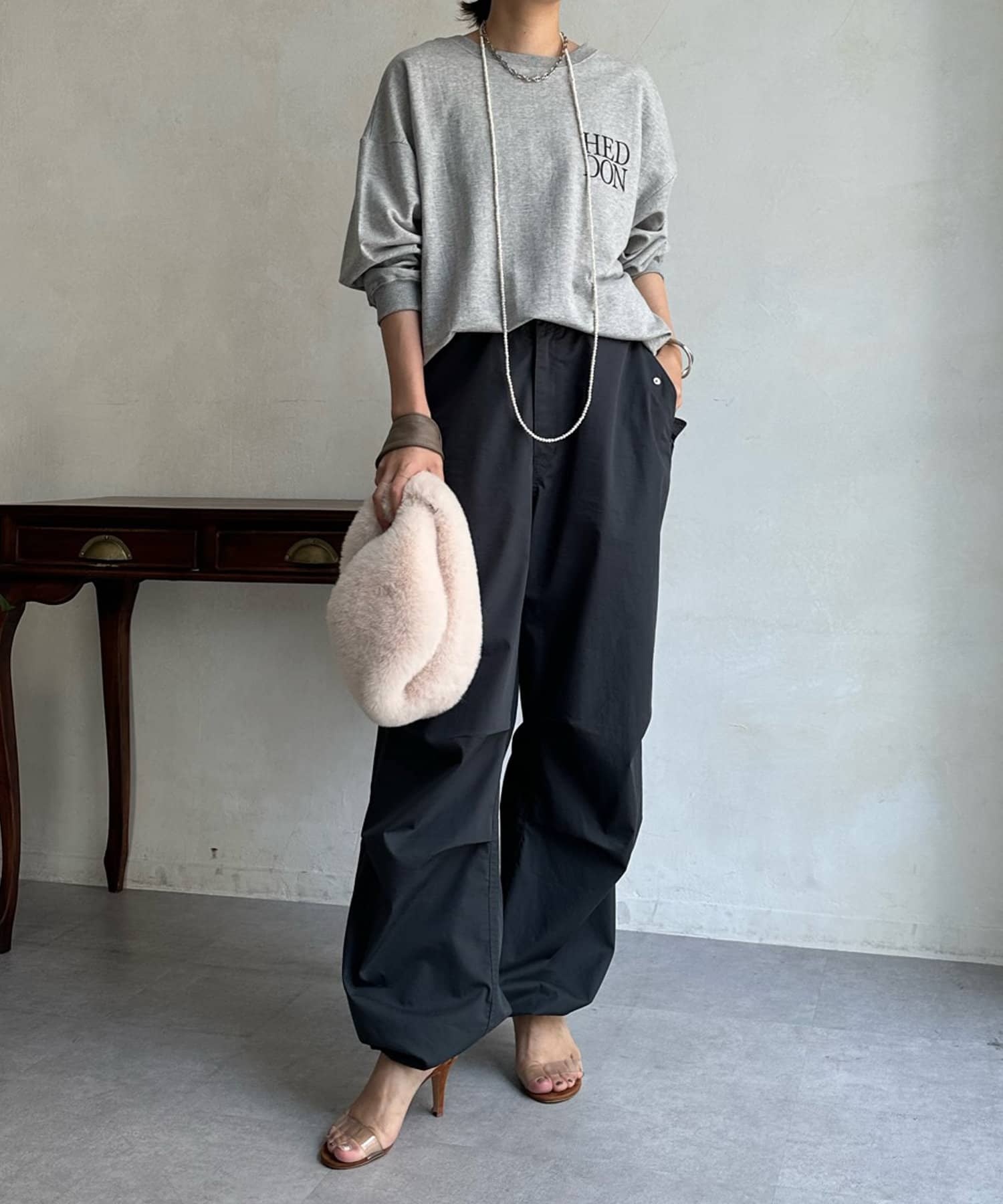ワイドなシルエットでスポーティーなムードながらも、少しマットな素材感やでおしゃれさを演出する1着です。