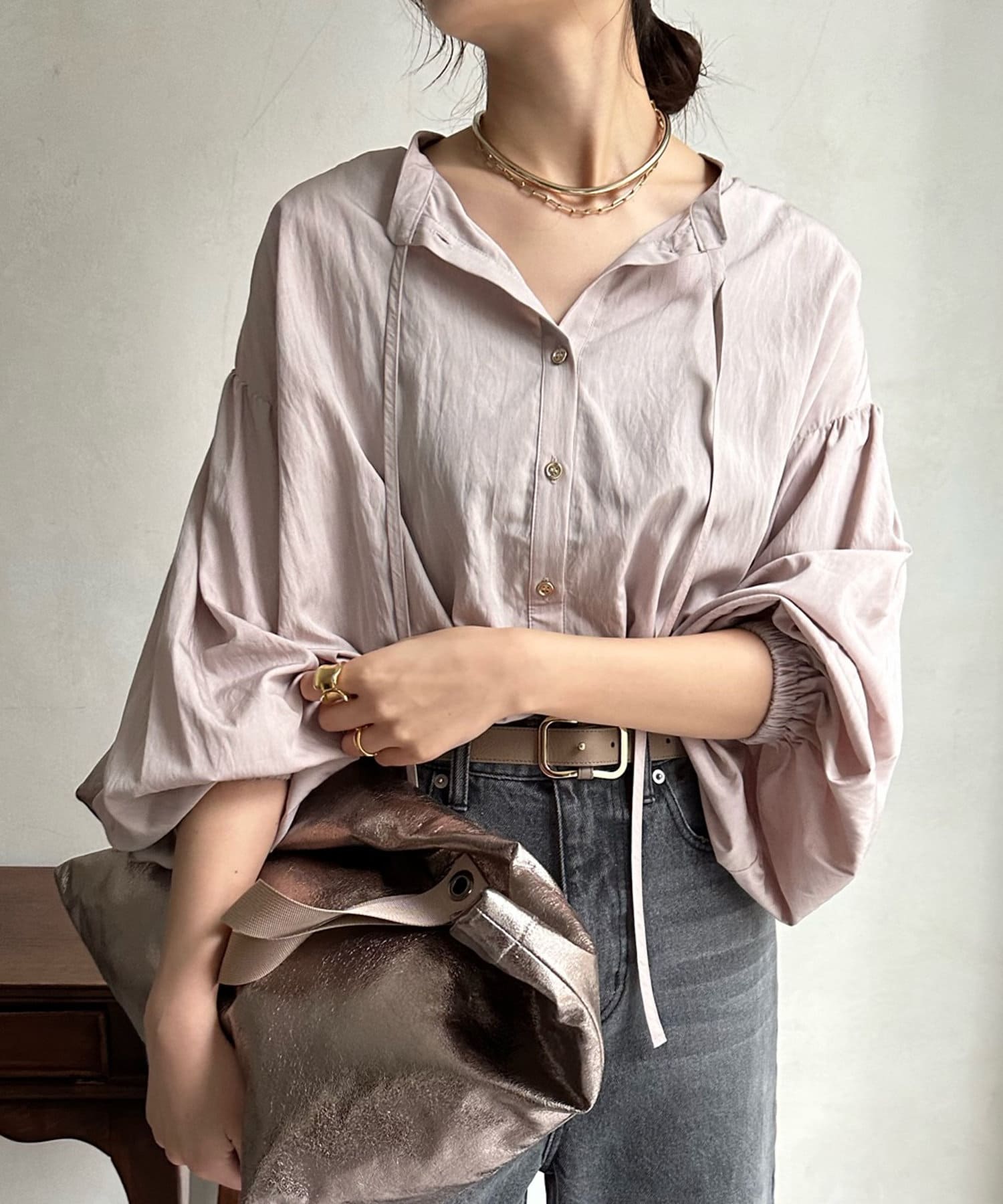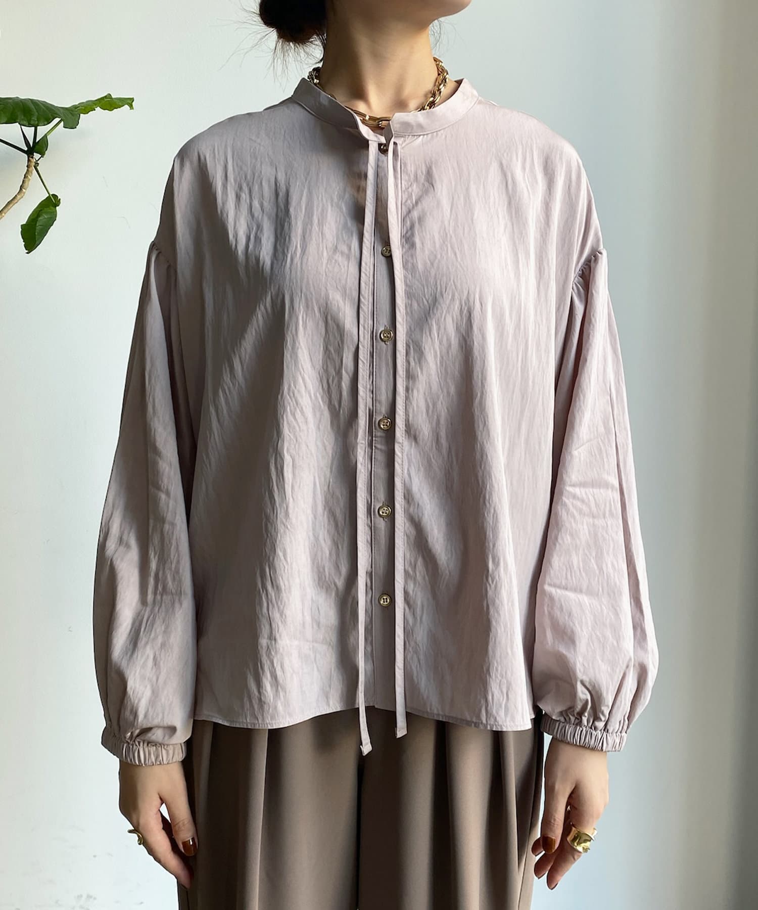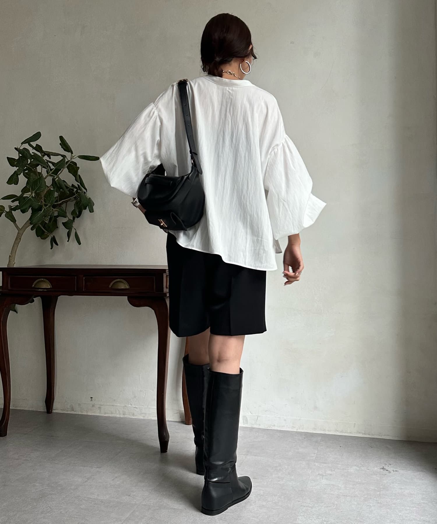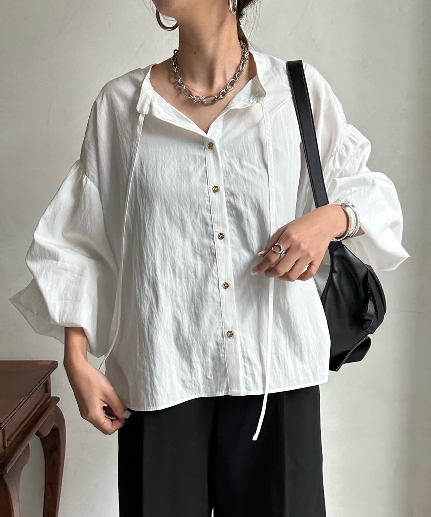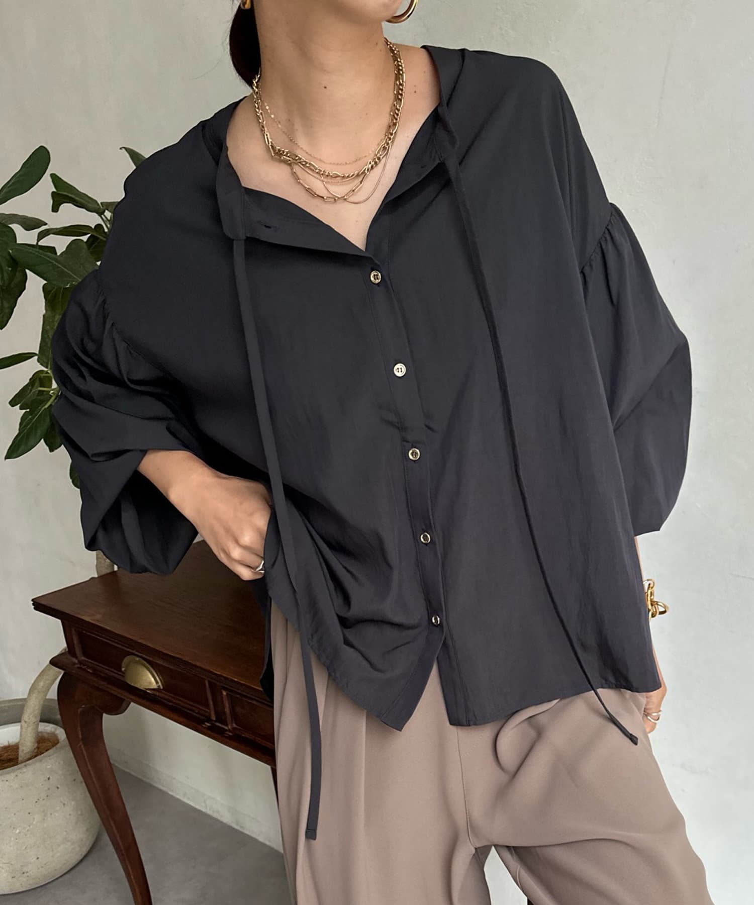 ショルダーラインと袖口にギャザーを寄せ、ボリューム感を作った袖シルエットがポイント。
