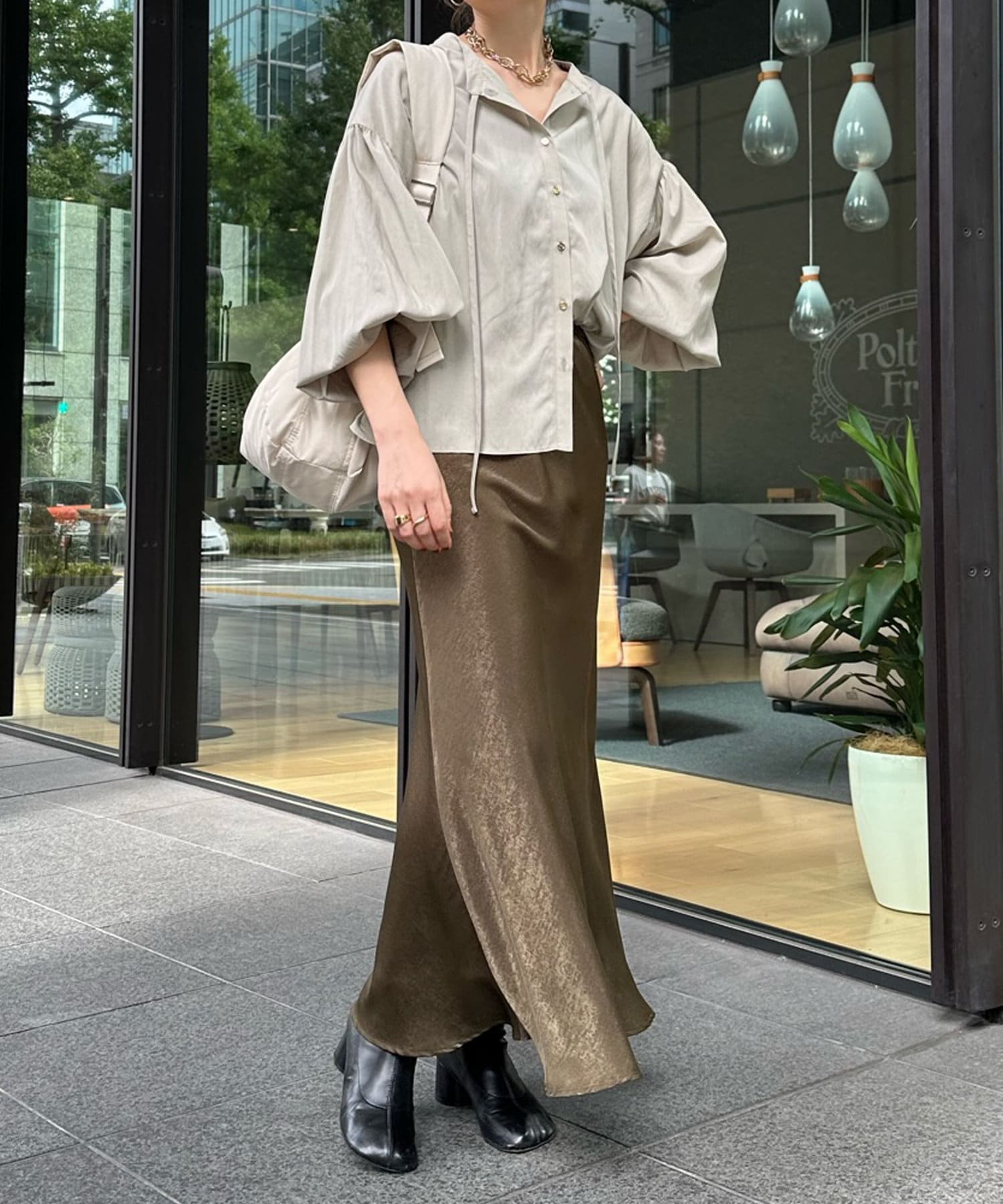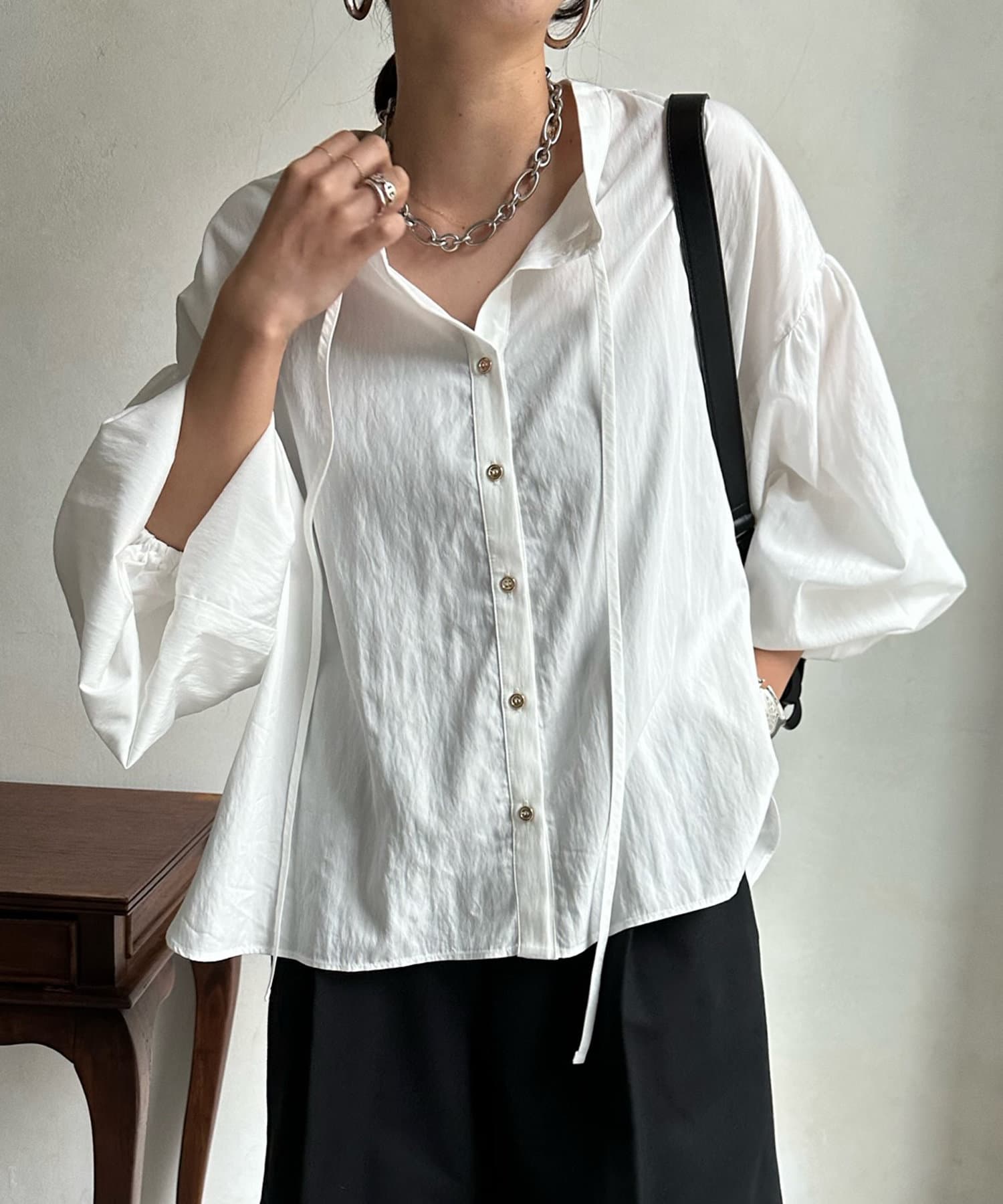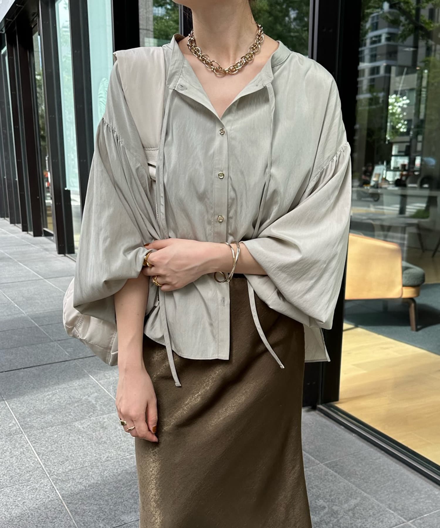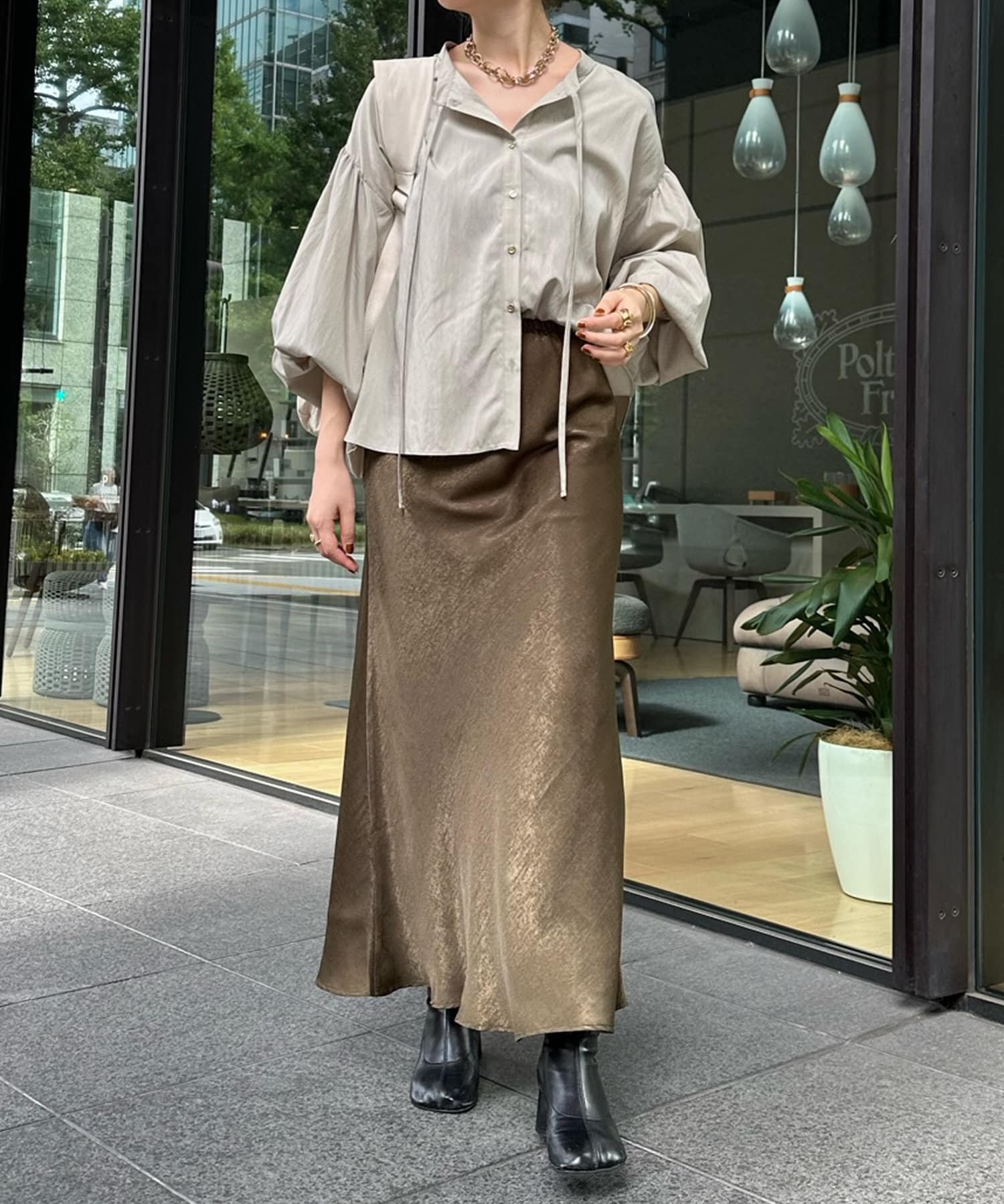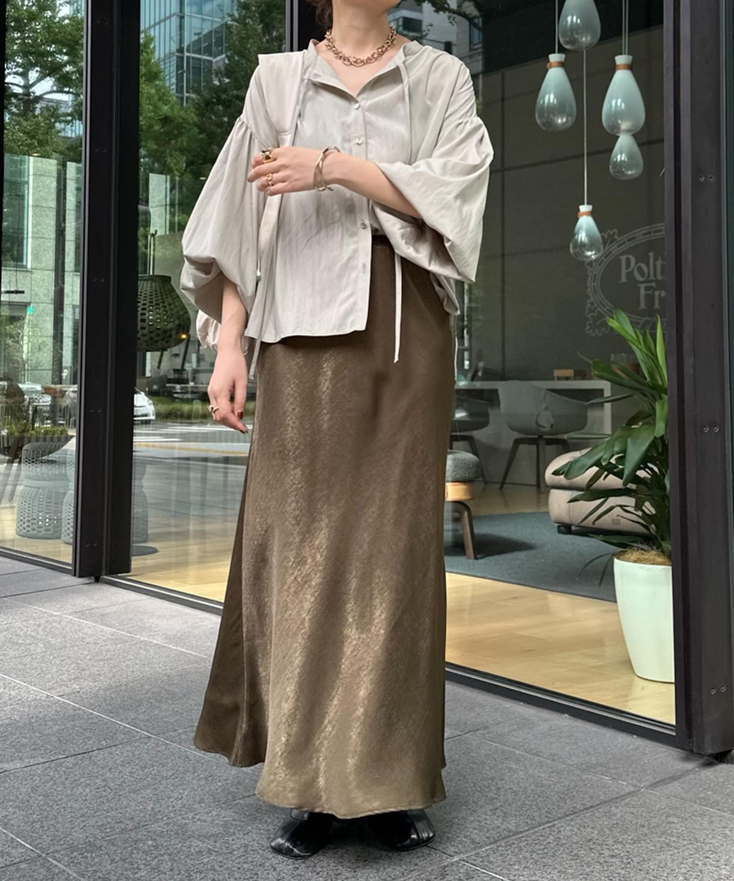 シンプルながらデザイン性があって、絶妙なツヤを感じるブラウス