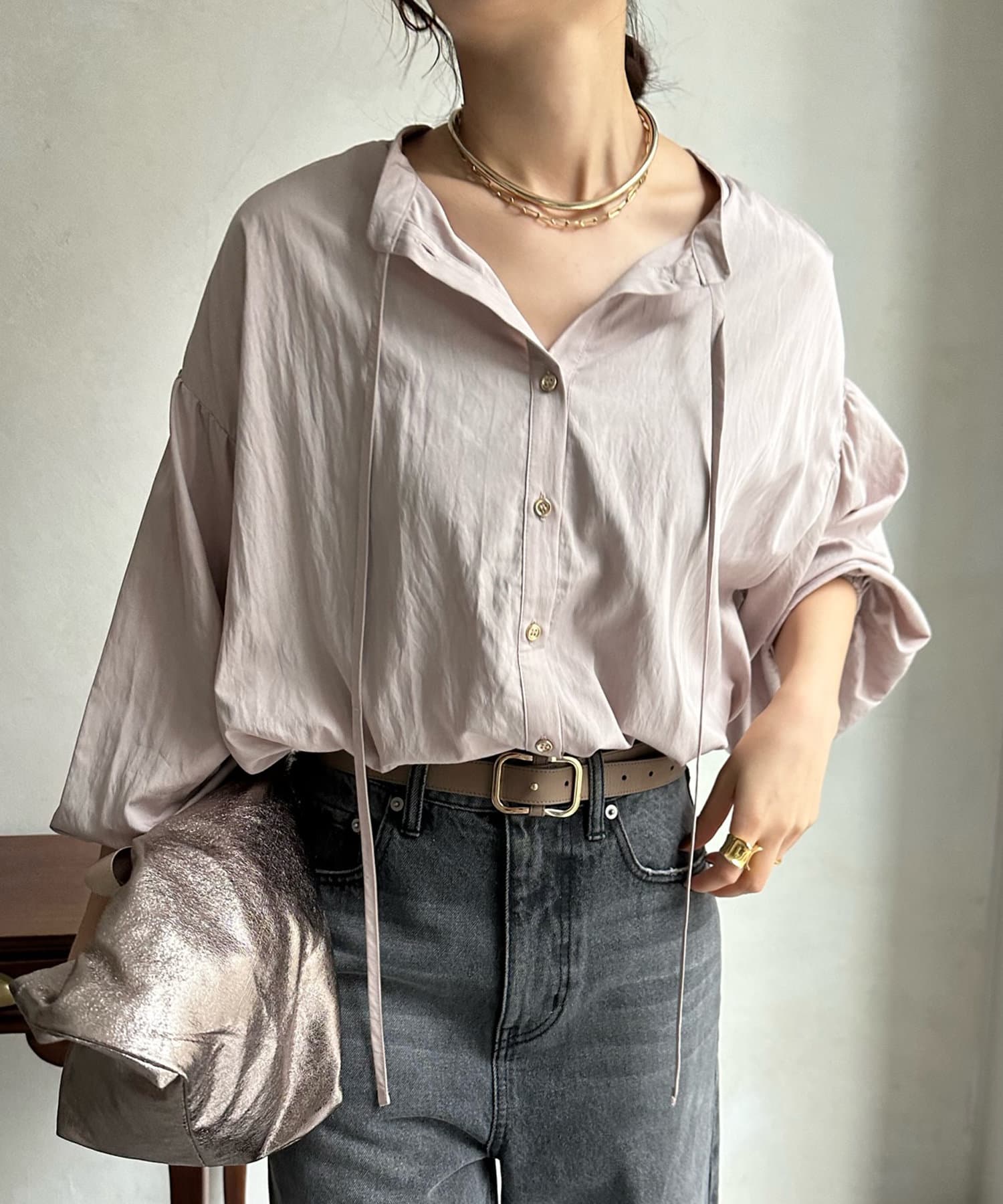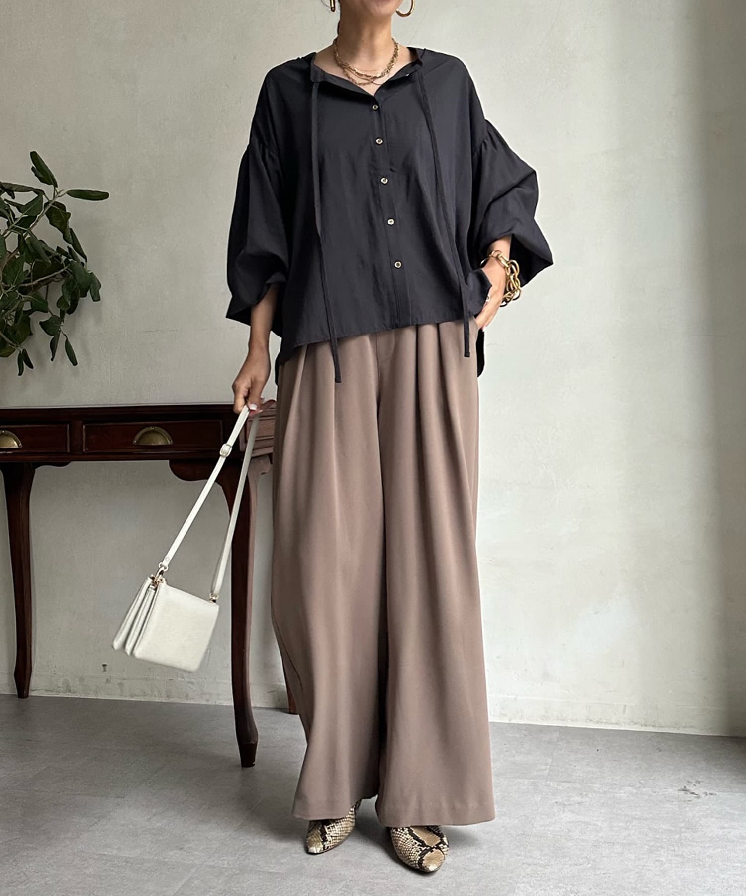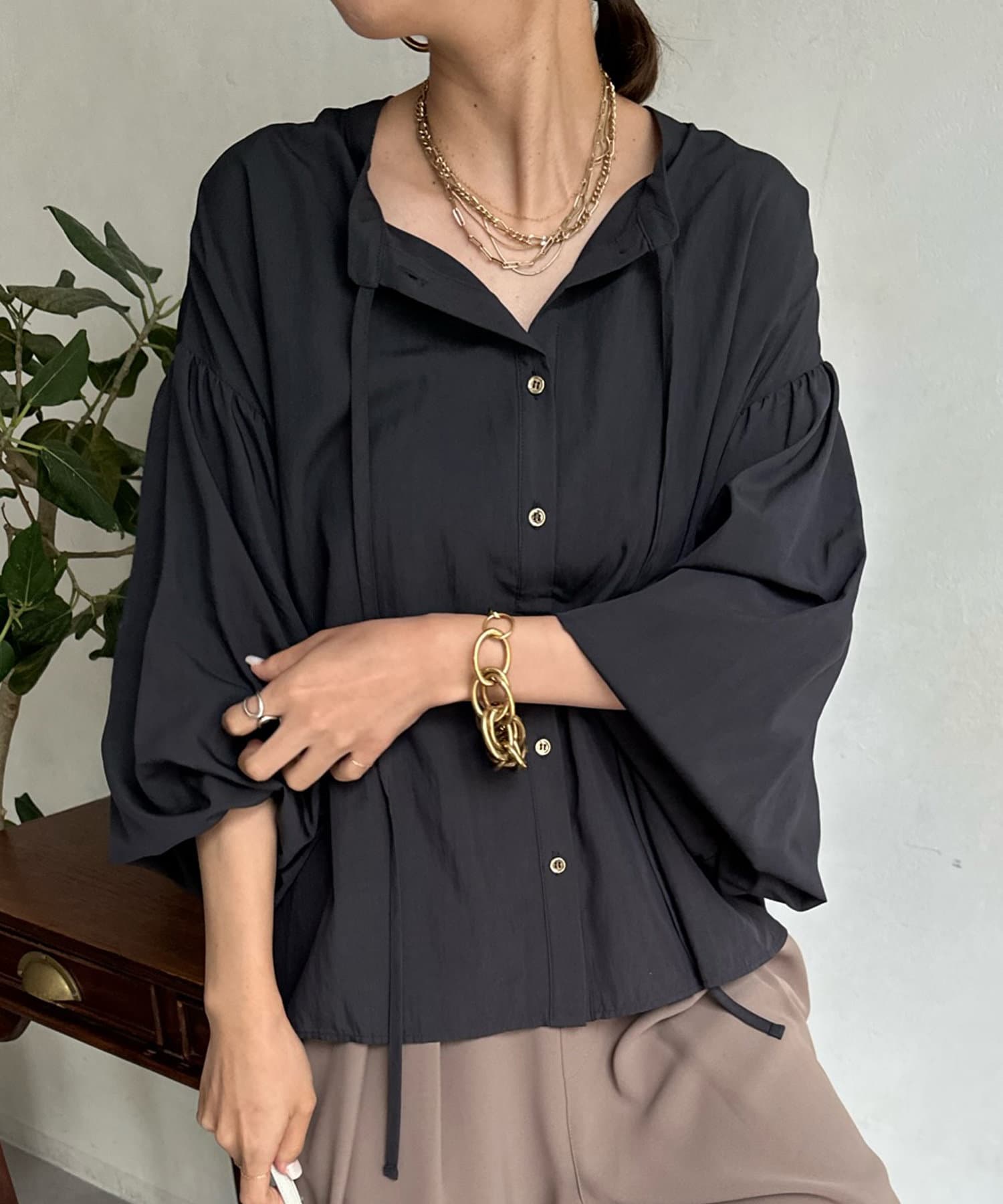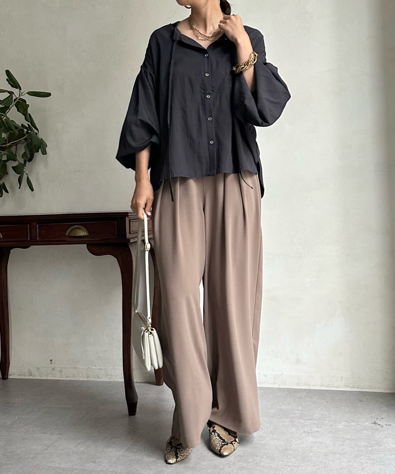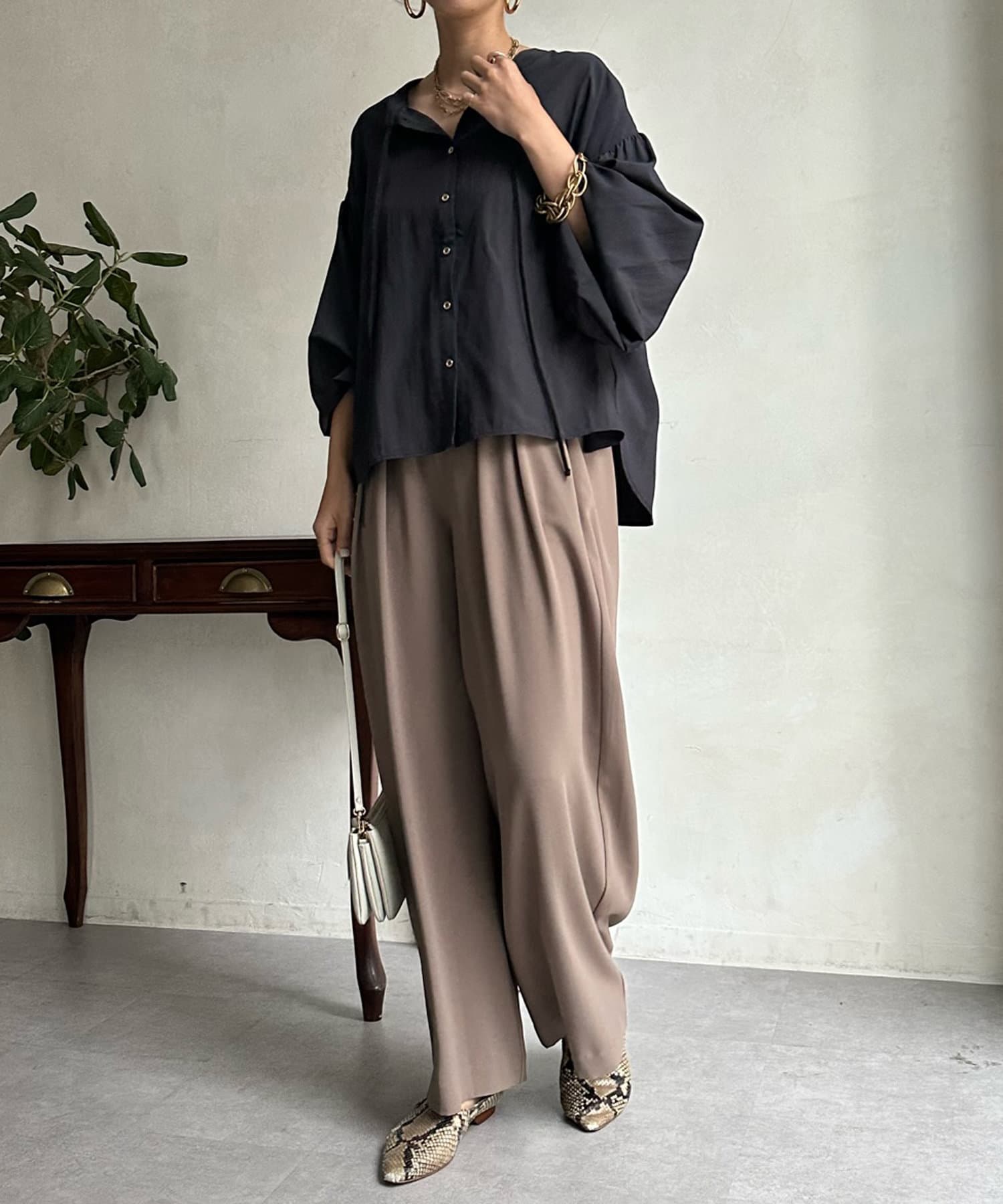 シンプルながらデザイン性があって、絶妙なツヤを感じるブラウス