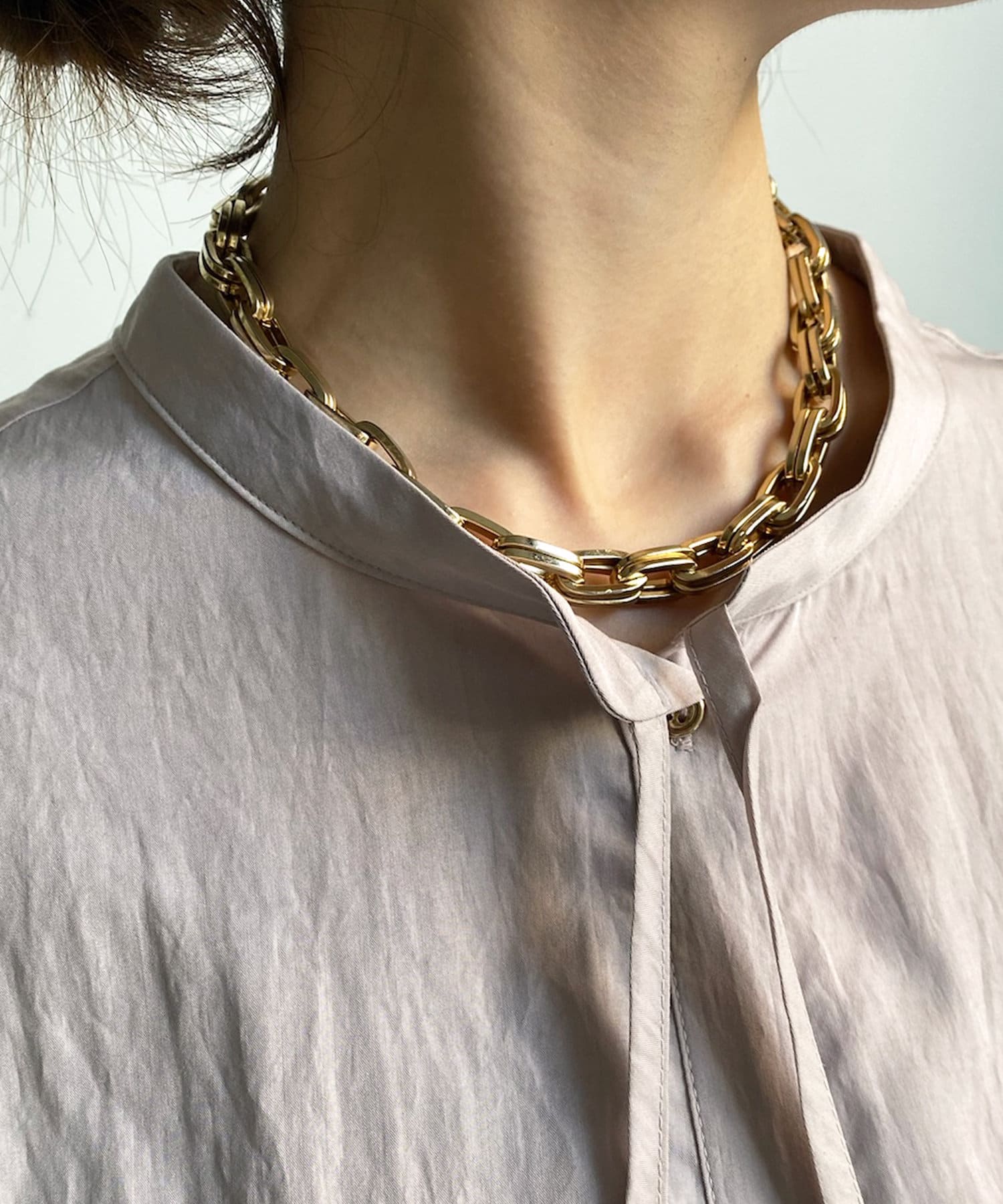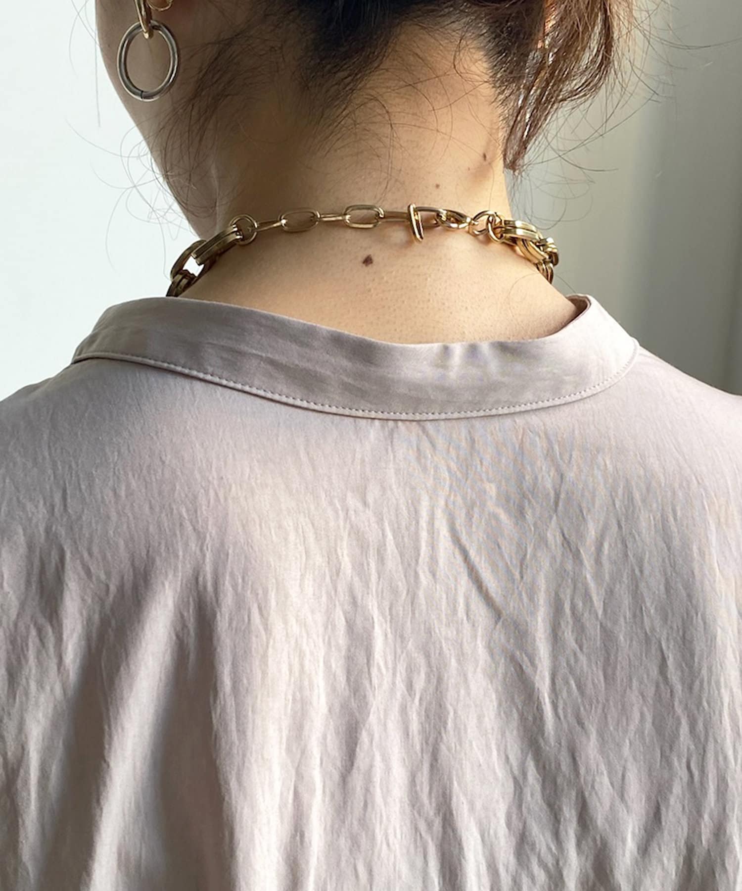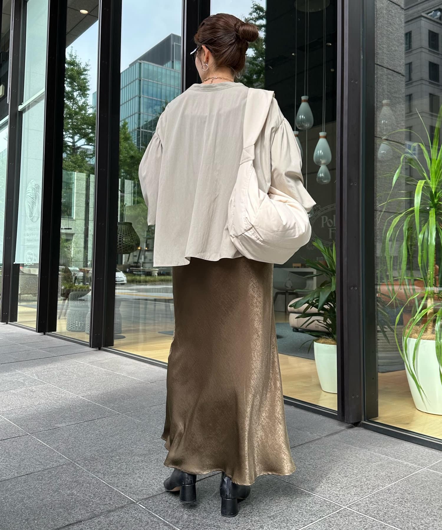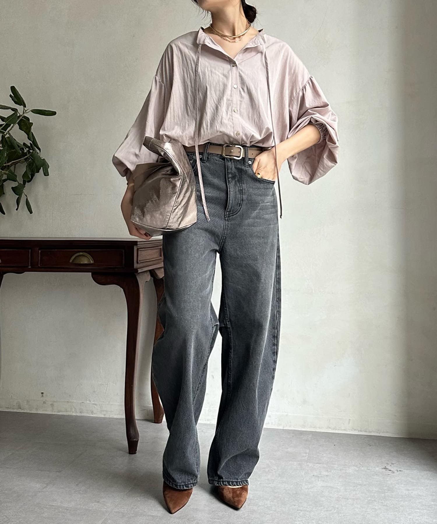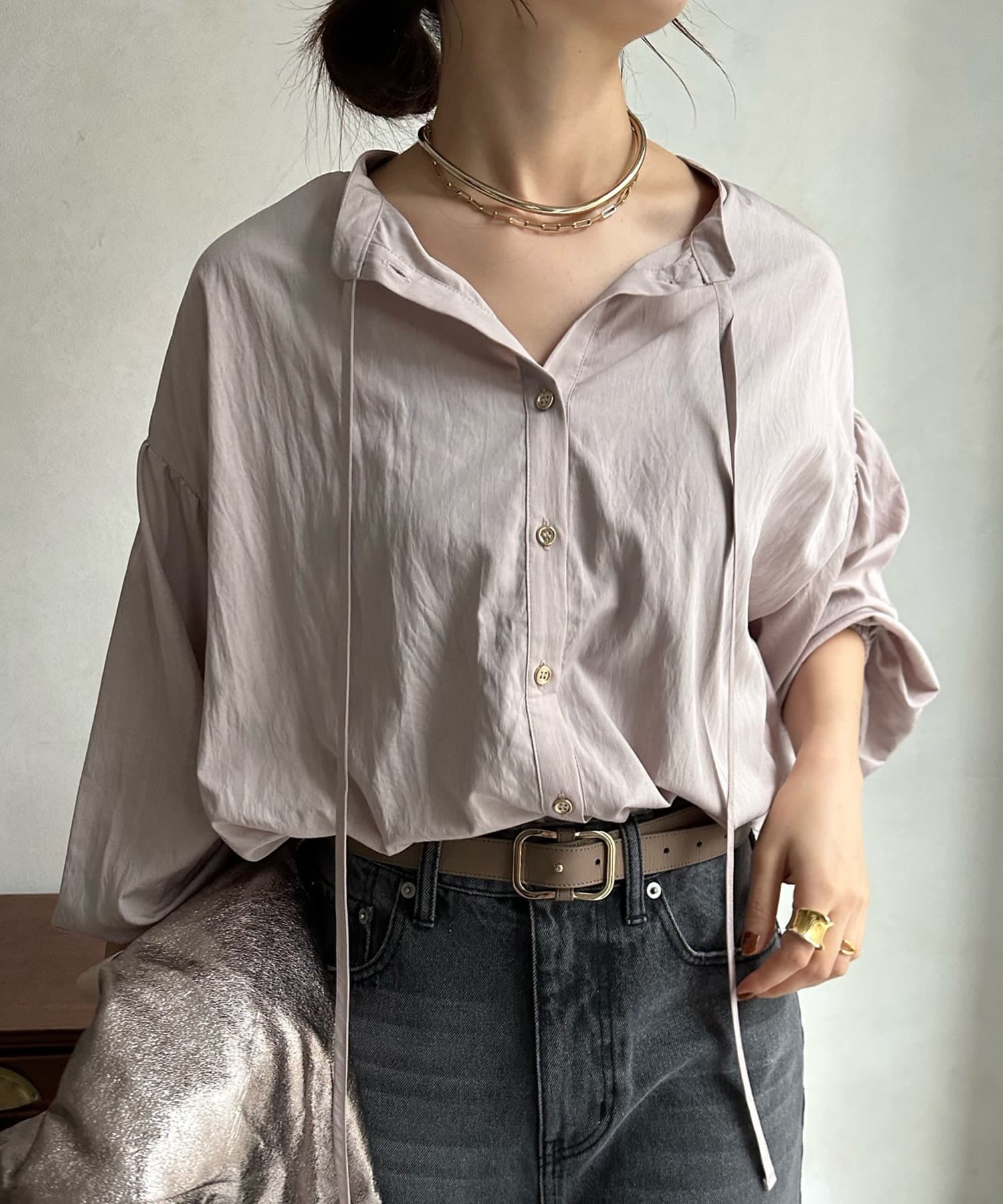 シンプルながらデザイン性があって、絶妙なツヤを感じるブラウス