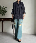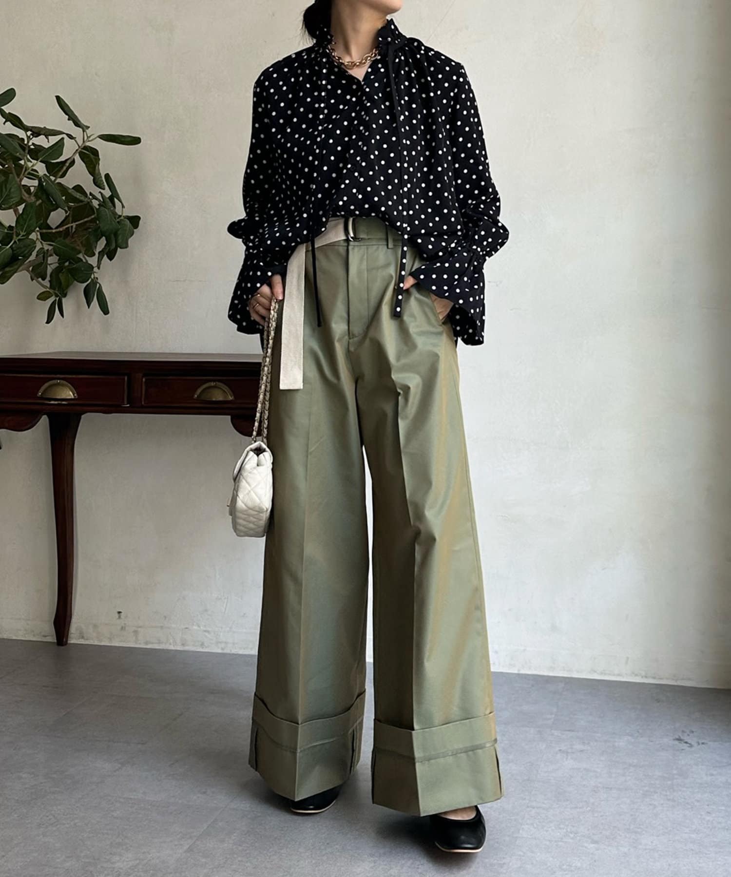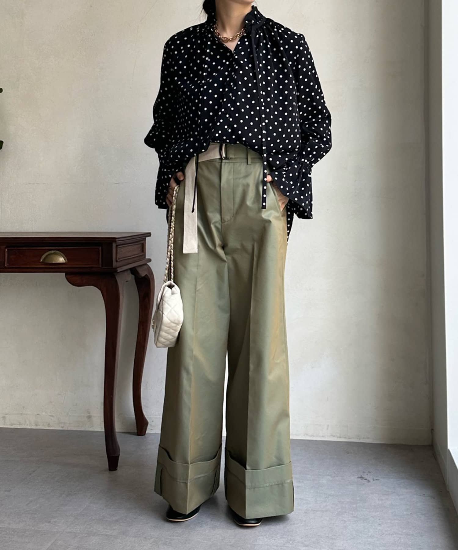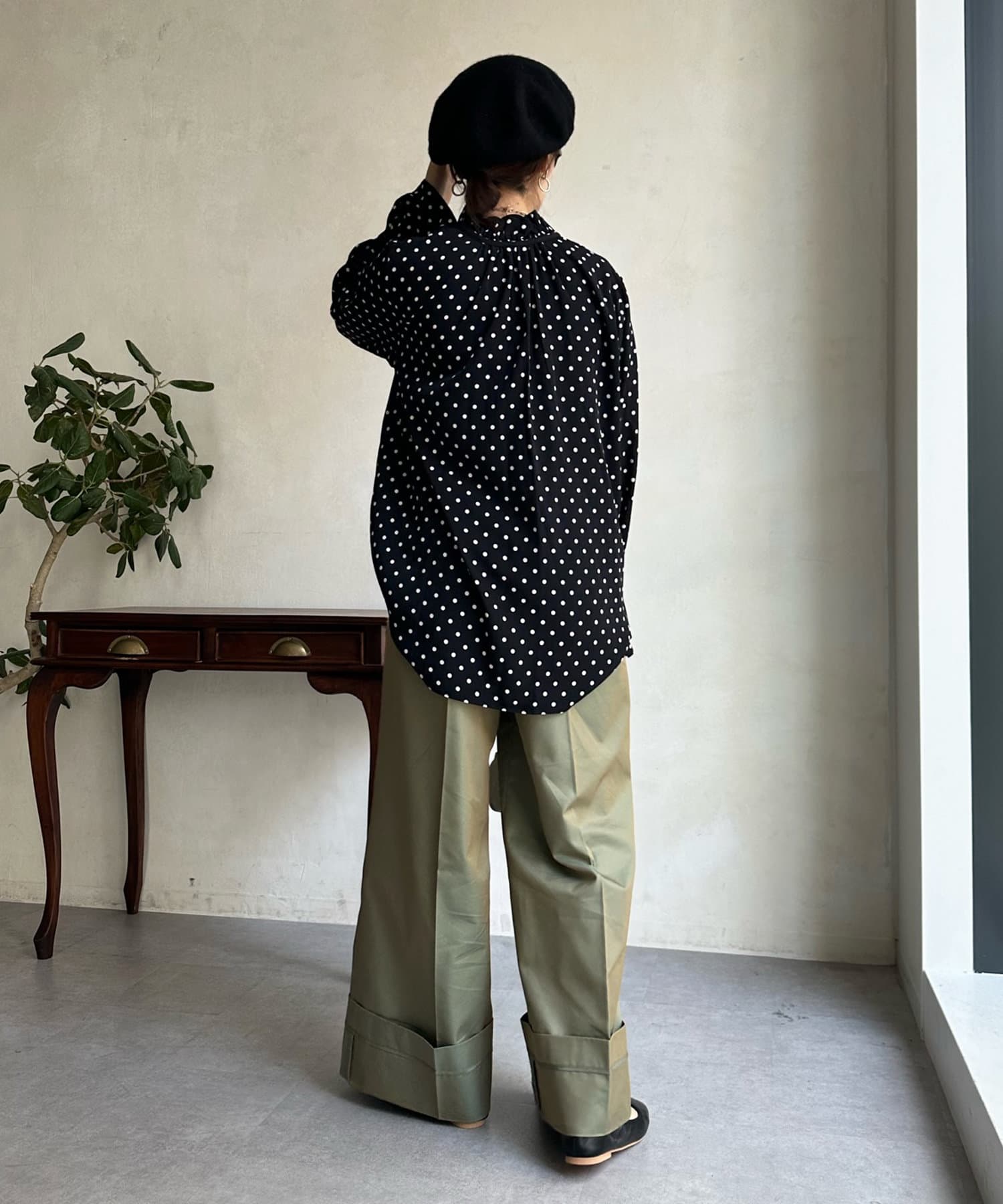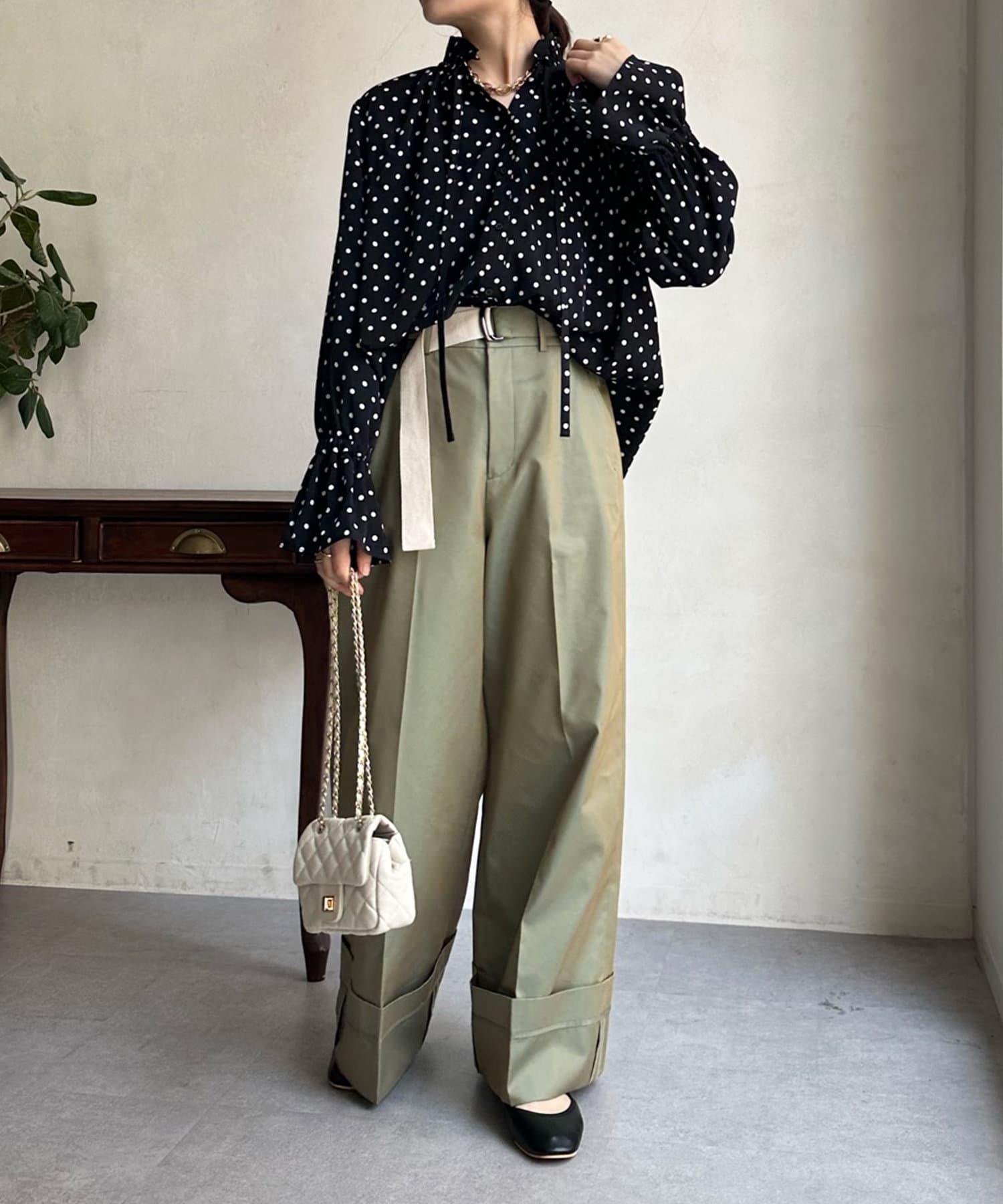 ドットの素材が今季トレンドライクなブラウス。
