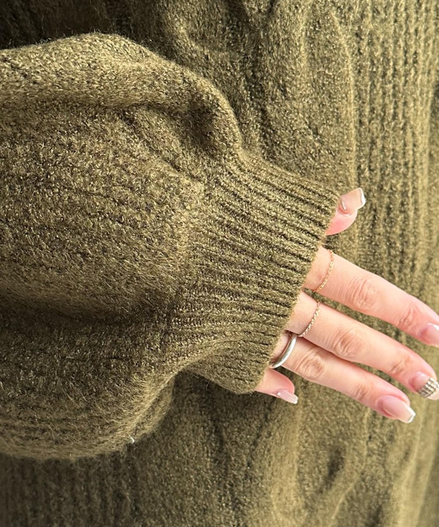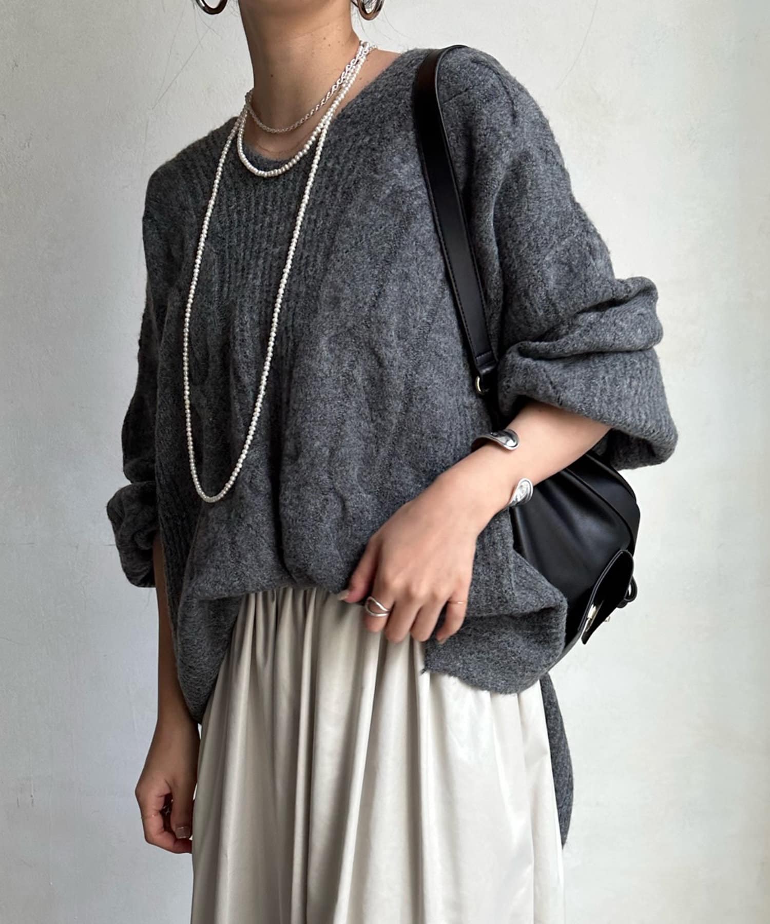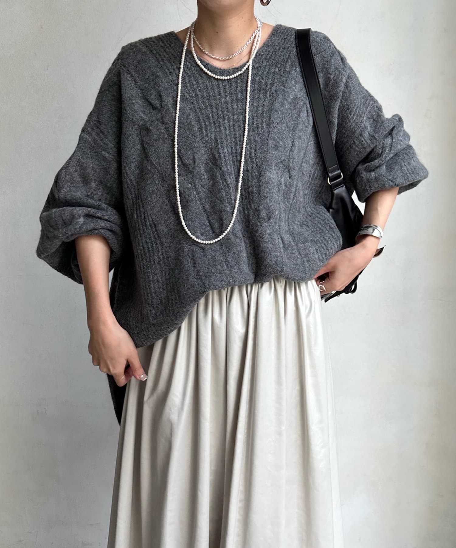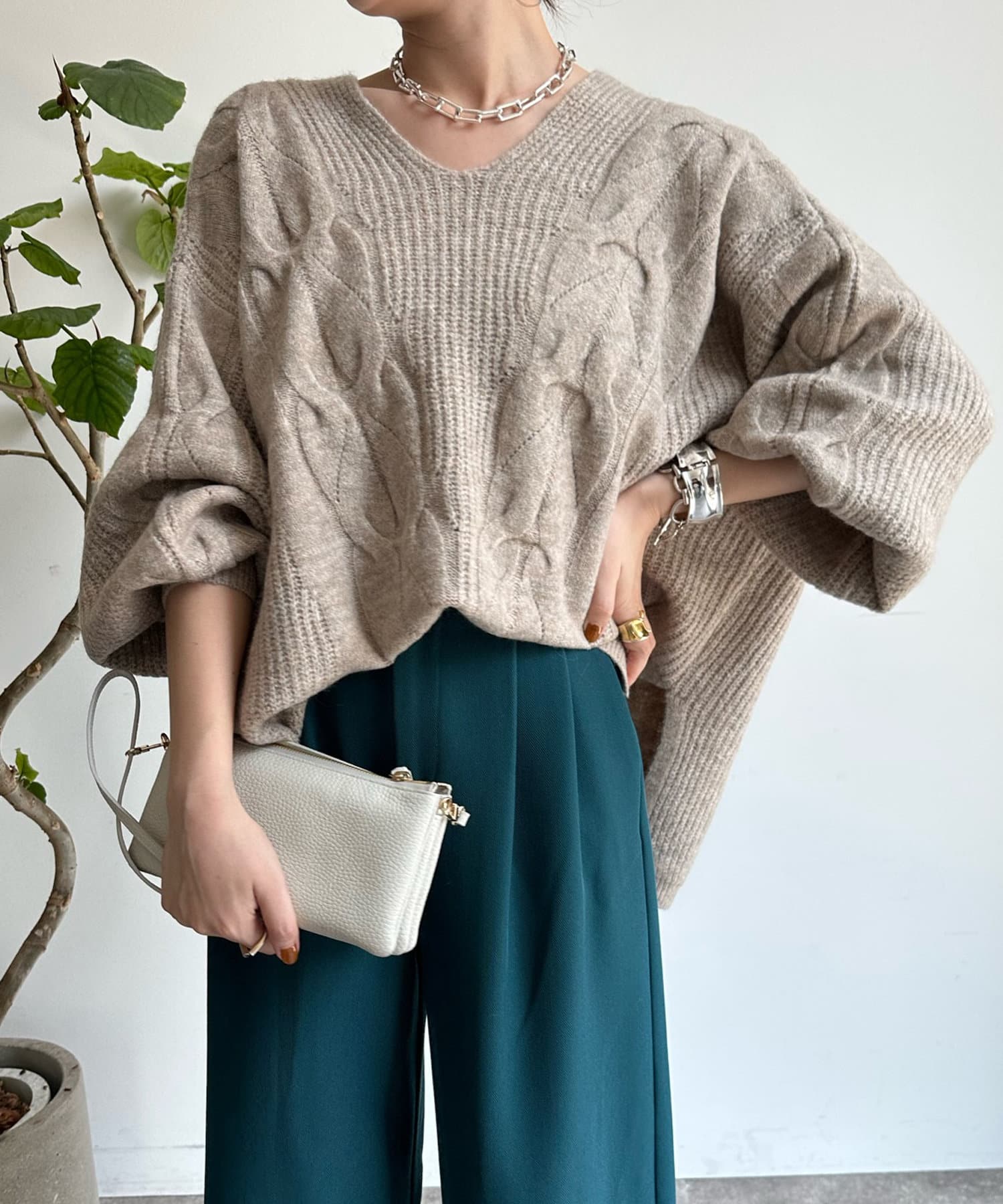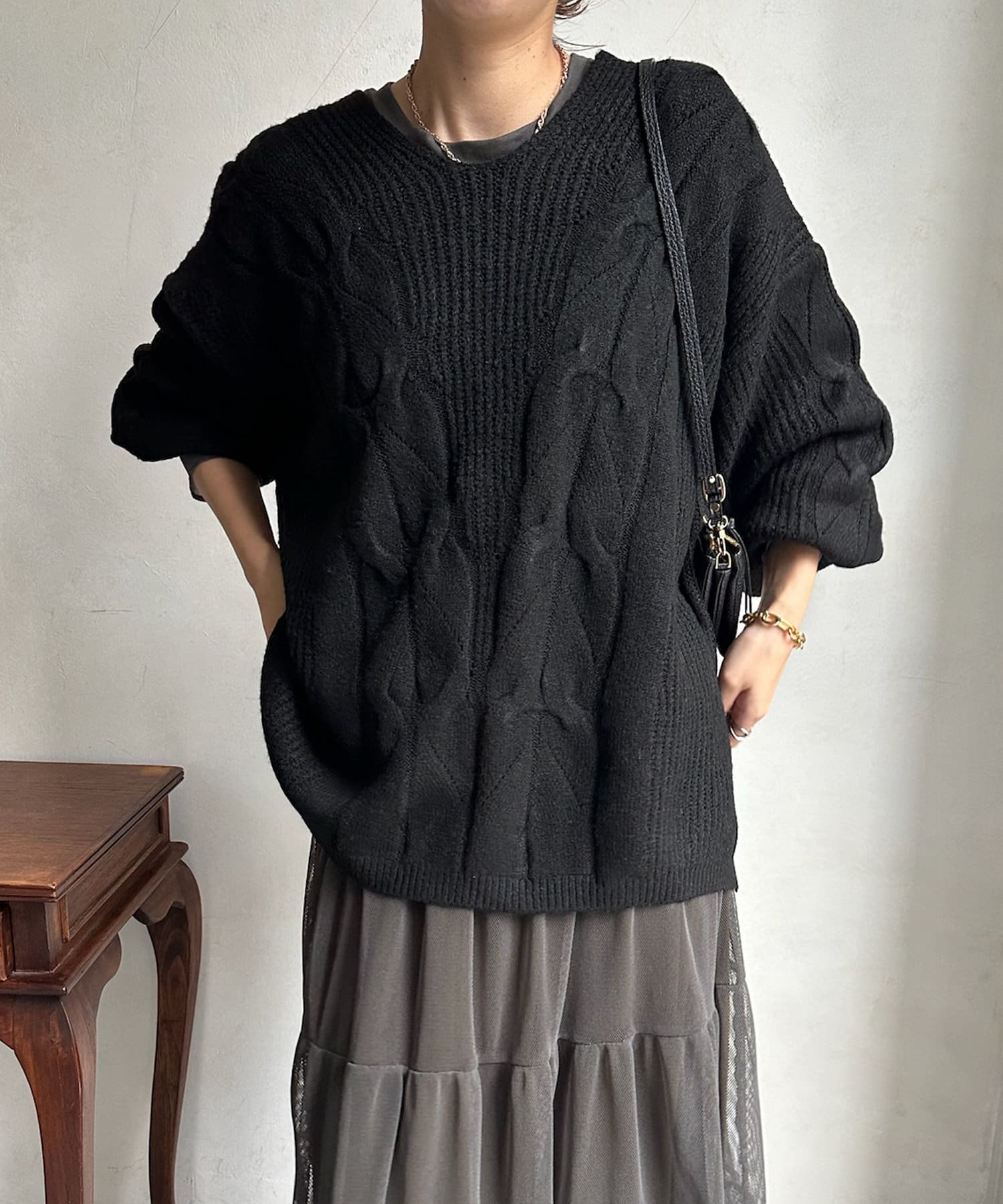 温かみのある大きめのケーブル編みと、抜け感のあるシルエットがかわいいニット。