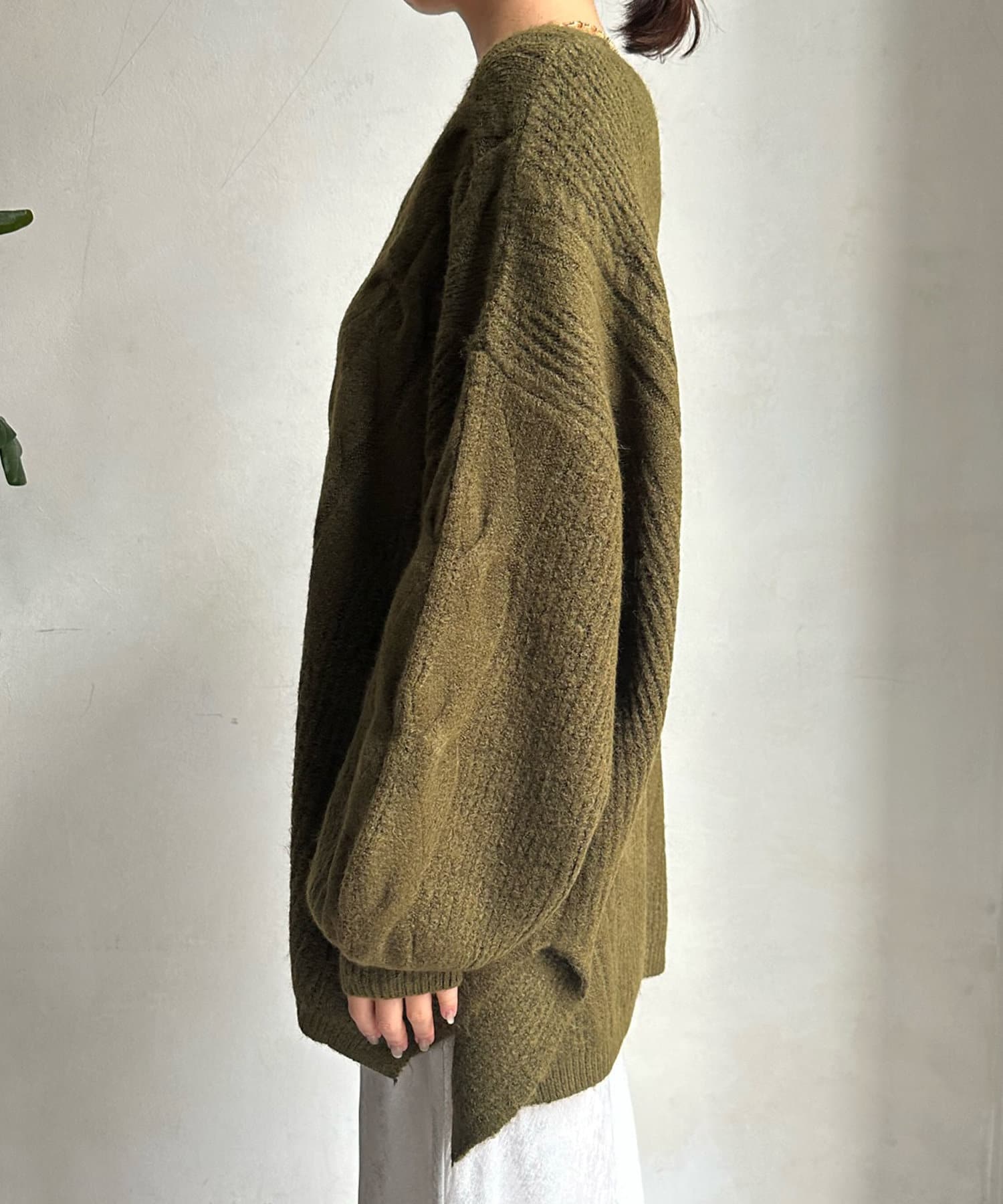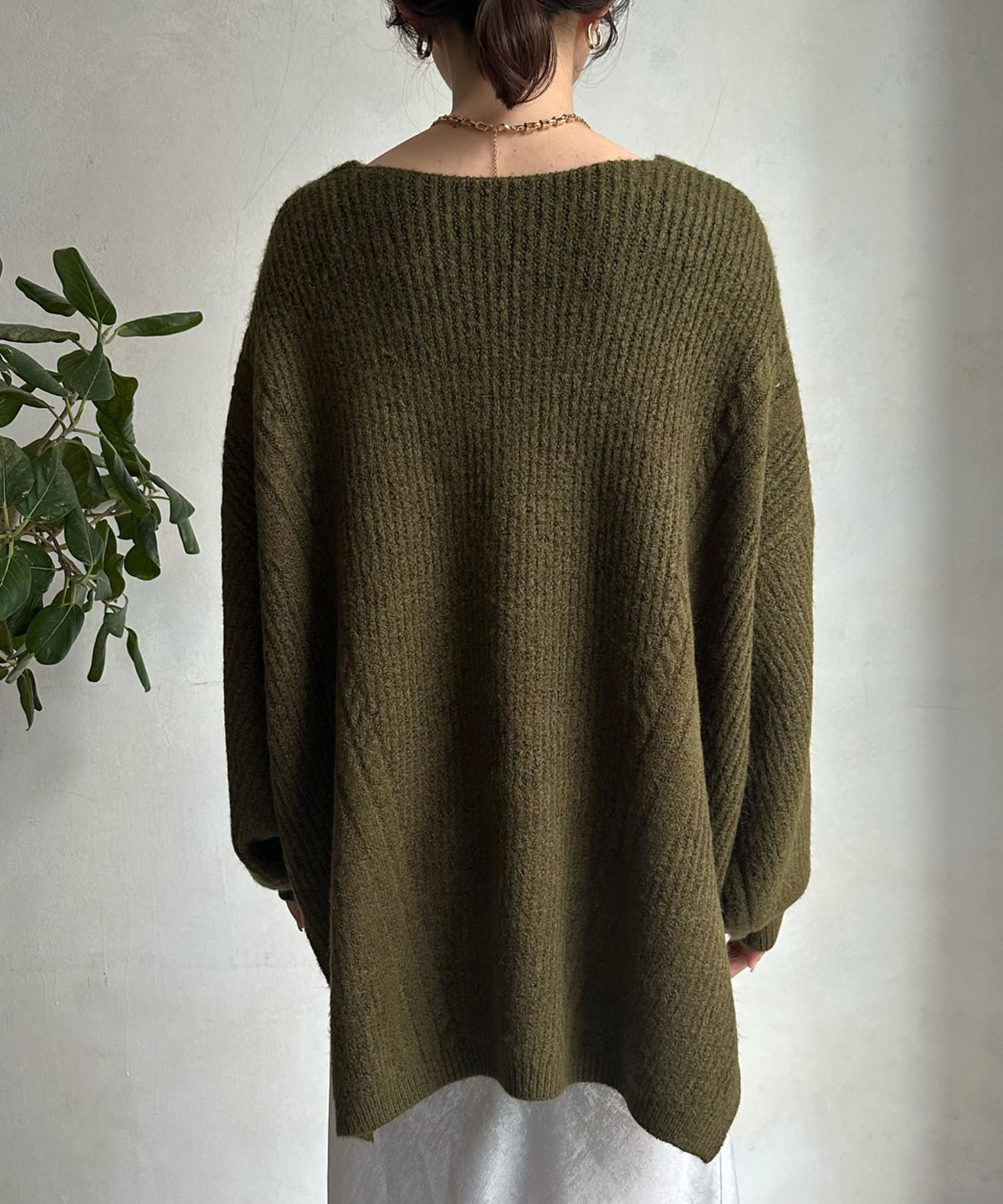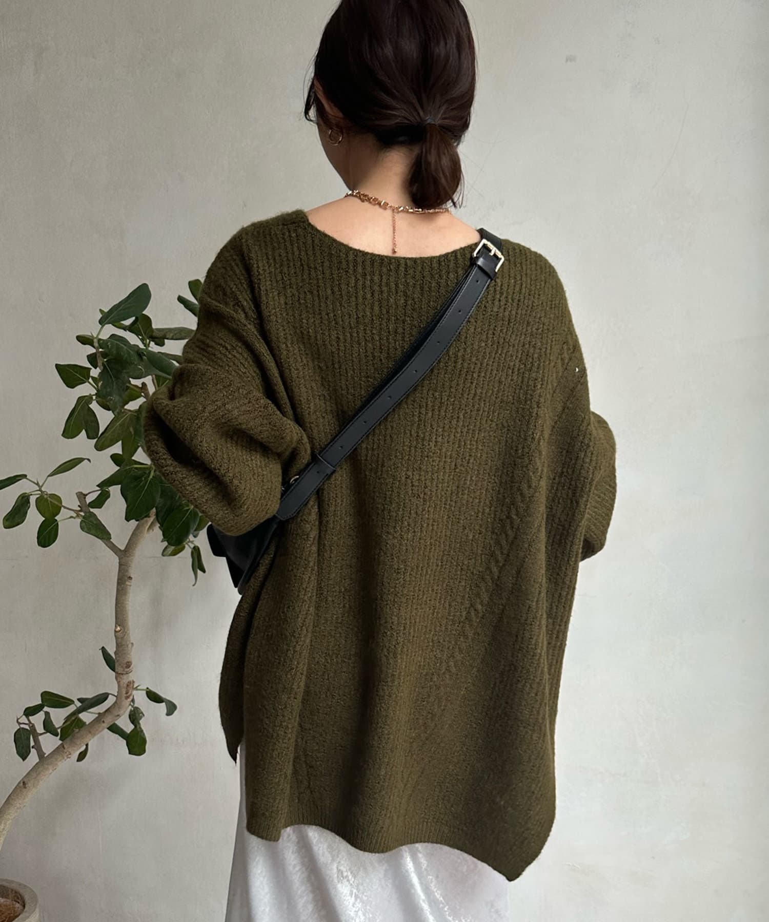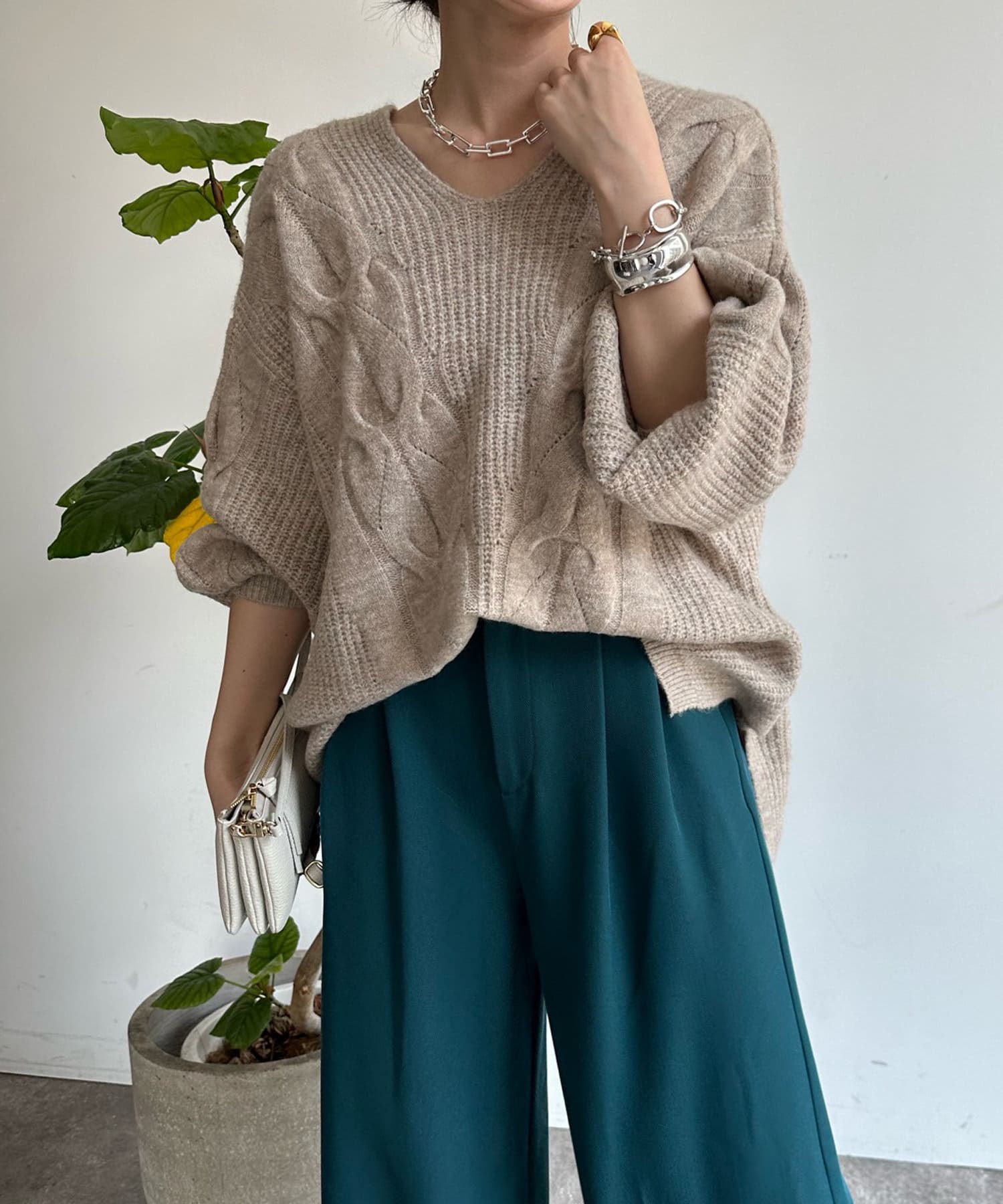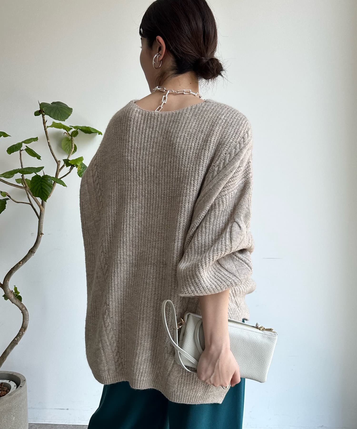 温かみのある大きめのケーブル編みと、抜け感のあるシルエットがかわいいニット。