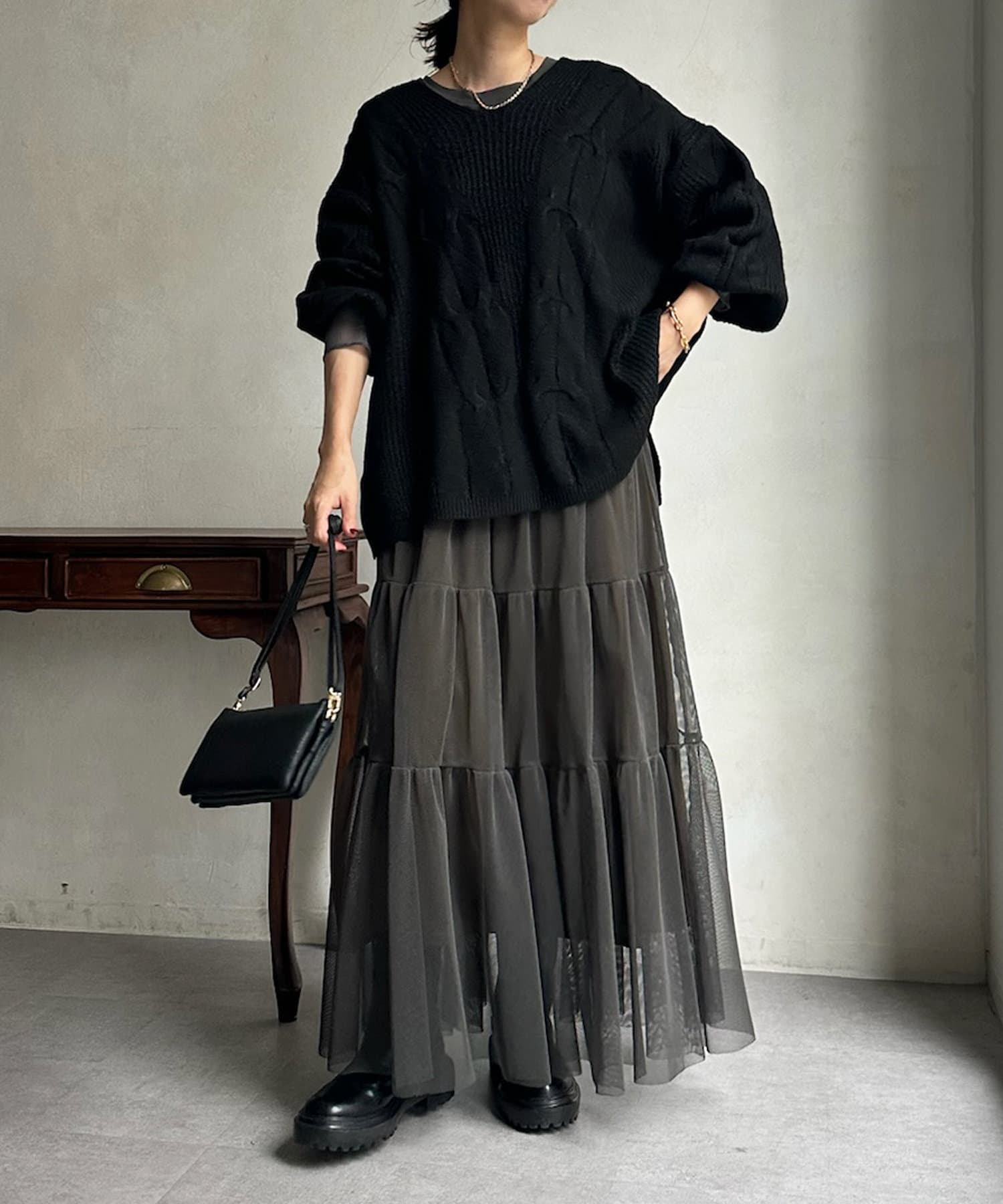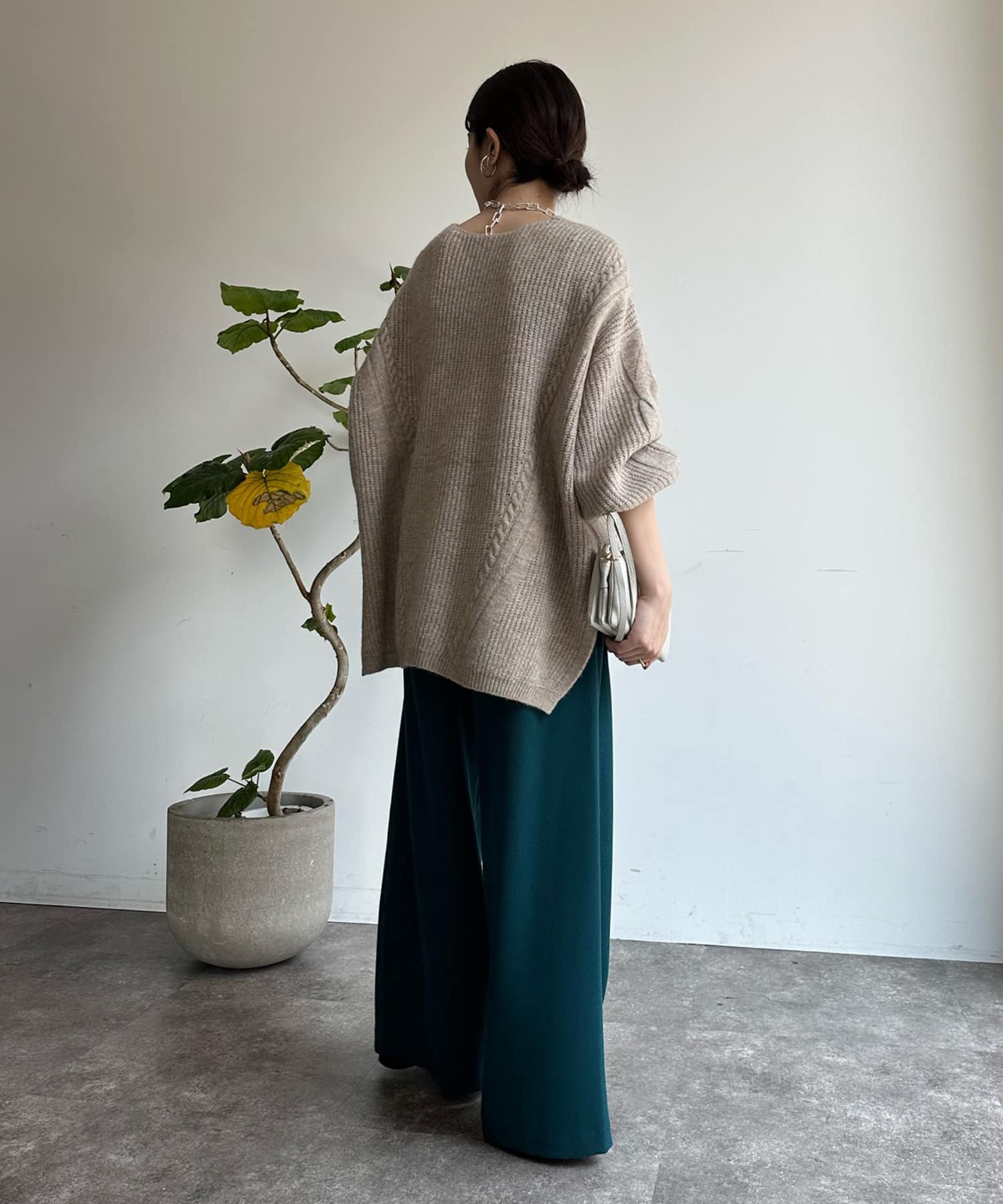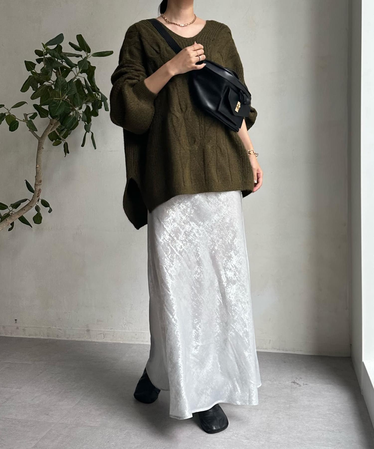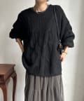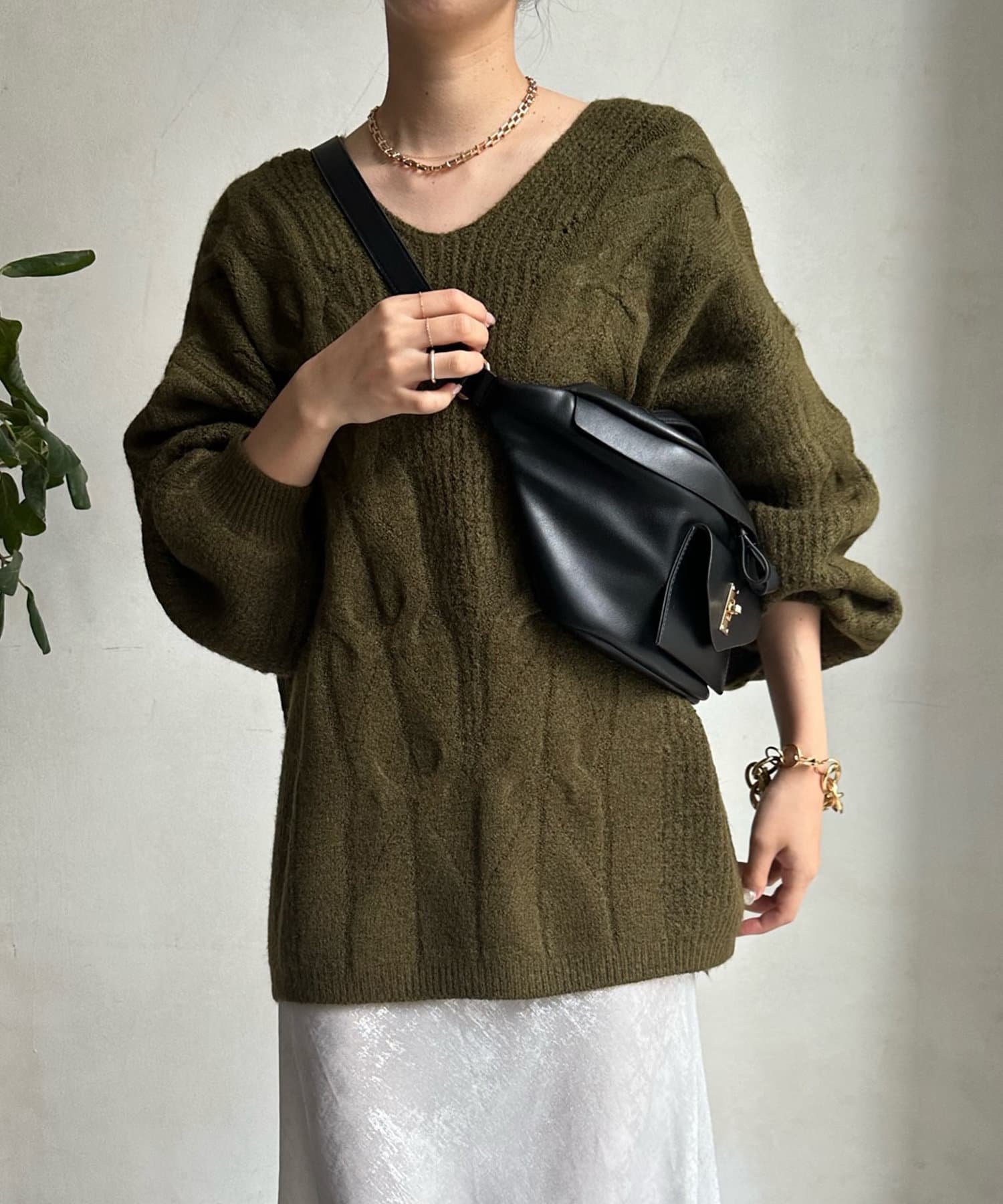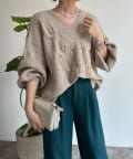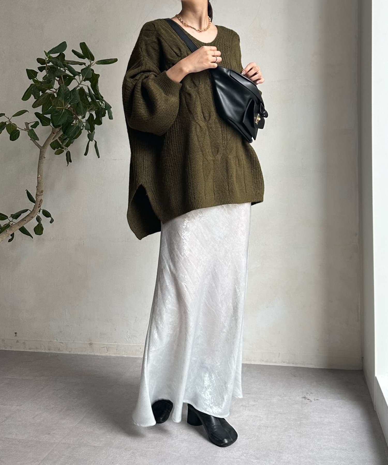 温かみのある大きめのケーブル編みと、抜け感のあるシルエットがかわいいニット。