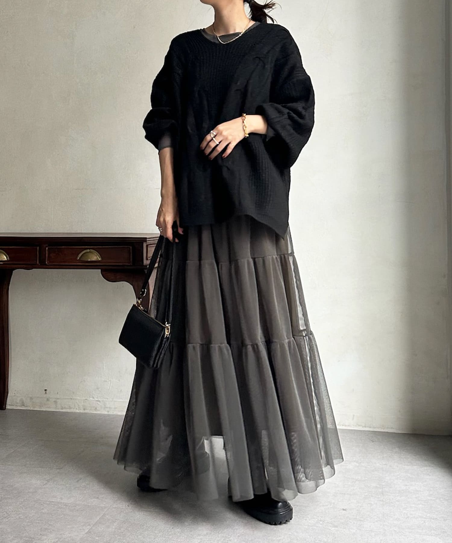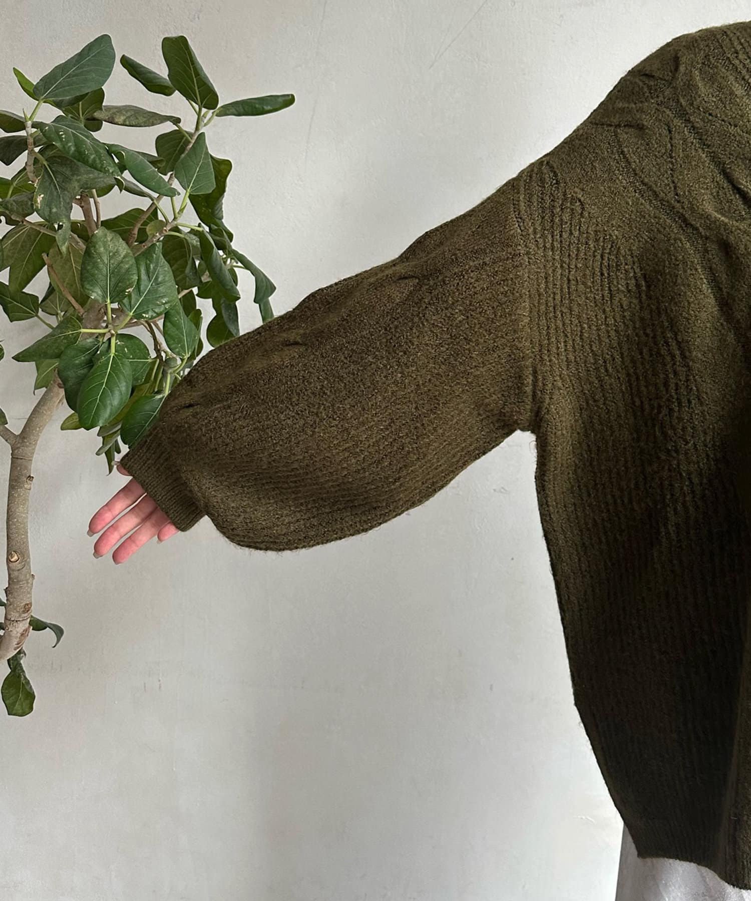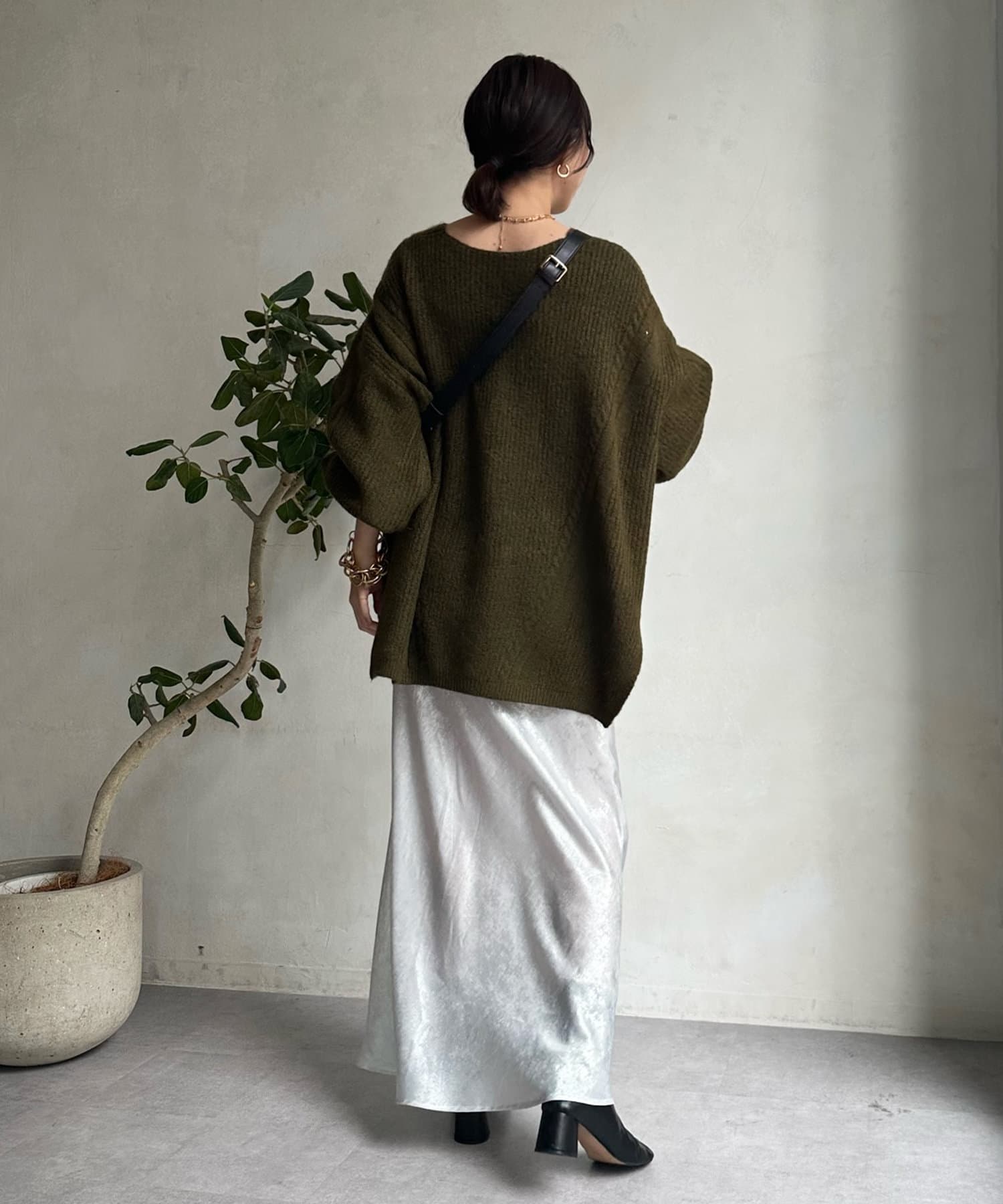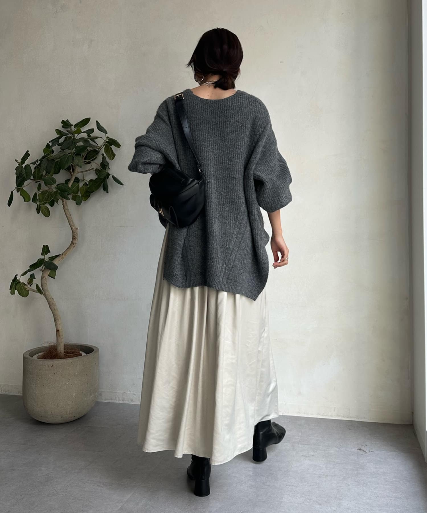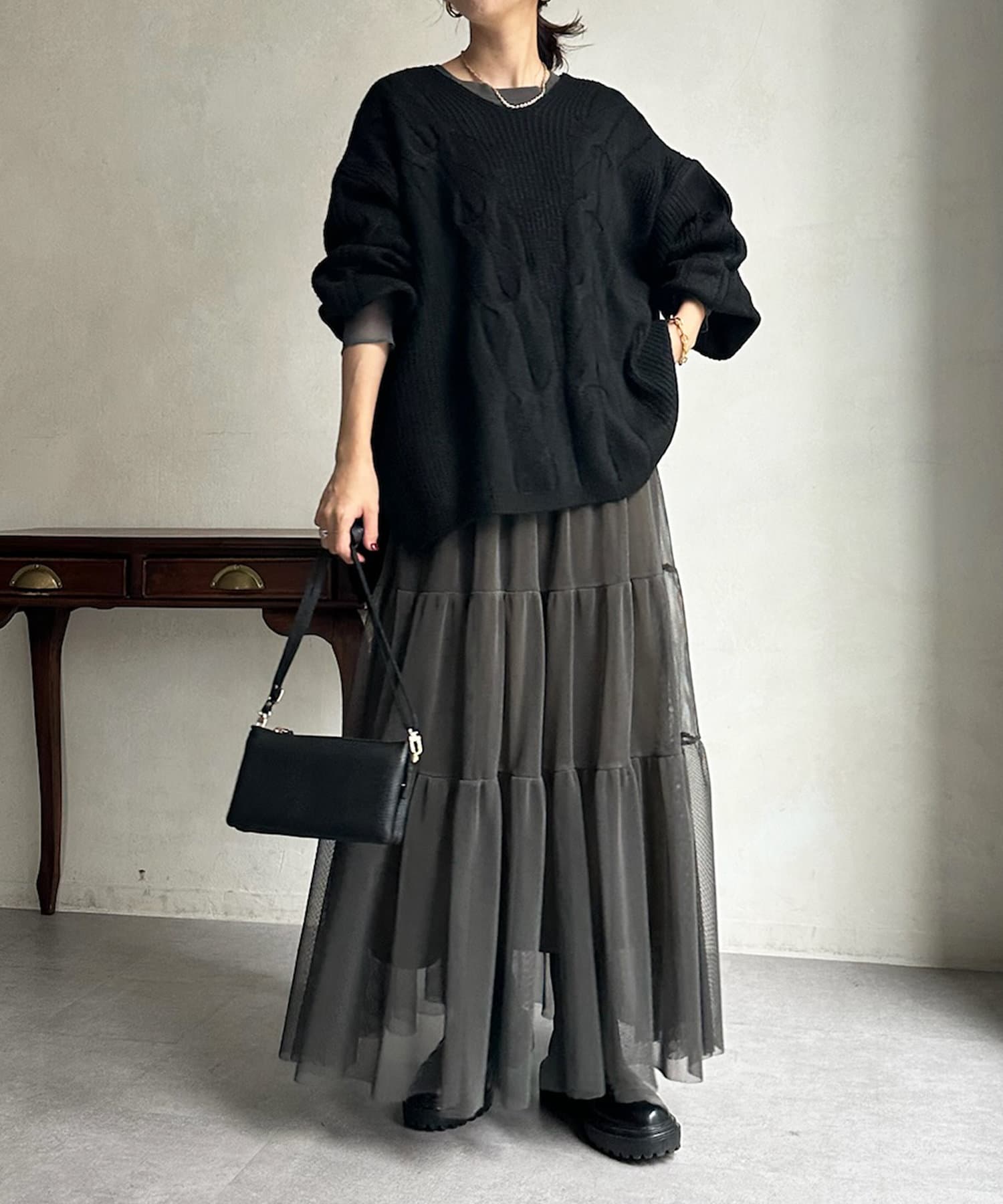 温かみのある大きめのケーブル編みと、抜け感のあるシルエットがかわいいニット。