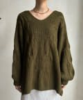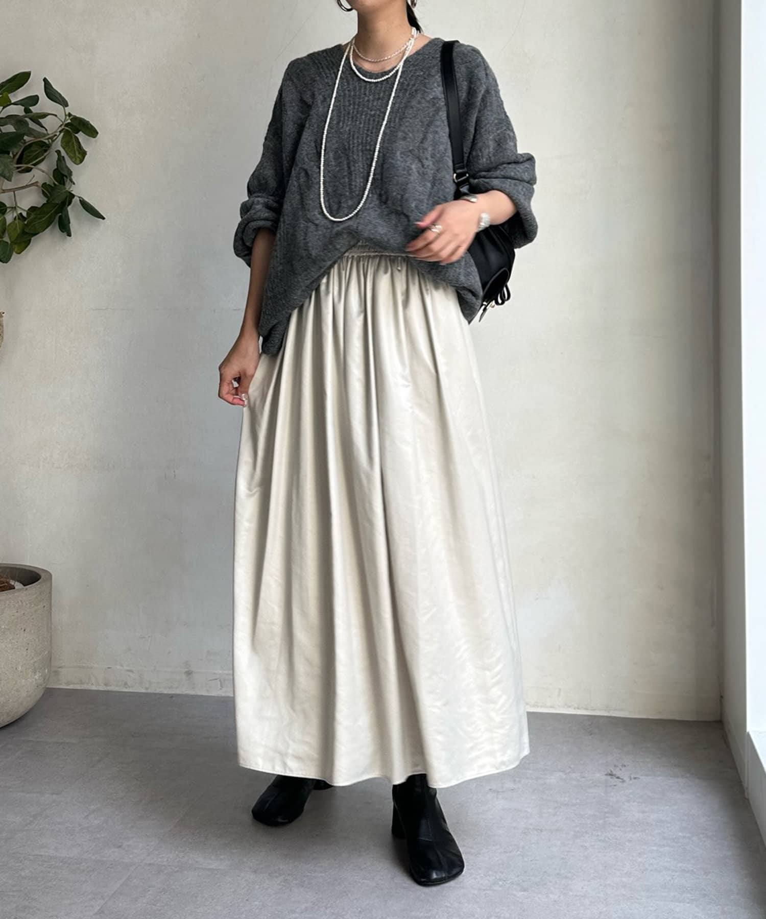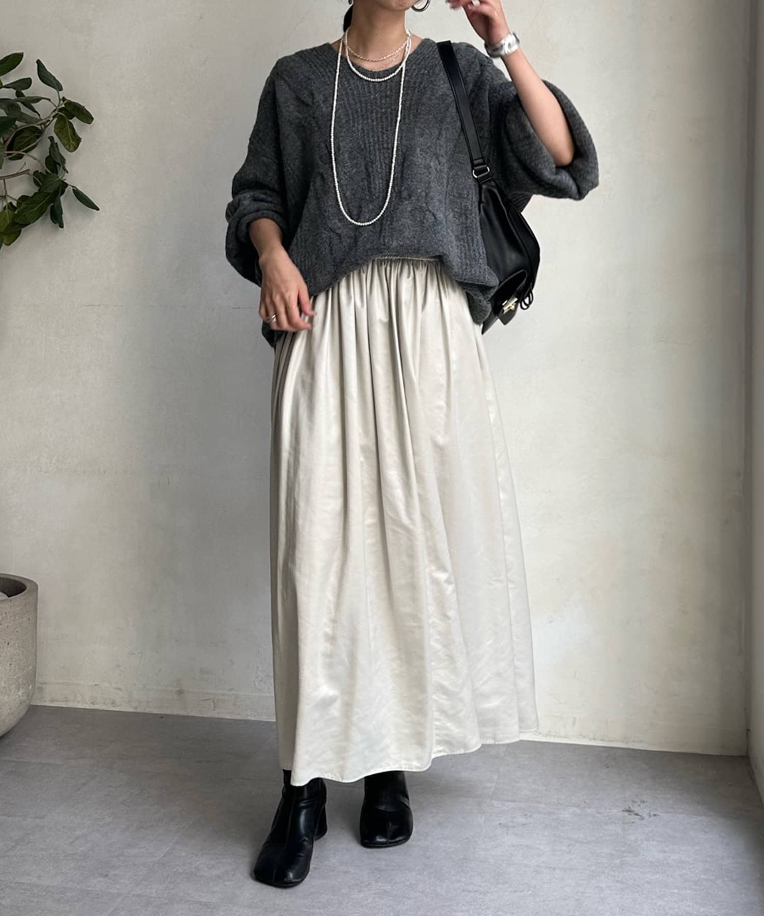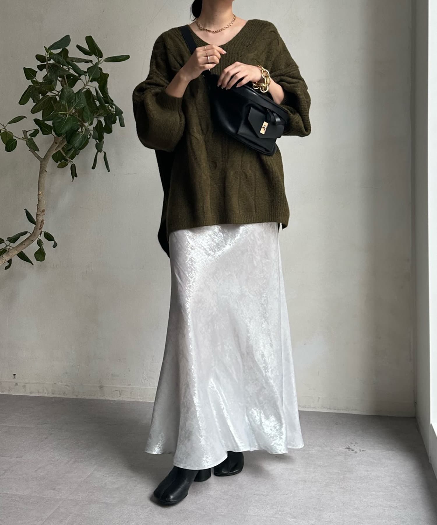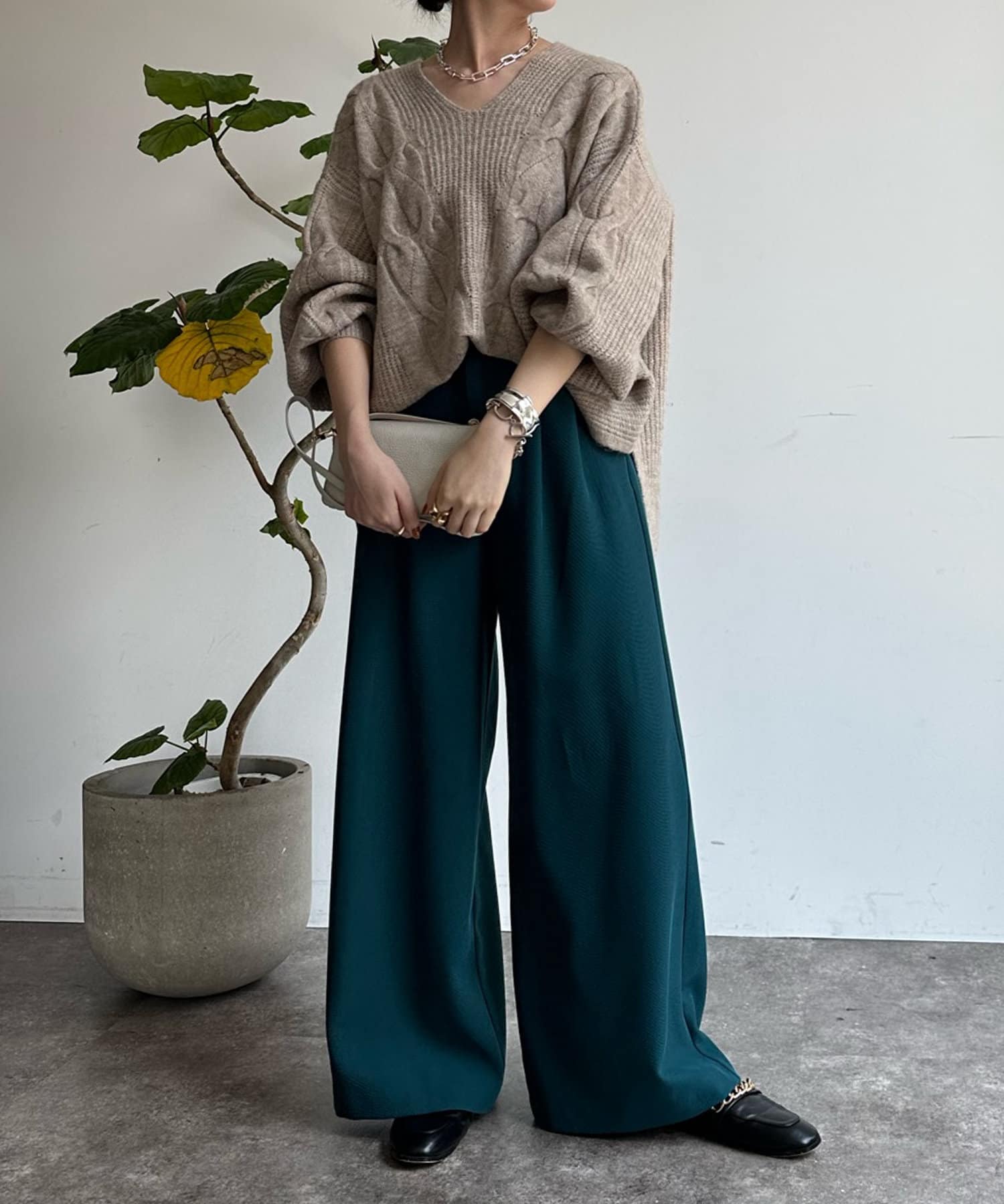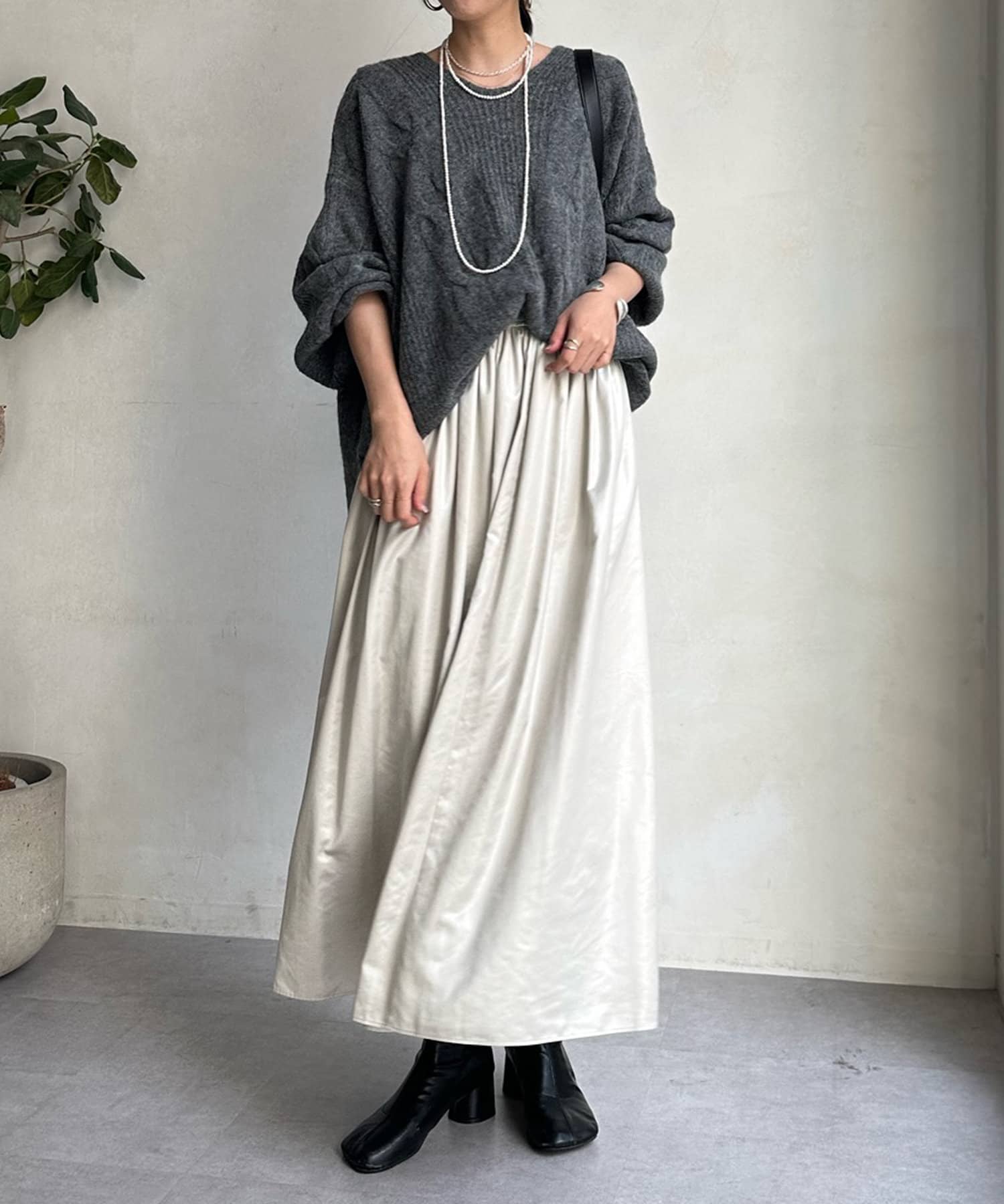温かみのある大きめのケーブル編みと、抜け感のあるシルエットがかわいいニット。