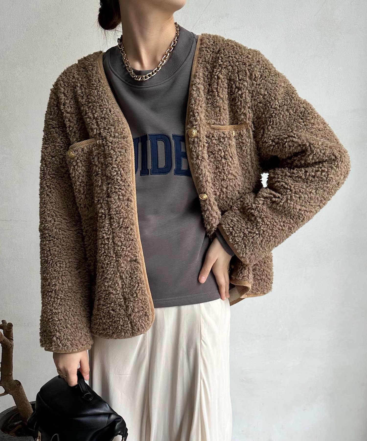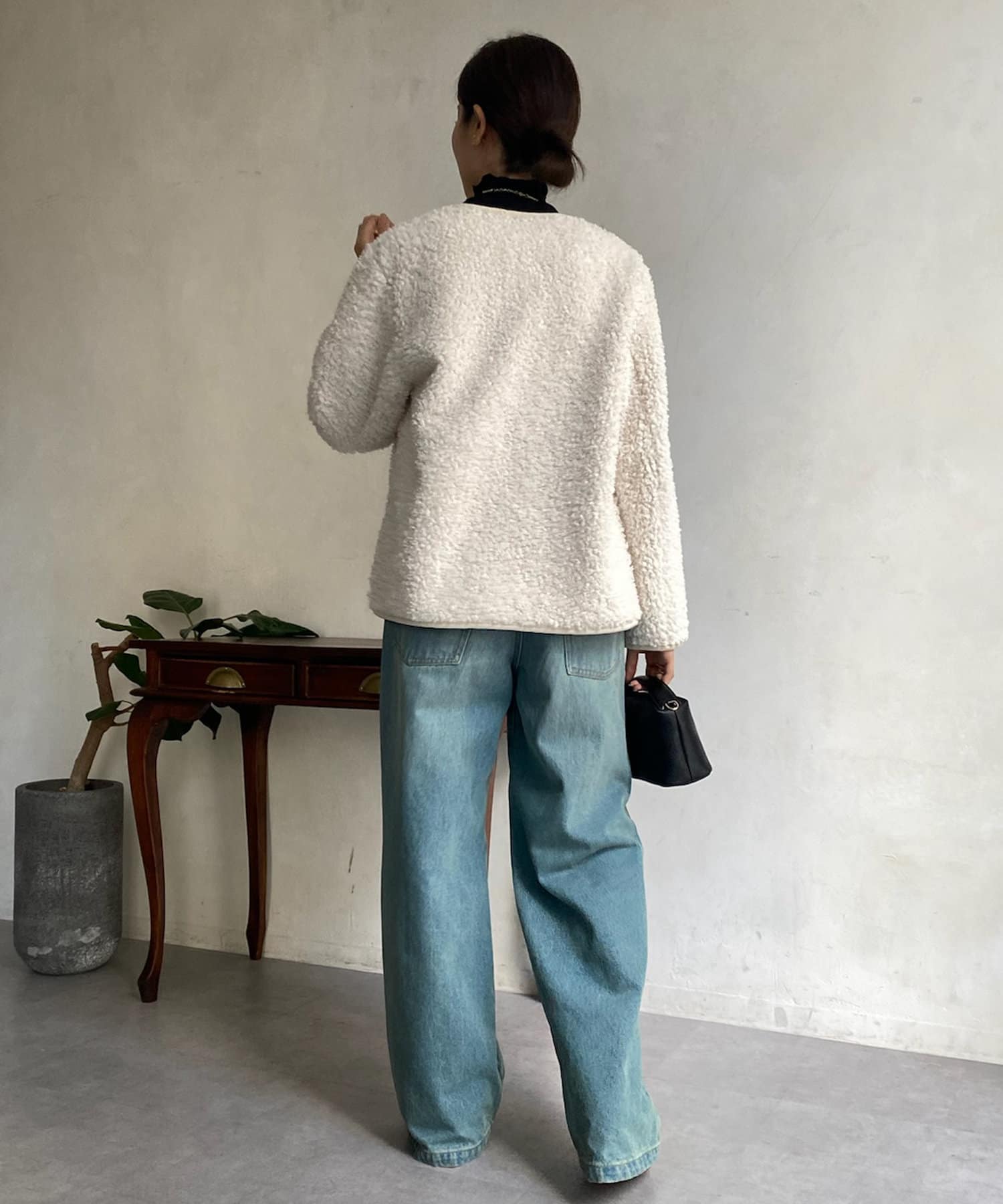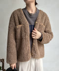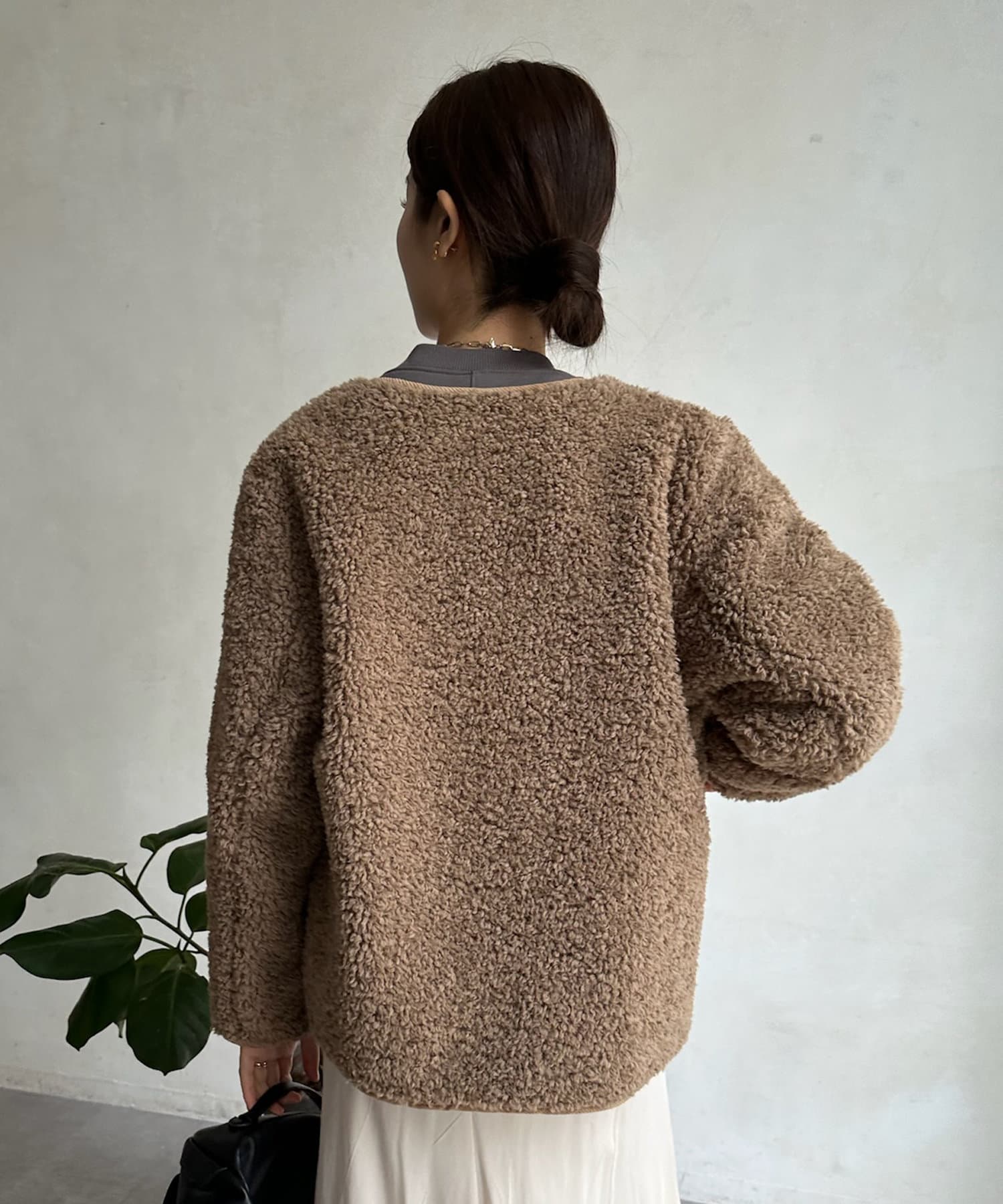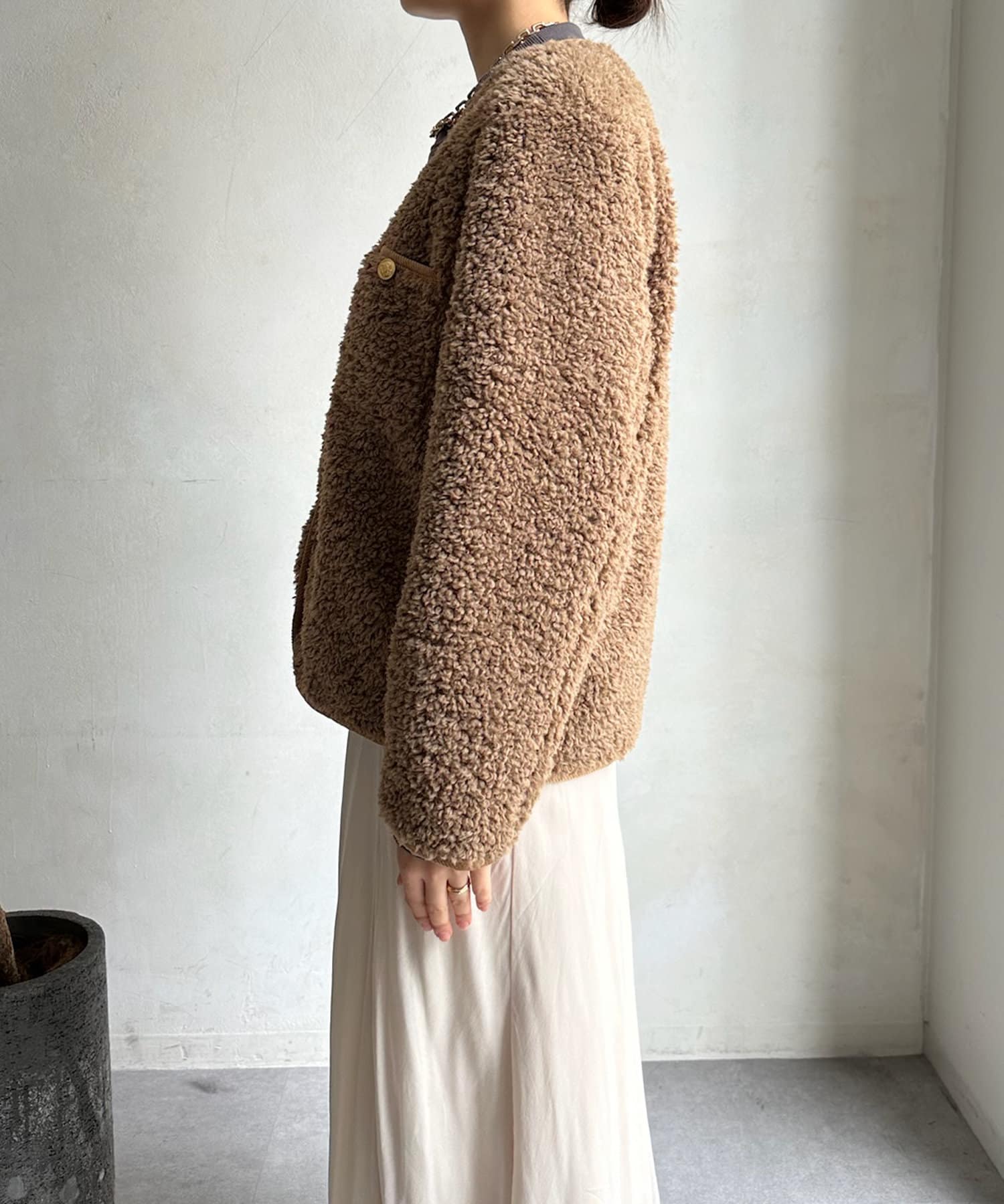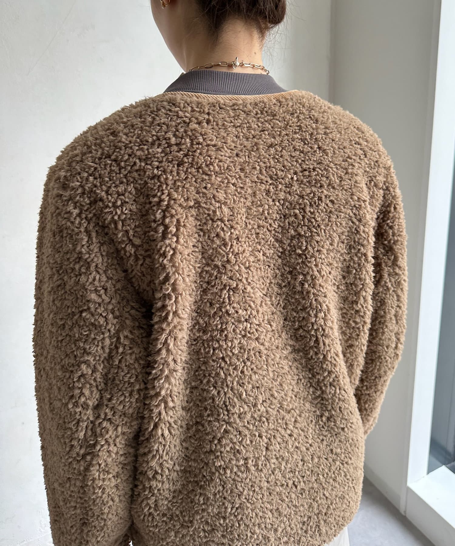 ふわふわとしたカーリーな表面感の素材のフェイクムートンジャケット!
