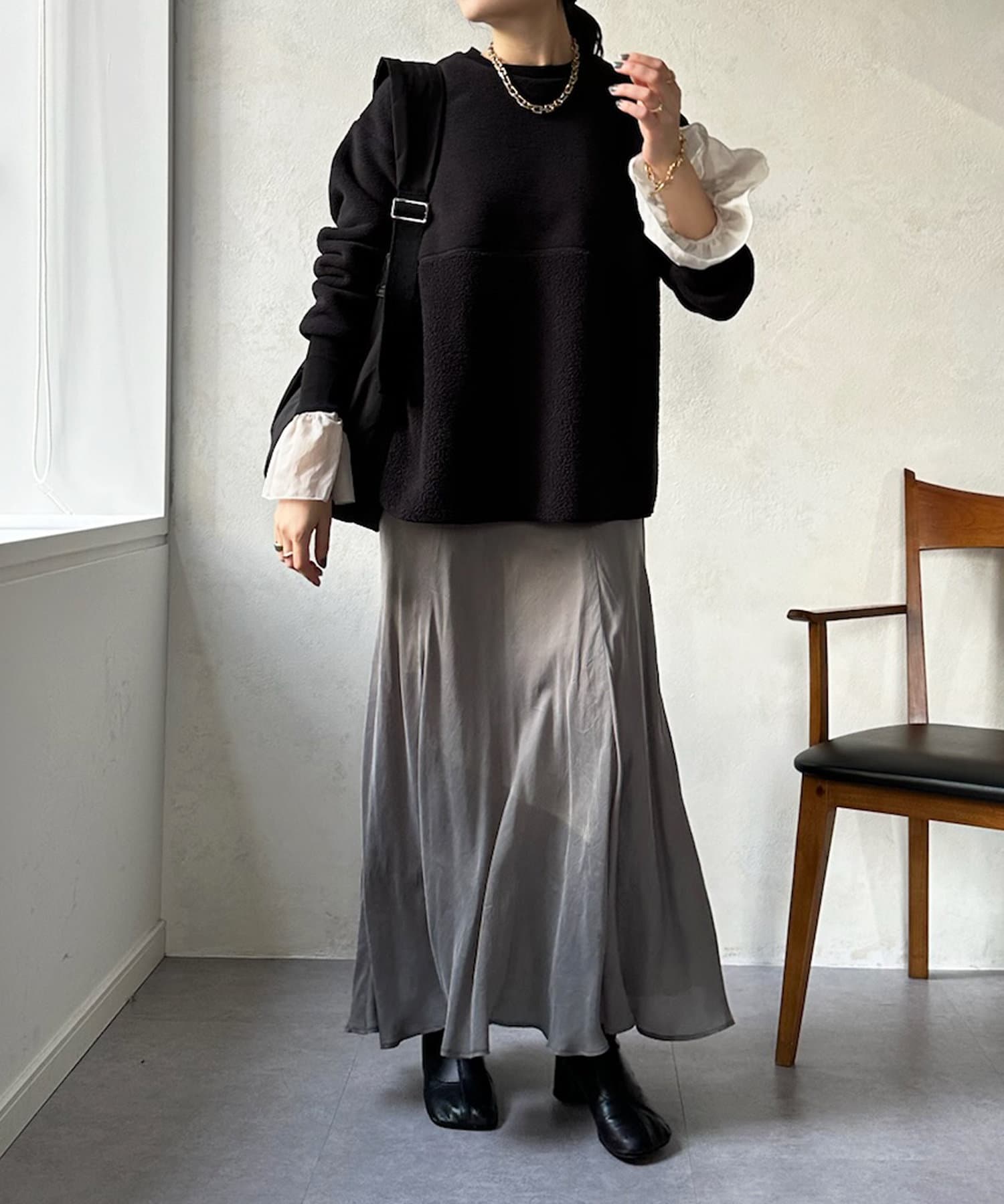 異素材に切り替えた袖口がポイントの1着。