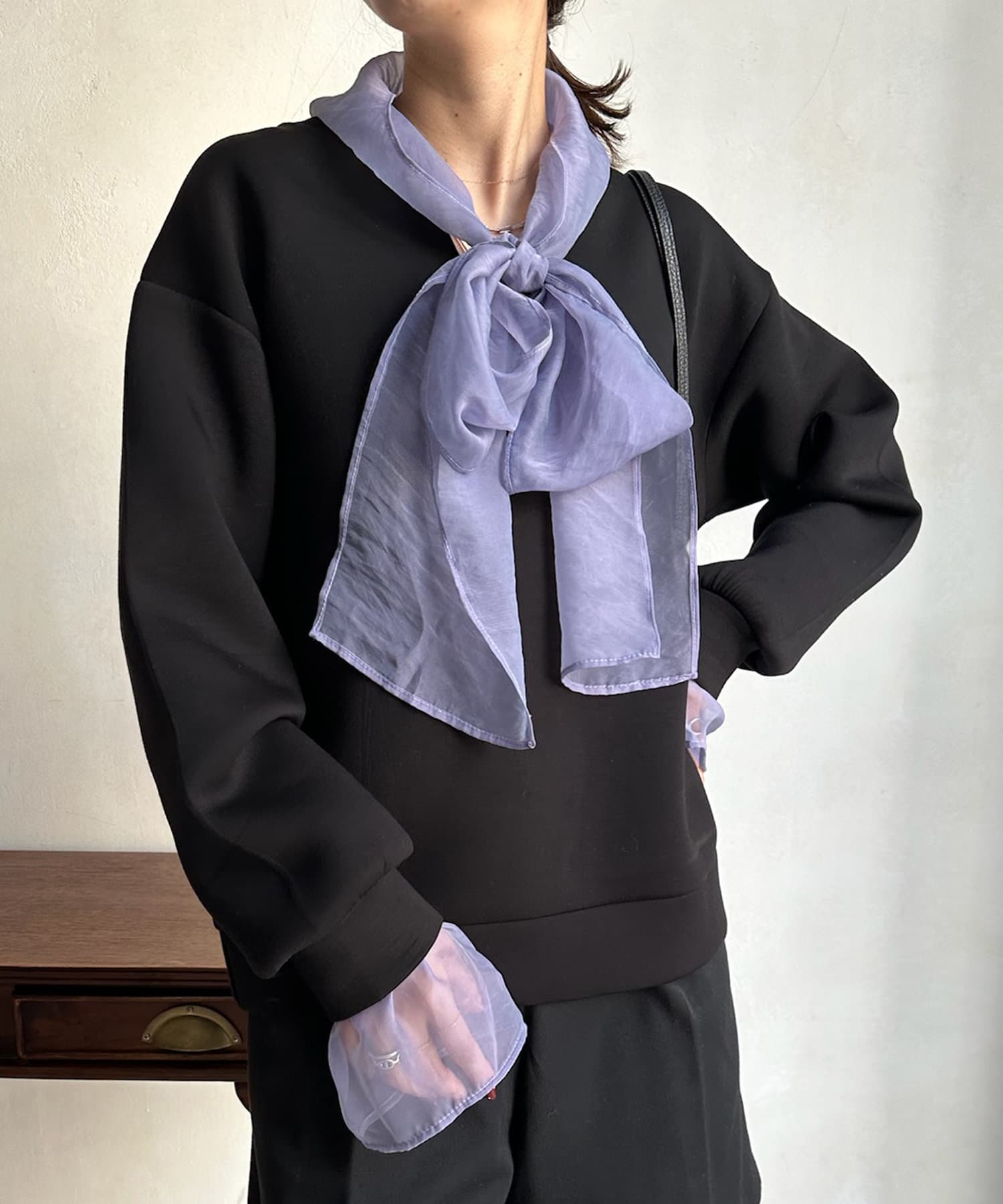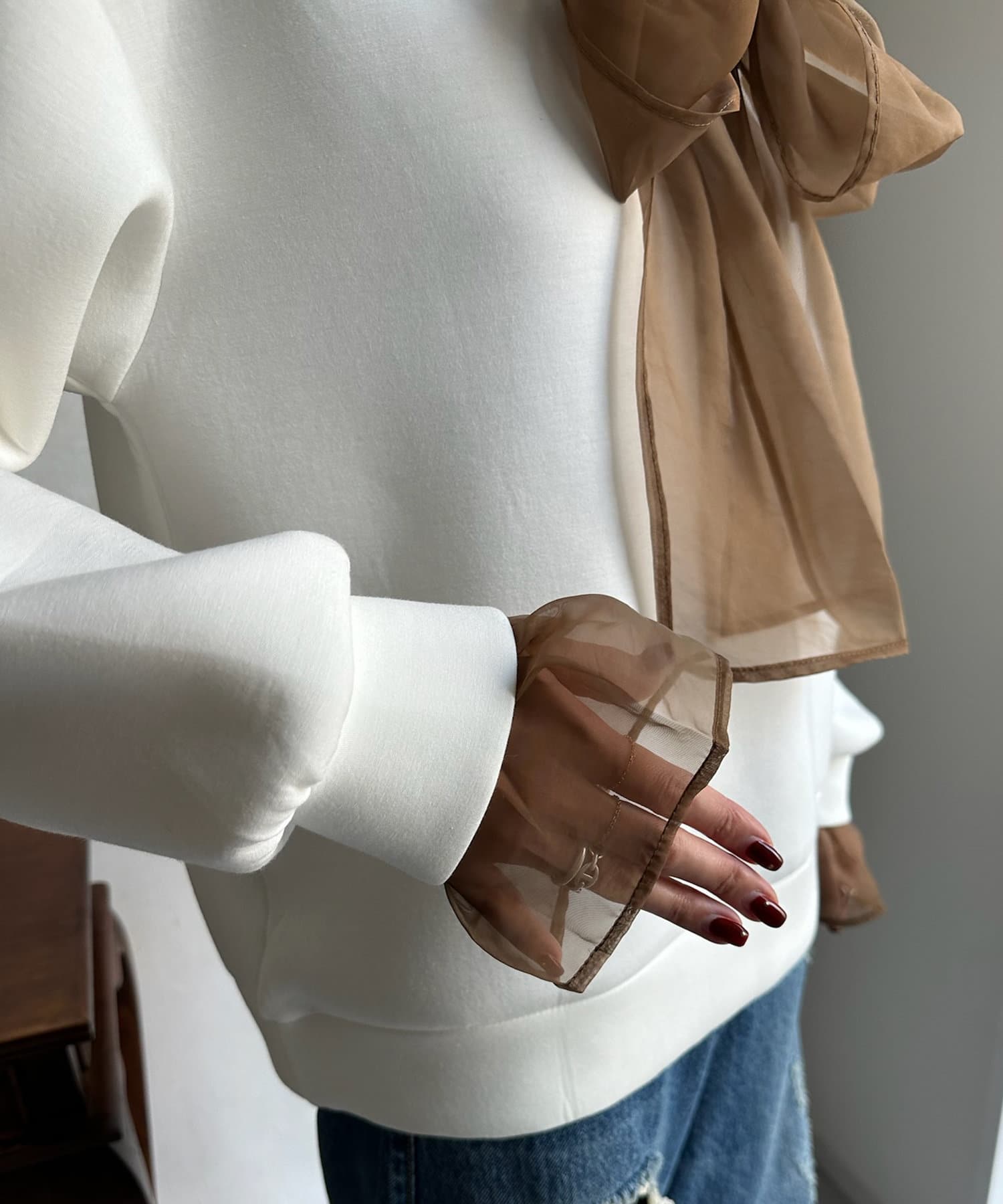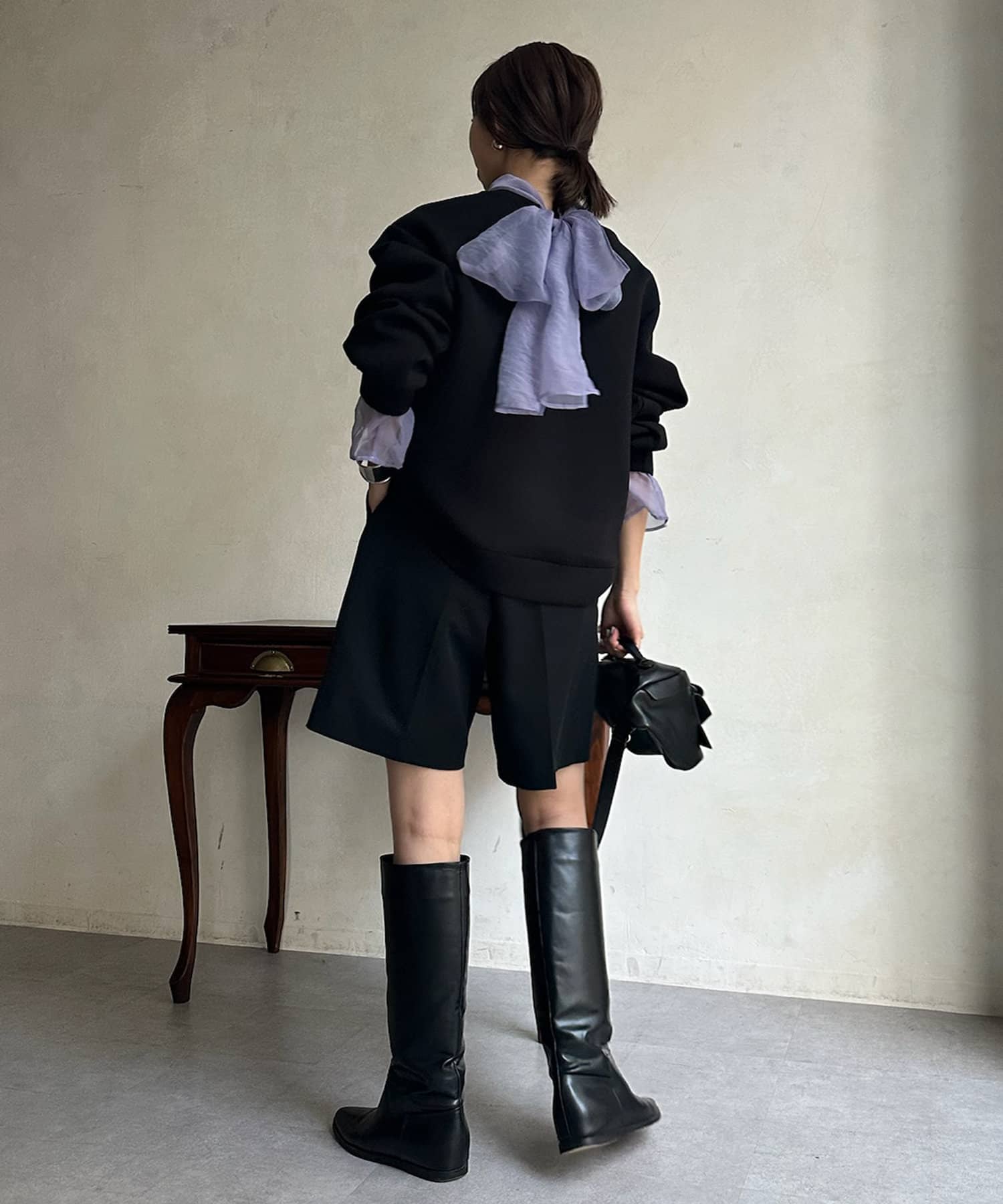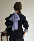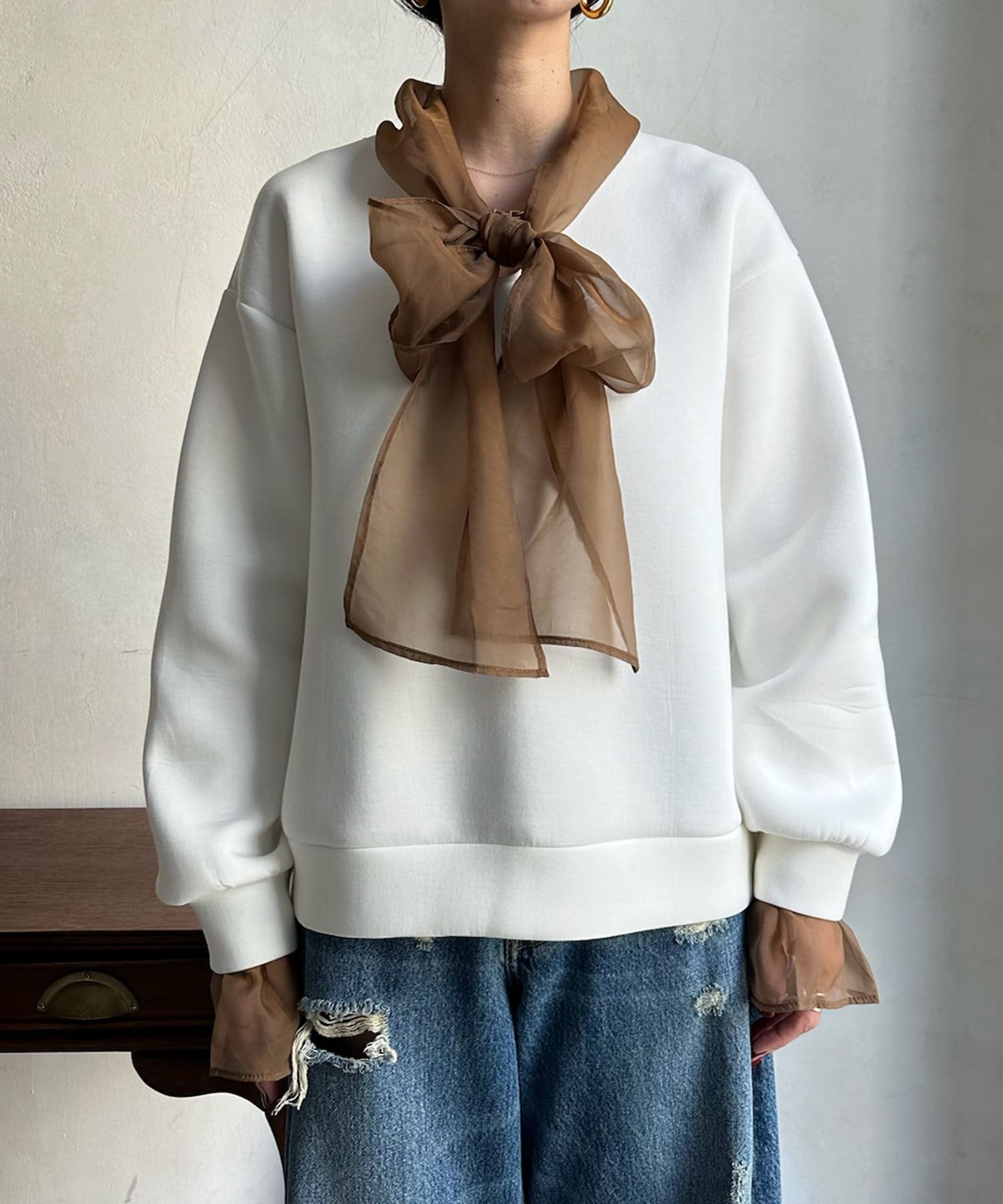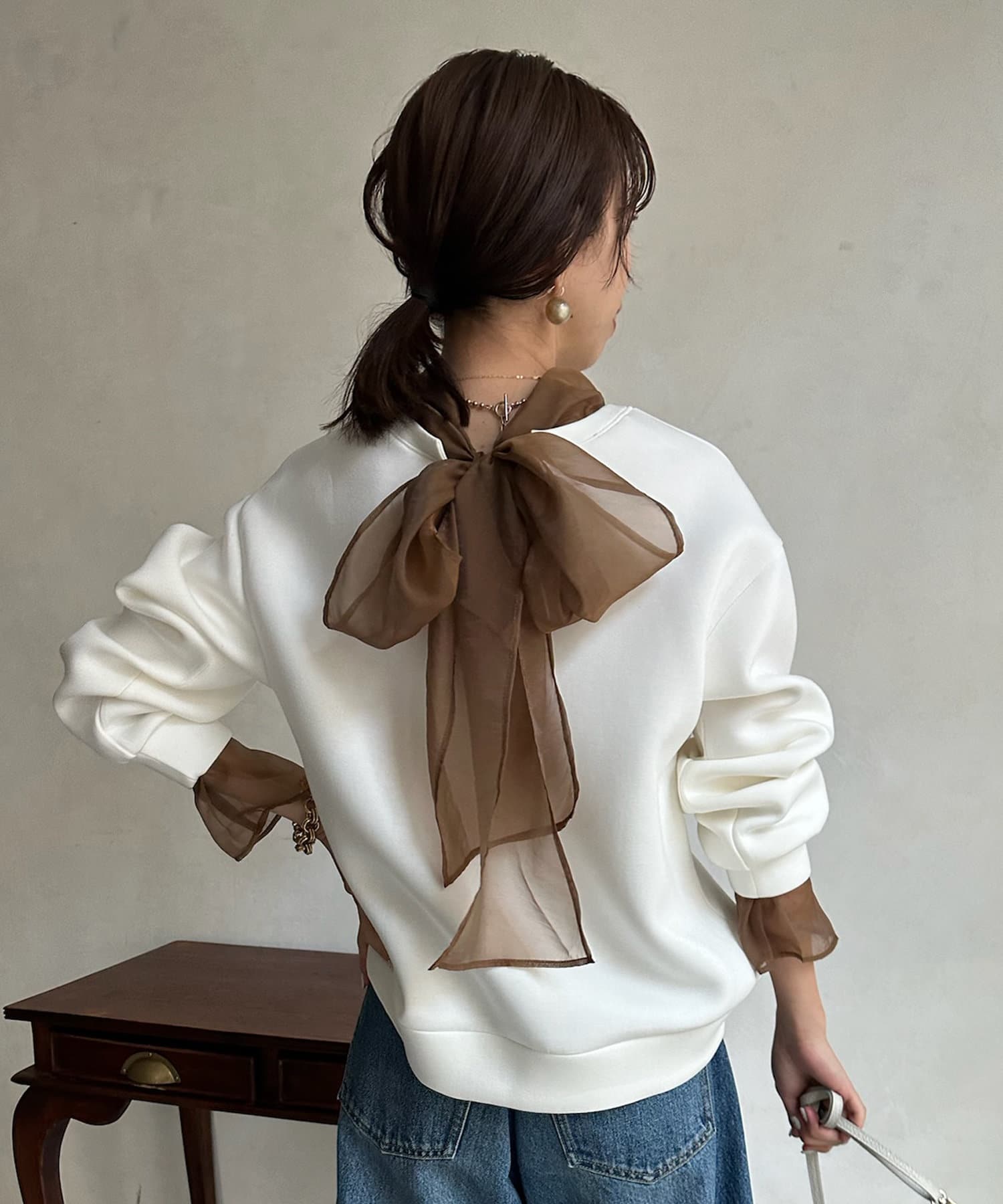 異素材のふわふわ素材がレイヤードされ、棒タイを前後2WAYで着れるトップス。