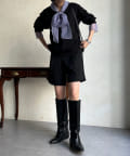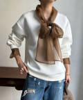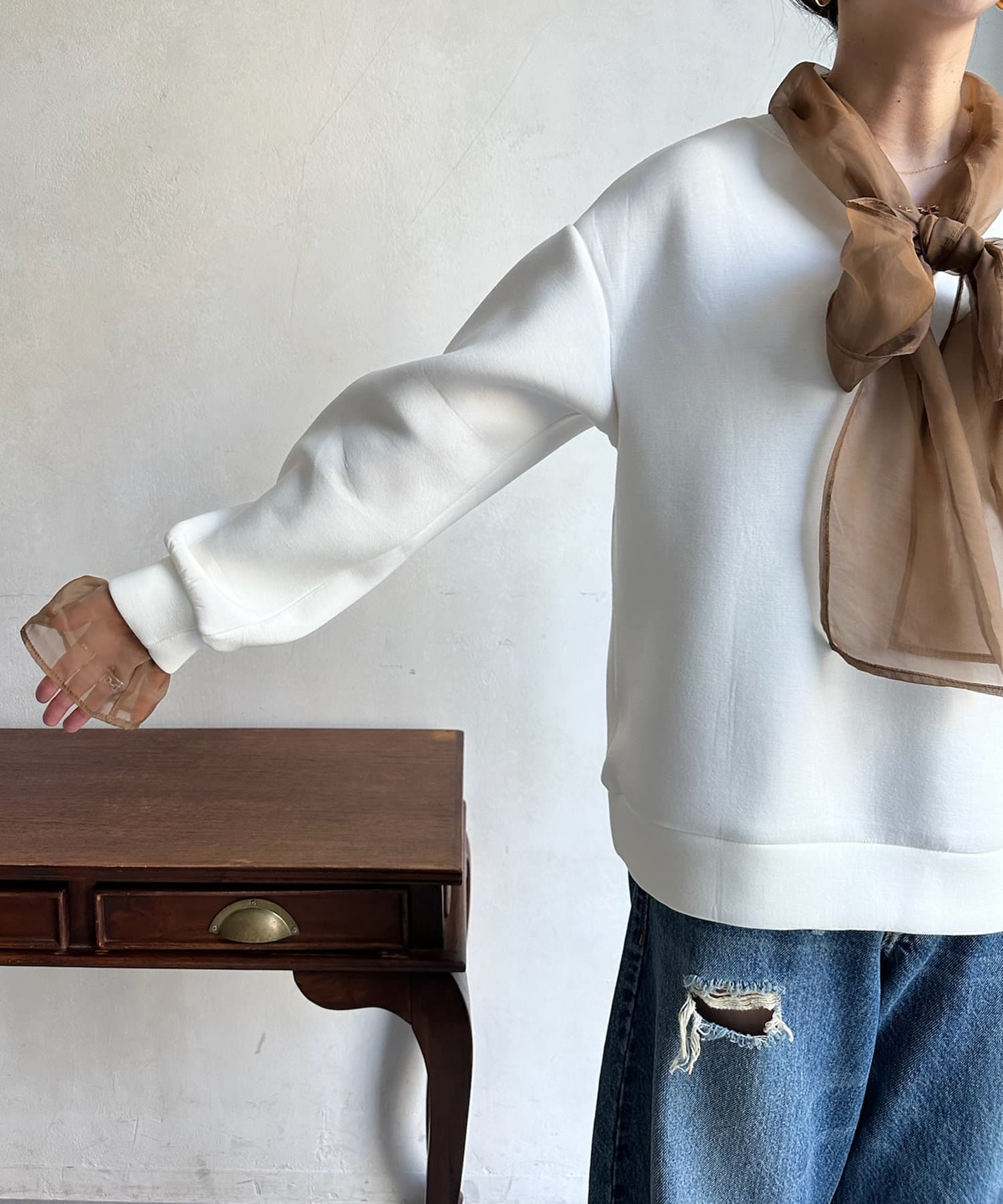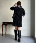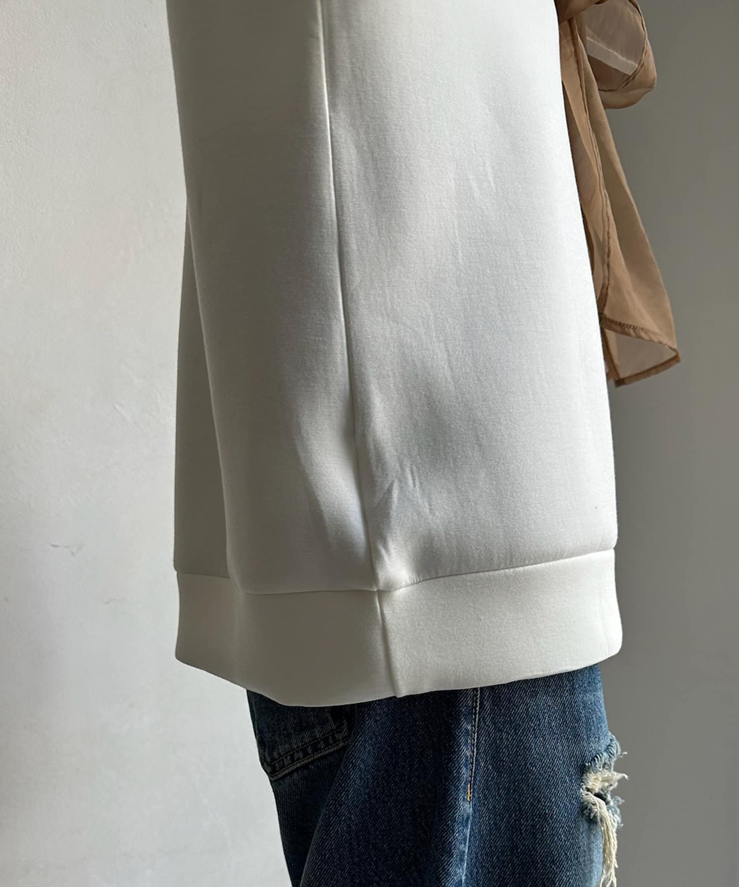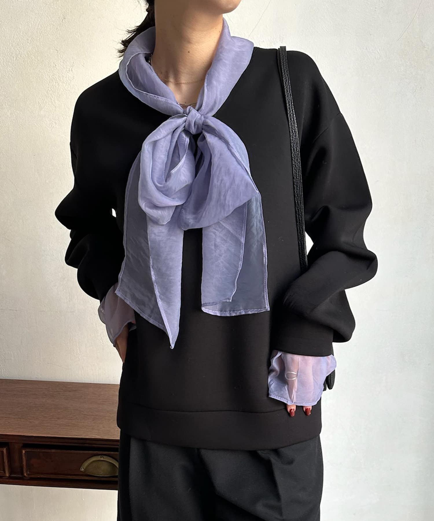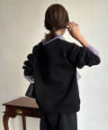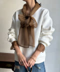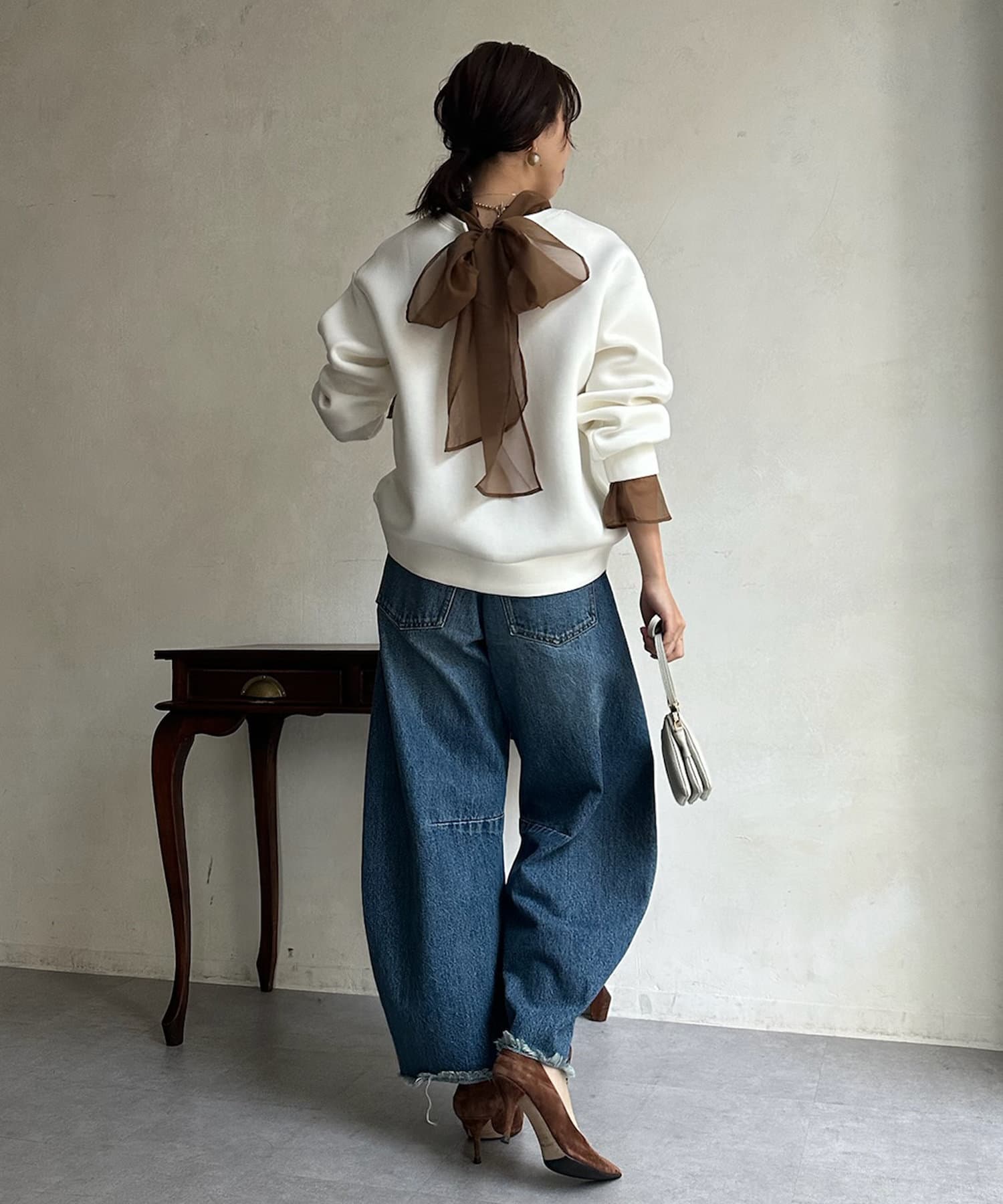 異素材のふわふわ素材がレイヤードされ、棒タイを前後2WAYで着れるトップス。