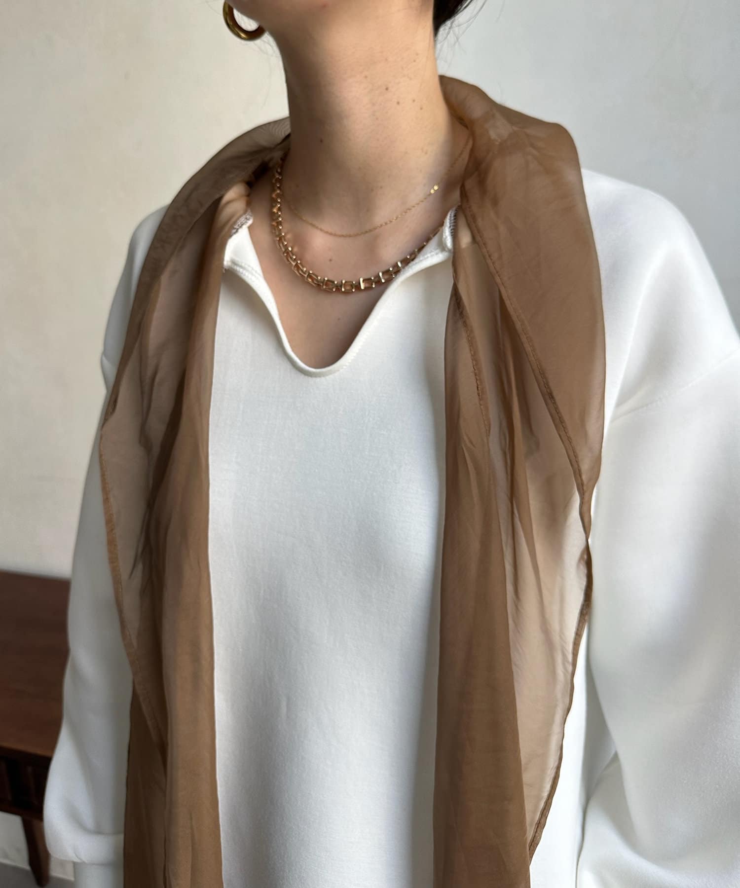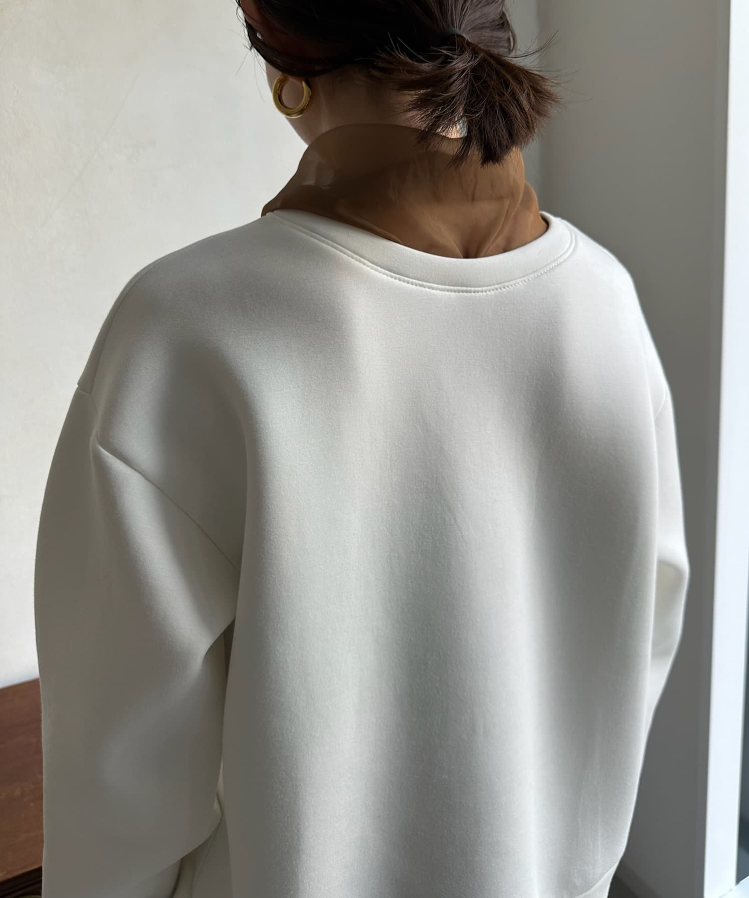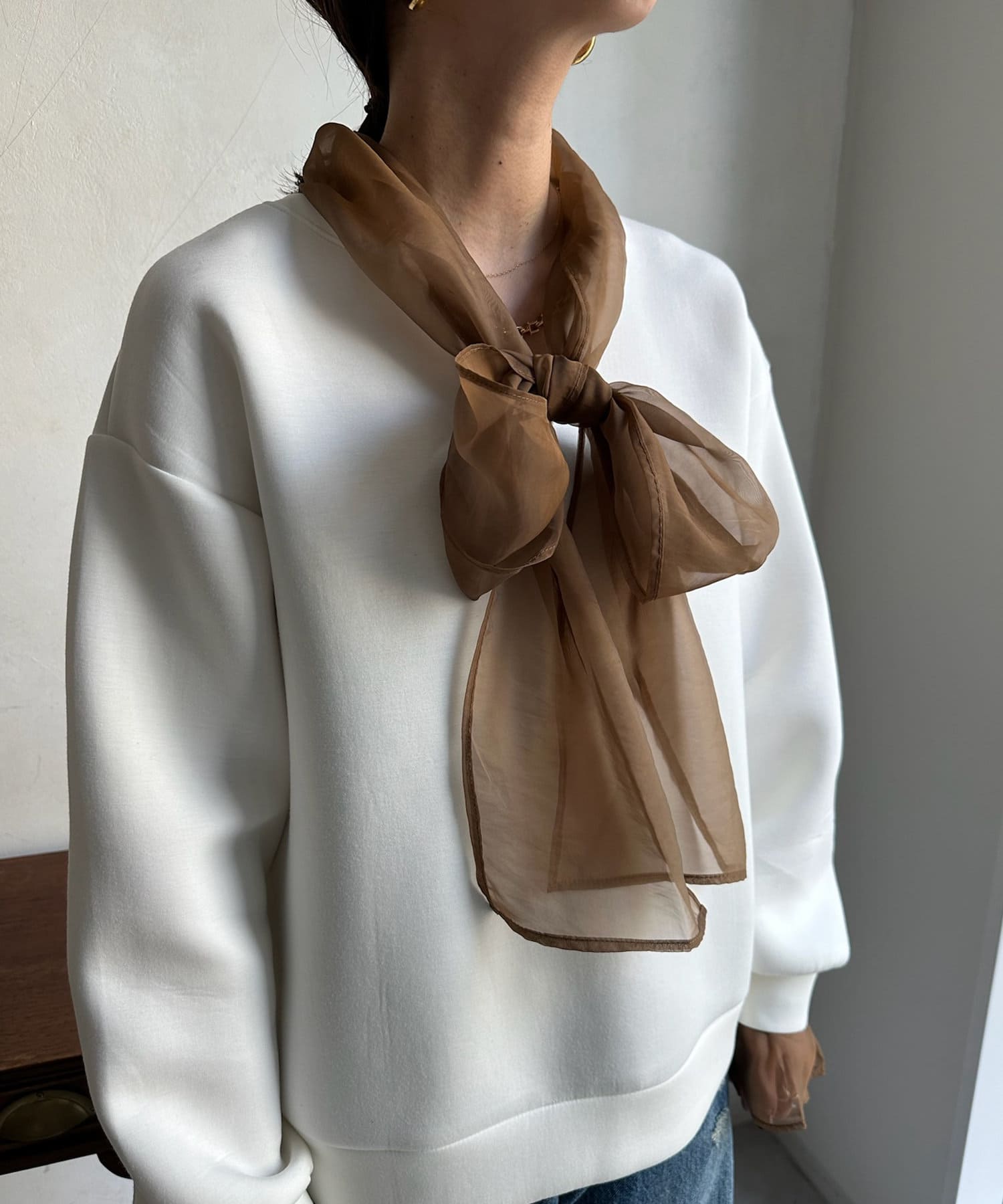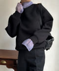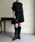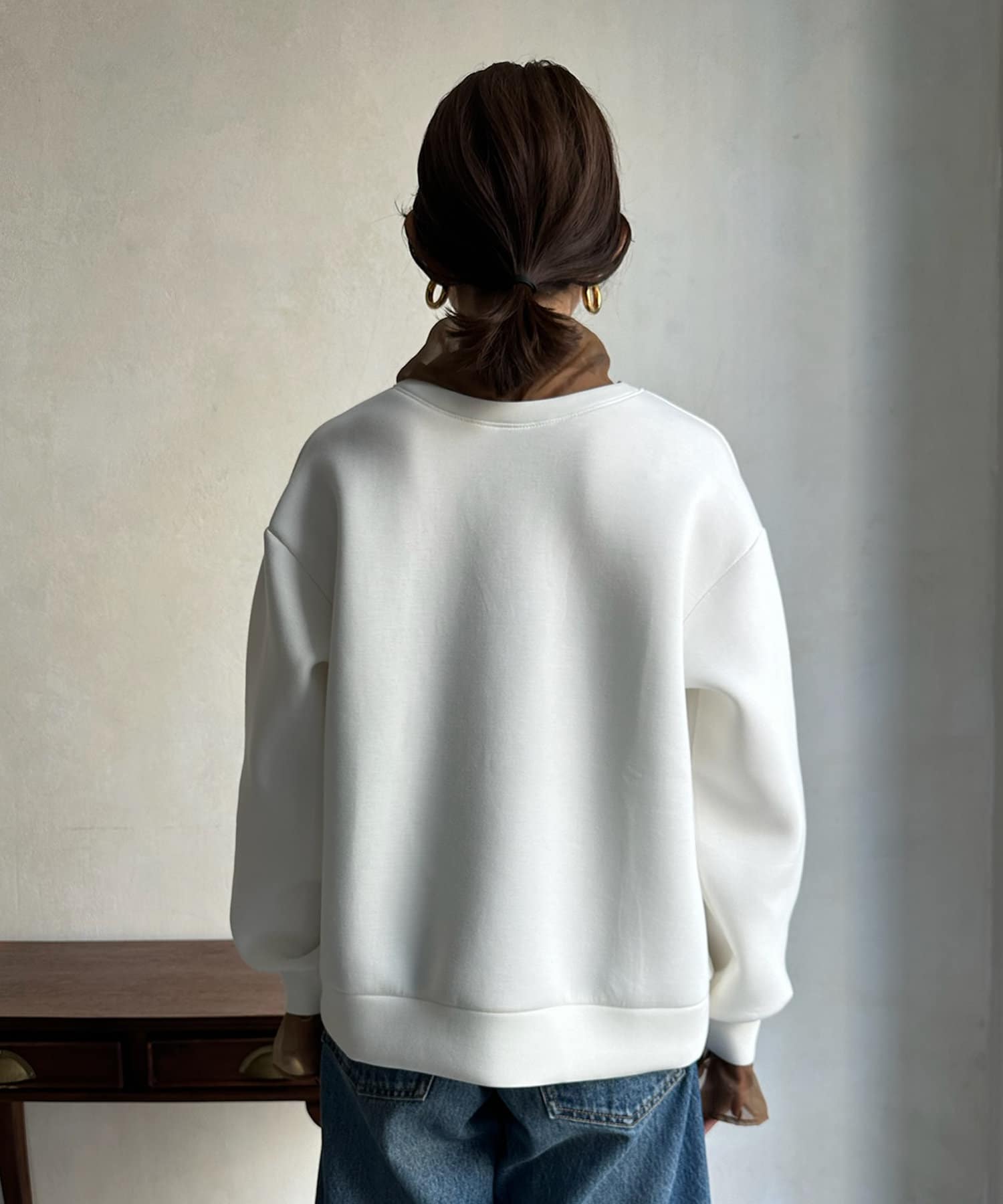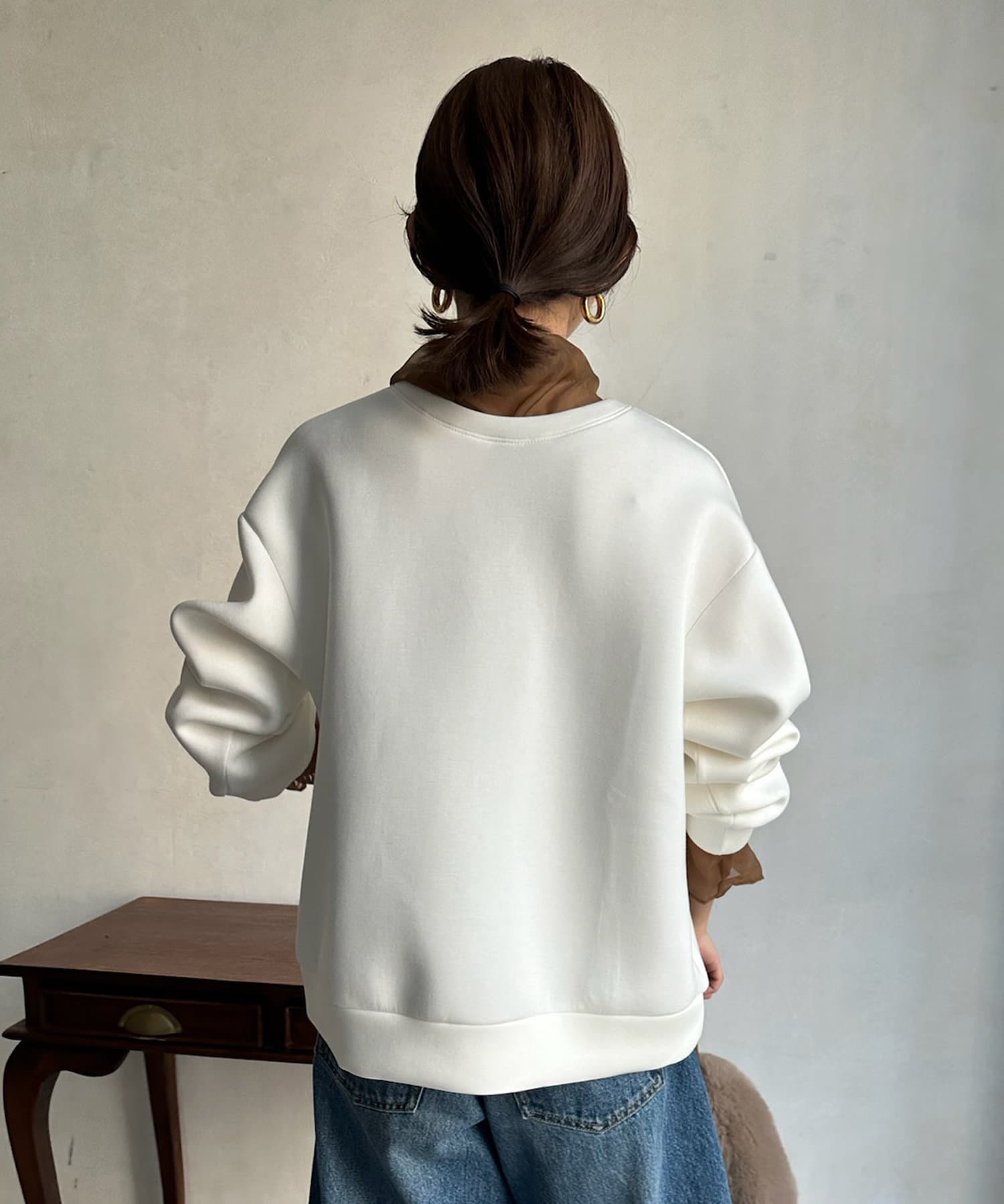 異素材のふわふわ素材がレイヤードされ、棒タイを前後2WAYで着れるトップス。