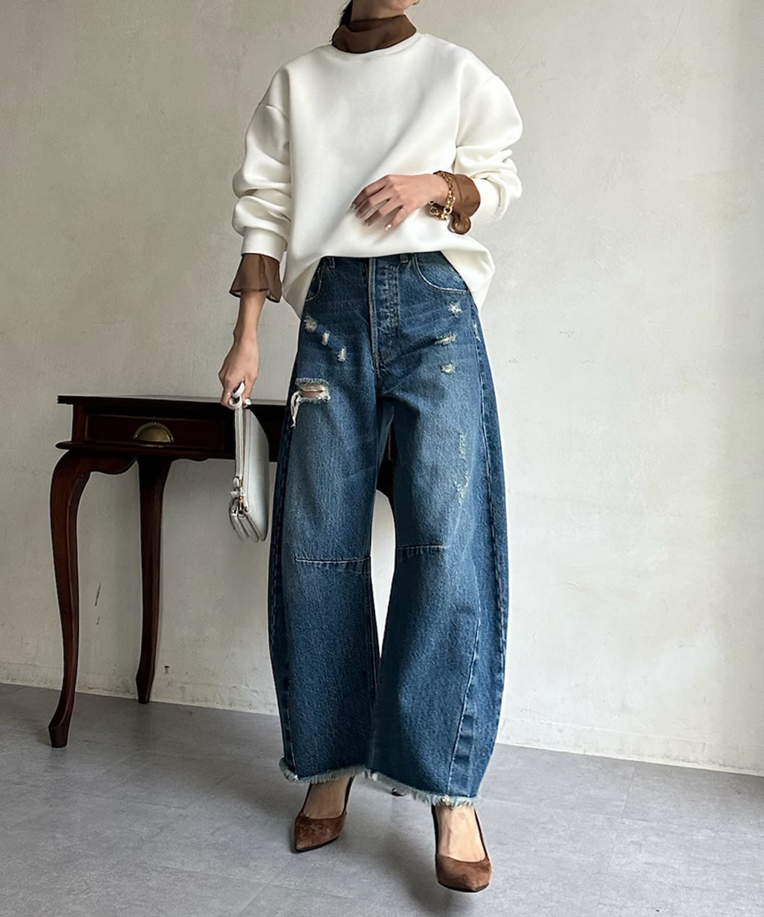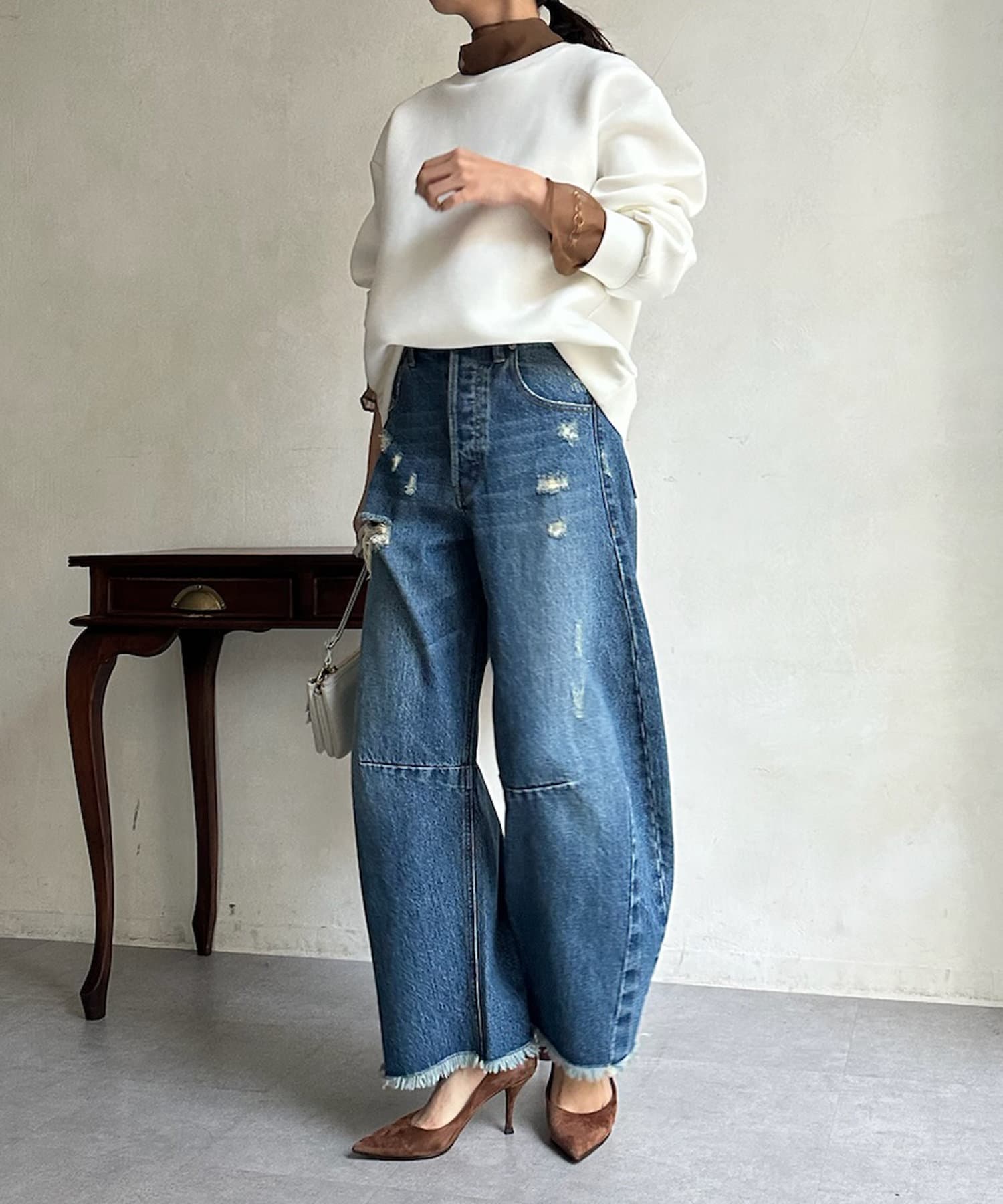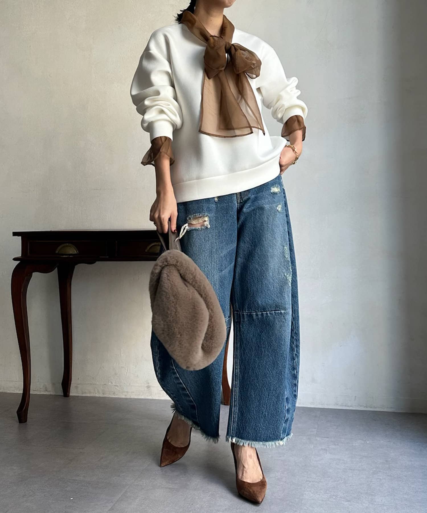 カジュアルを強めてデニムで合わせるのも、スカートで合わせてキレイ目スタイルにするのも合うアイテムです!