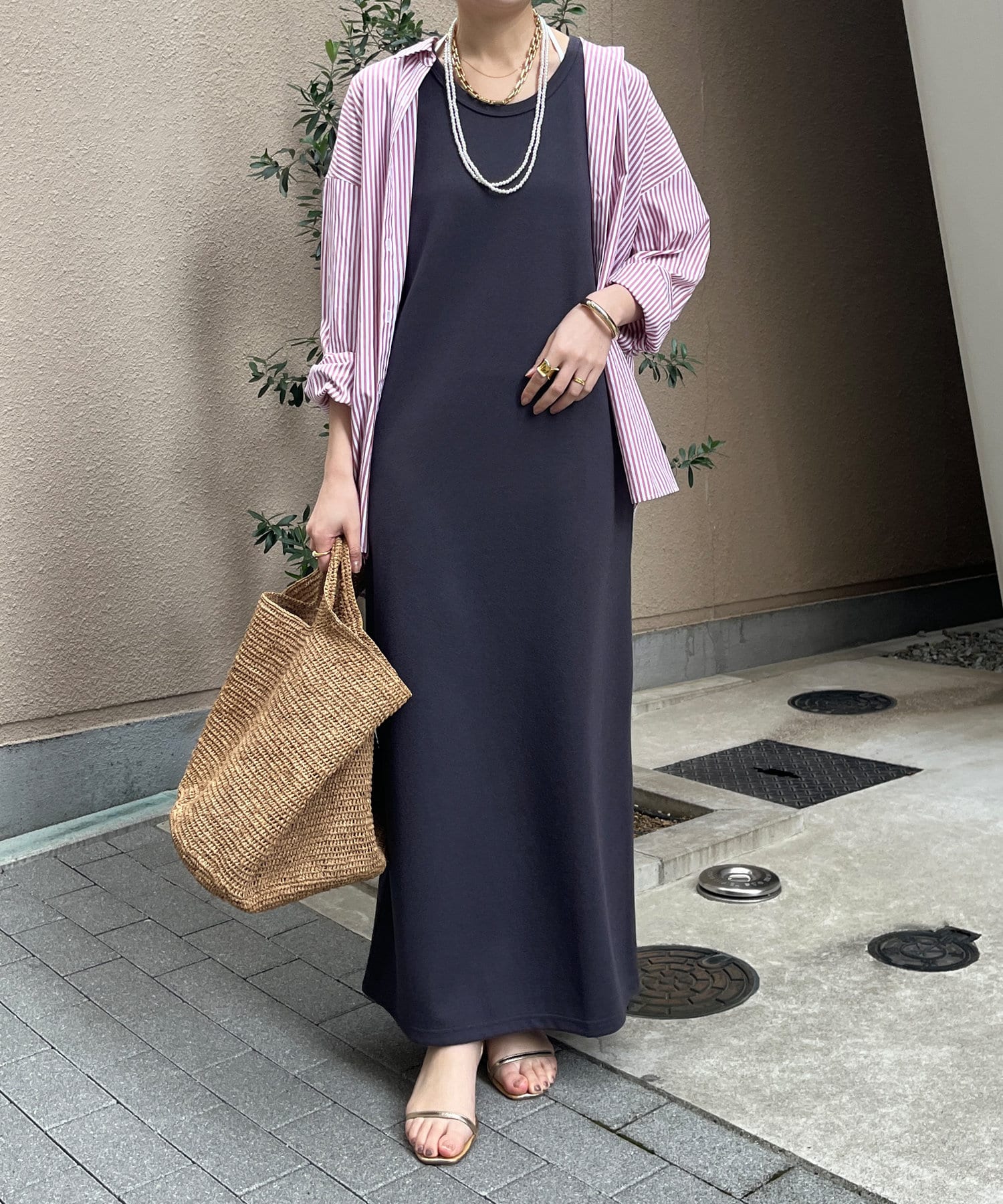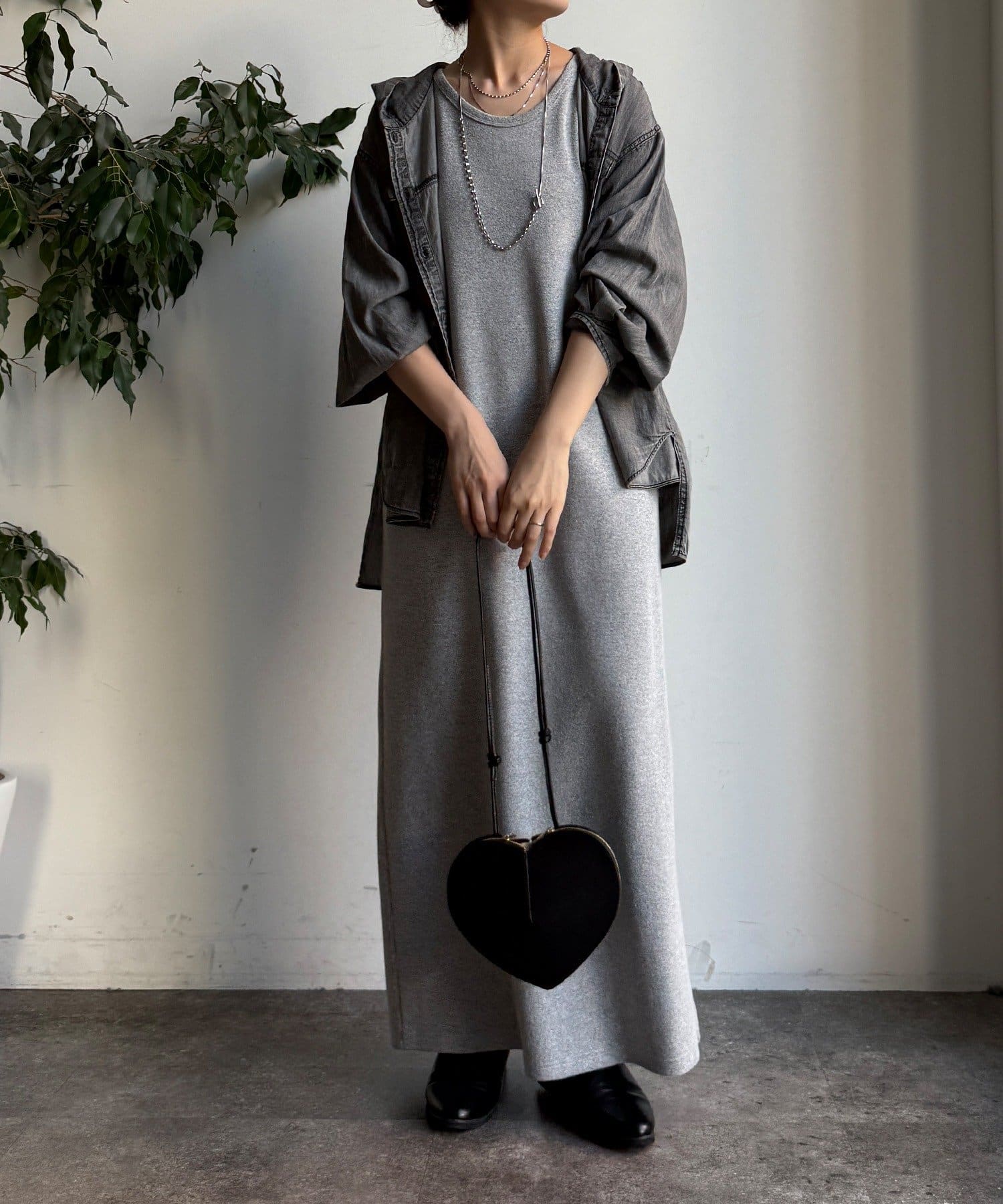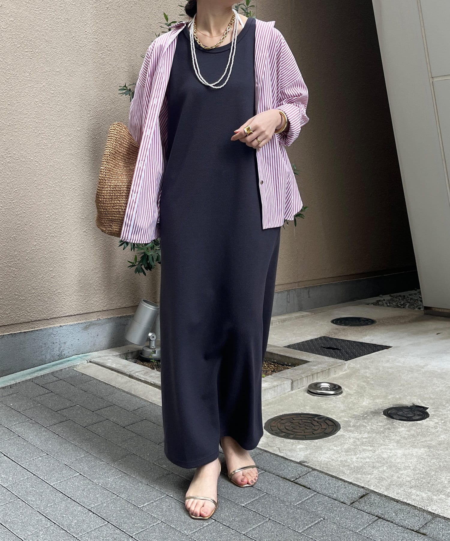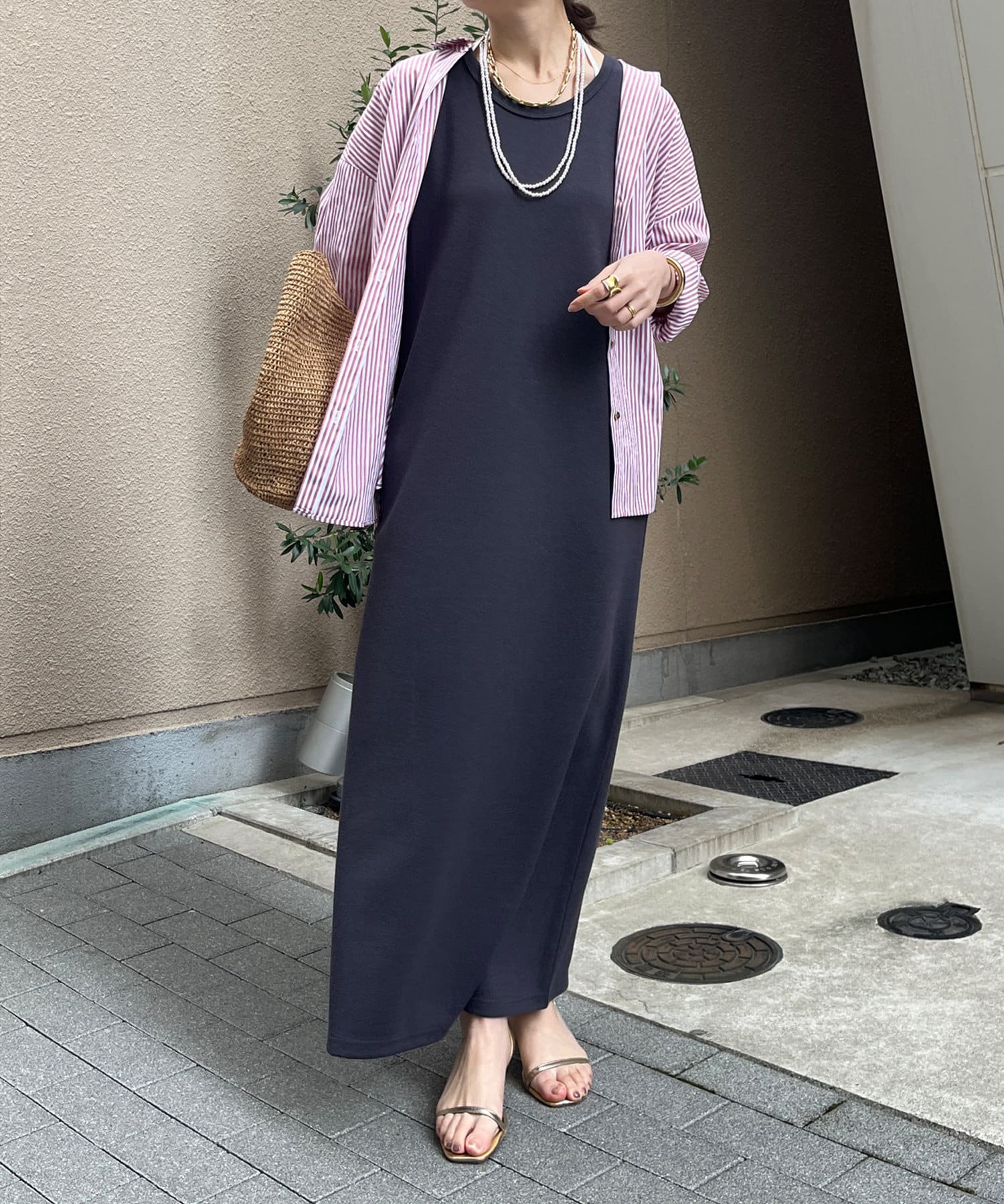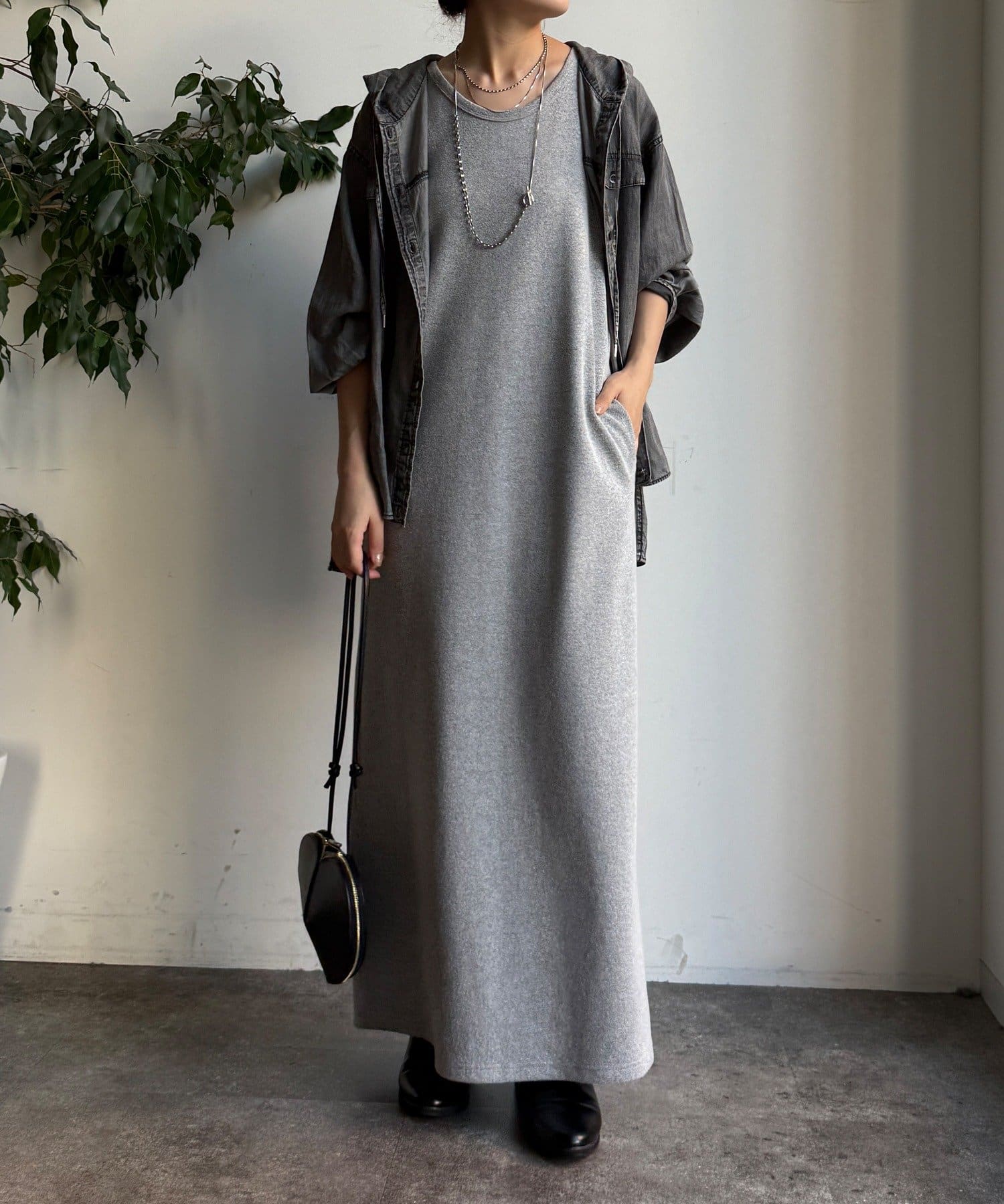 こういうワンピはどうしてものっぺりしますがこちらは生地が厚めで、長いけど良いです。リネンやデニムのシャツと合わせたい。