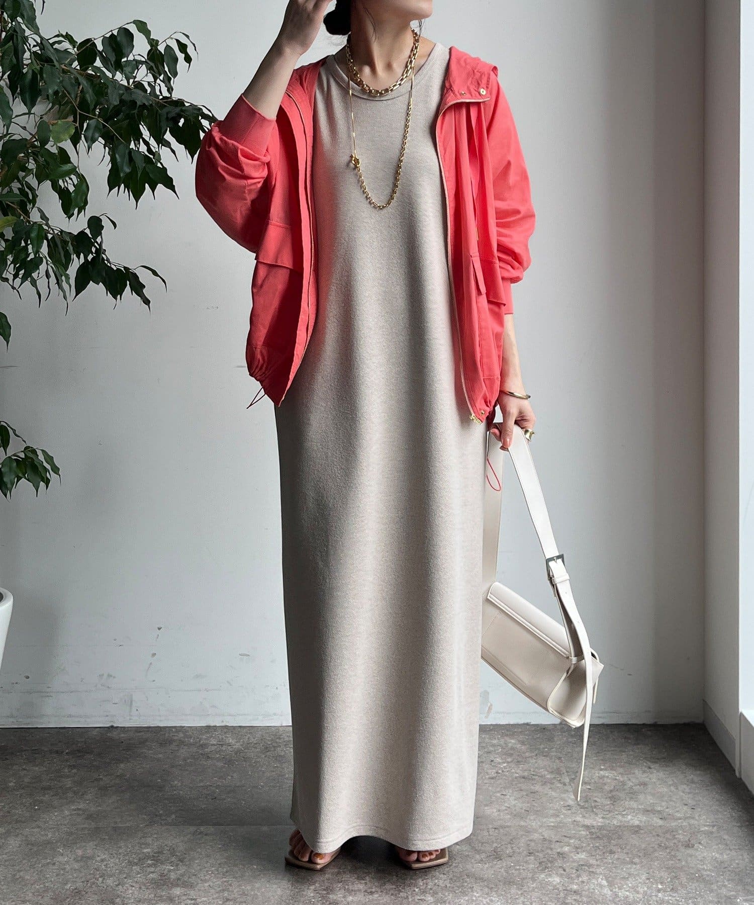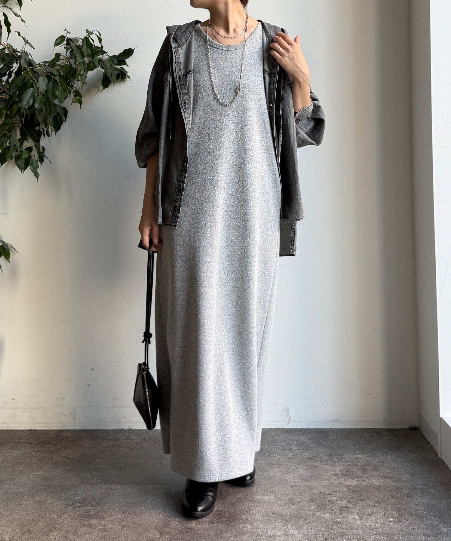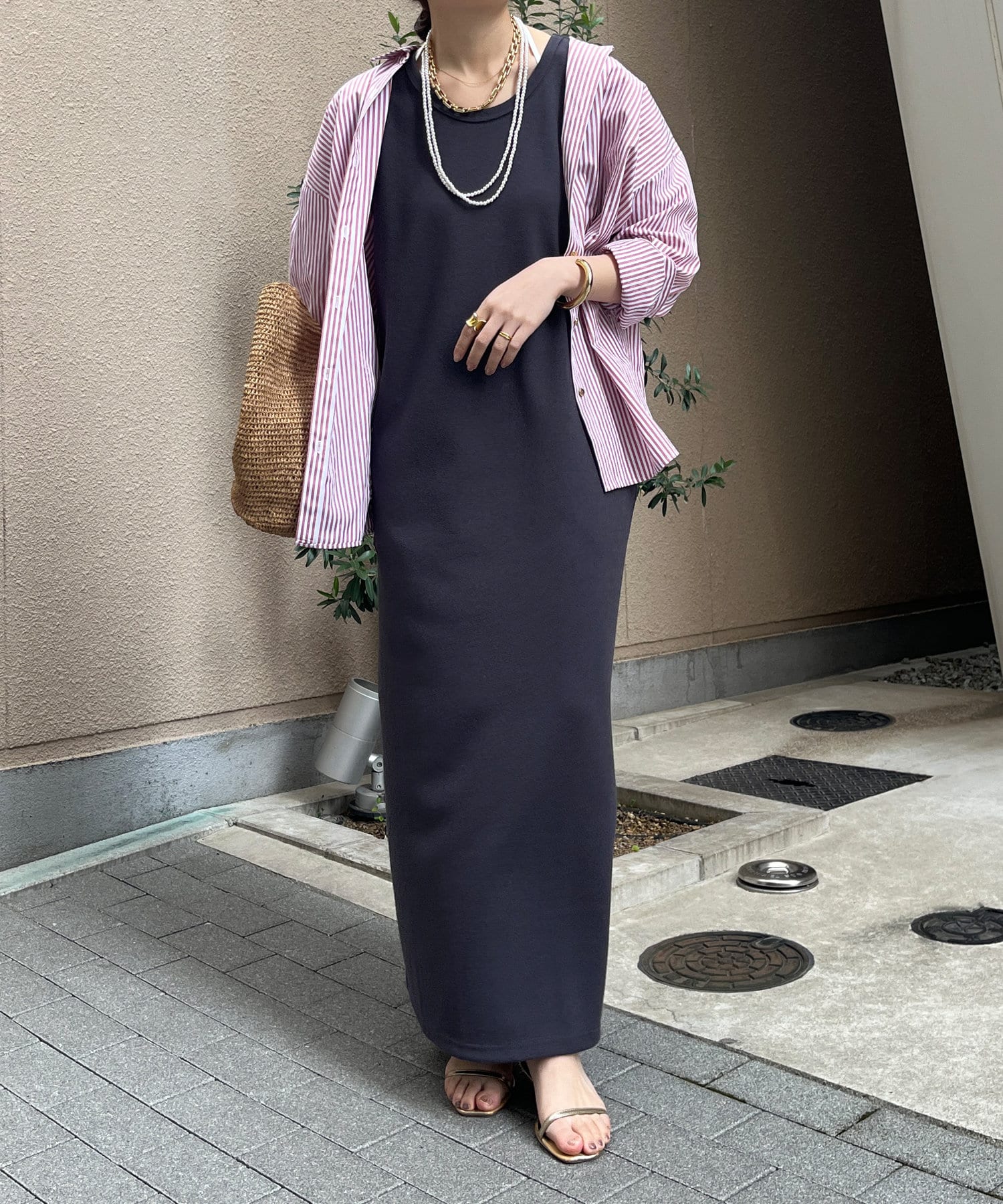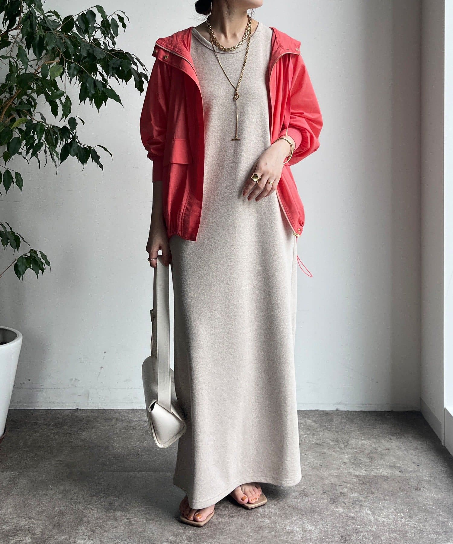 こういうワンピはどうしてものっぺりしますがこちらは生地が厚めで、長いけど良いです。リネンやデニムのシャツと合わせたい。