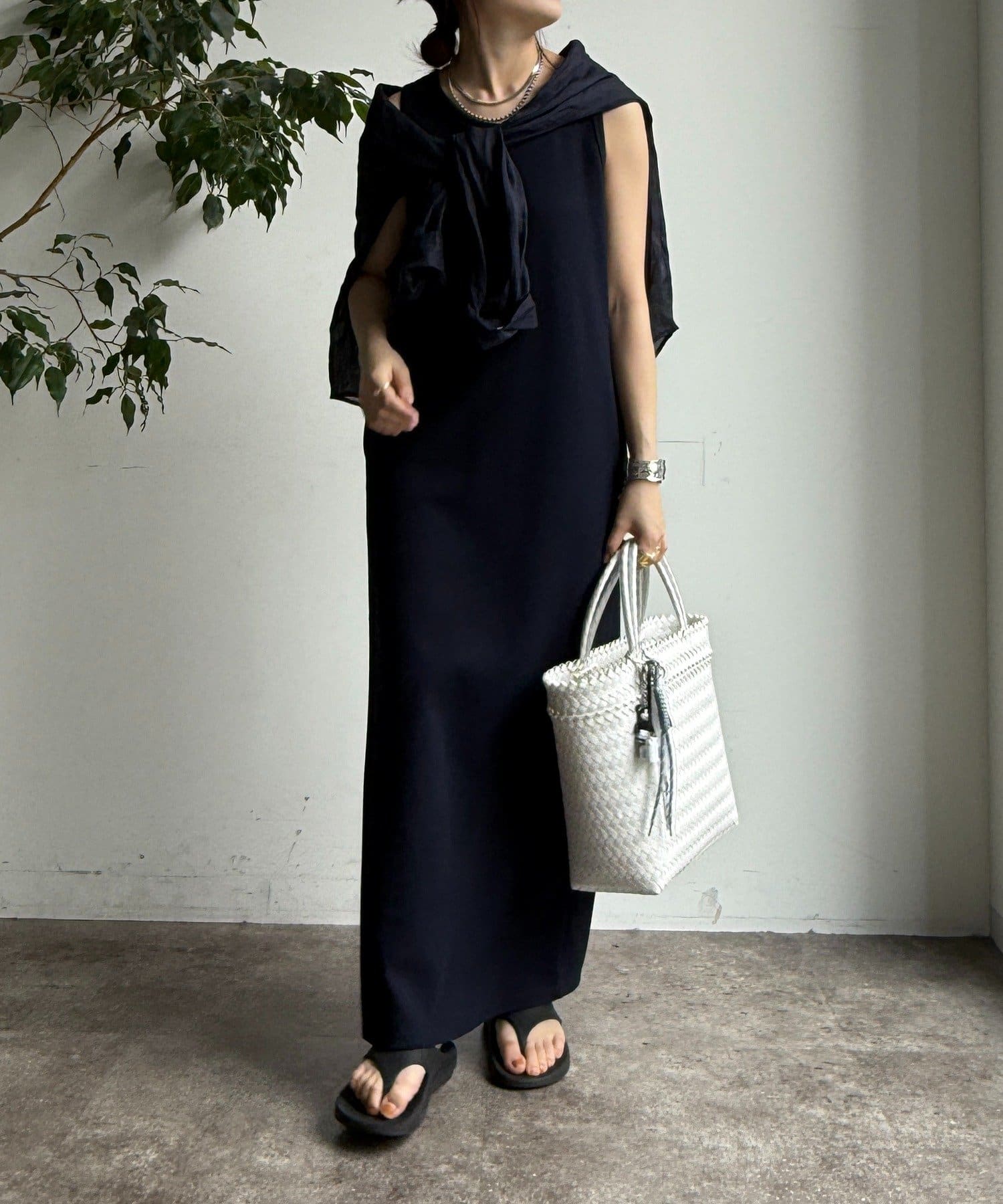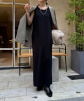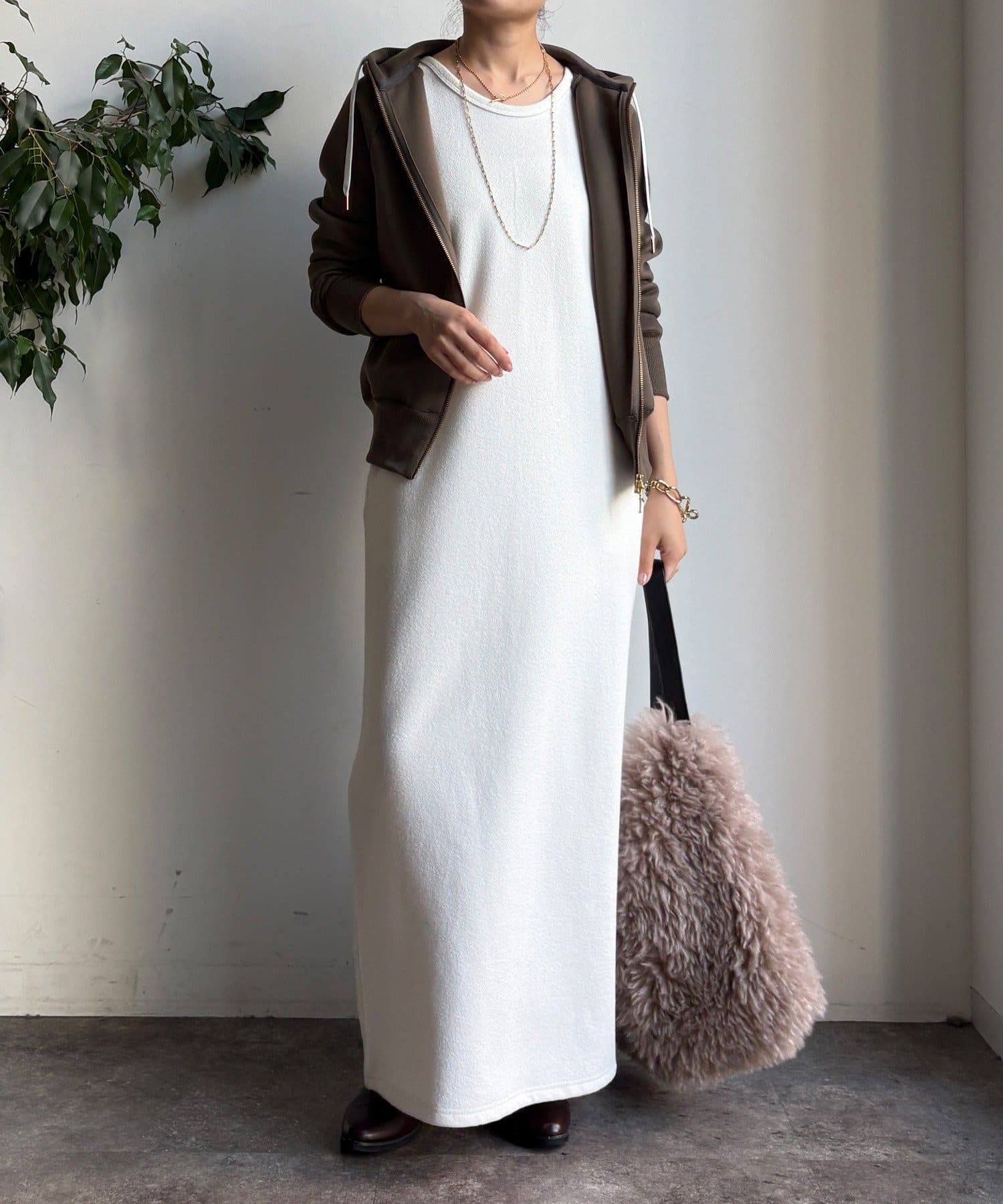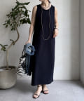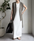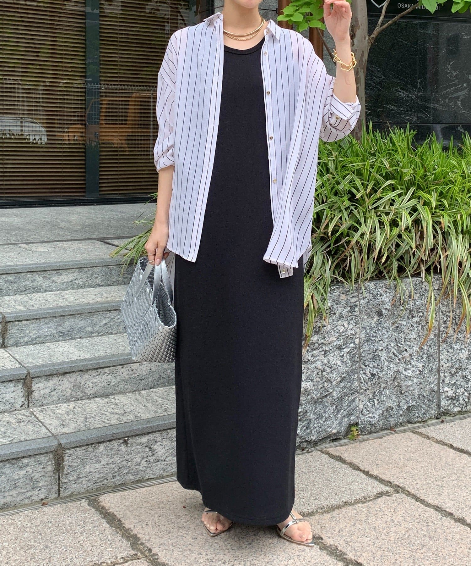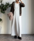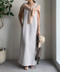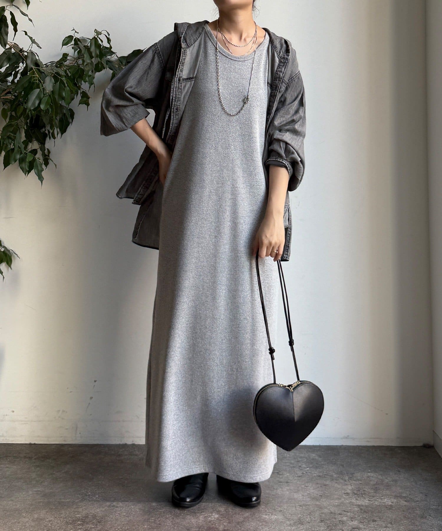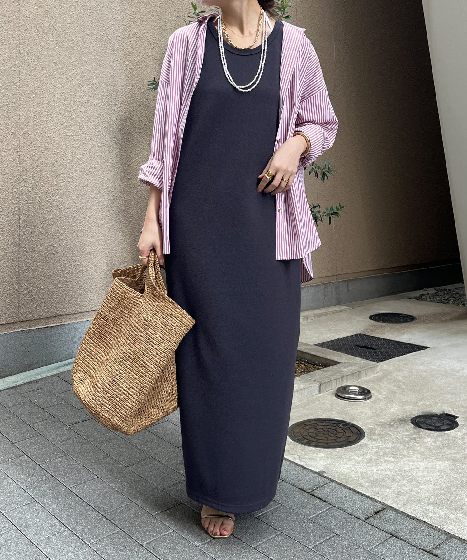 こういうワンピはどうしてものっぺりしますがこちらは生地が厚めで、長いけど良いです。リネンやデニムのシャツと合わせたい。