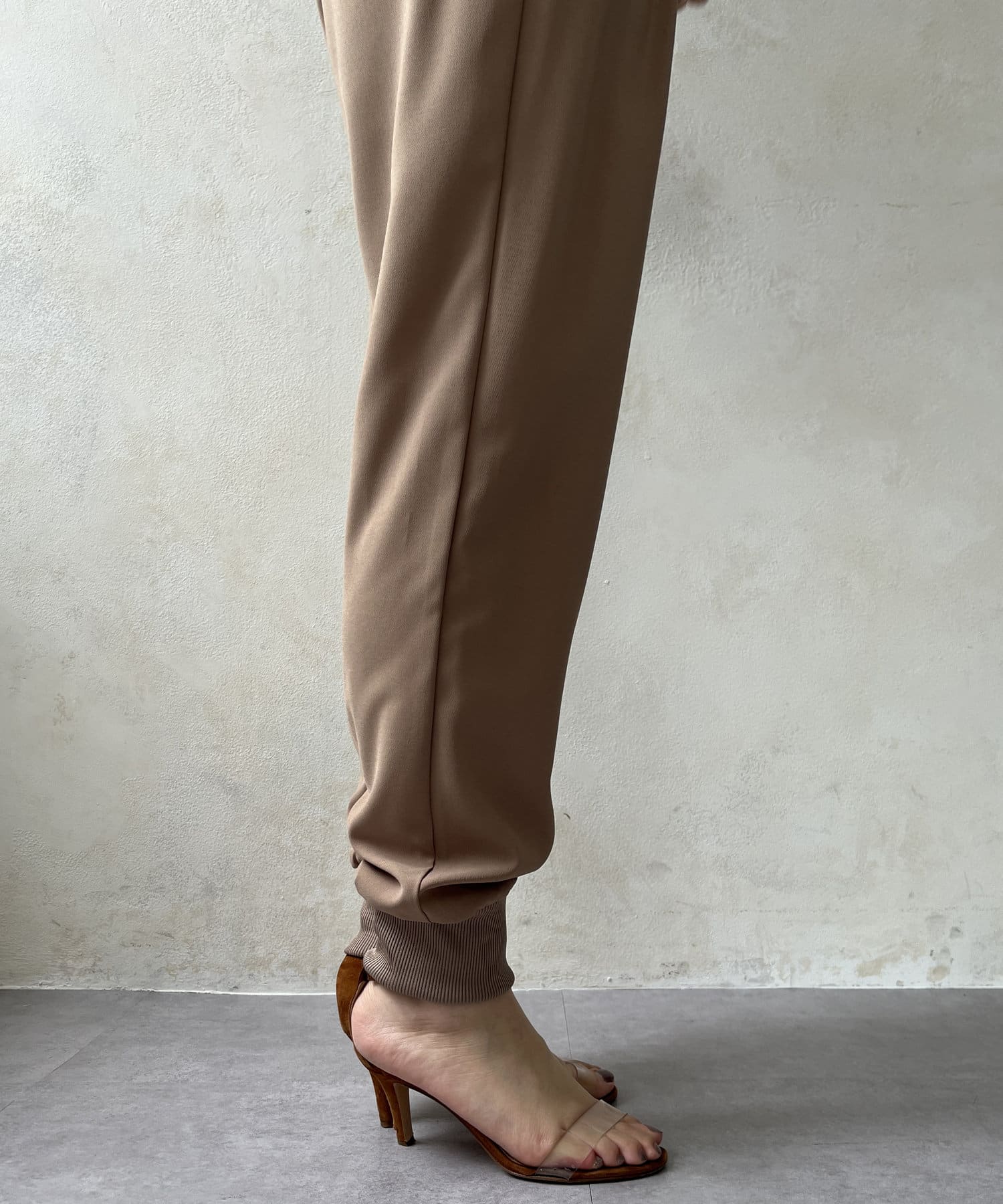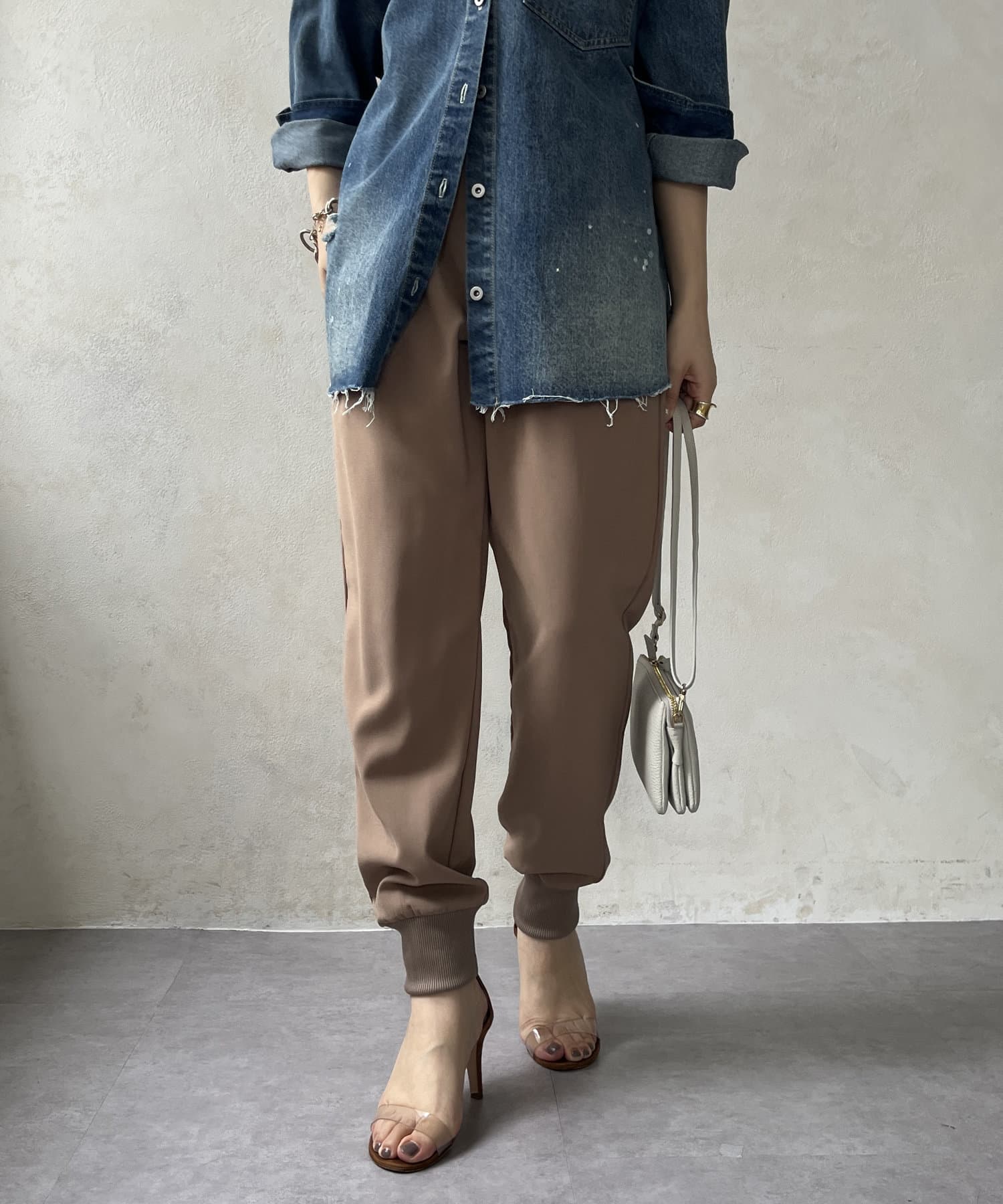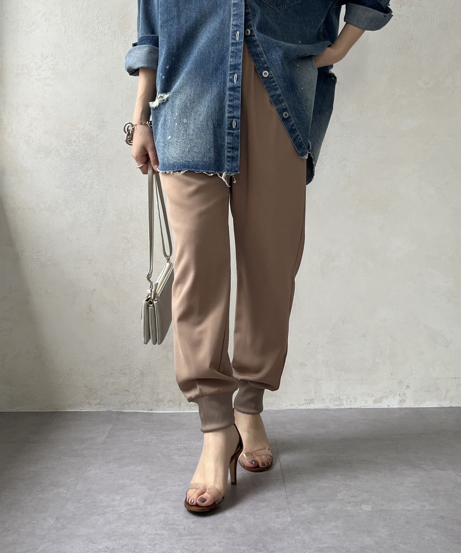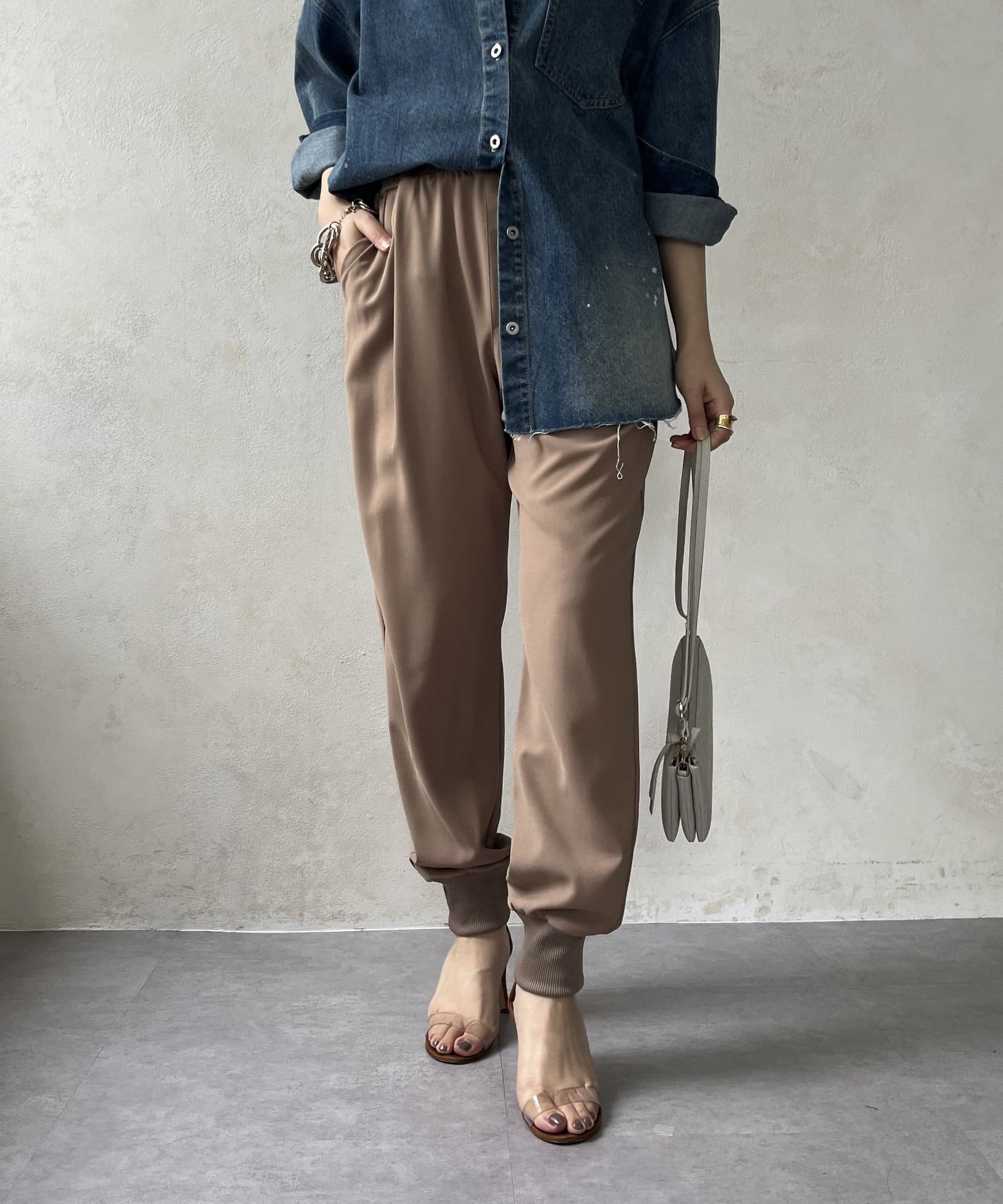 落ち感がありテロっとした素材で仕上げたジョグパンツは、楽なのにおしゃれな印象を与えてくれるトレンドシルエット。