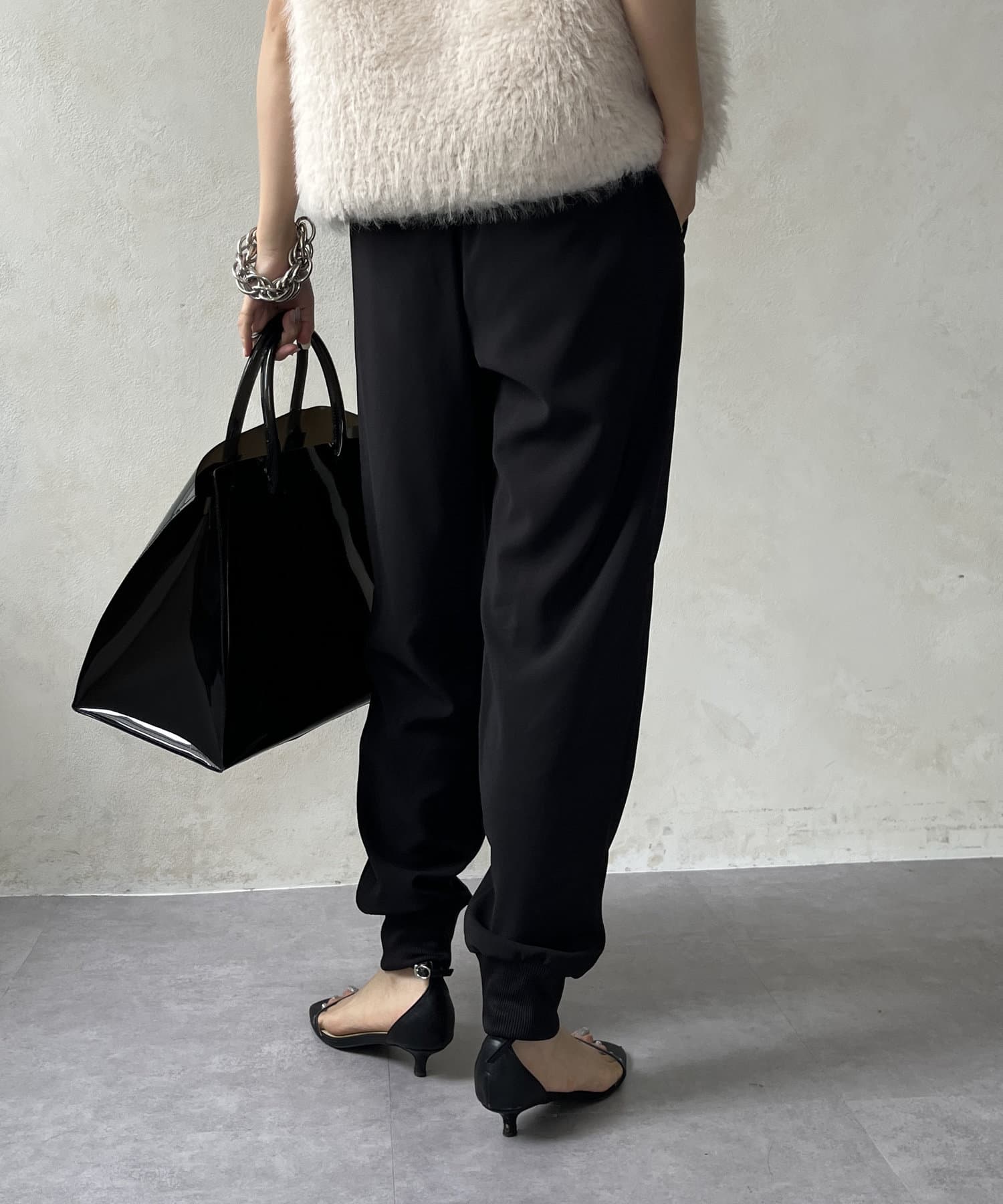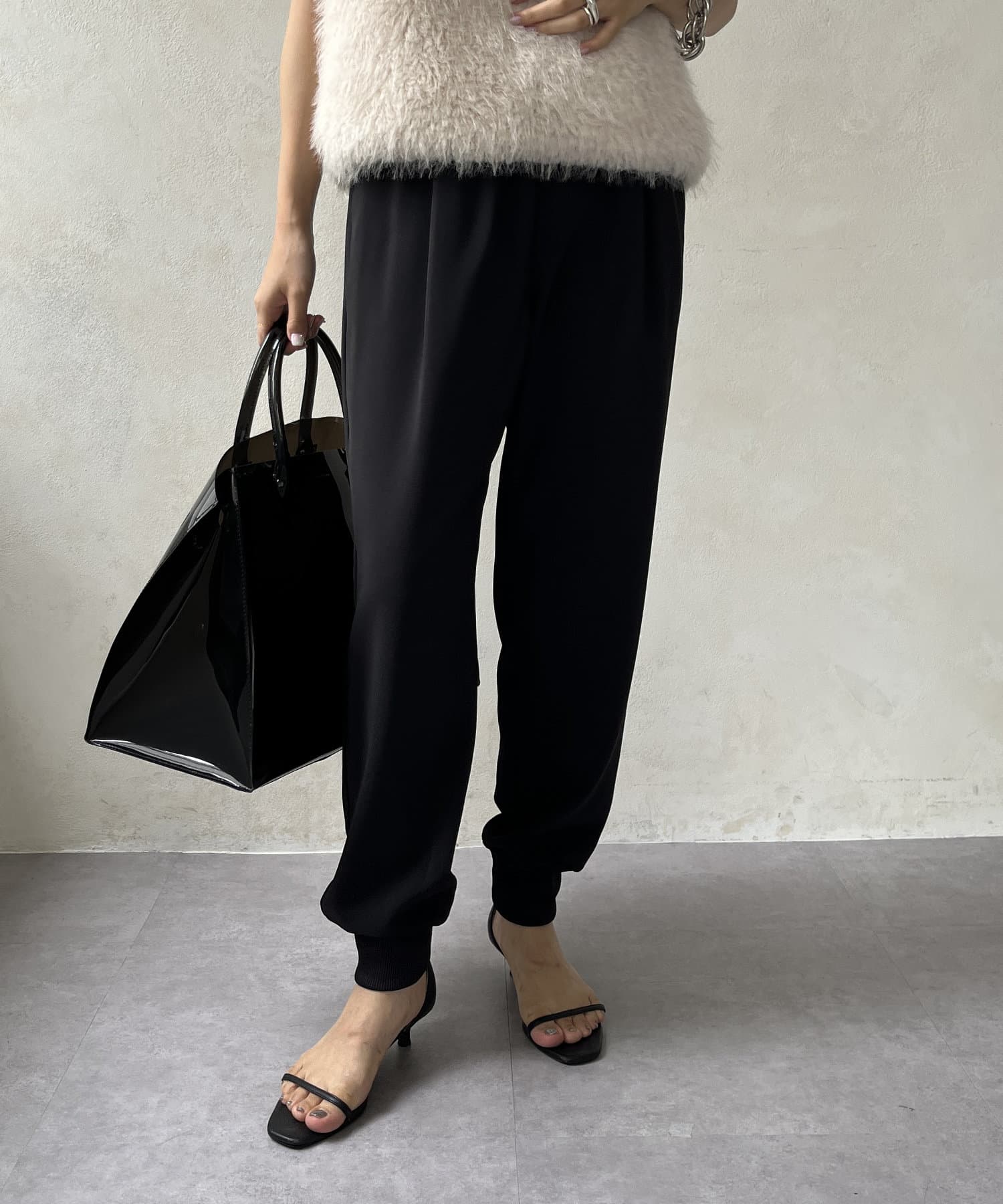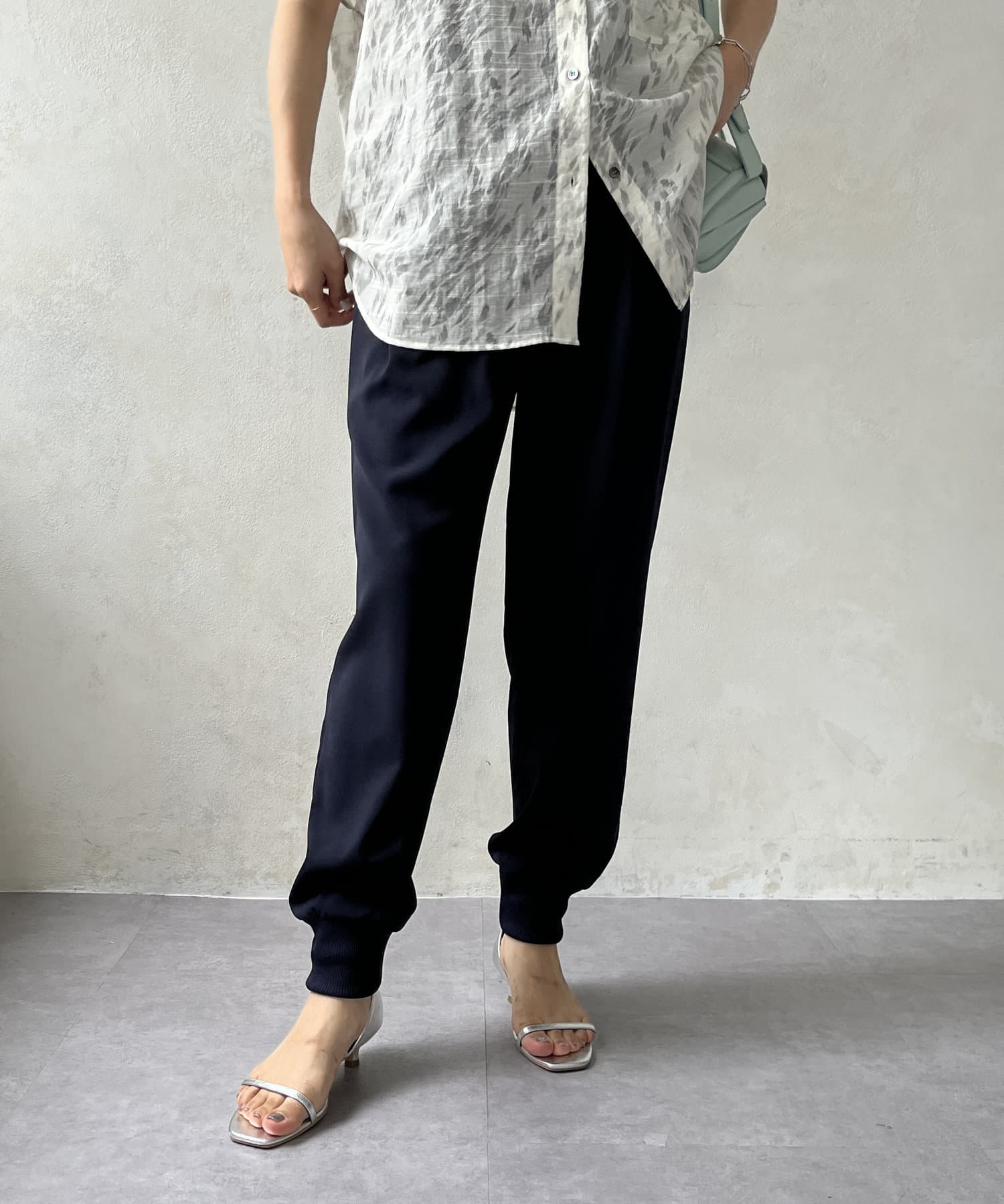 落ち感がありテロっとした素材で仕上げたジョグパンツは、楽なのにおしゃれな印象を与えてくれるトレンドシルエット。