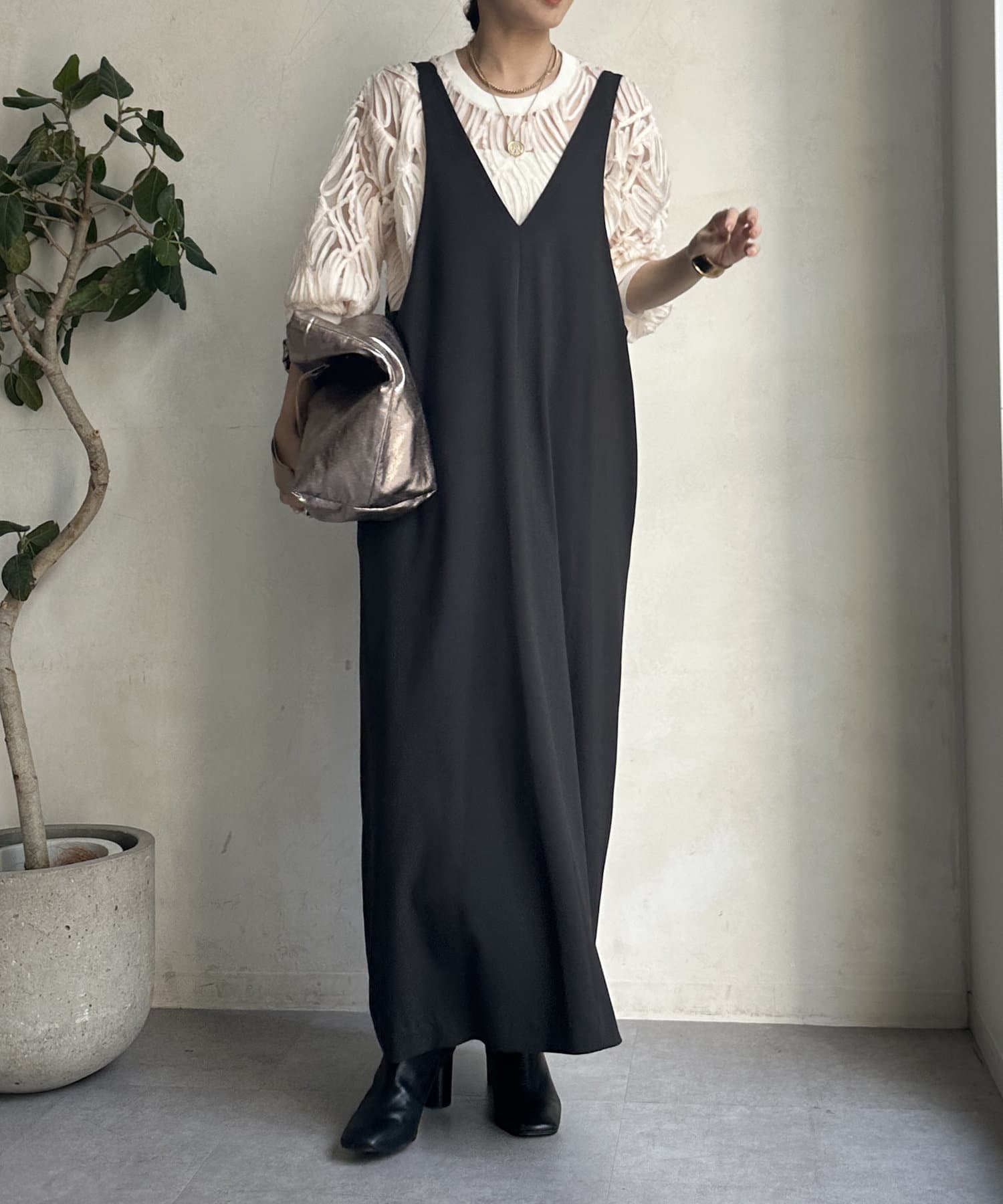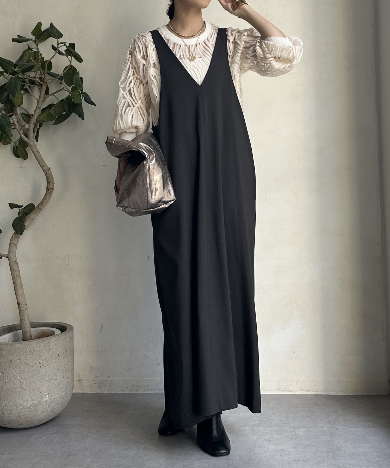 深めのVネックデザインがポイントのワンピース。