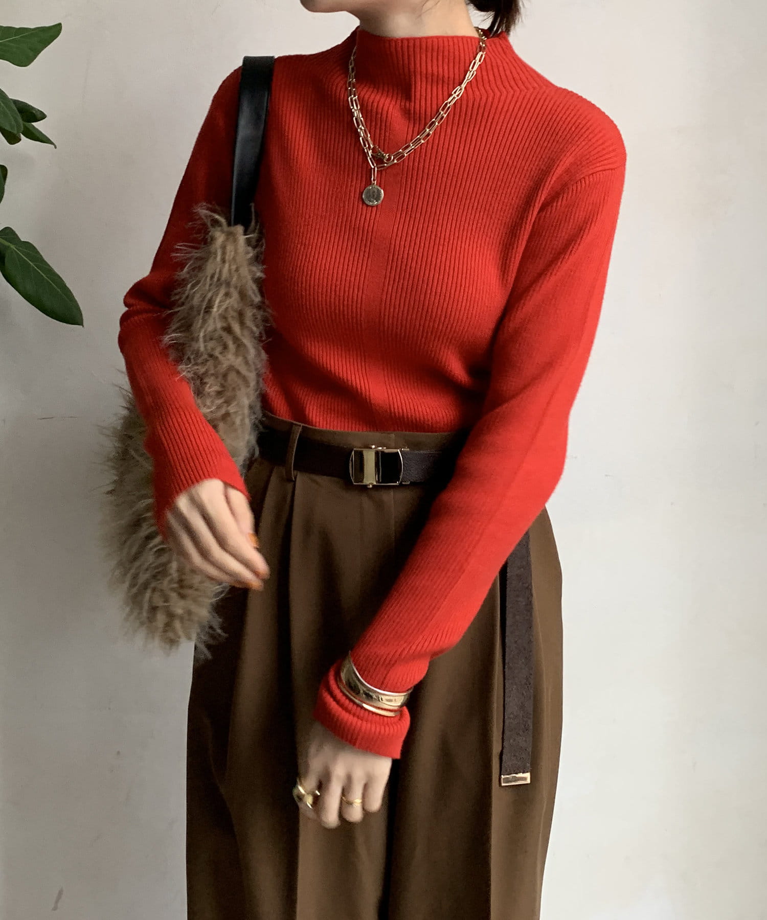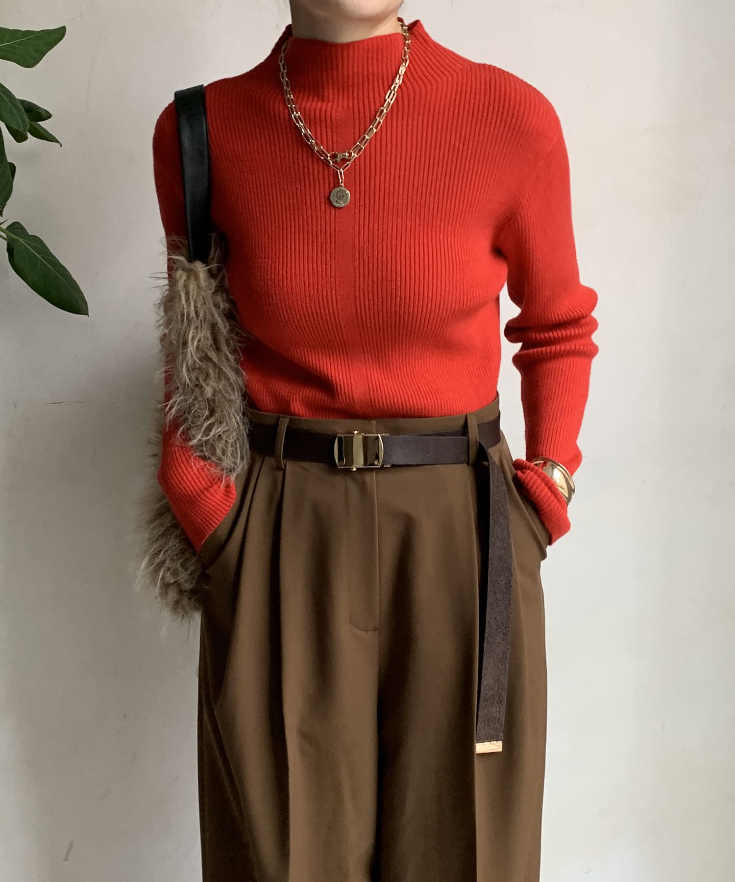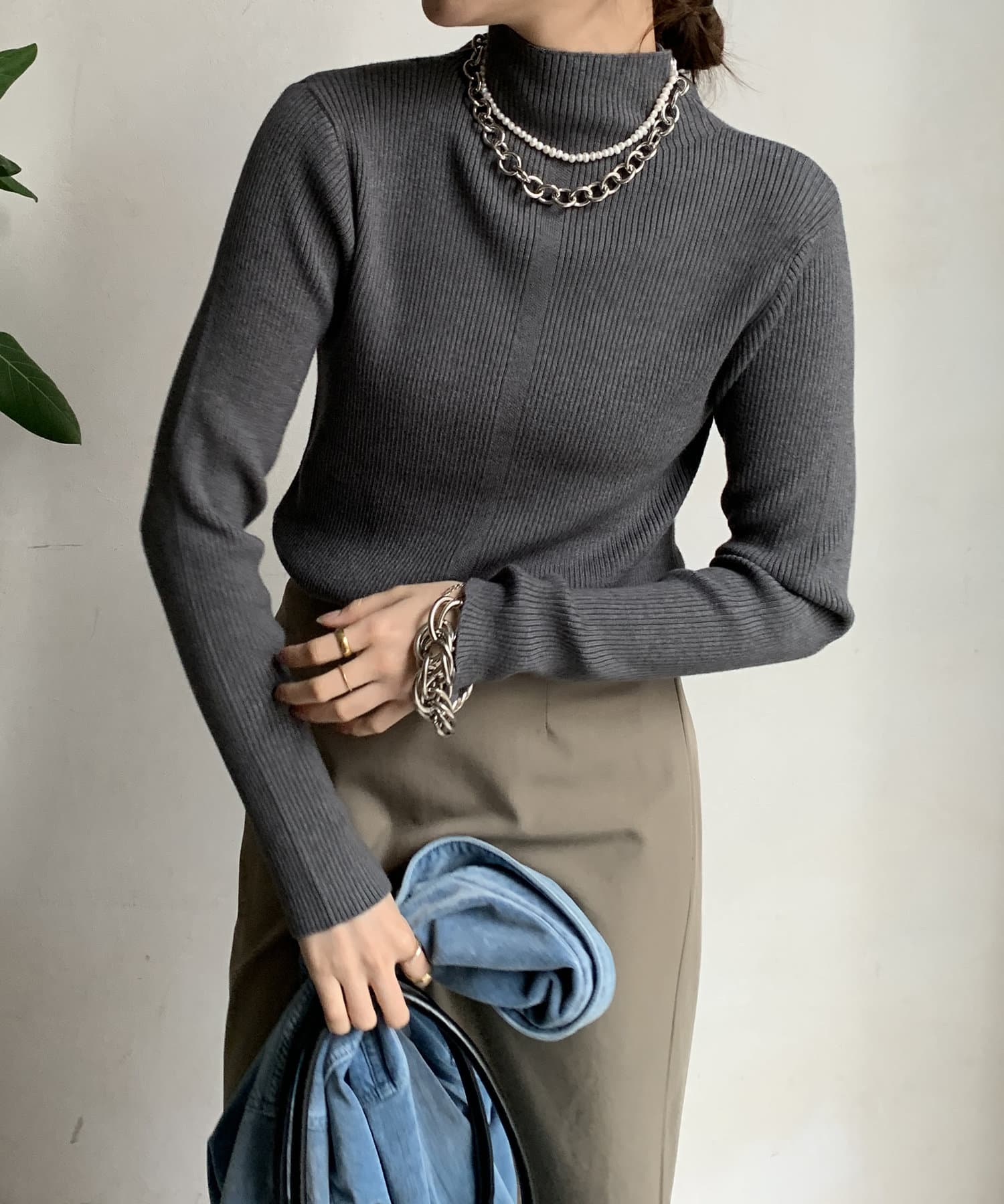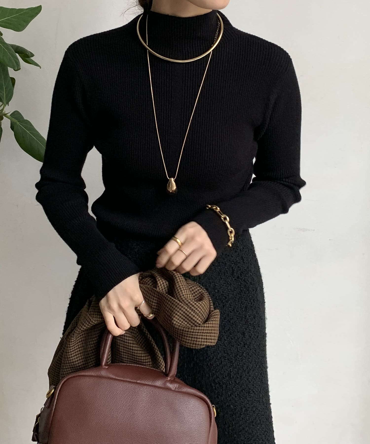ネック部分を高くしすぎないことで、すっきりと決まるリブニット。