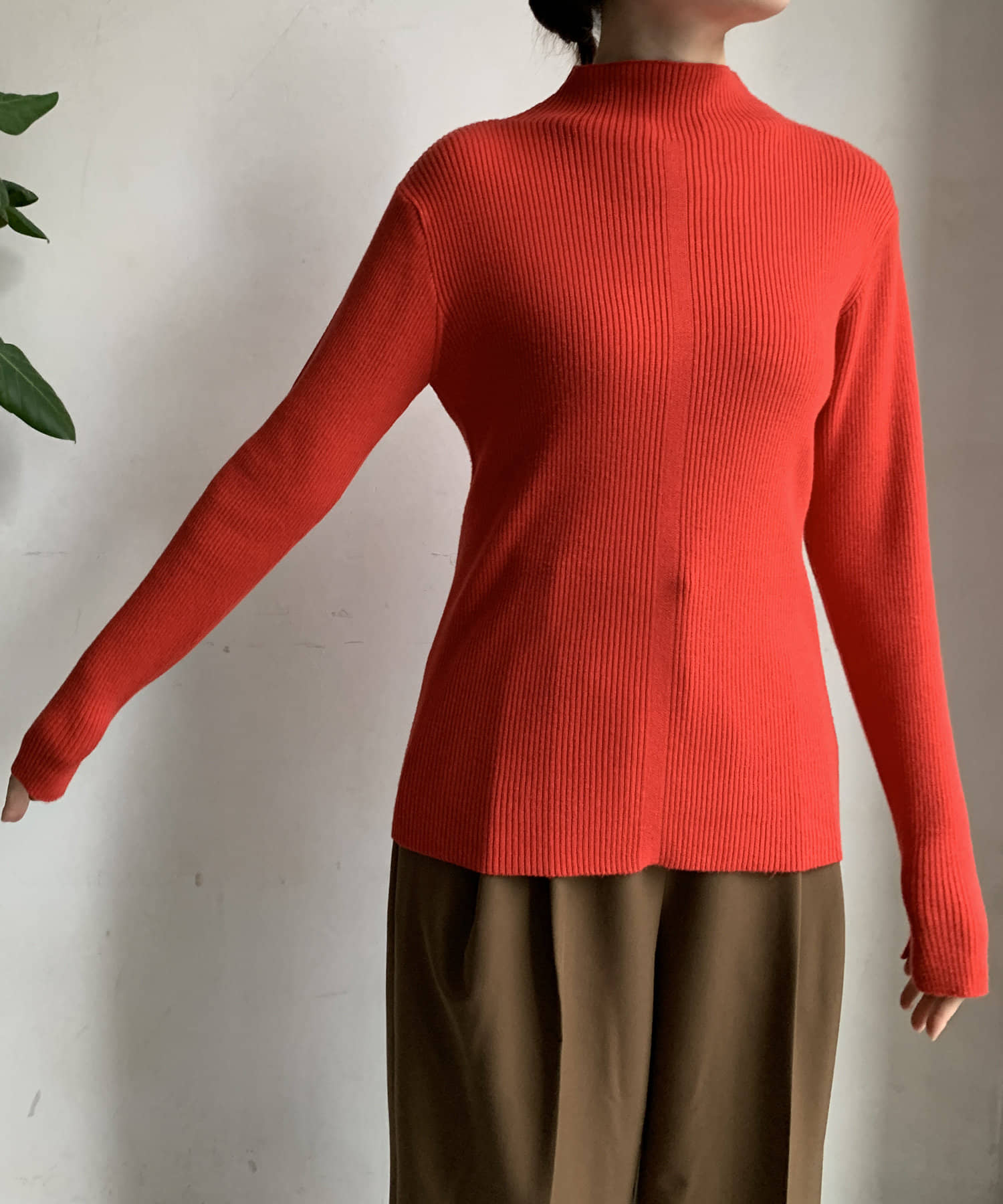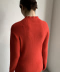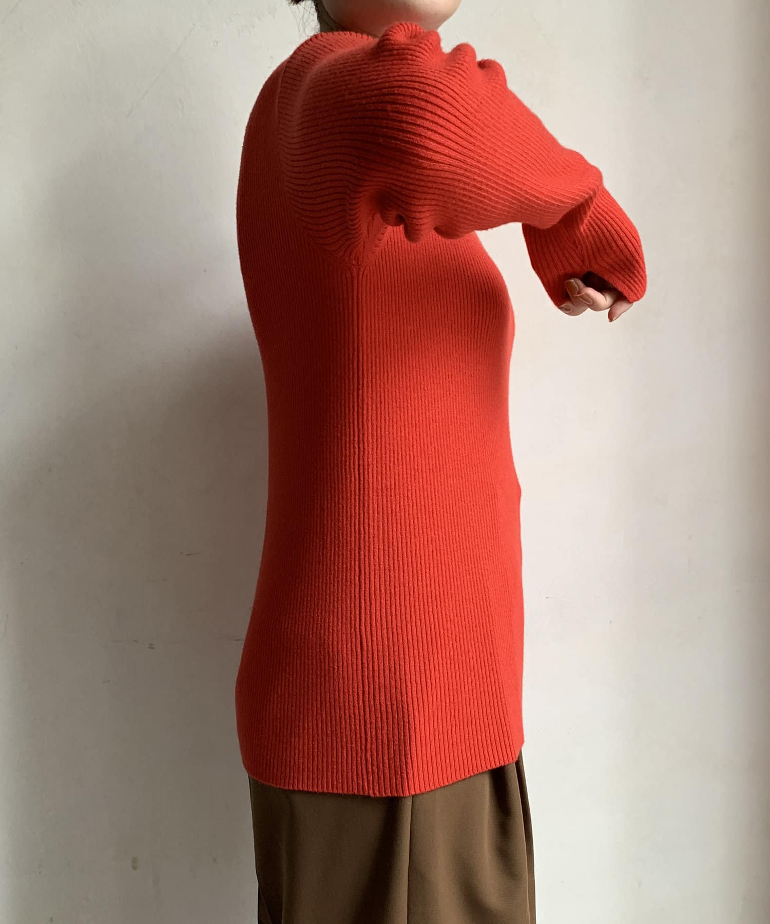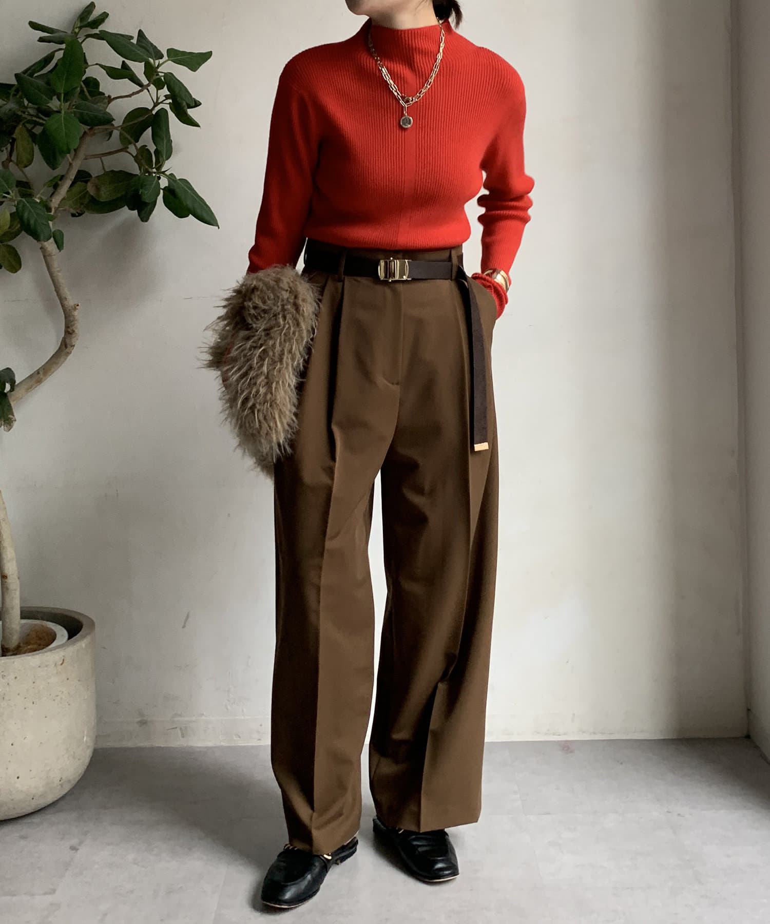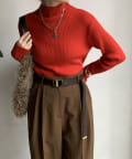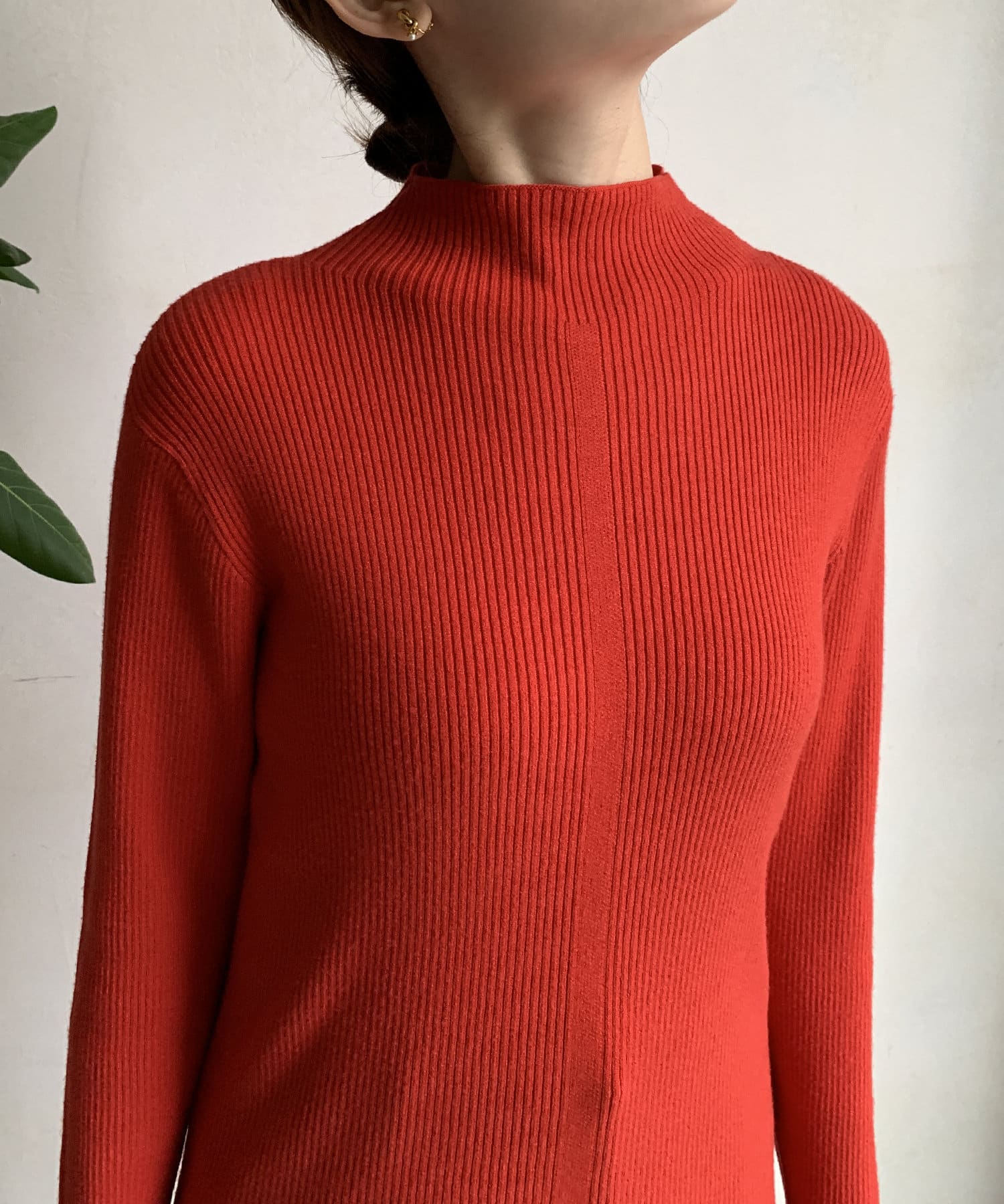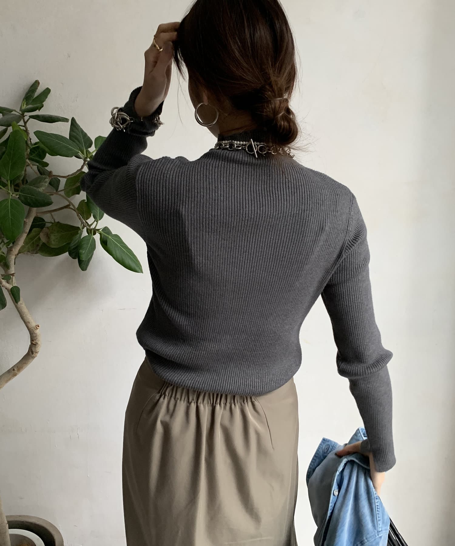 ネック部分を高くしすぎないことで、すっきりと決まるリブニット。