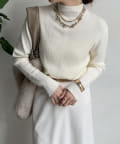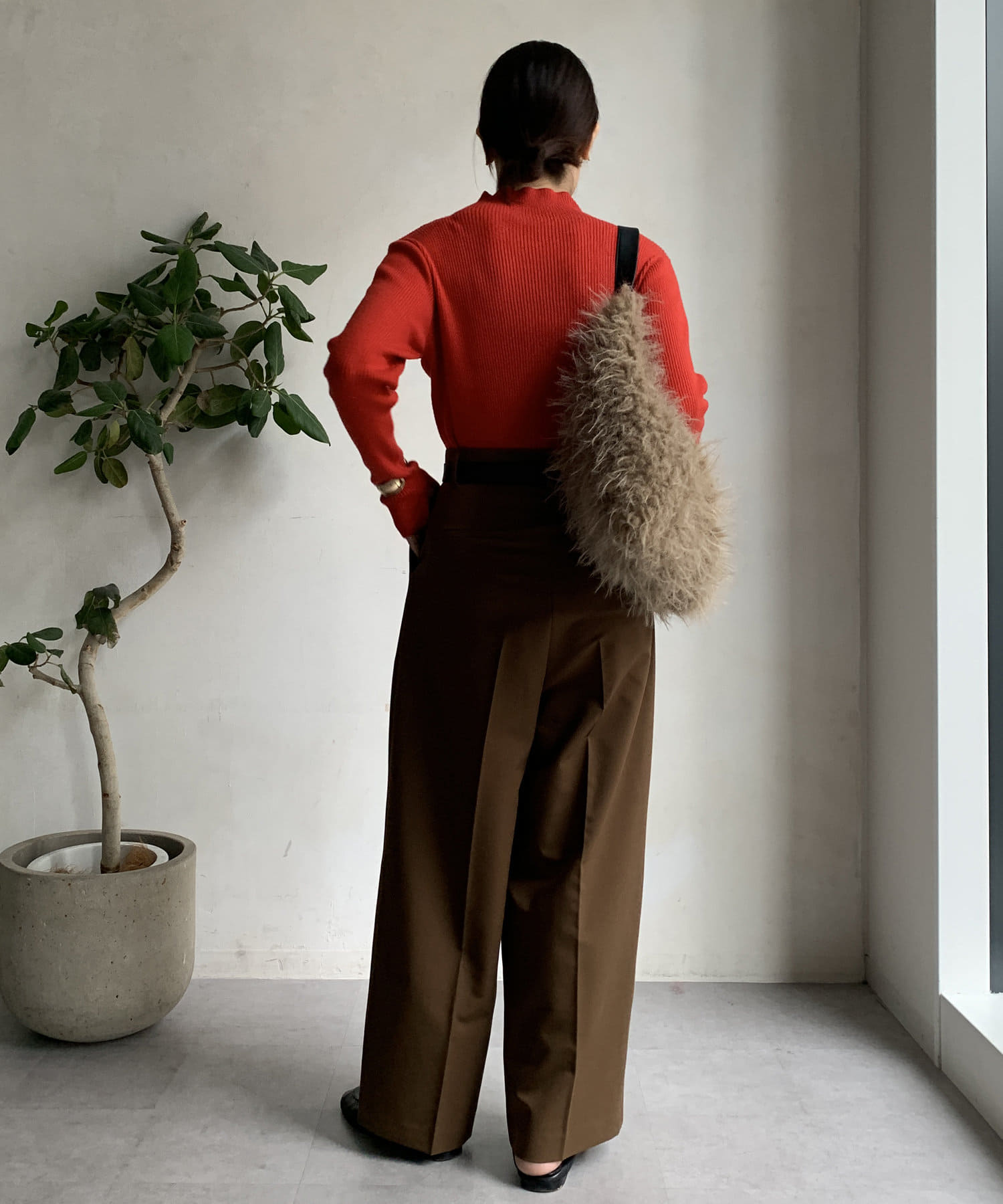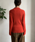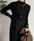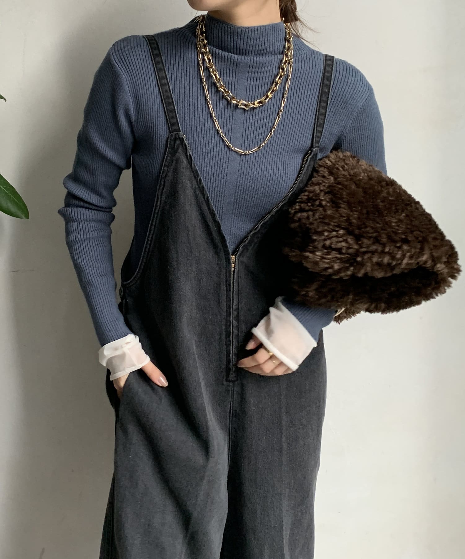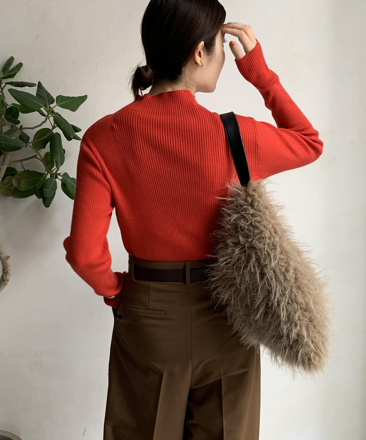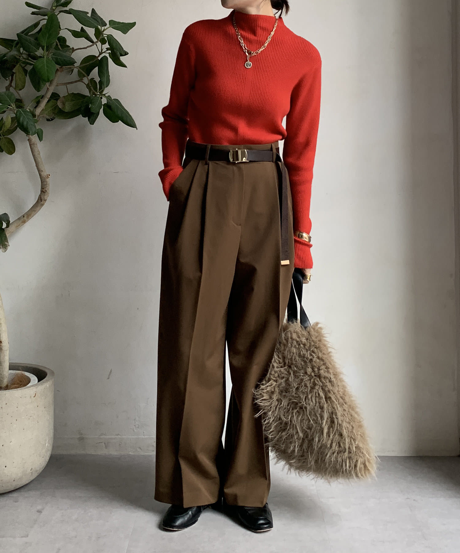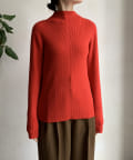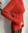 ネック部分を高くしすぎないことで、すっきりと決まるリブニット。