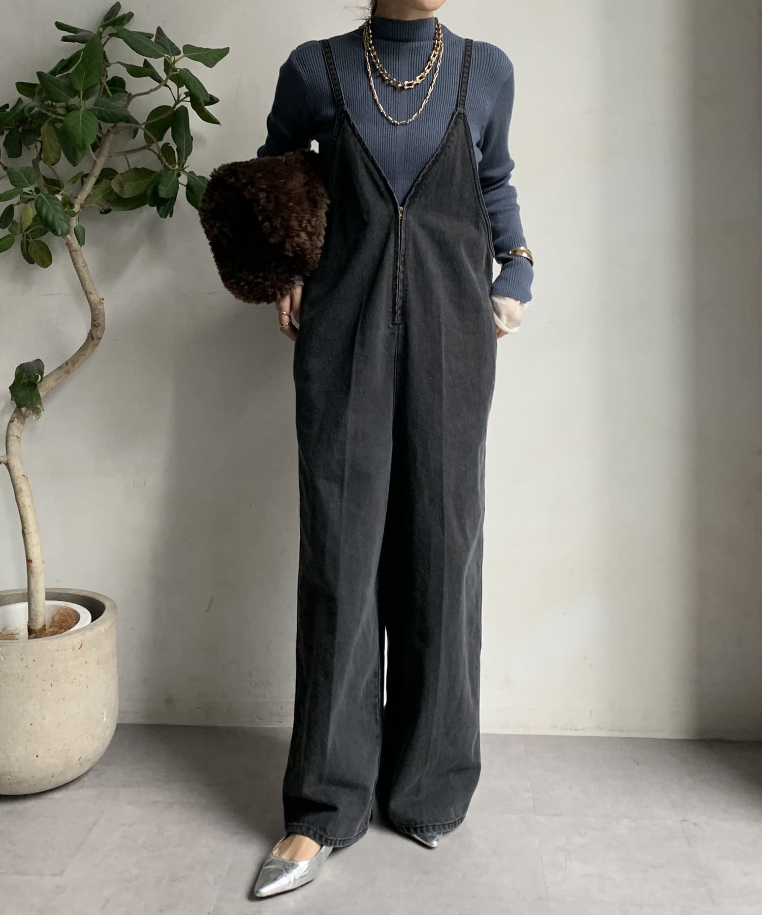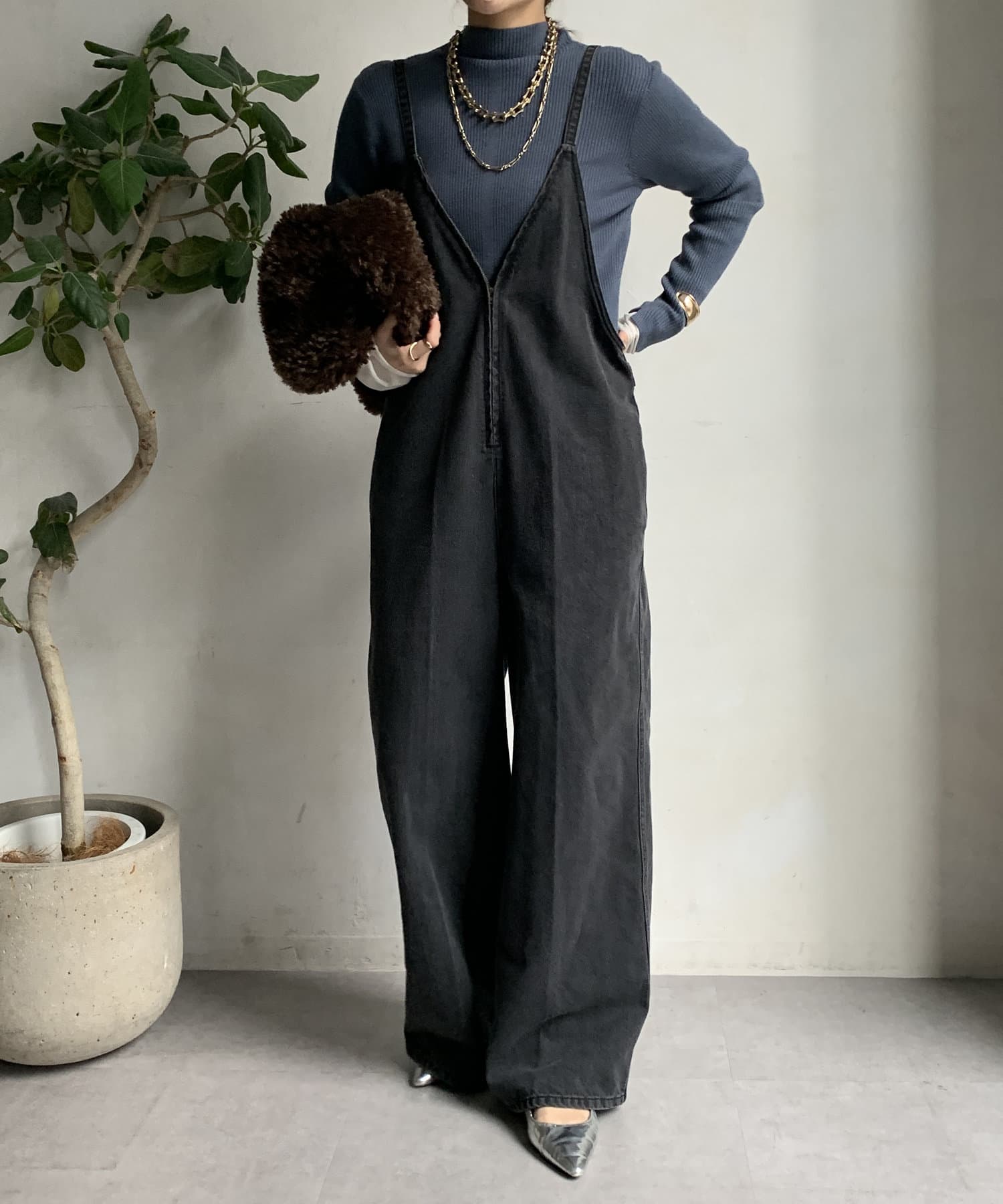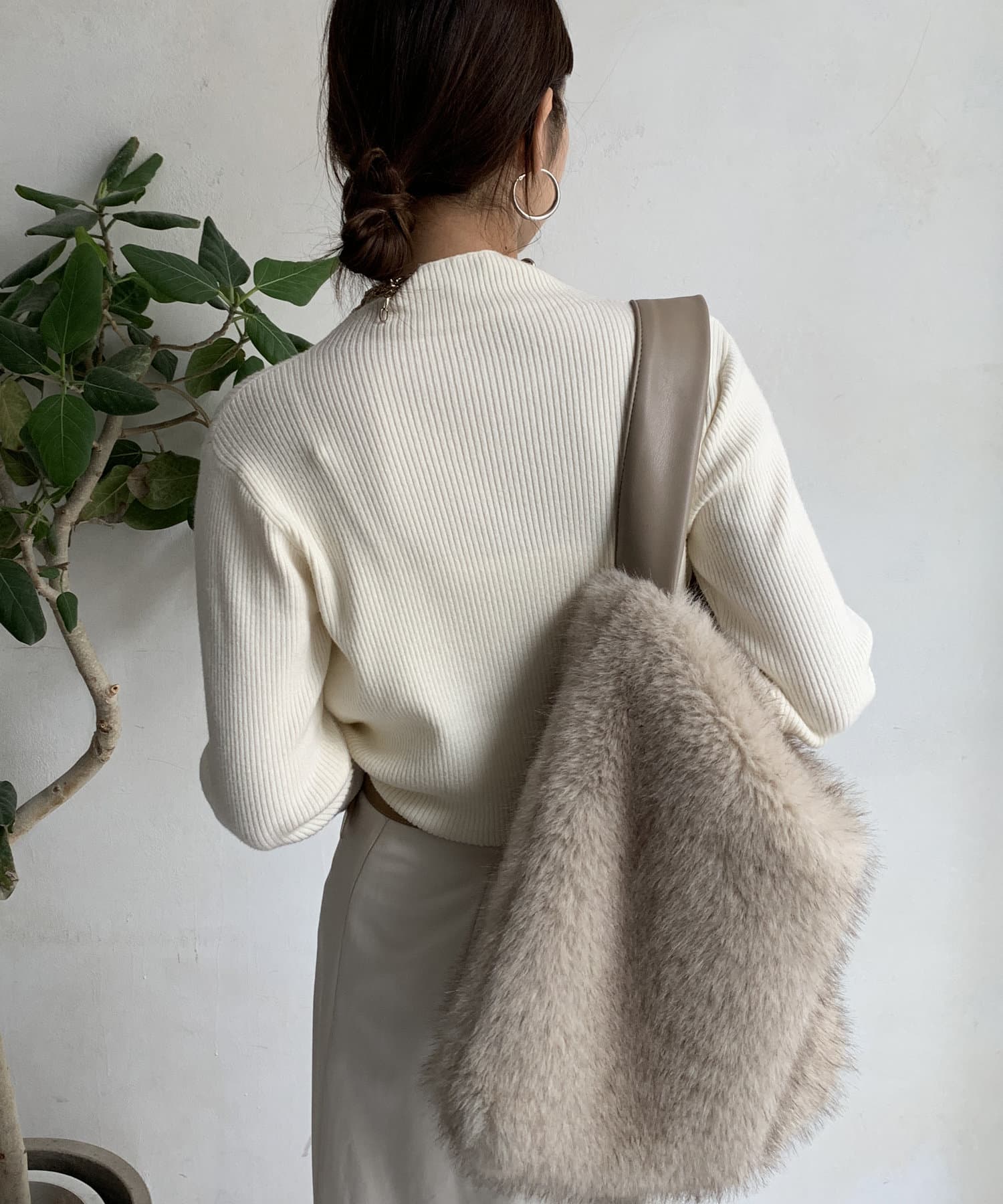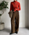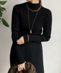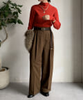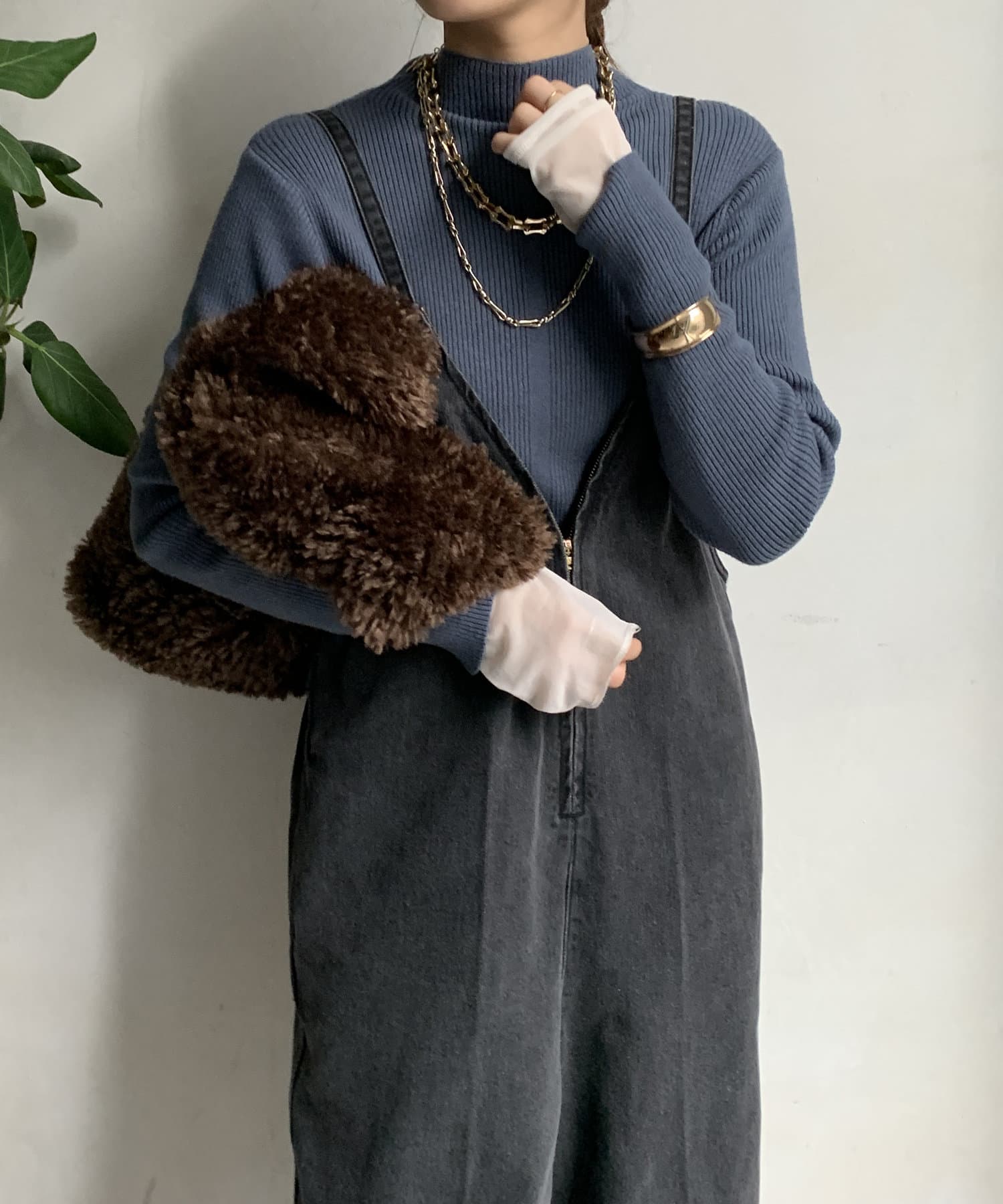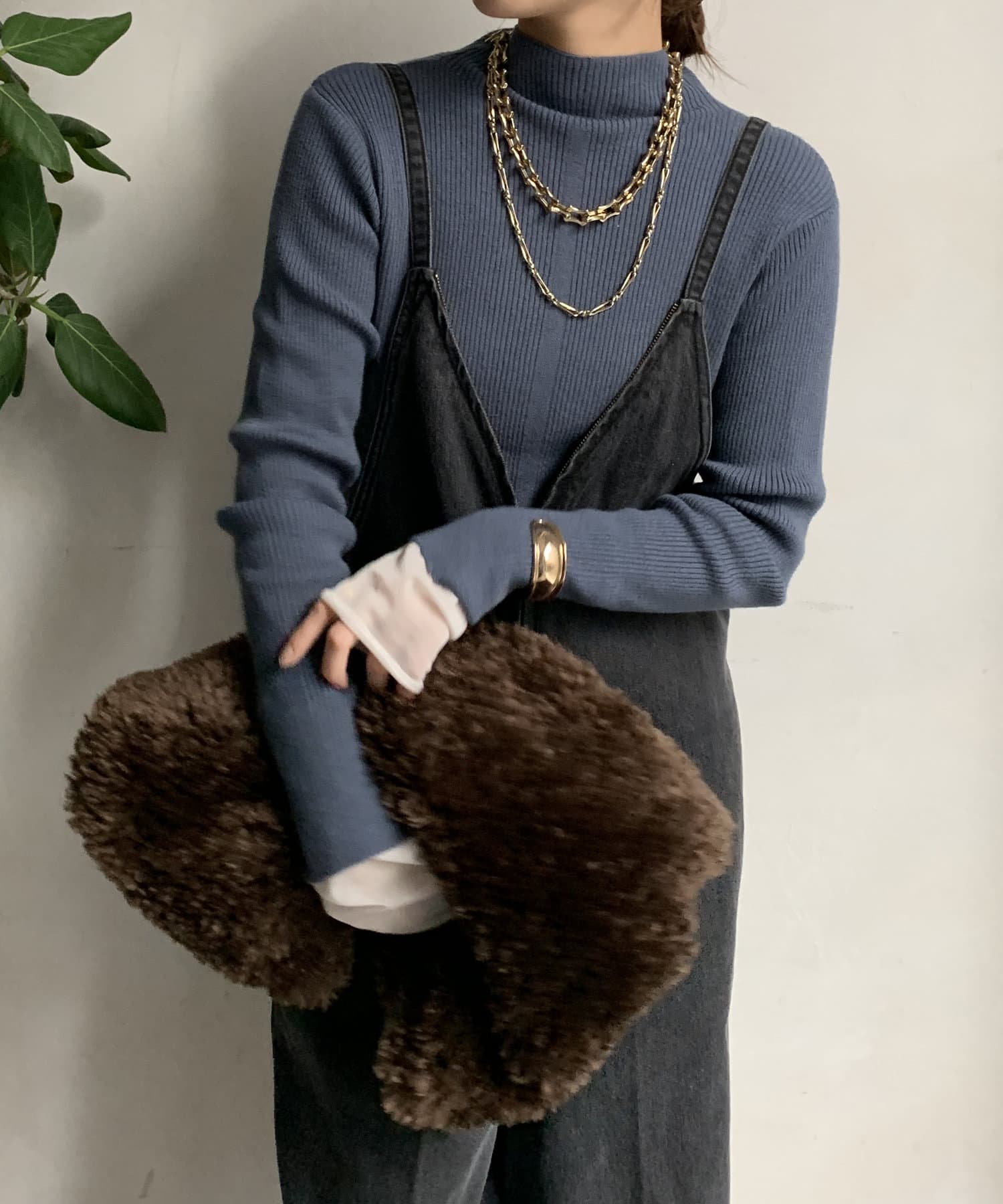 ネック部分を高くしすぎないことで、すっきりと決まるリブニット。