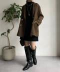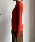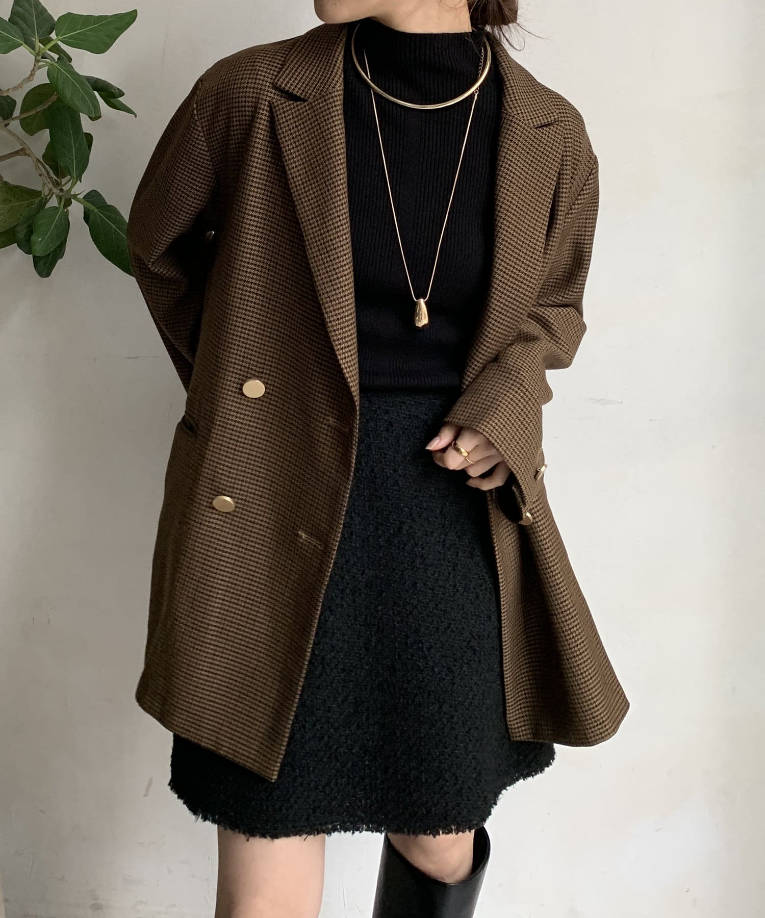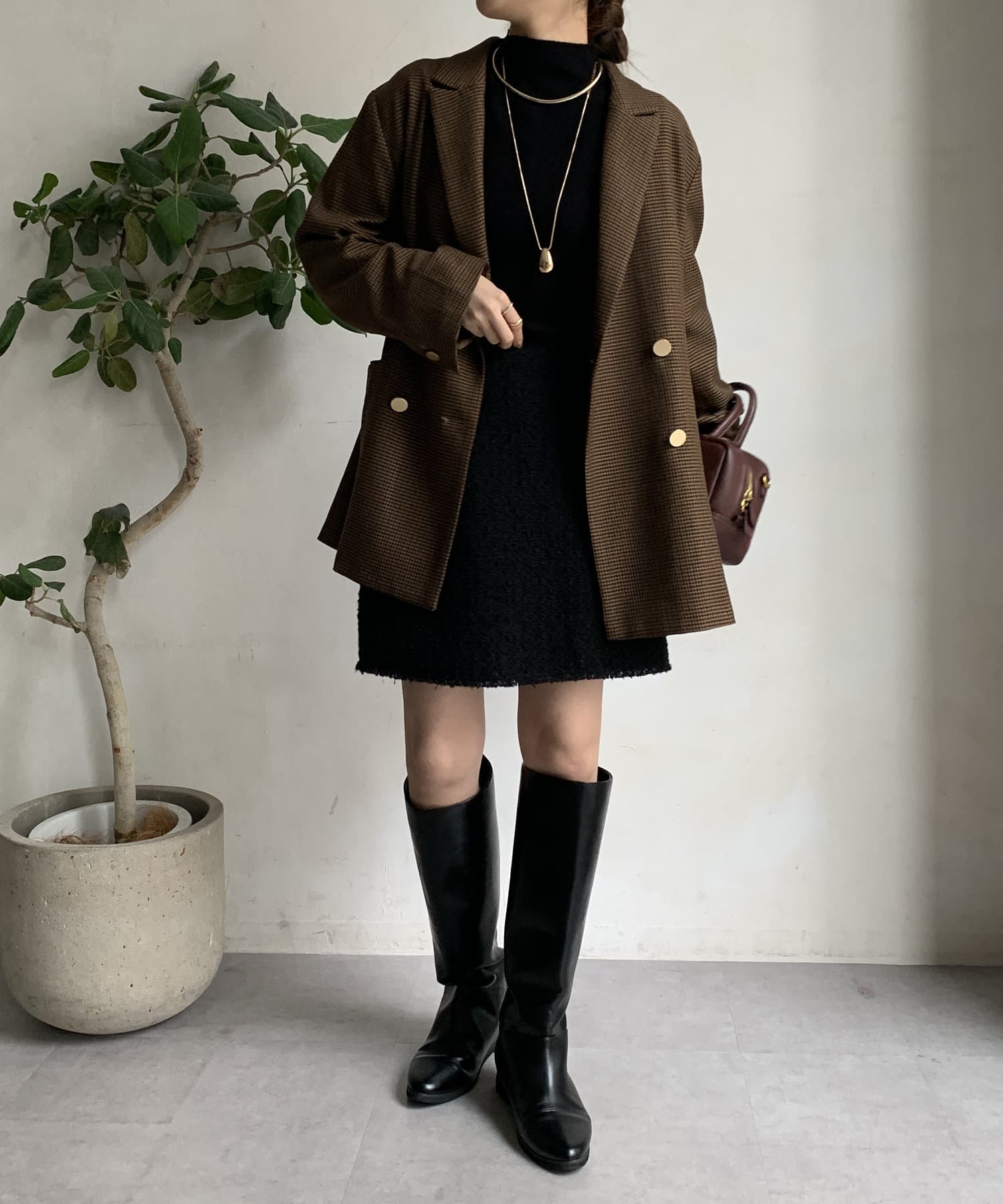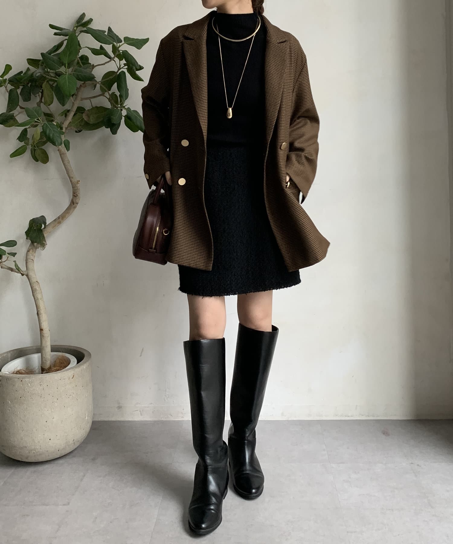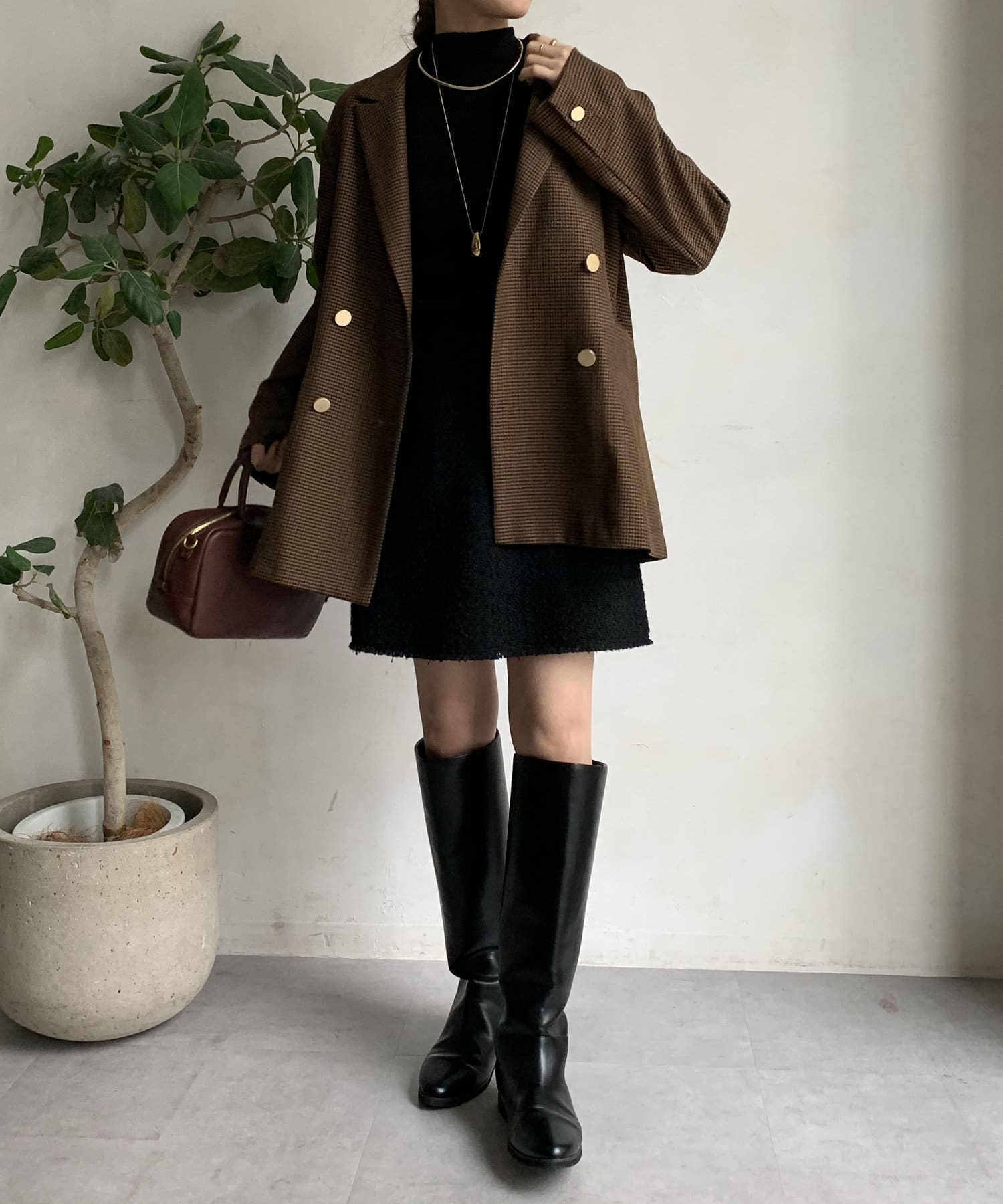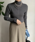 ネック部分を高くしすぎないことで、すっきりと決まるリブニット。