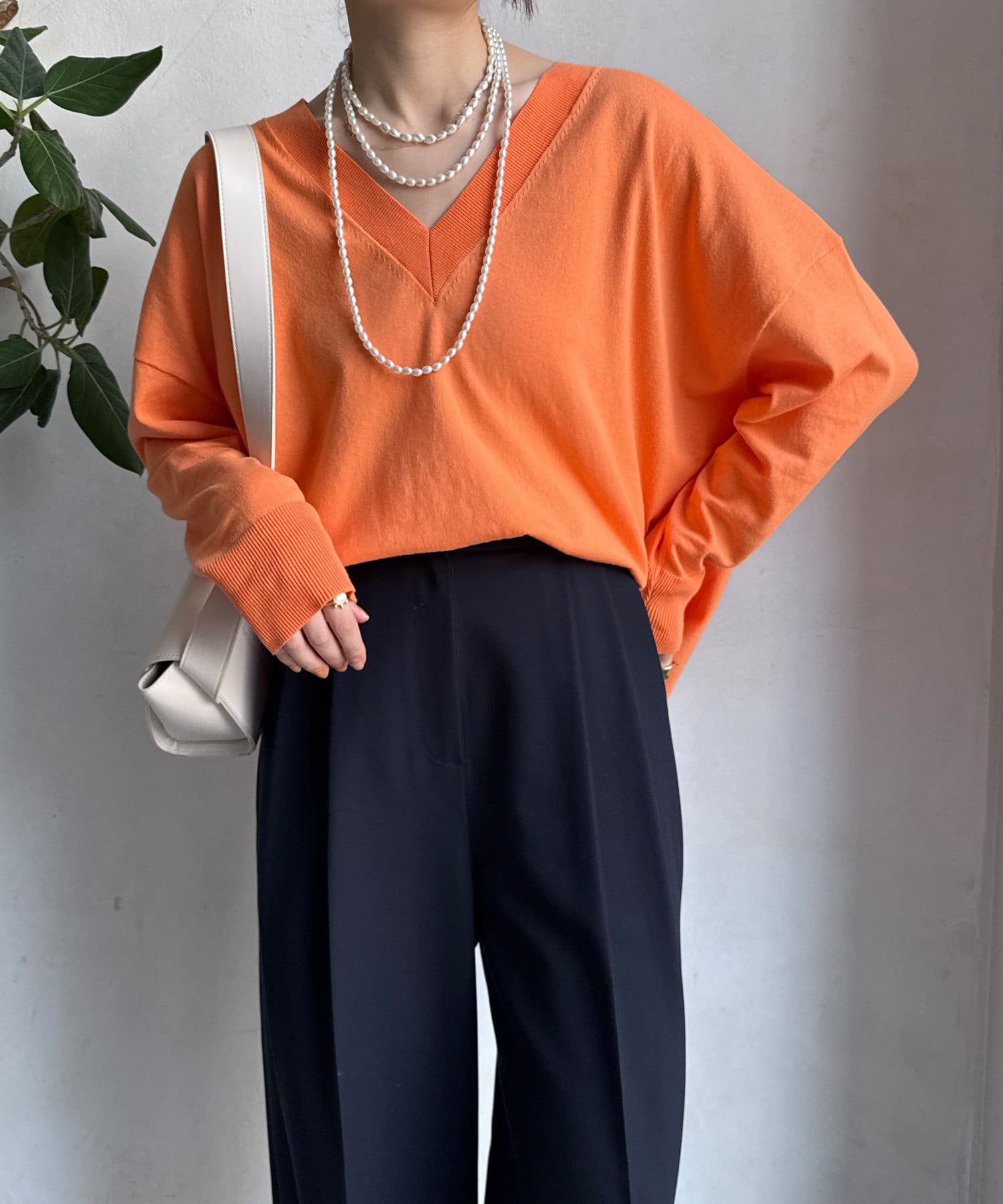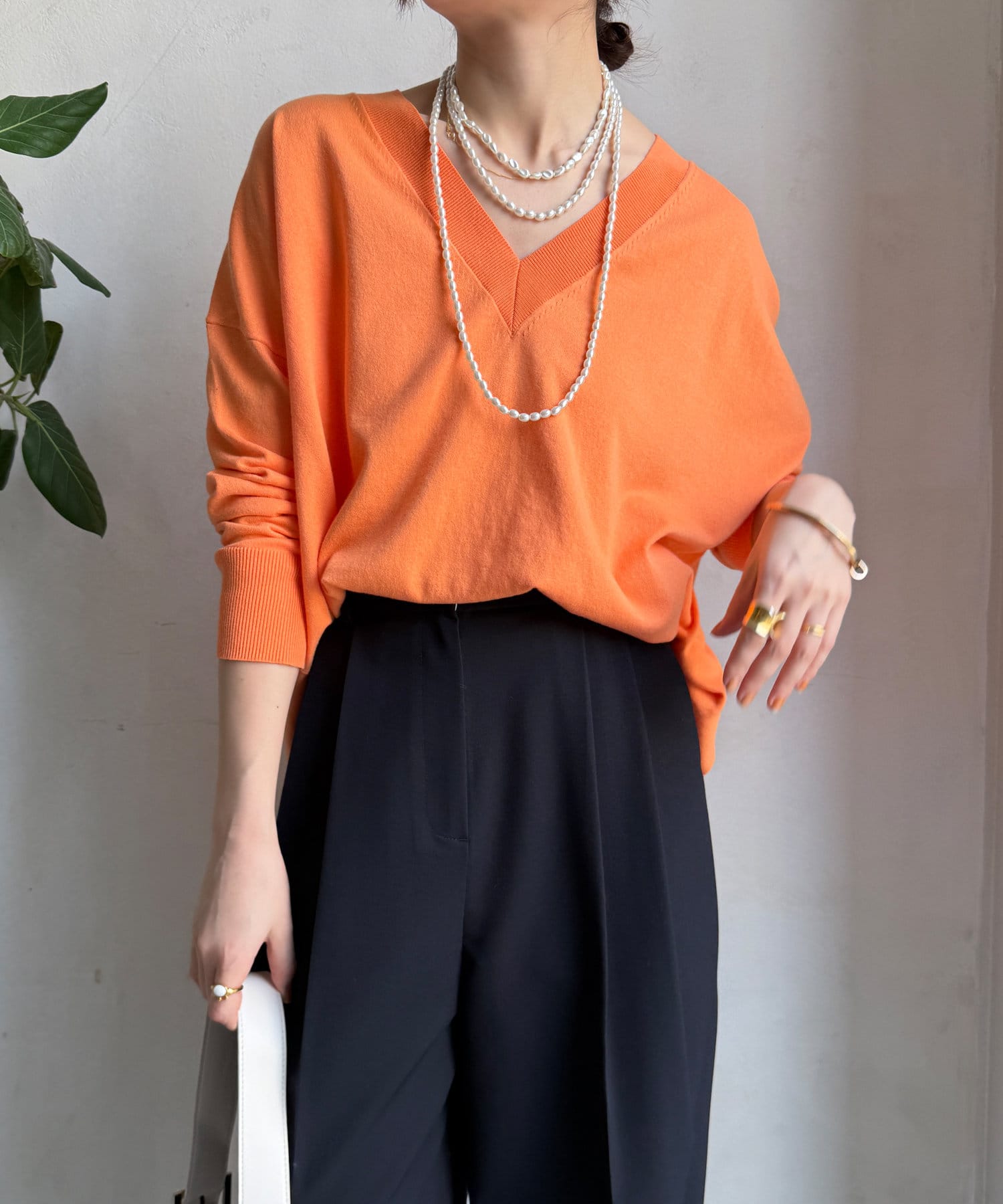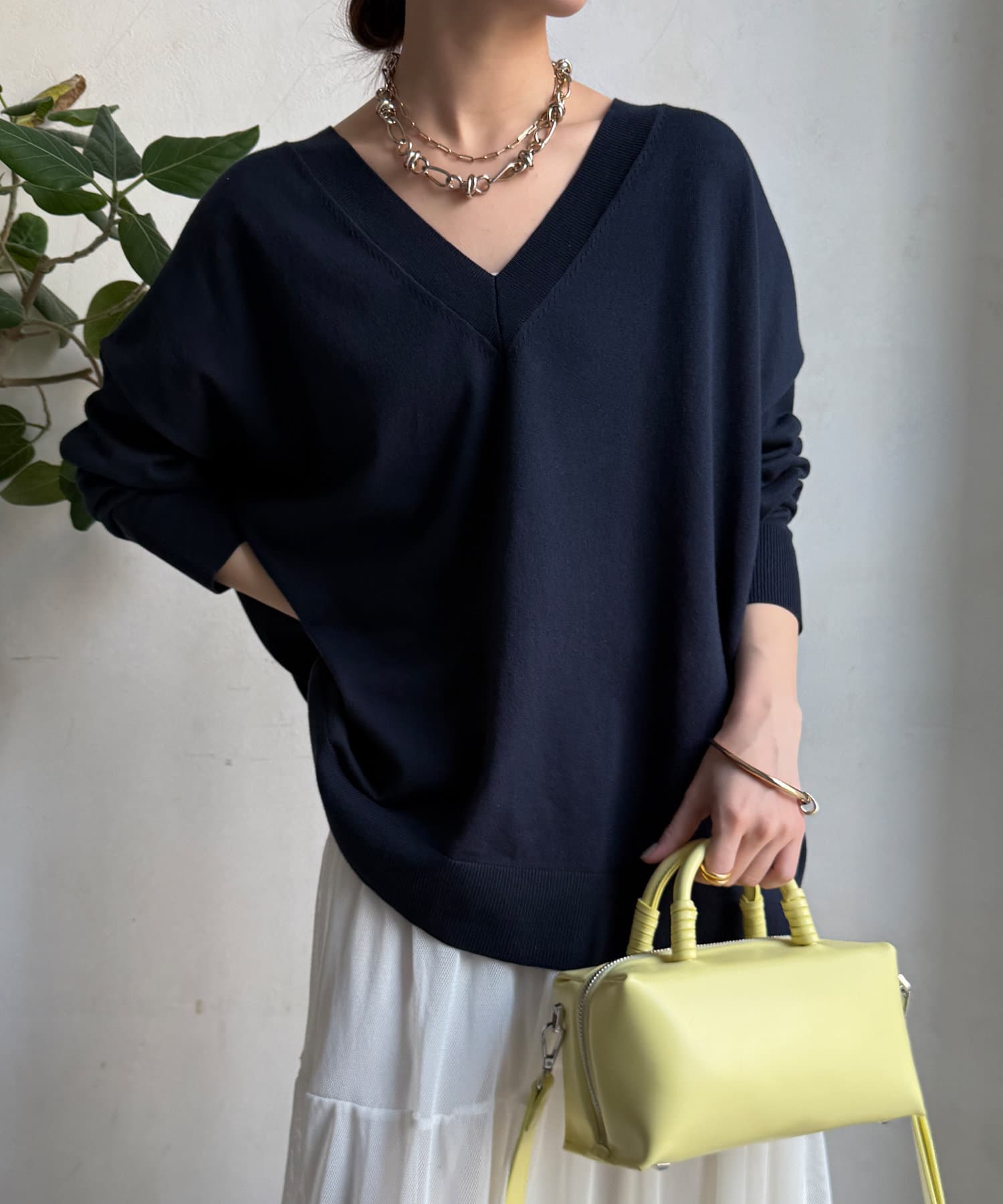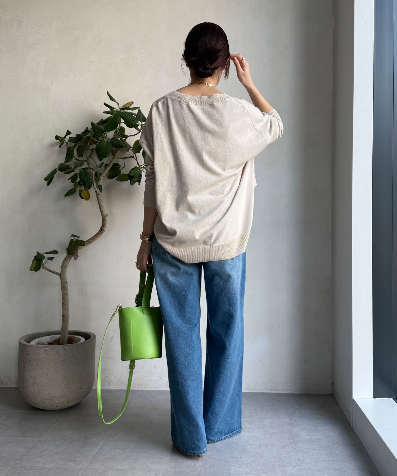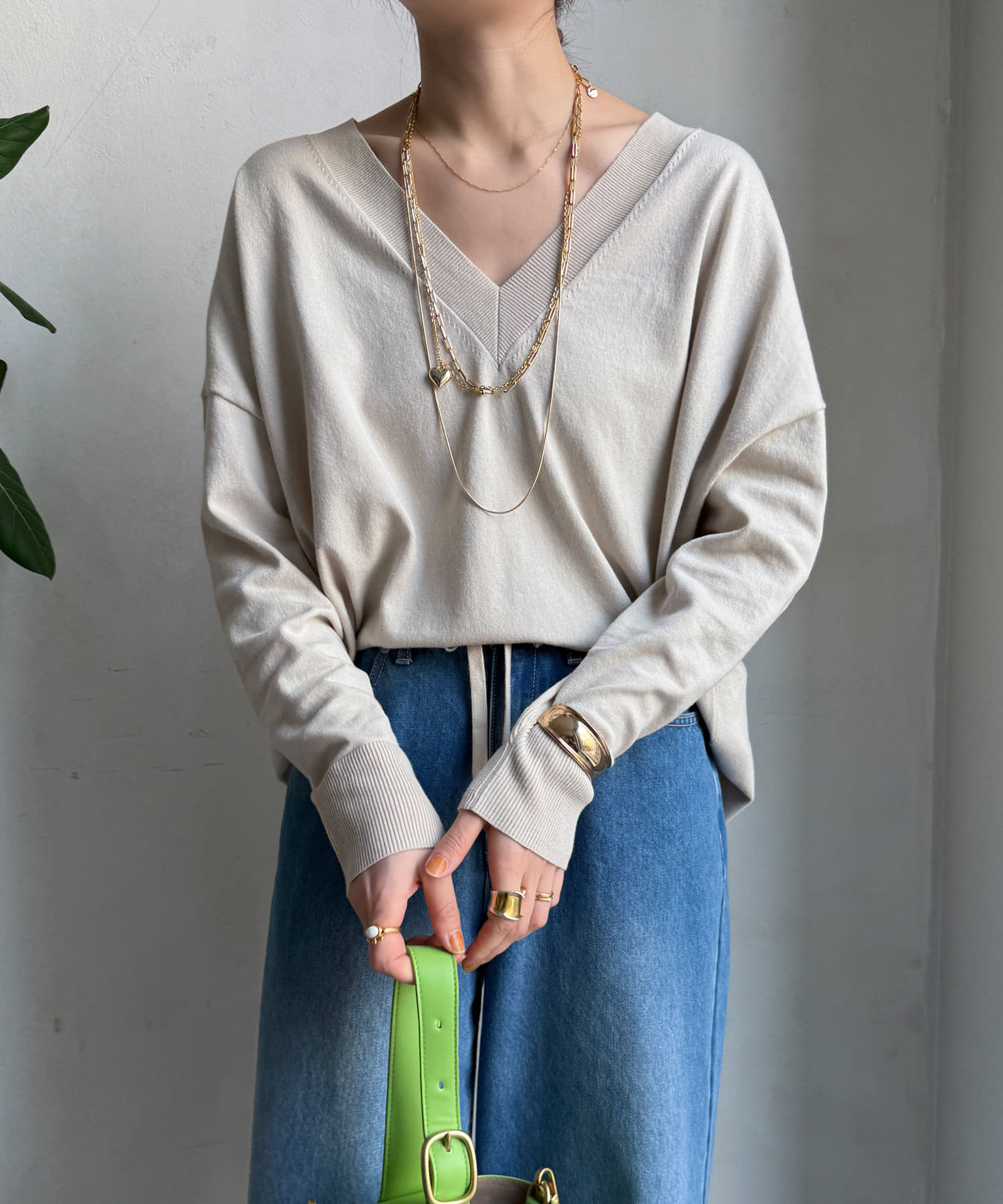 レイヤードでのスタイリングも素敵に着ていただけますが、1枚で着た際もVネックが開きすぎないようにこだわっているため1枚でのスタイルも楽しんでいただけます。