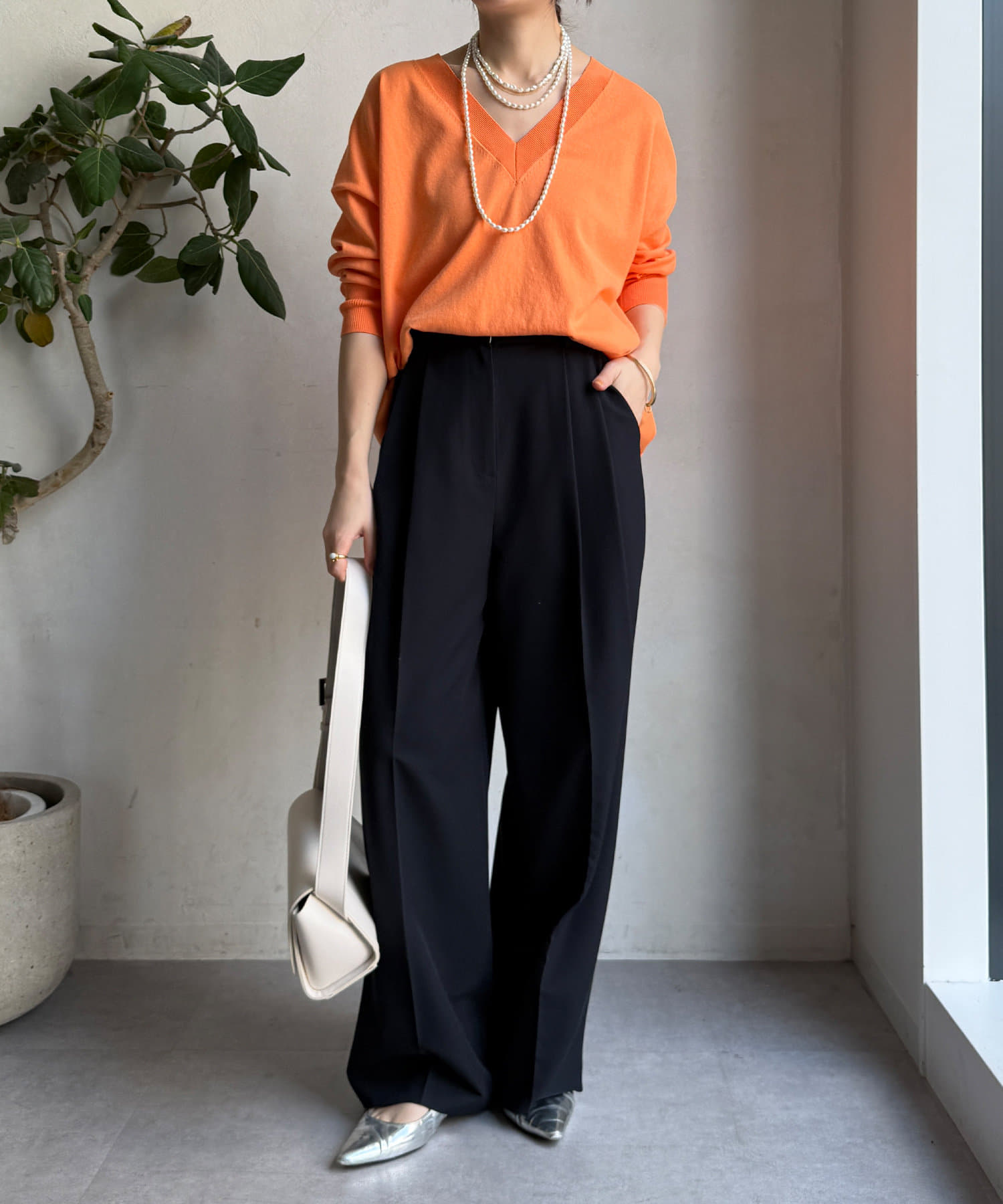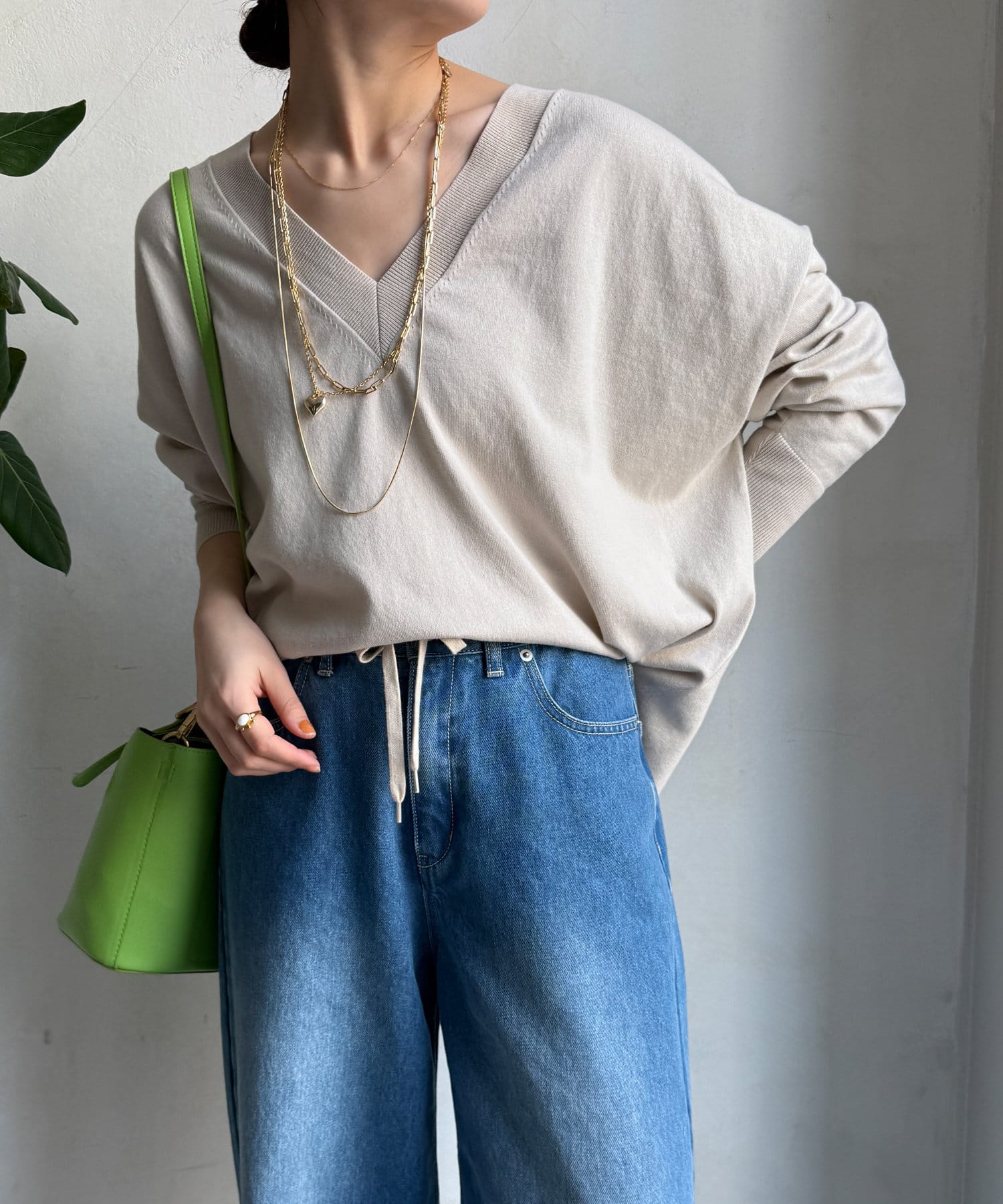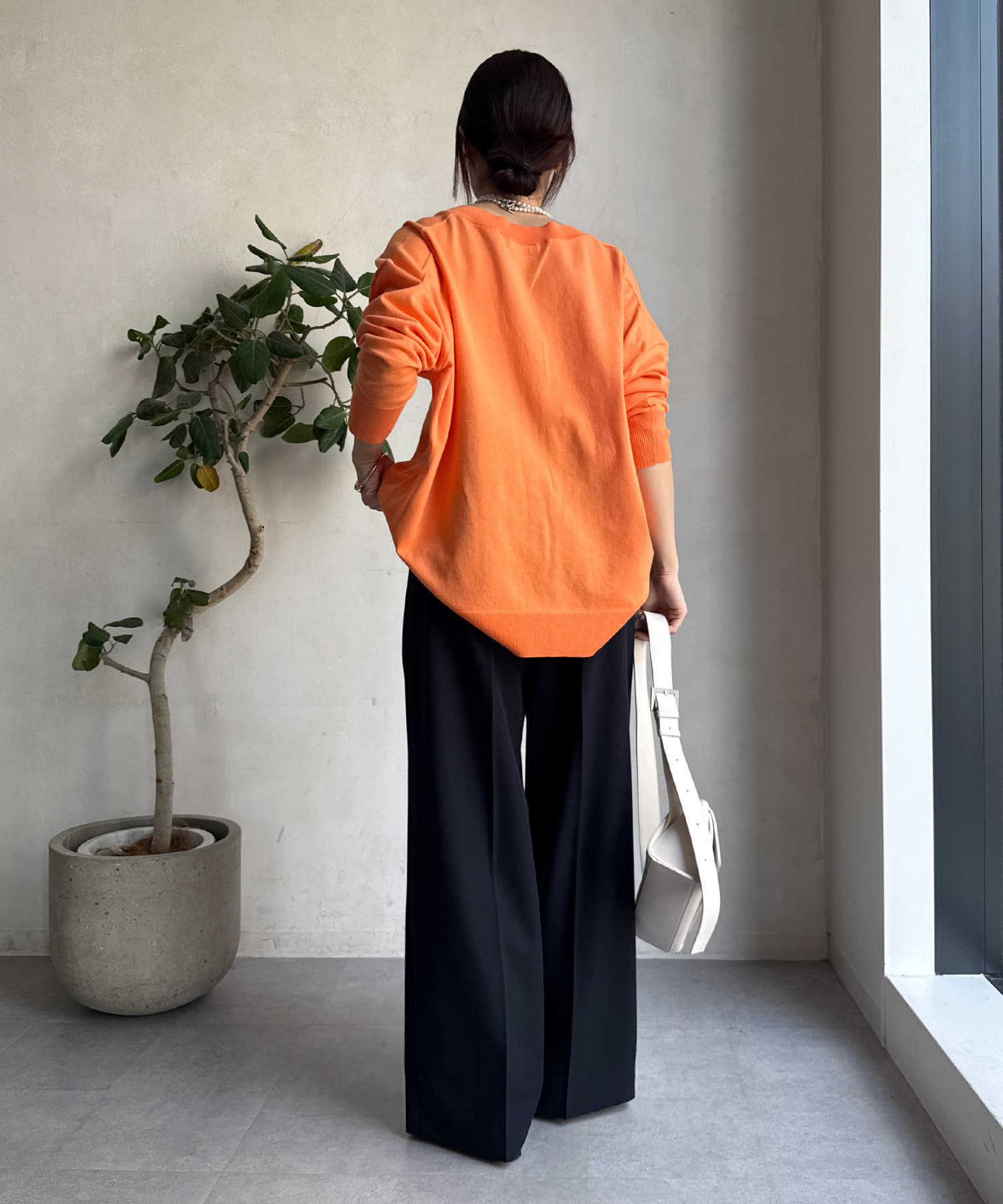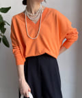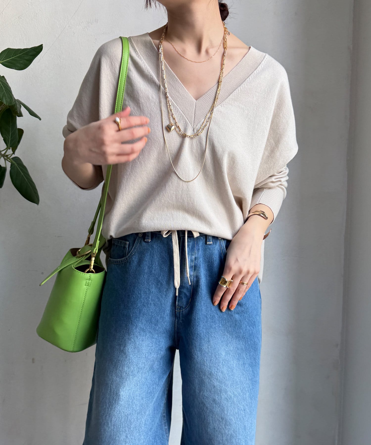 レイヤードでのスタイリングも素敵に着ていただけますが、1枚で着た際もVネックが開きすぎないようにこだわっているため1枚でのスタイルも楽しんでいただけます。