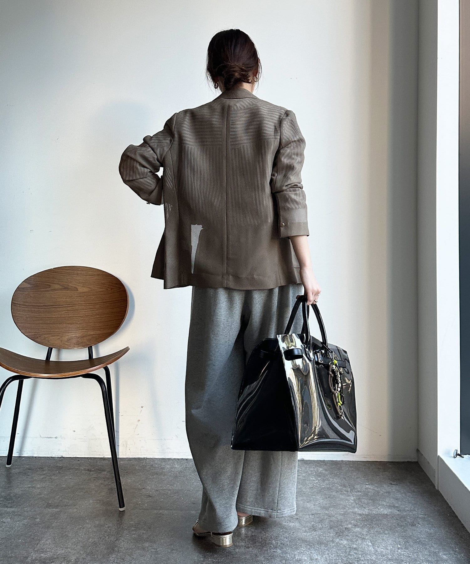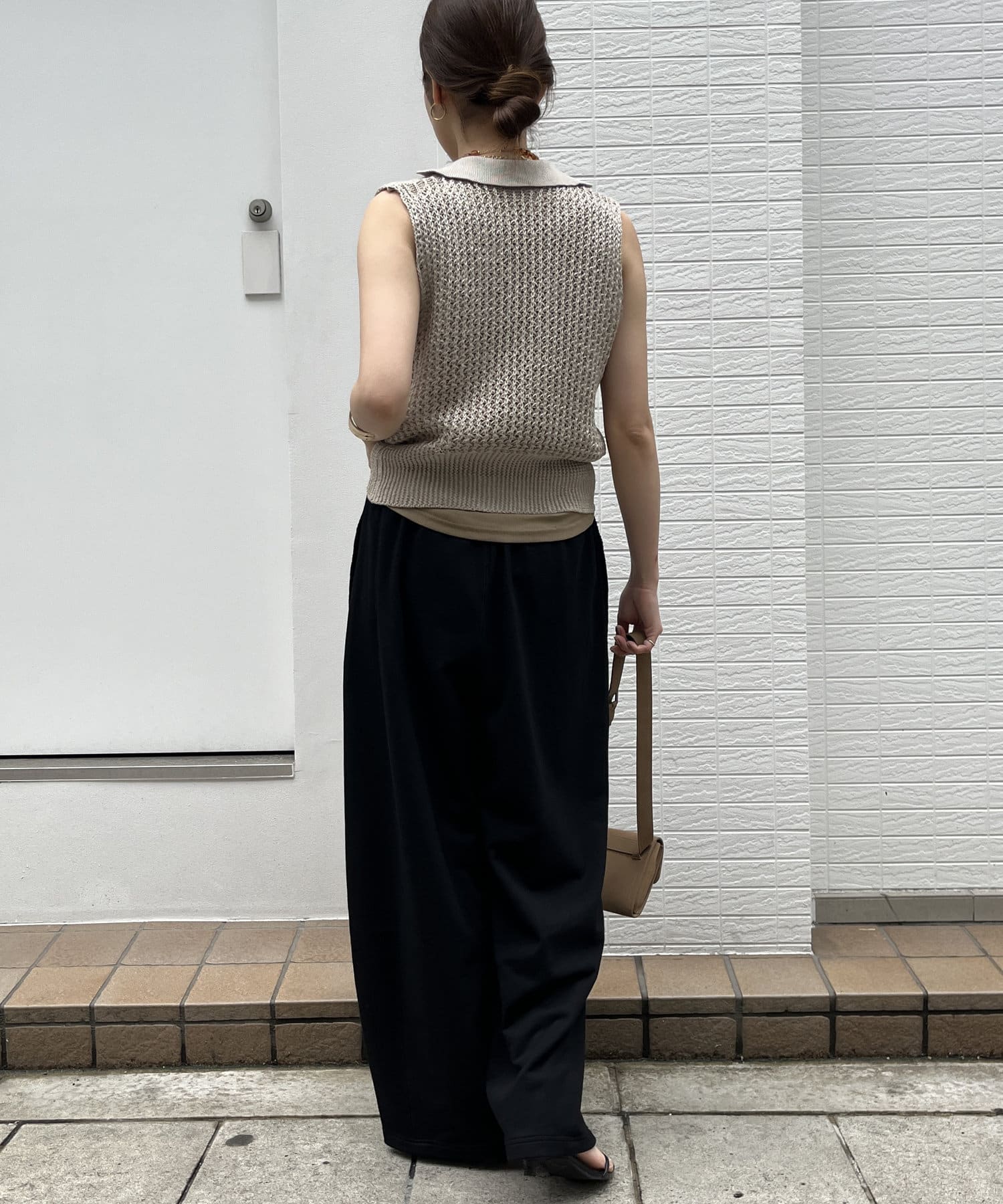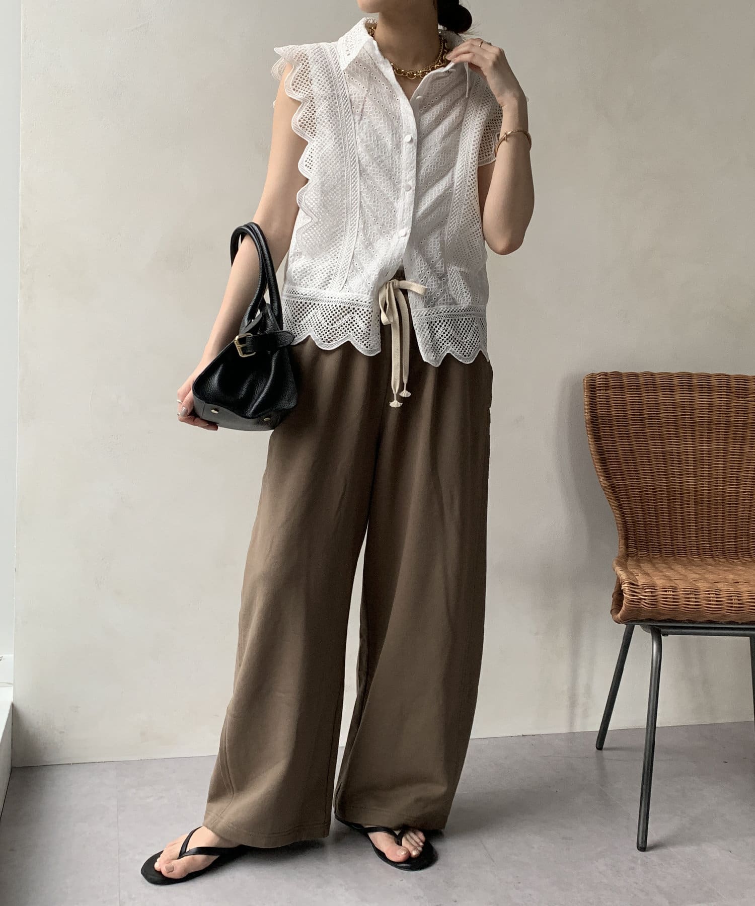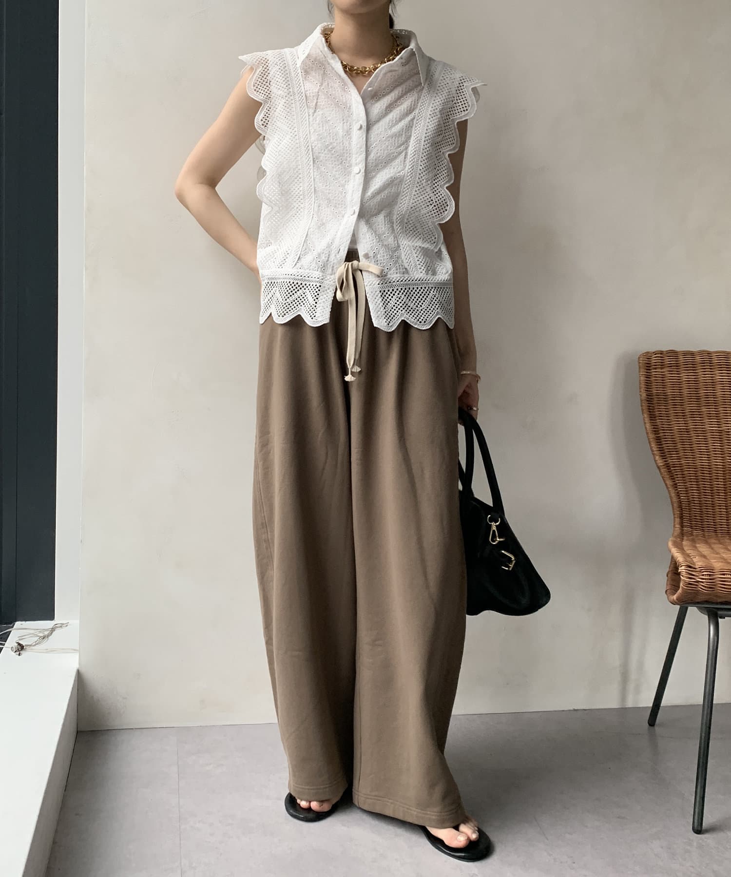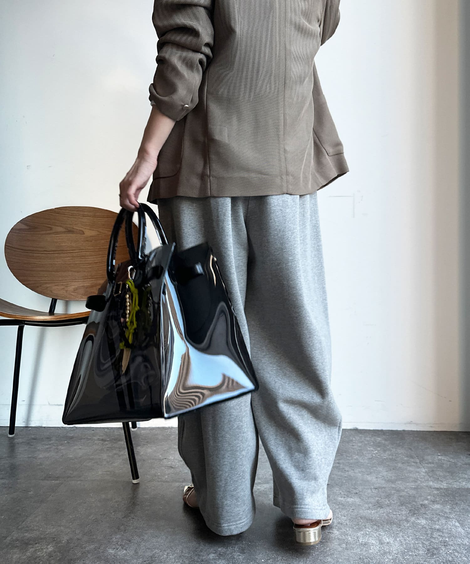 両サイドにはあえて、切りっぱなしの切り替えラインを施して縦ラインを強調。抜け感のある印象を与えてくれます。