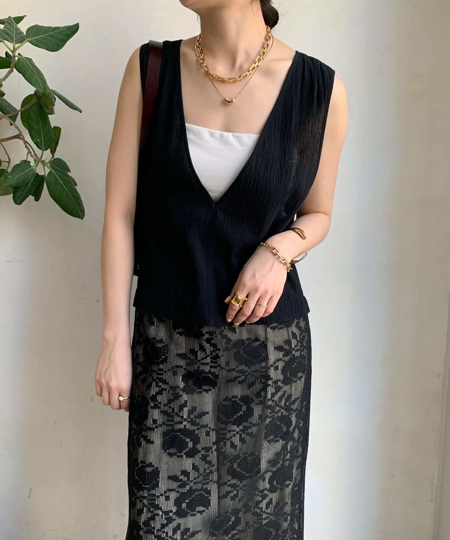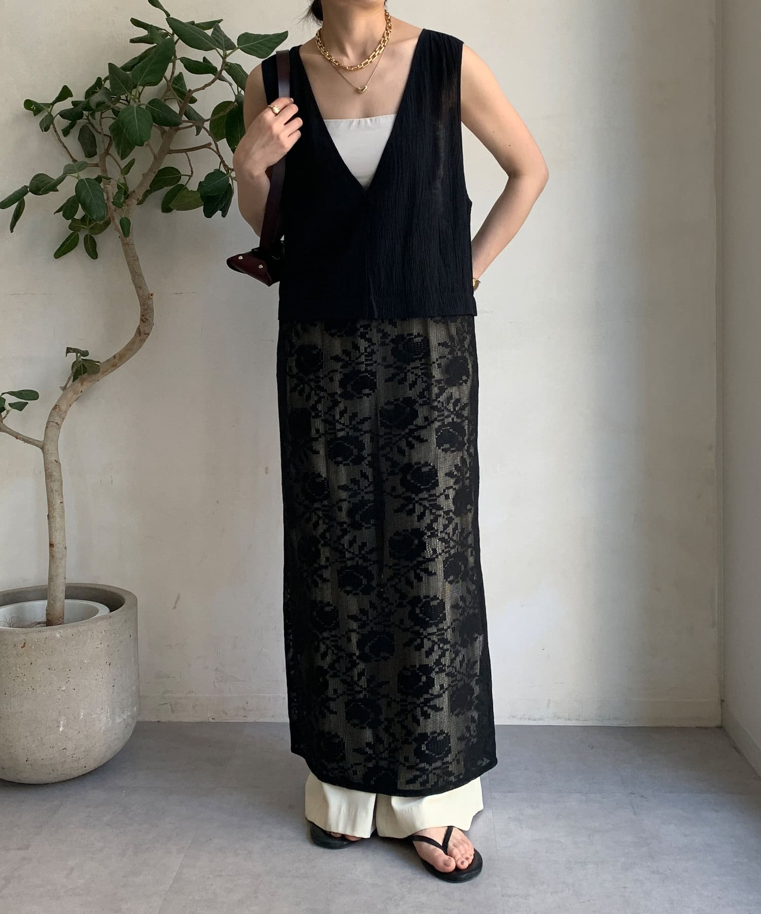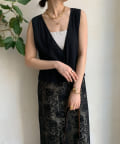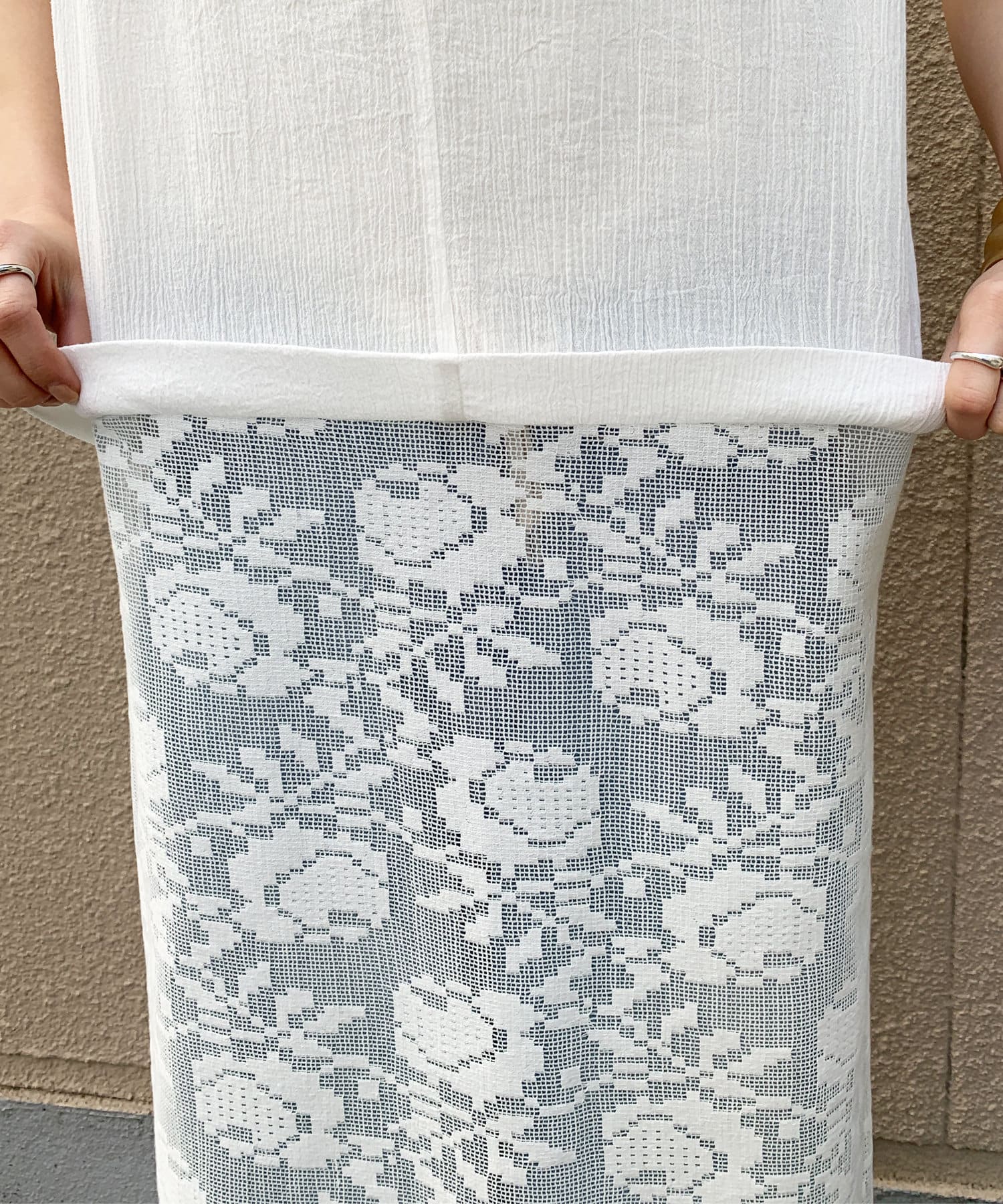 胸下位置からレース素材に切り替えて、シーズンムードが高まる1着に。