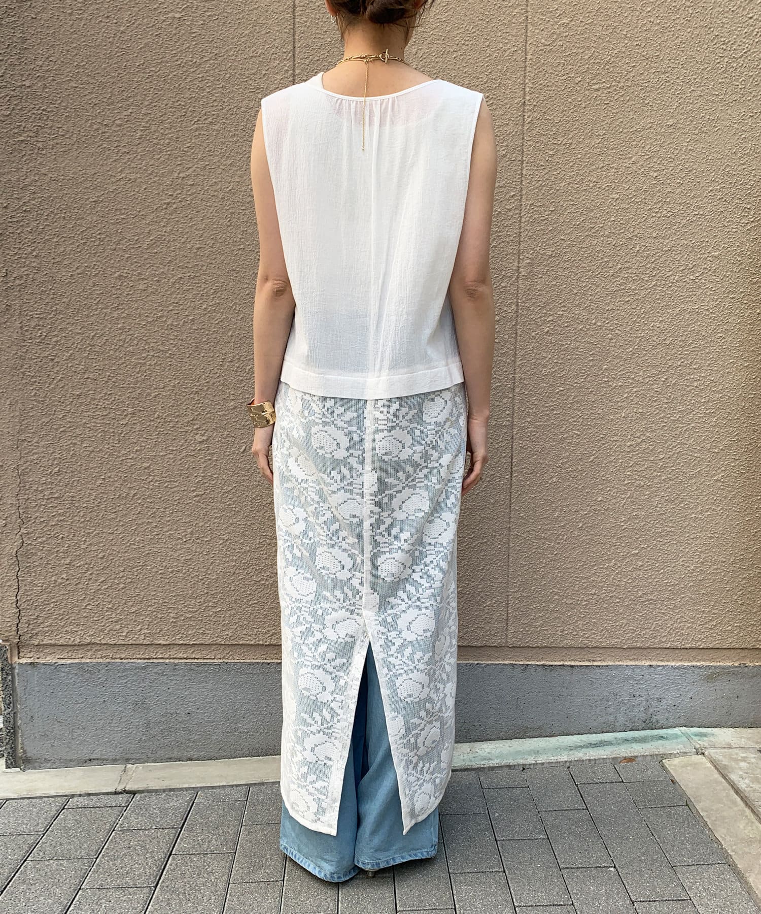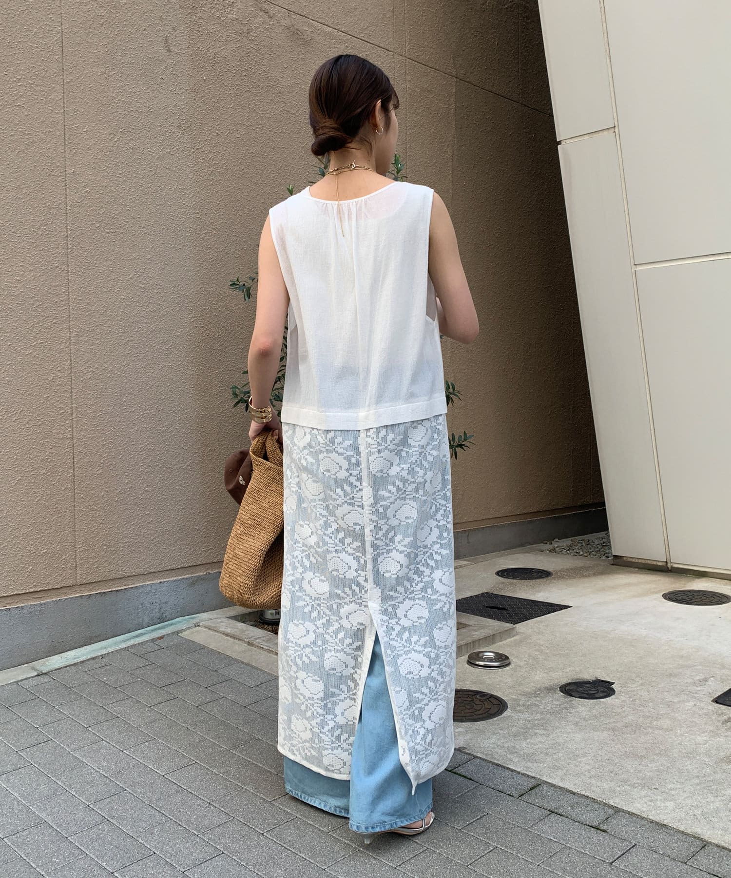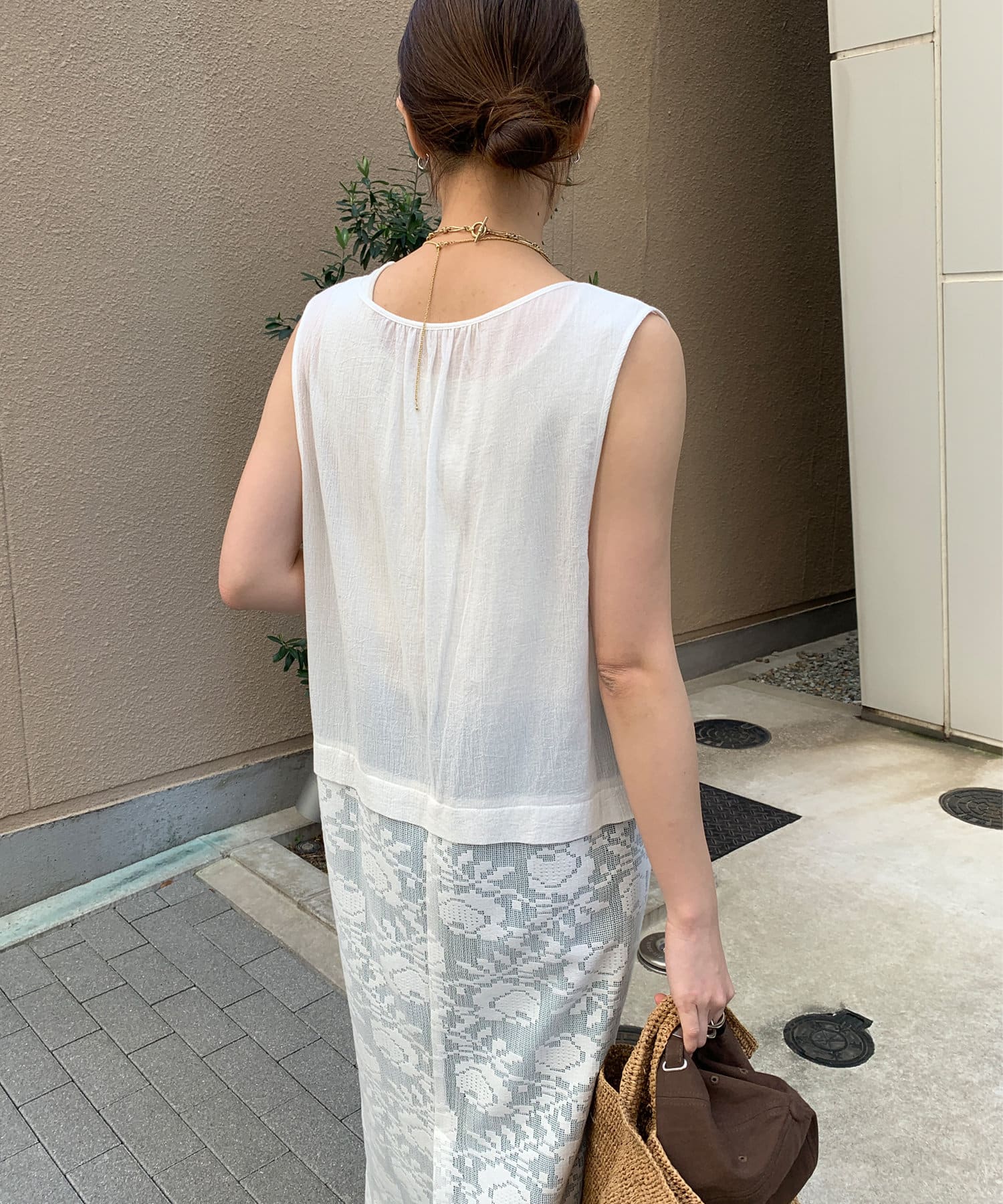 胸下位置からレース素材に切り替えて、シーズンムードが高まる1着に。