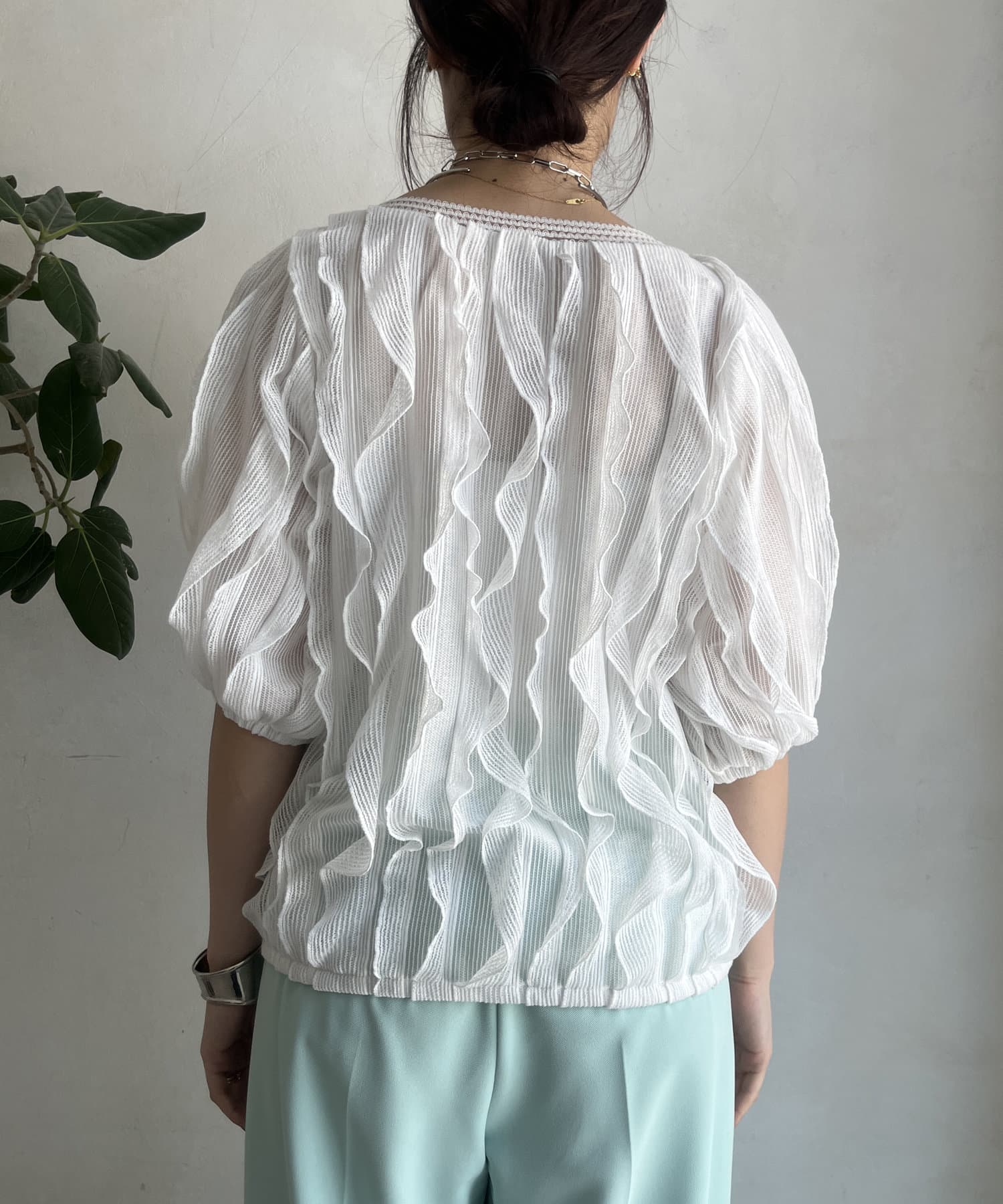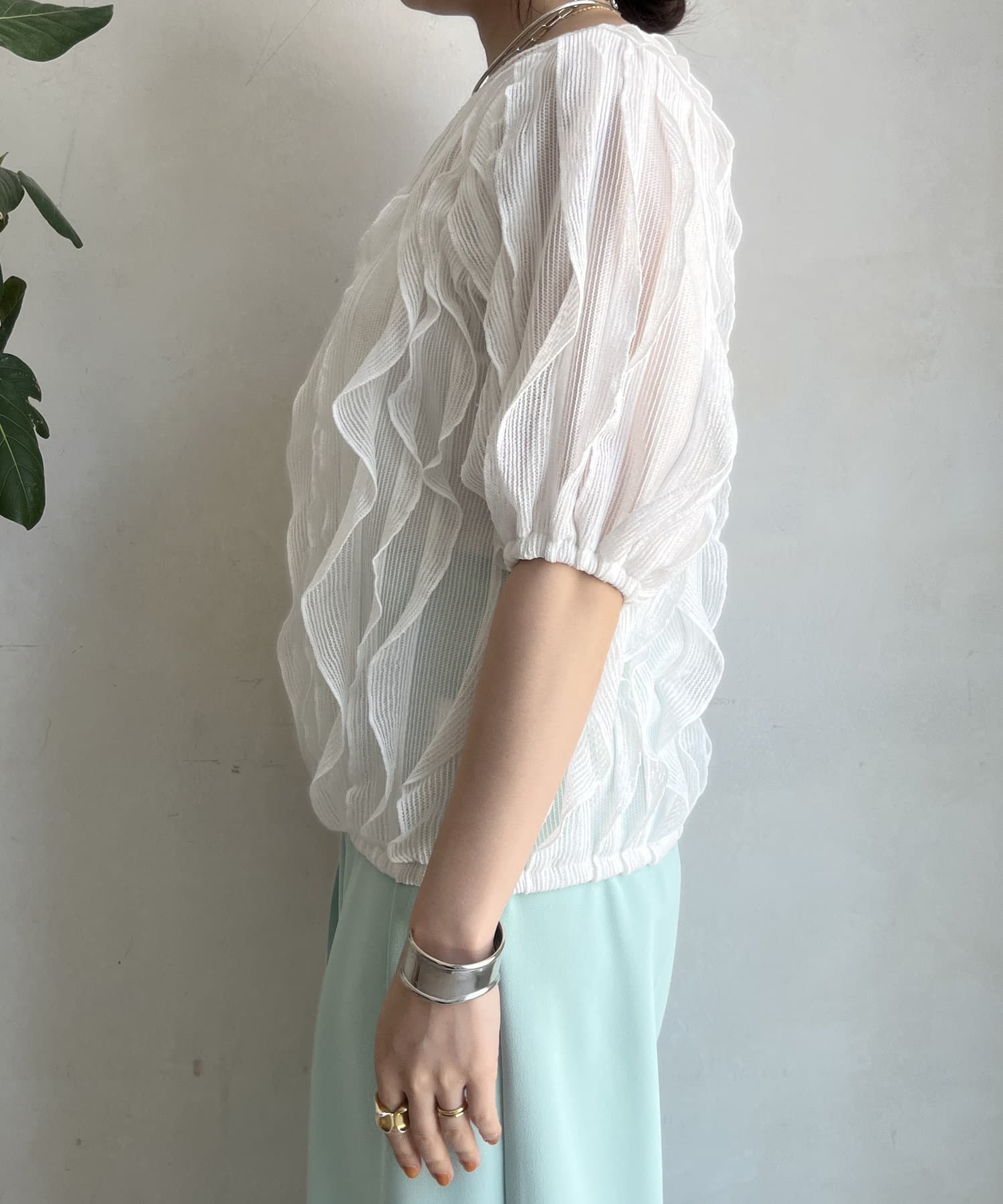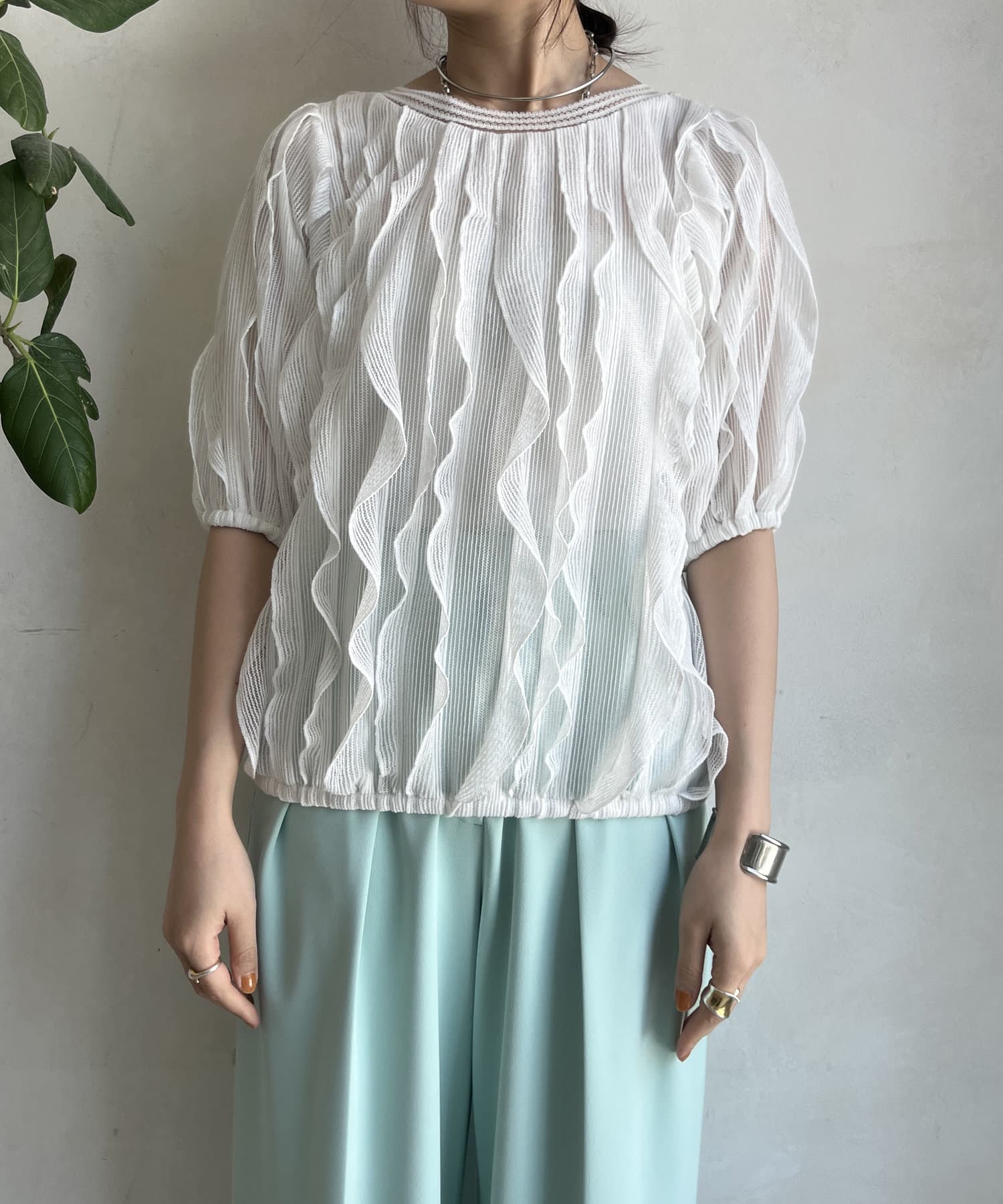 ふんわりと波打つフリルが、身にまとうだけで華やかさを添えるトップス。