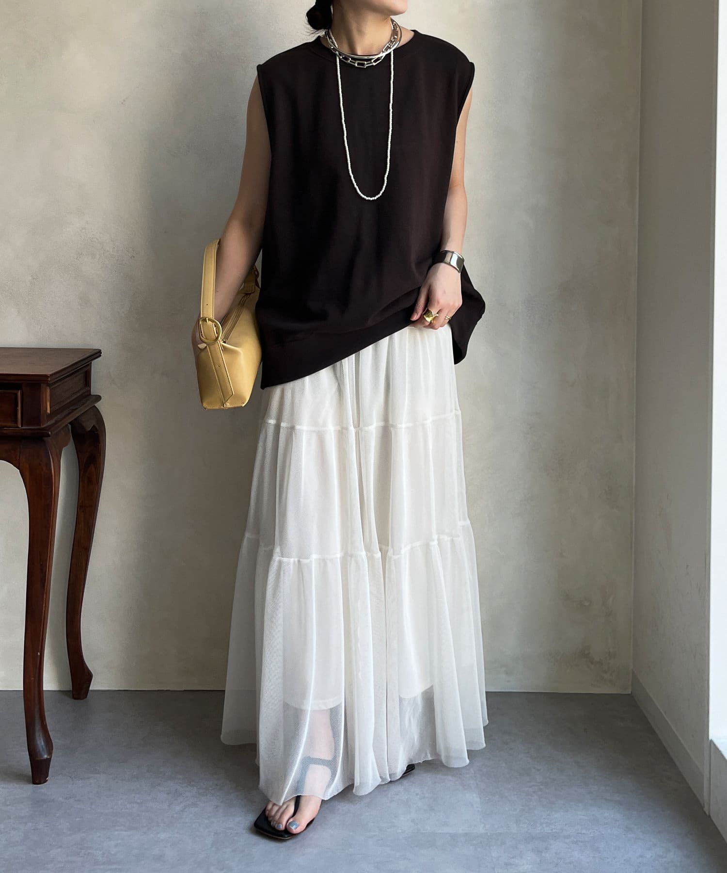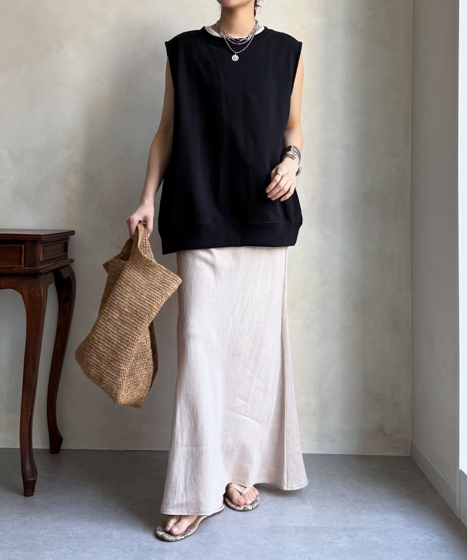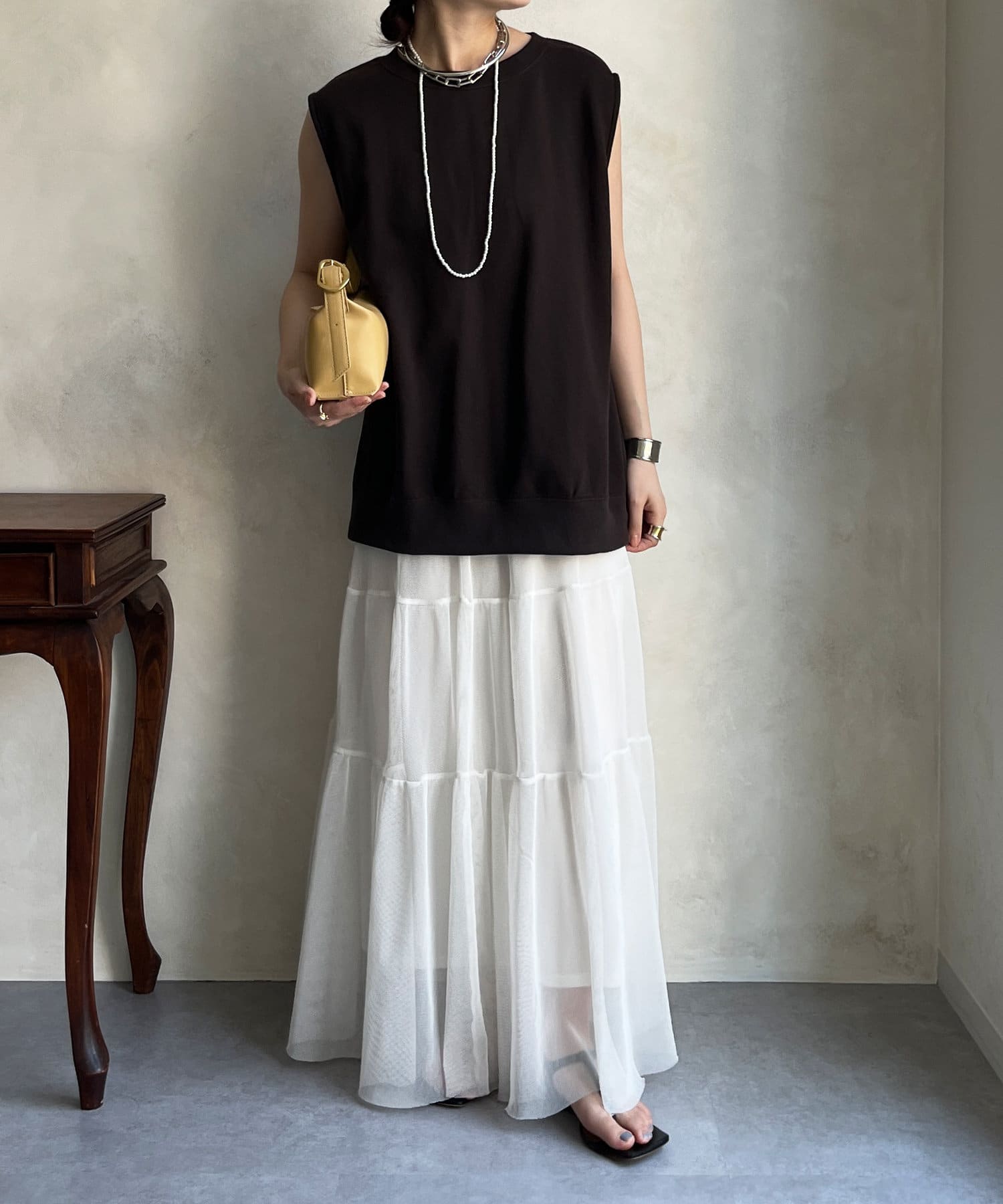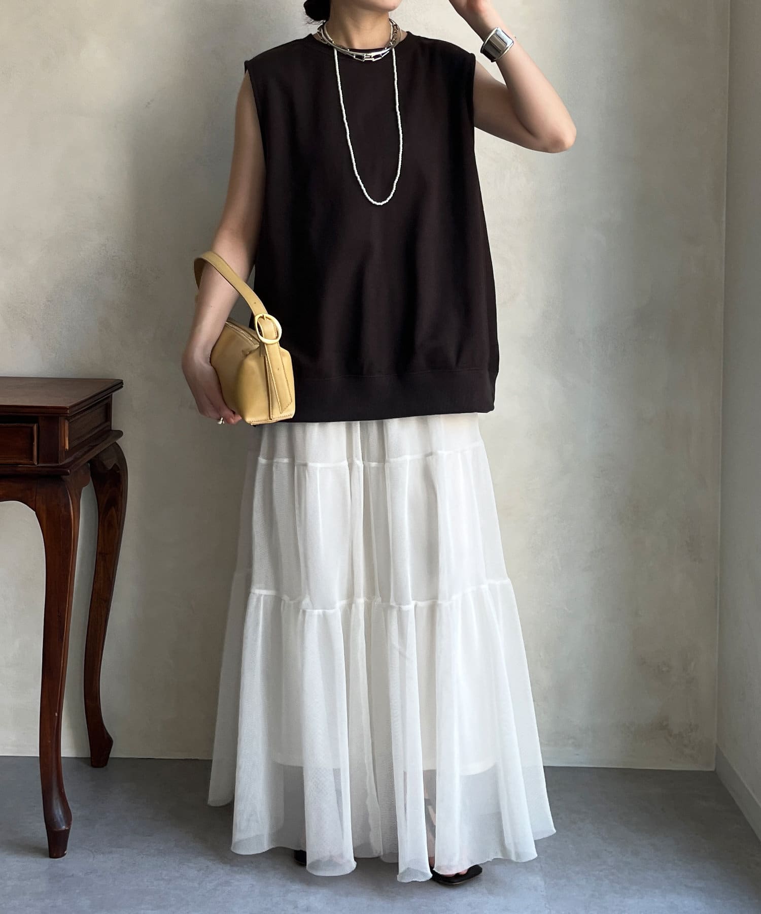やや長めの丈感に仕上げ、ヒップや腰回りを自然とカバー。